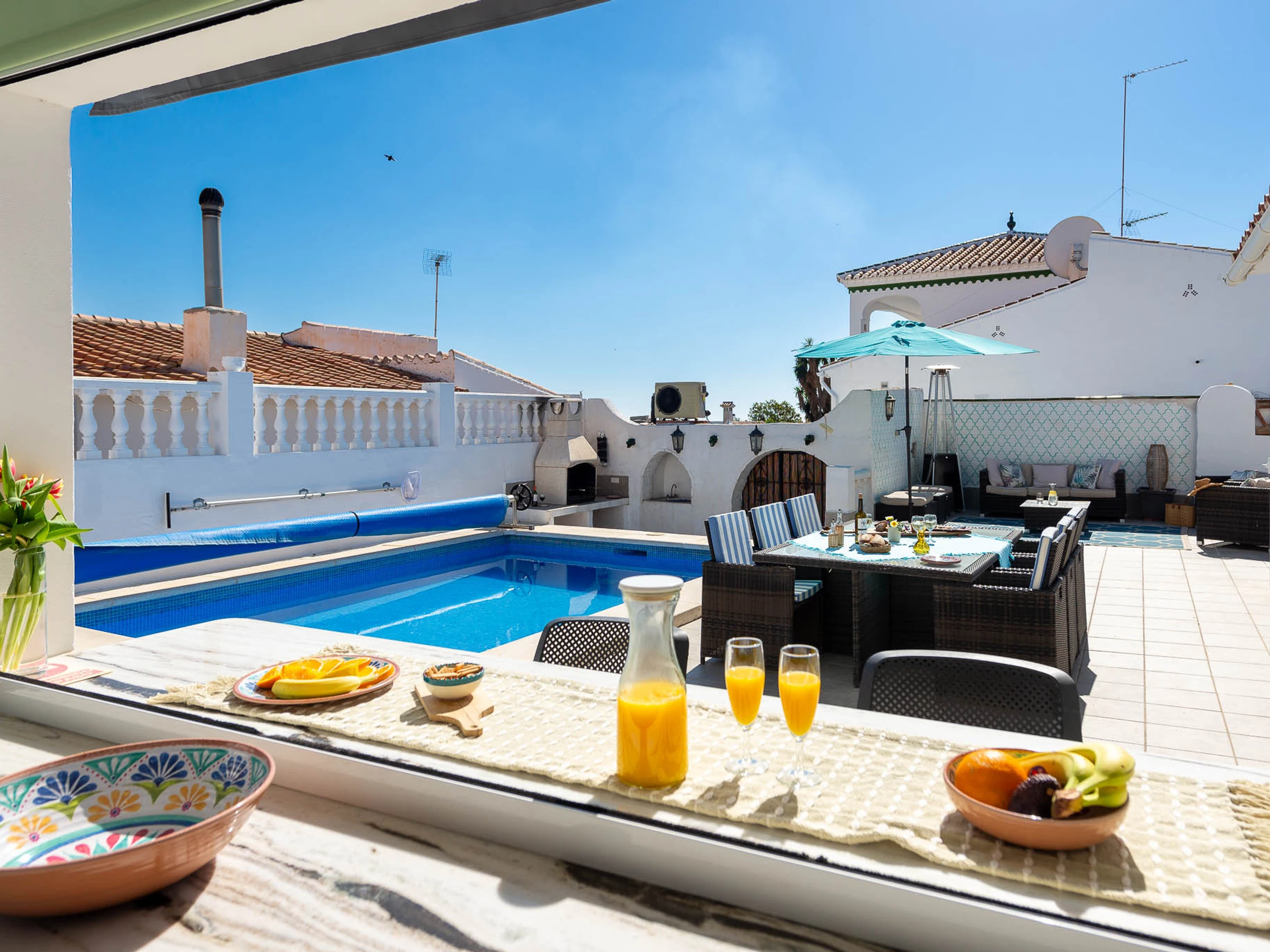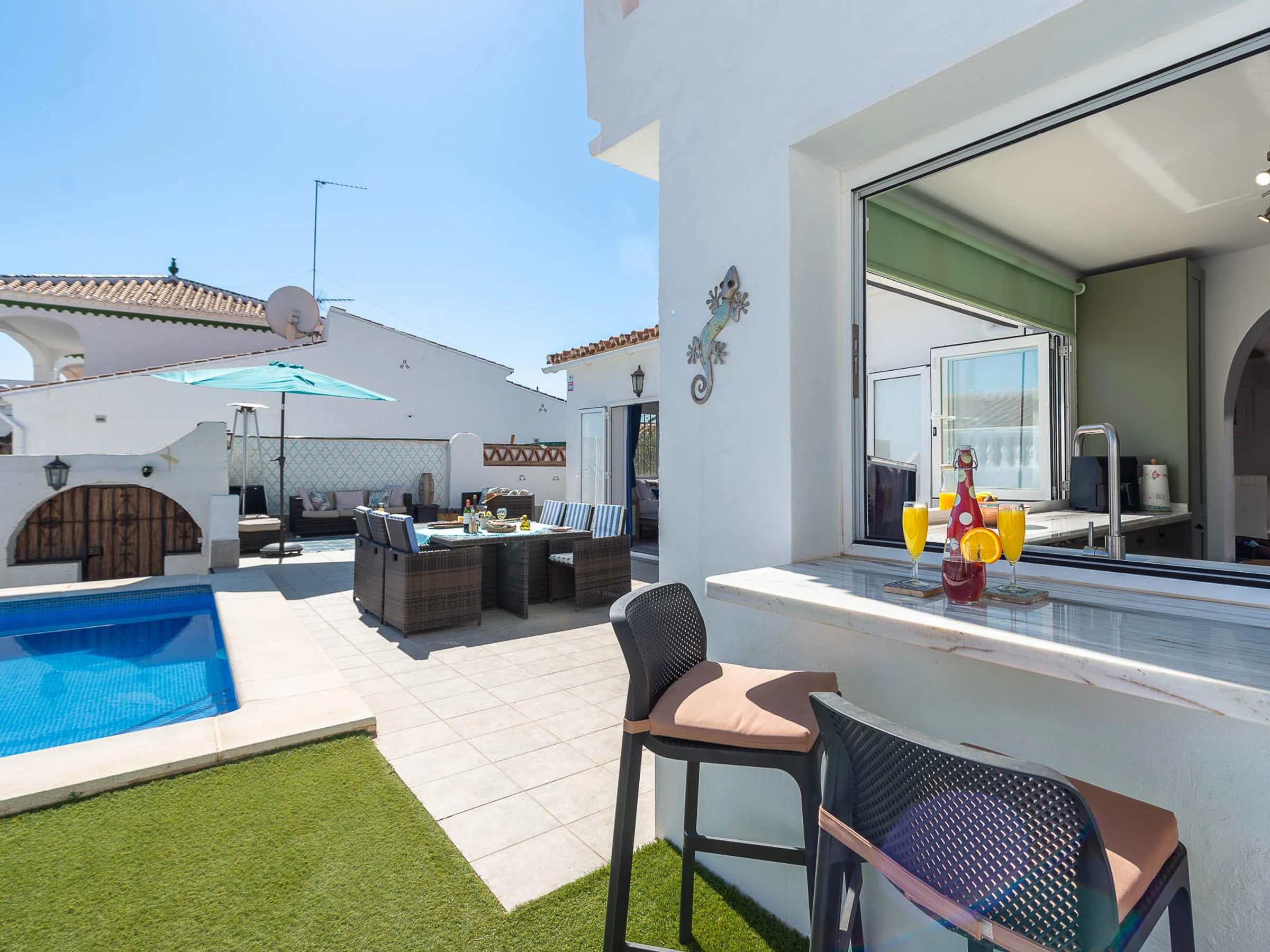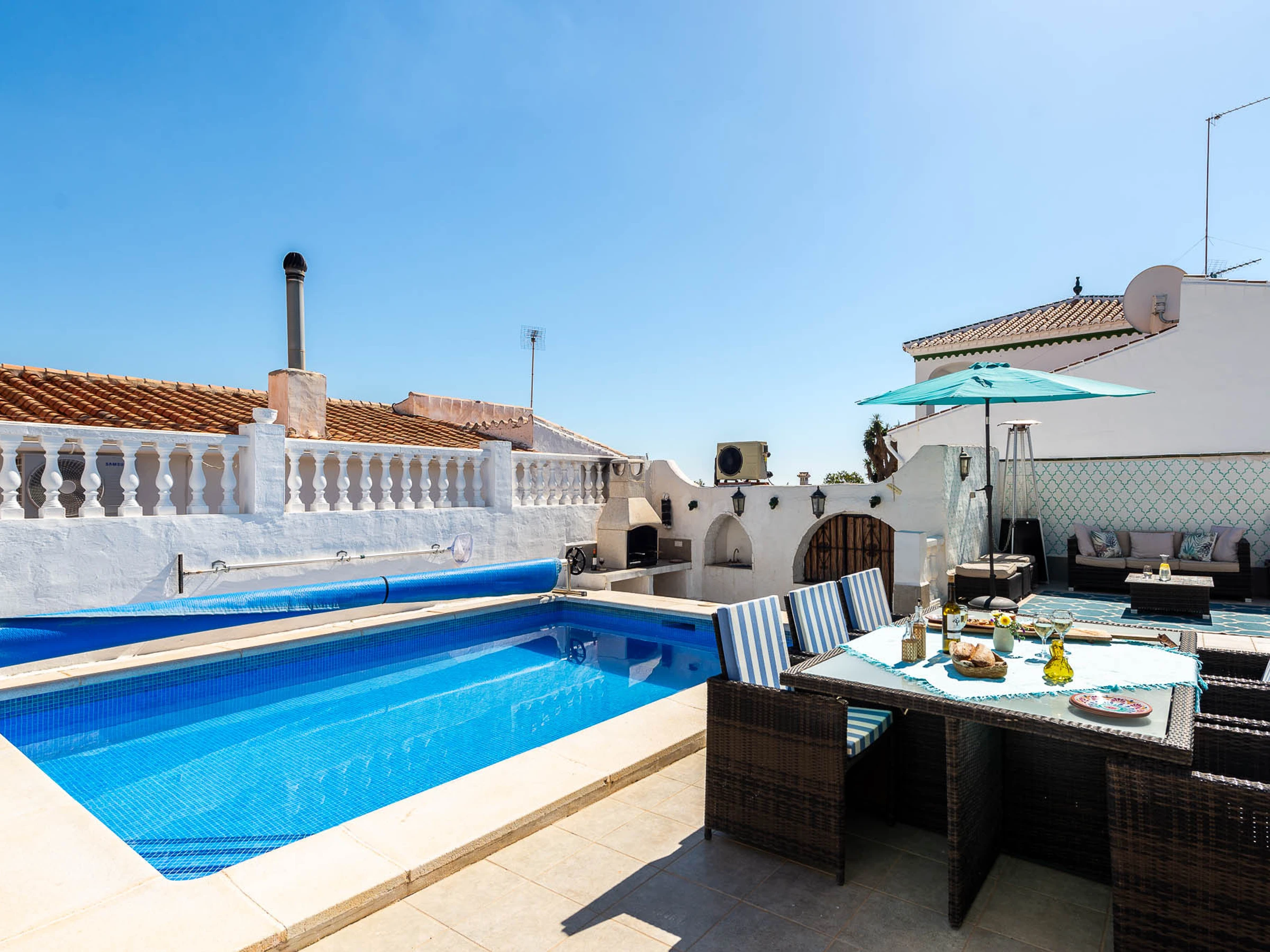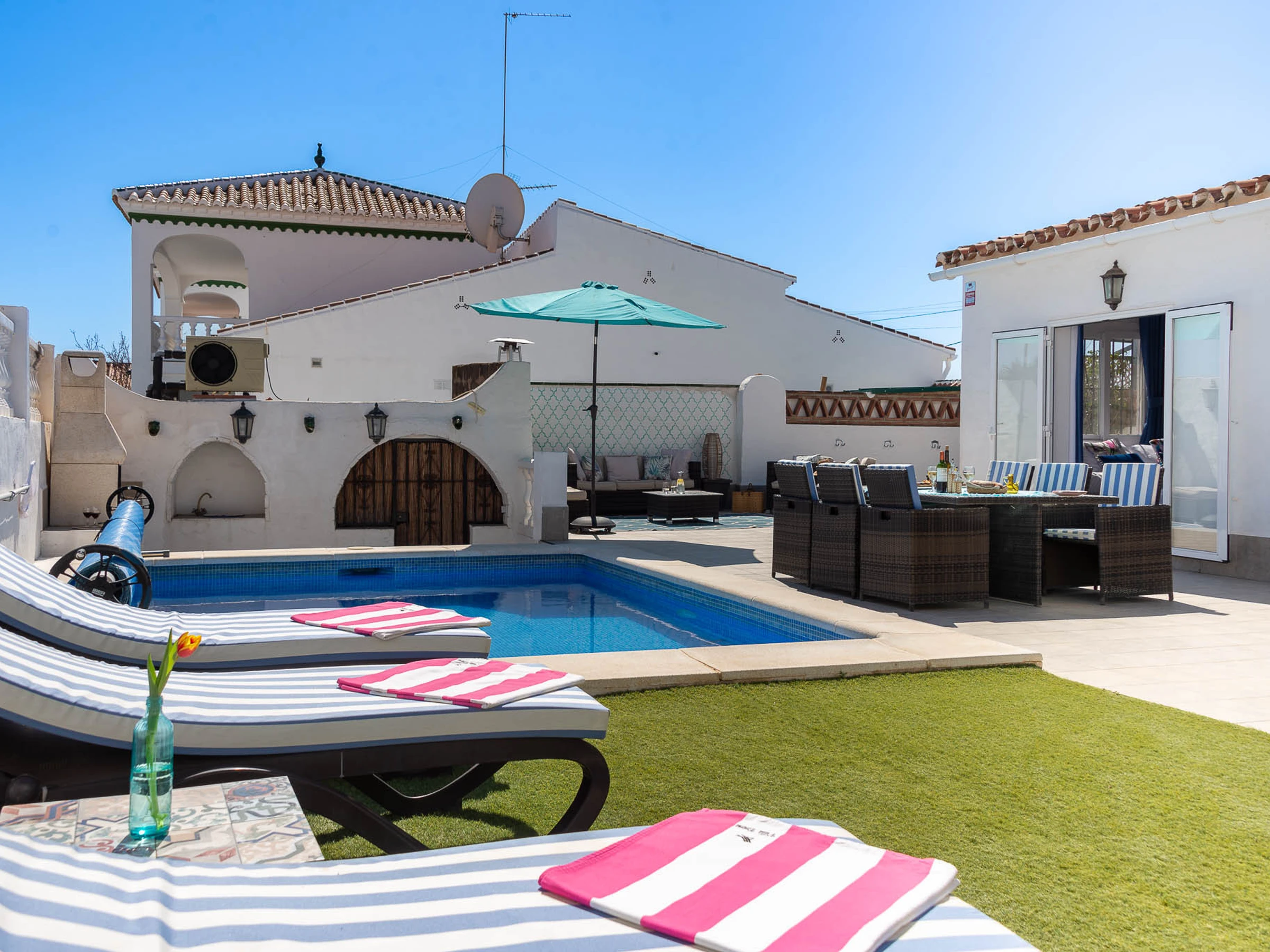 Outside there are many loungers and umbrellas for everyone to enjoy, a dining table (6 chairs), 2 breakfast bars with 4 stools, a sofa area to relax, a built-in barbecue, and a gas stove for the colder evenings.