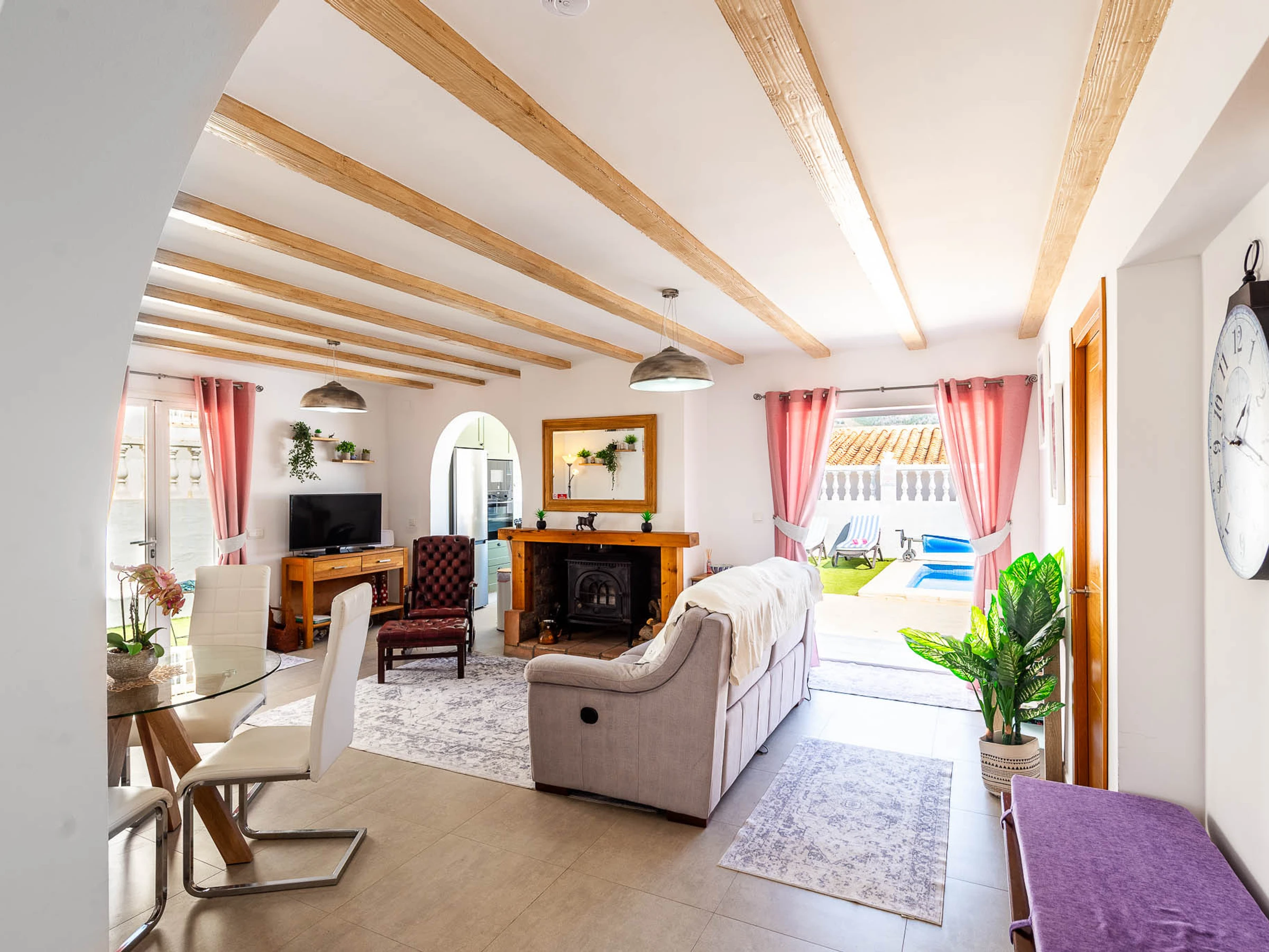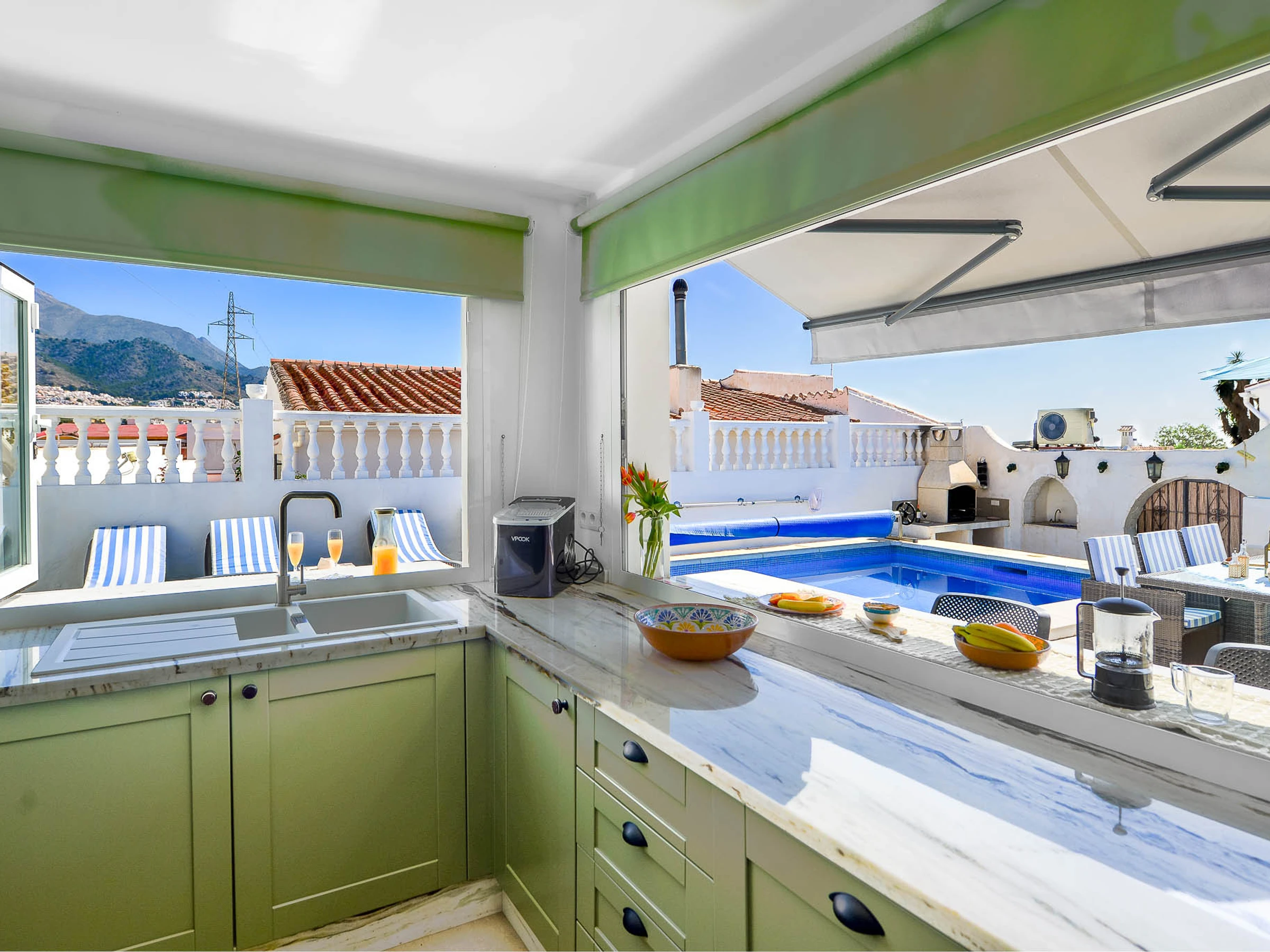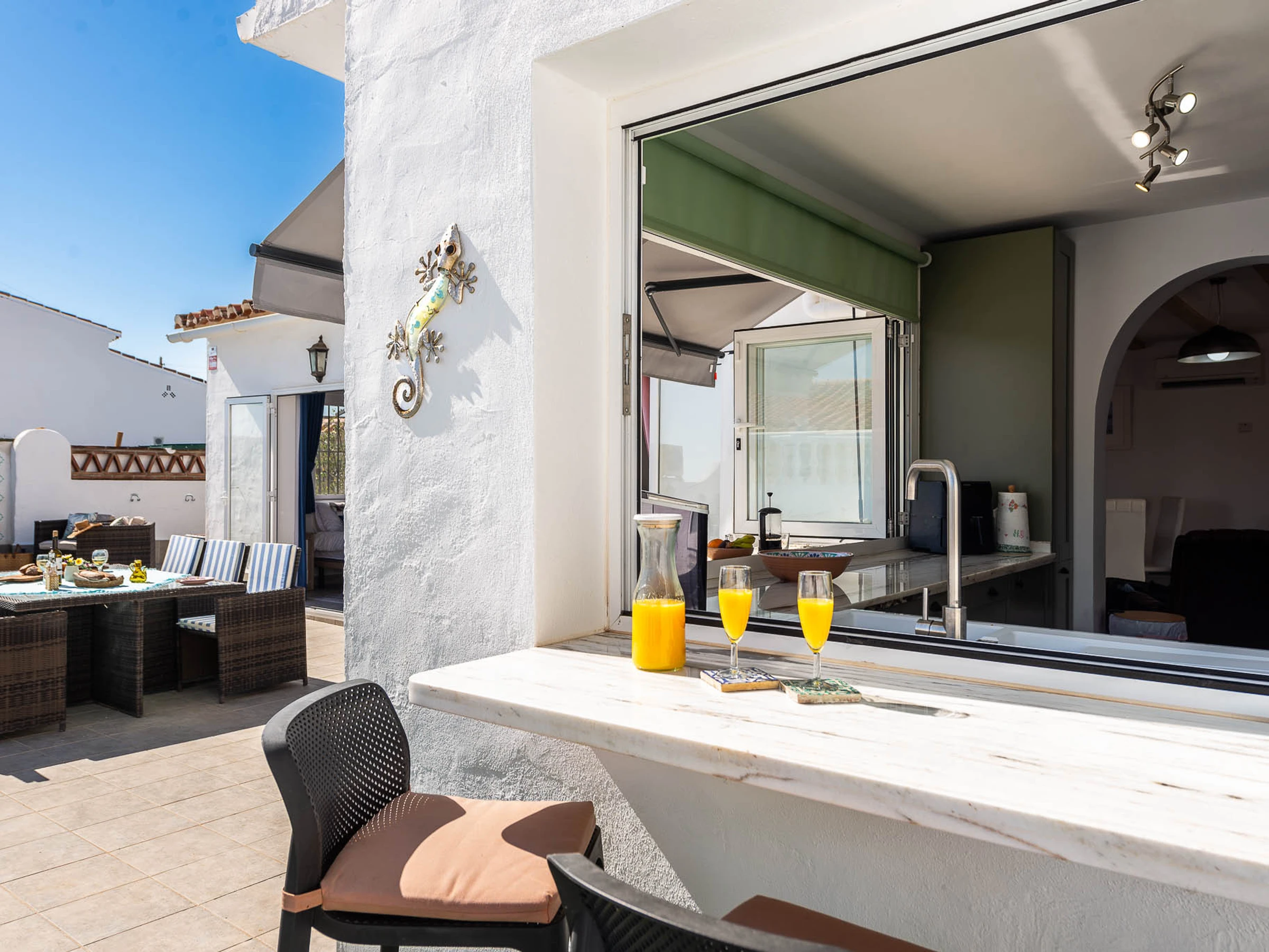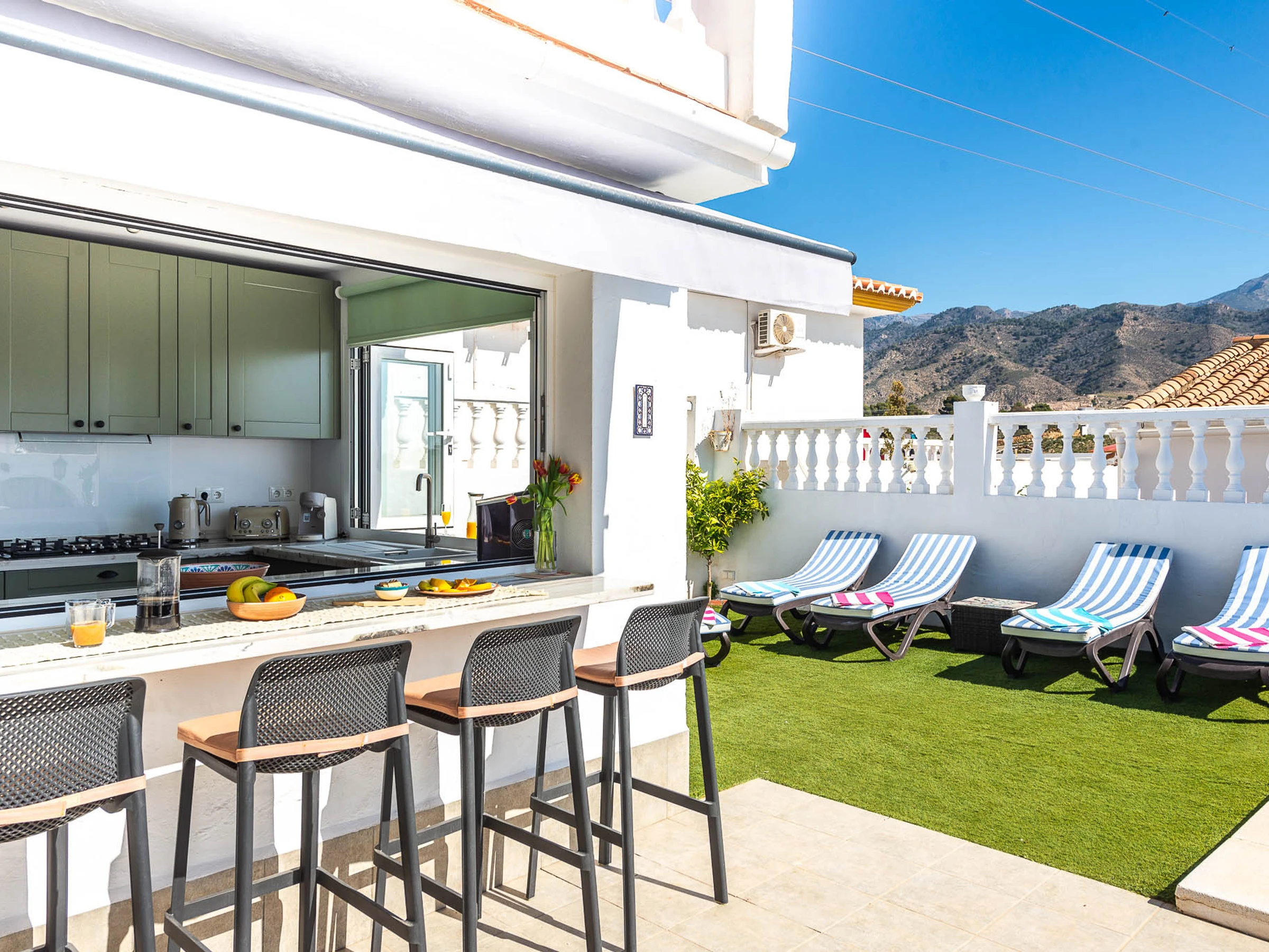 Outside there are many loungers and umbrellas for everyone to enjoy, a dining table (6 chairs), 2 breakfast bars with 4 stools, a sofa area to relax, a built-in barbecue, and a gas stove for the colder evenings.