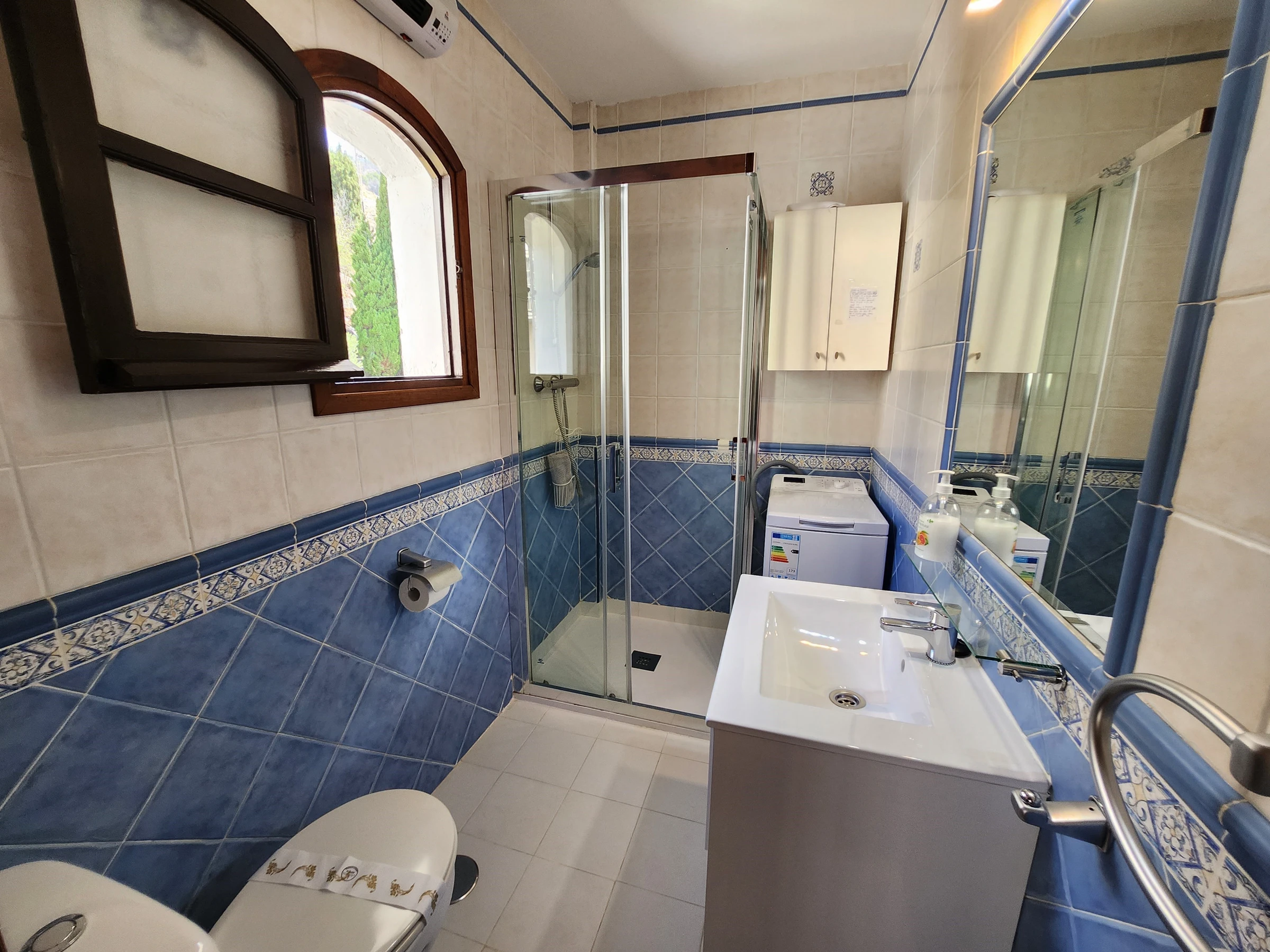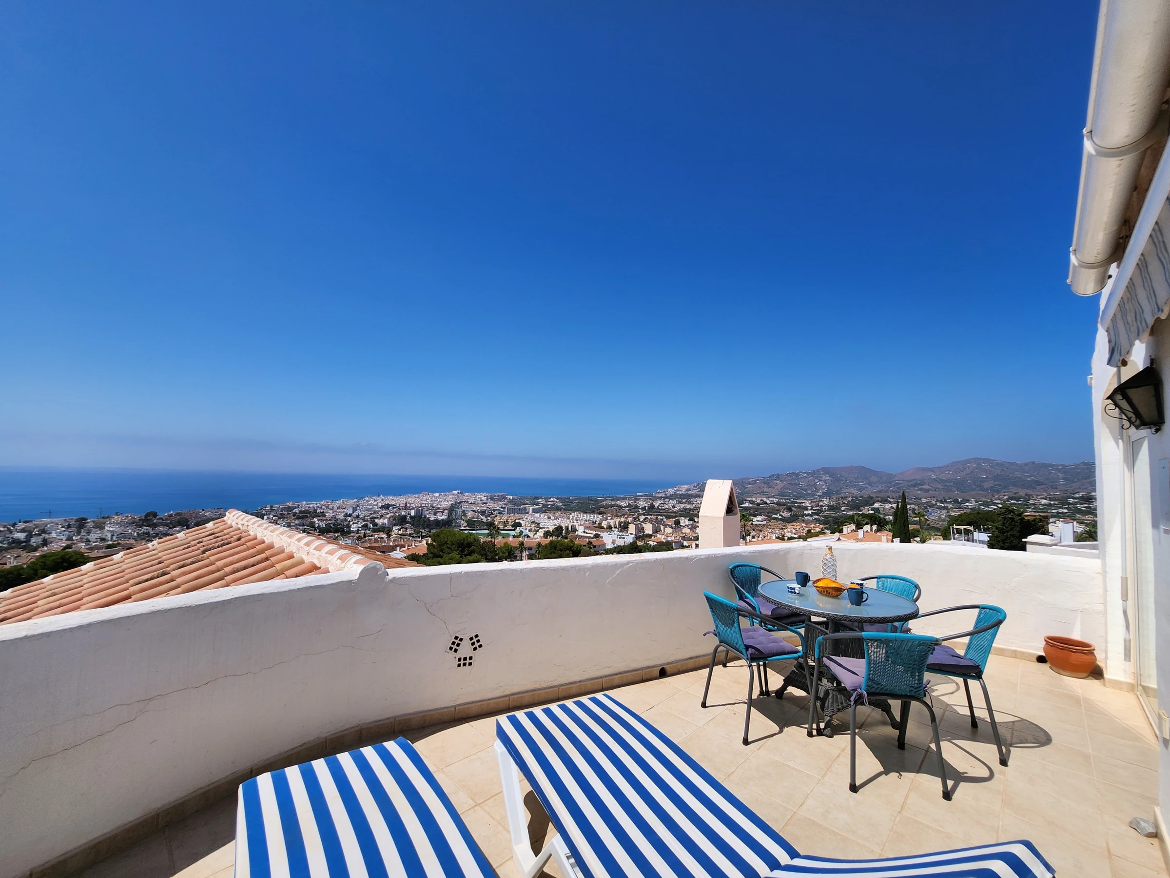 Private sun terrace with sunbeds and furniture al fresco dining. Facilities included: washing machine, iron, internet access (wifi), hairdryer, air conditioning, community+children's pool, free street parking just outside, television with international channels.