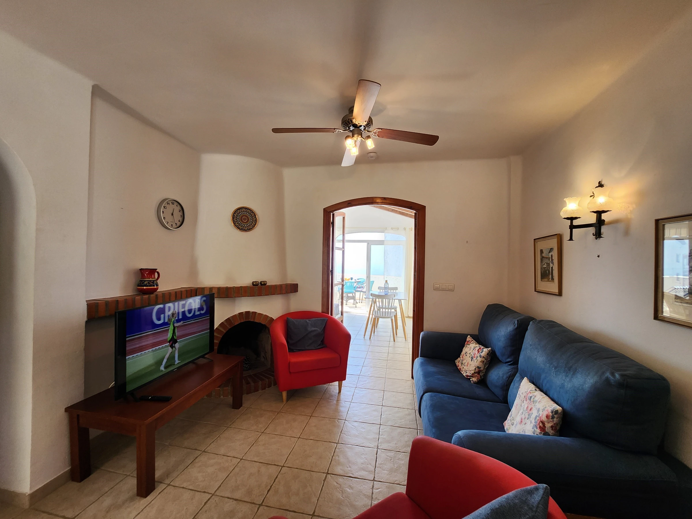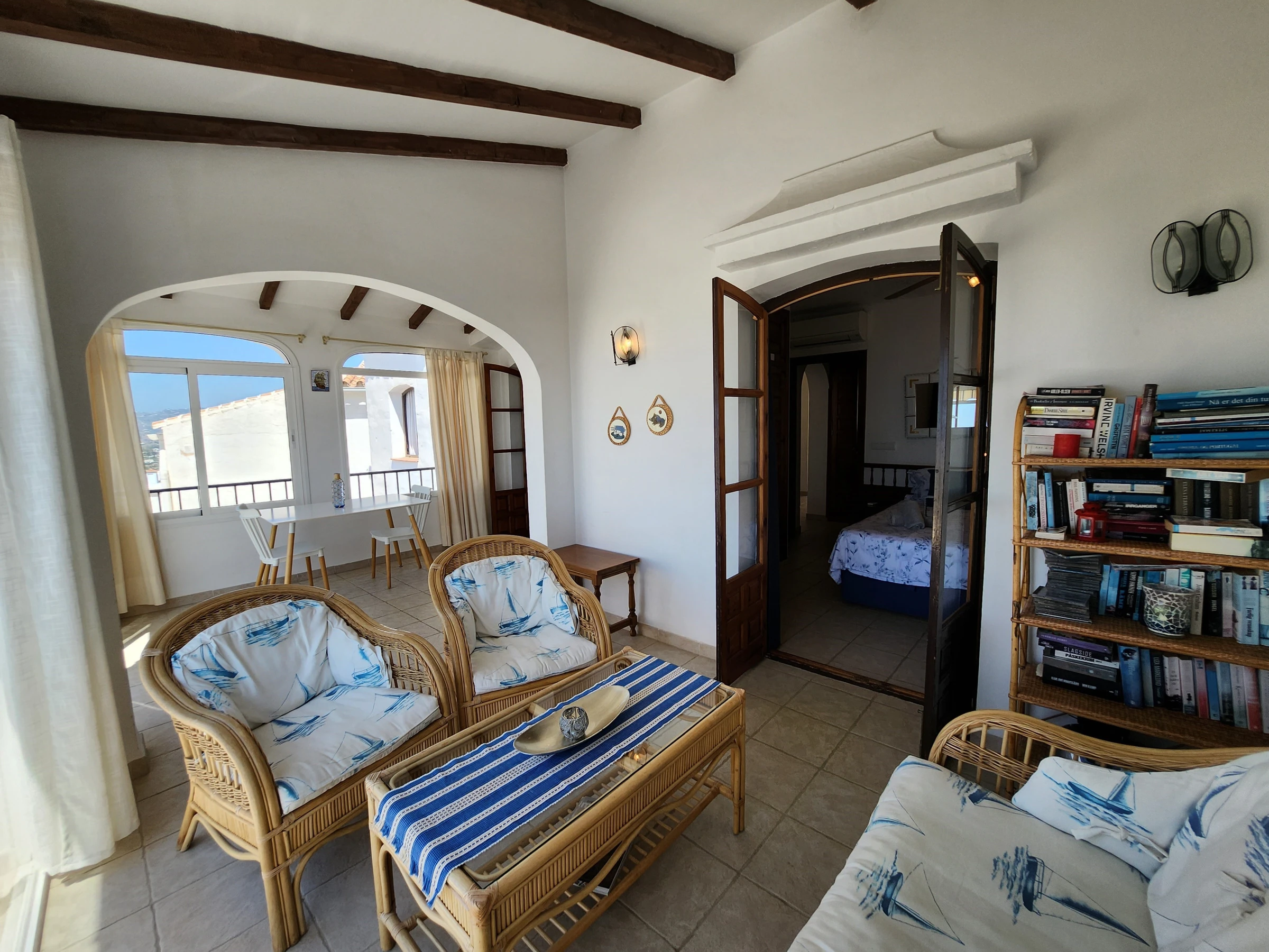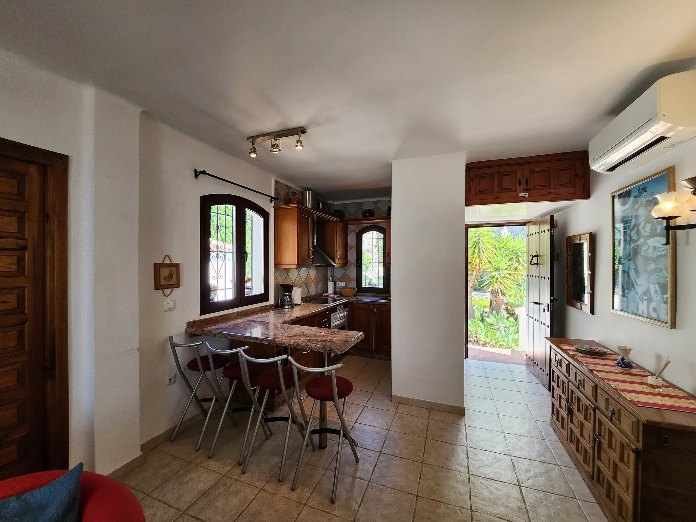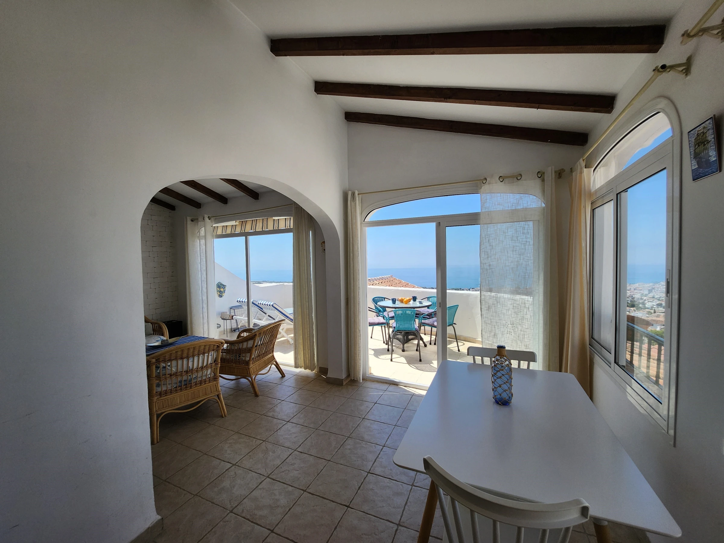 and open plan living room. The living room opens to the bright dinnig room and a second living room out to the terrace. It has a breakfast bar in the kitchen and a nearby dining area with incredible views.