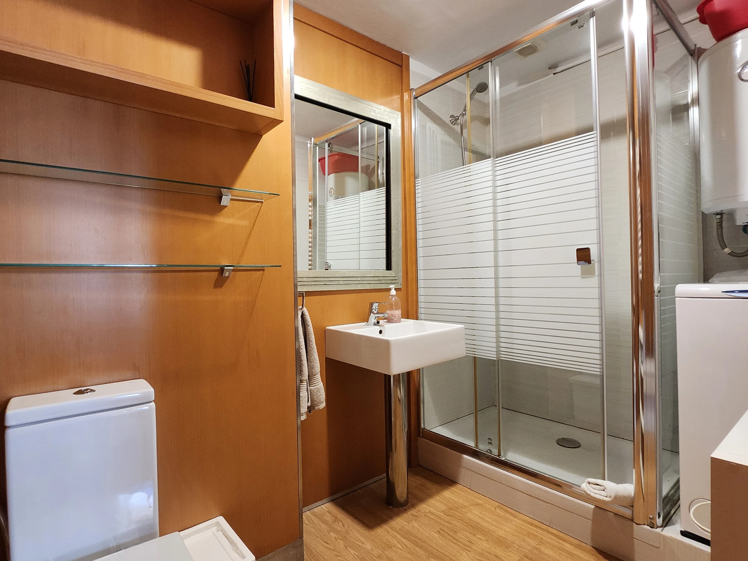 Accommodation comprises: 1 bedroom with double bed & fitted wardrobes. Open plan lounge/dining area and fitted kitchen (fridge with small freezer compartment, 2 ring ceramic hob, microwave, kettle, toaster etc. No oven). Bathroom with walk in shower & top loading washing machine.