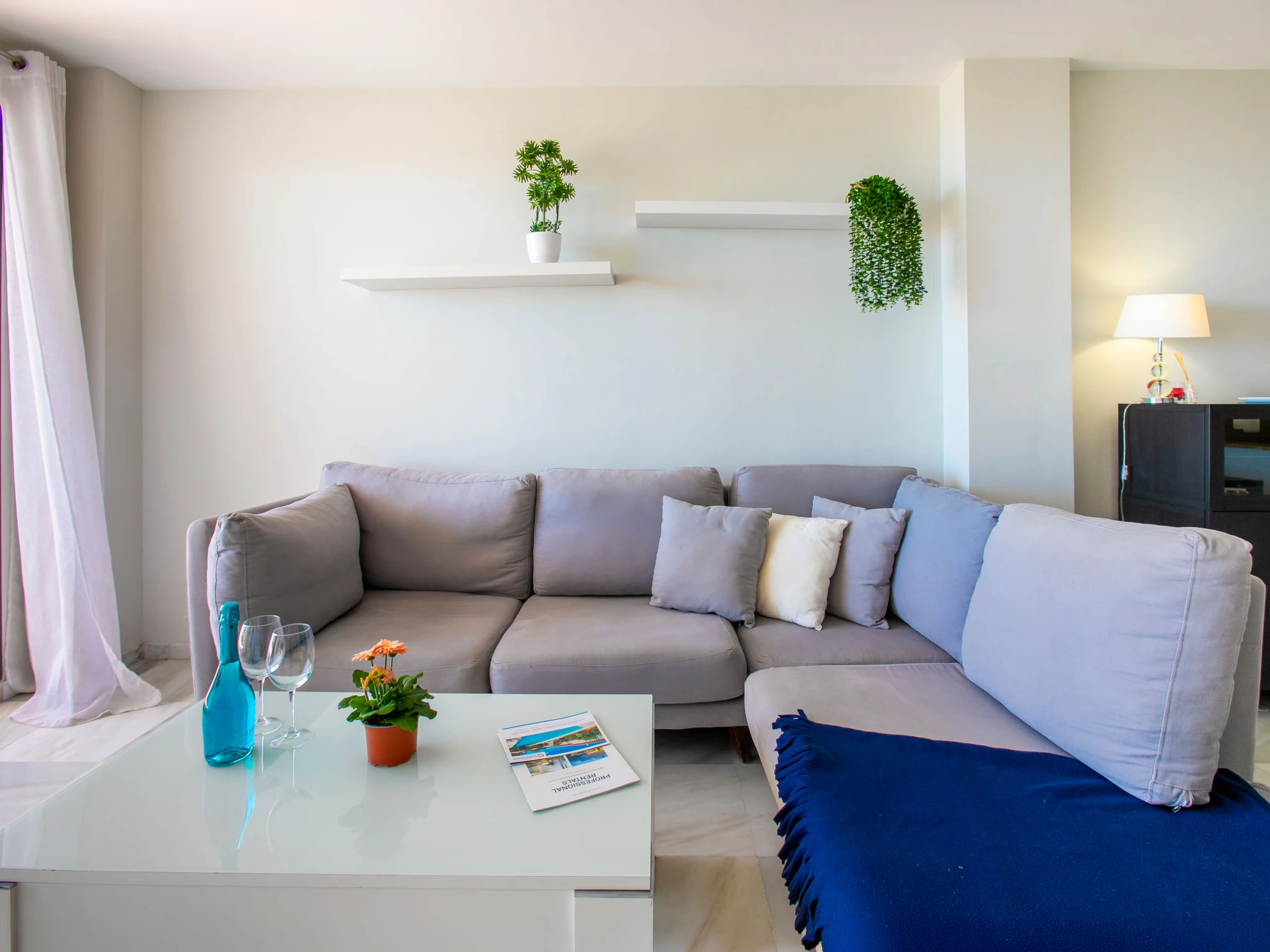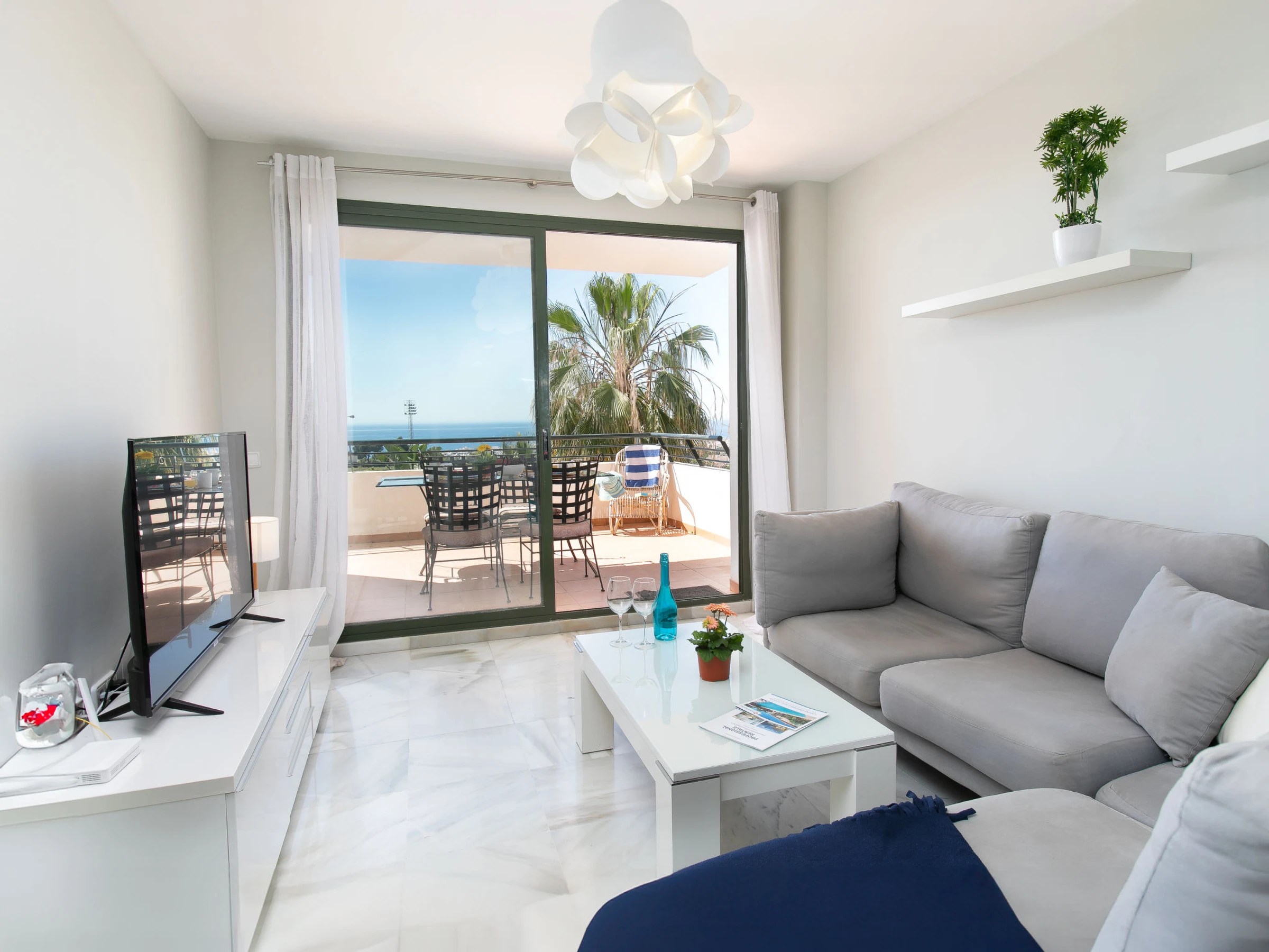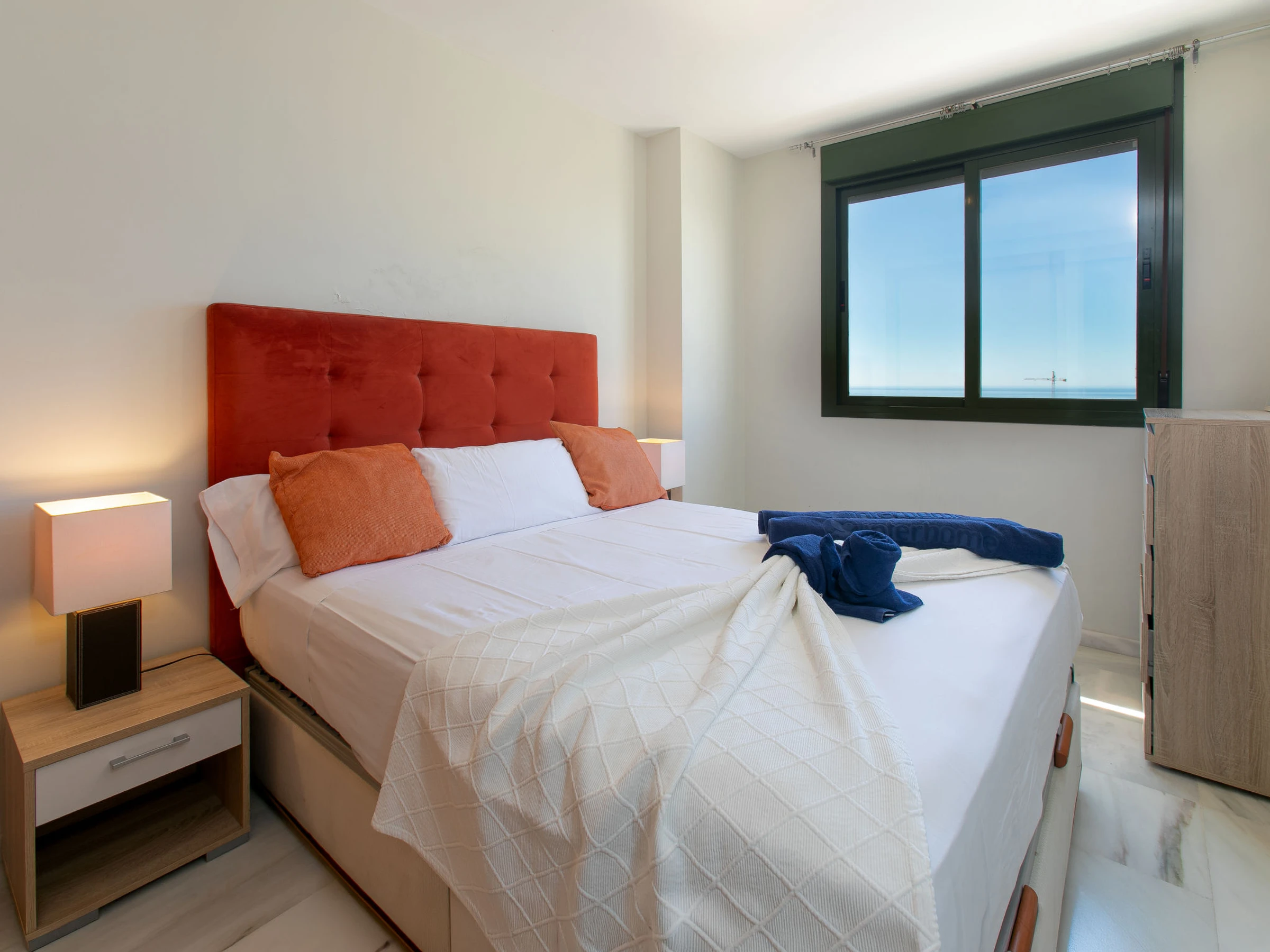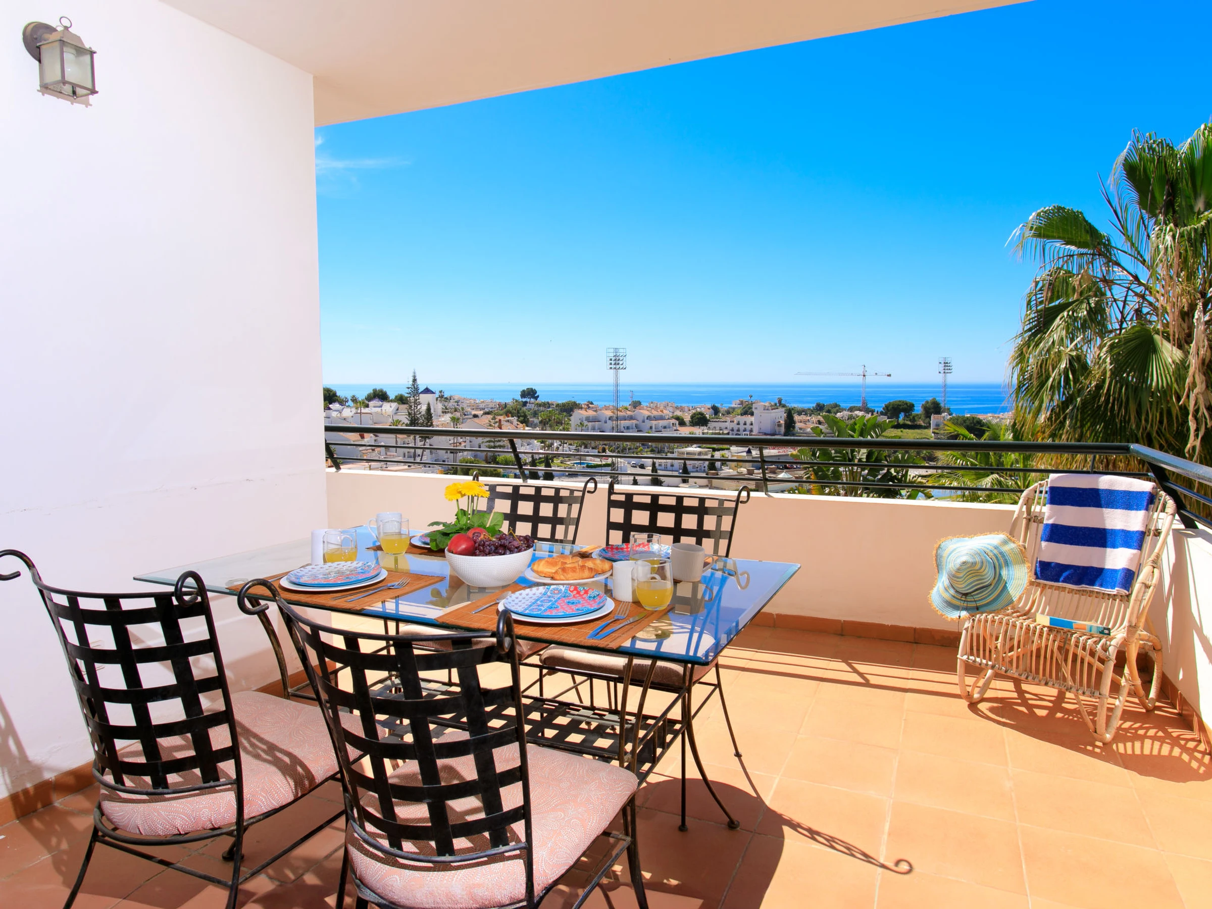 "Nerja Cielo", 3-room apartment 75 m2. Practical and comfortable furnishings: living/dining room with digital TV, air conditioning and forced-air heating. Exit to the terrace. 1 room with 2 beds (90 cm, length 190 cm), air conditioning and forced-air heating. 1 room with 1 french bed (150 cm, length 200 cm), bath/WC, air conditioning and forced-air heating. Open kitchen (oven, dishwasher, 4 ceramic glass hob hotplates, toaster, kettle, microwave, freezer, grill, electric coffee machine). Shower/WC. Large terrace. Terrace furniture. Very beautiful view of the sea and the resort. Facilities: washing machine, safe, iron, children's high chair, baby cot for up to 3 year olds, hair dryer. Internet (WiFi, free). Parking space n 2. [hidden] // Reg. Nr.: ESFCTU0000290130009343550000000000000000[hidden]8