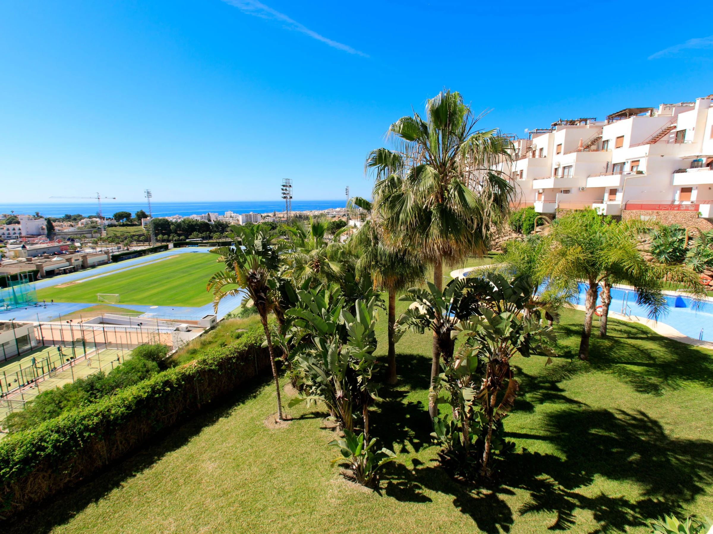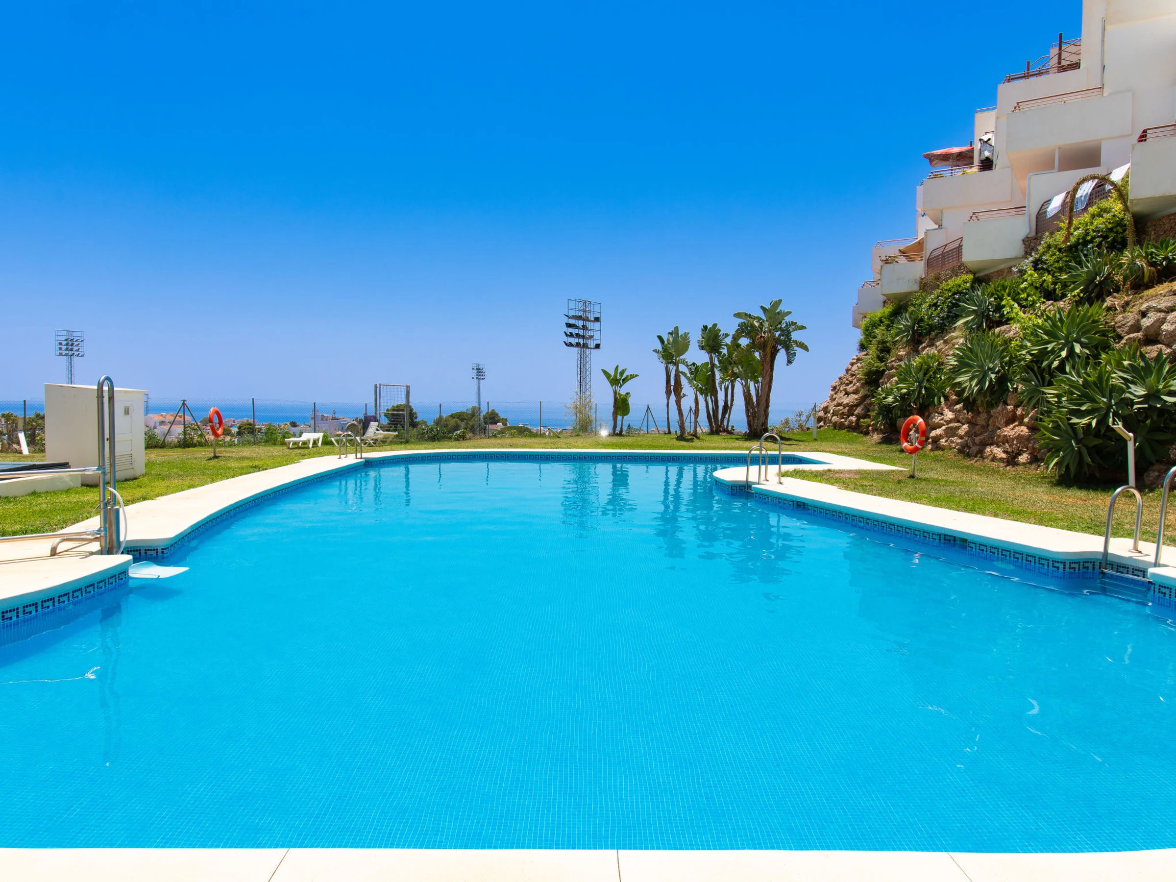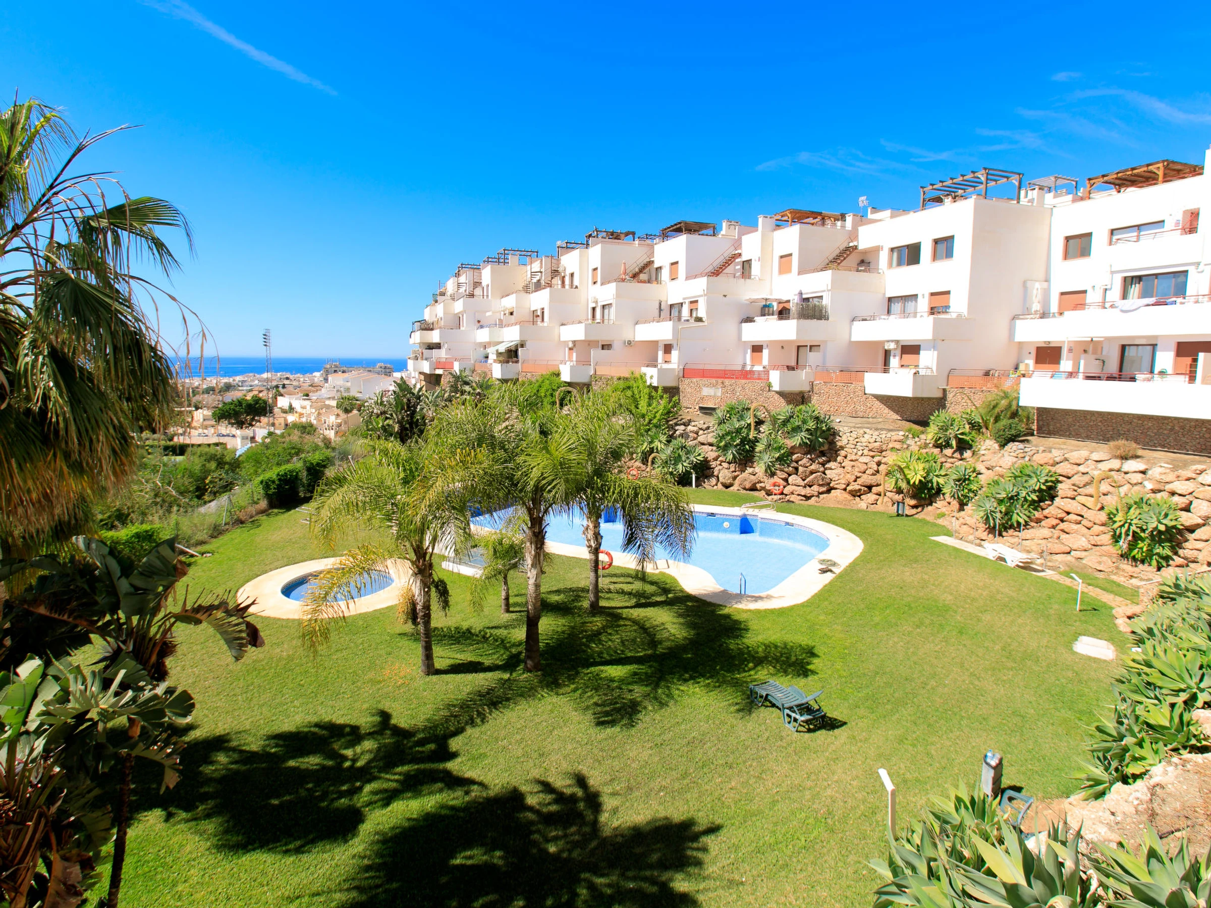 Nerja: Beautiful, comfortable apartment block "Nerja Cielo". In the resort, 1 km from the centre, in a quiet, sunny position, 500 m from the beach, south facing position. For shared use: lawn for sunbathing, swimming pool angular (15 x 5 m, depth 100 - 170 cm, seasonal availability: [hidden] - [hidden] In the house: lift. Parking space n 2. Shop, supermarket, bus stop 100 m, diving center 500 m, thermal baths 50 m. Sports harbour 17 km, golf course (18 hole) 23 km, walking paths from the house 2 km. Nearby attractions: Cueva de Nerja, Museo de Nerja, Museo miel de caña Frigiliana, Acantilados de Maro, Aquavelis, Alhambra Granada. Well-known ski regions can easily be reached: Sierra Nevada. Hiking paths: Sierra Tejeda, Sierra Almijara, Las Alpujarras. The owner does not accept any youth groups. Please note: Loading and unloading of baggage is possible at the holiday house.