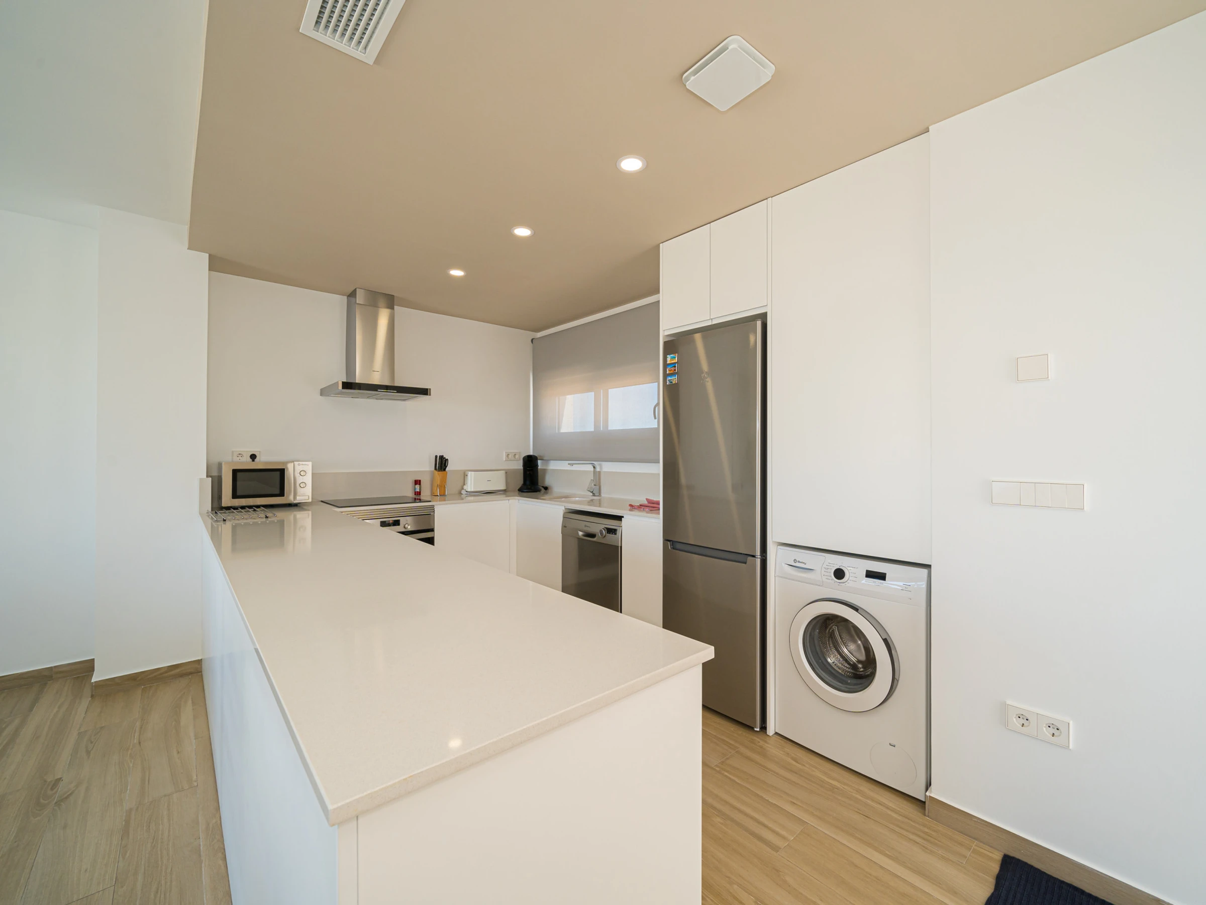 In the vitroceramic open plan kitchen, refrigerator, microwave, oven, freezer, dishwasher, dishes/cutlery, kitchen utensils, coffee machine, toaster and kettle are provided.