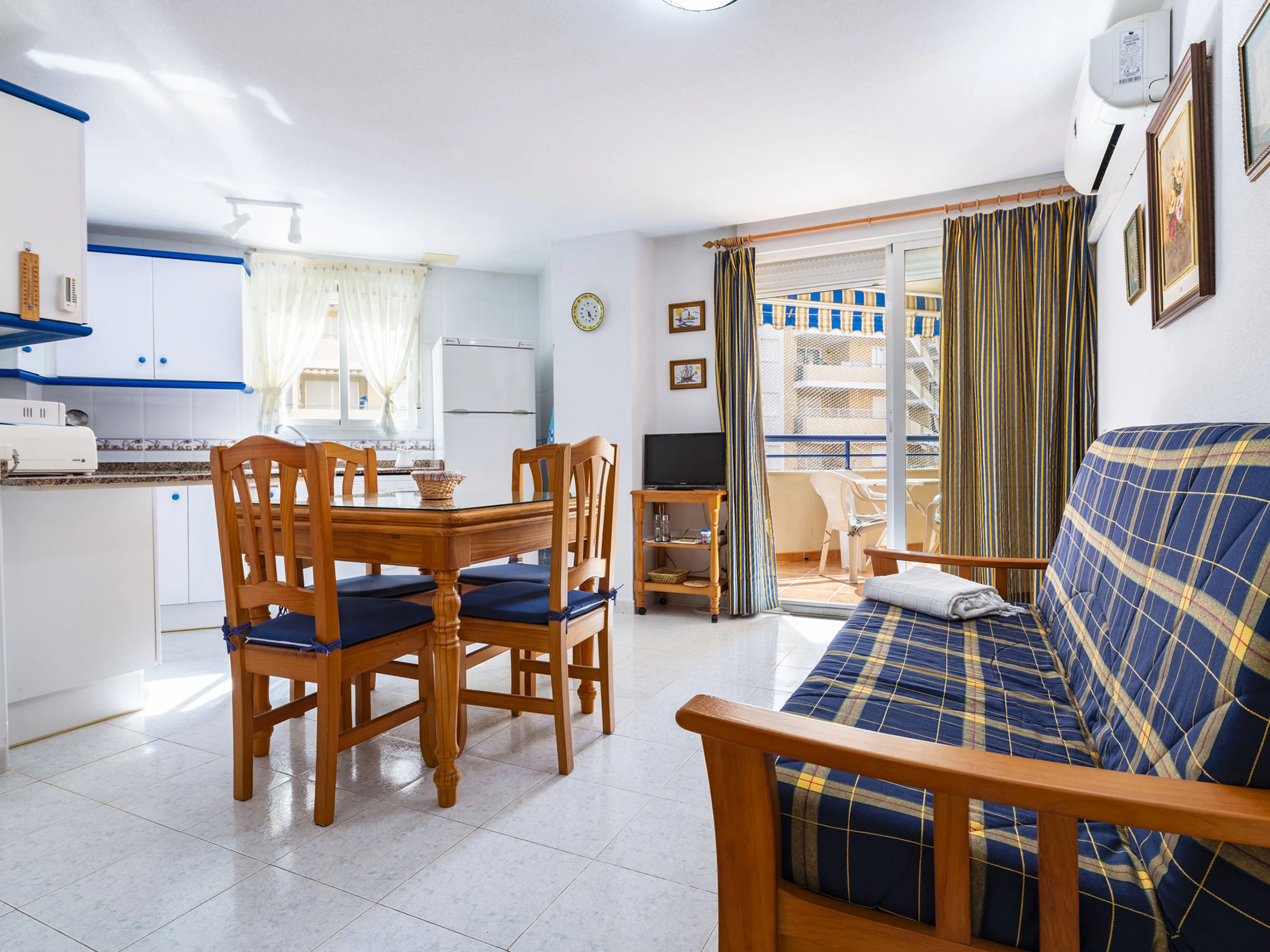 "Bonaire IV - La Concha", 2-room apartment 45 m2 on 4th floor. Practical and comfortable furnishings: living/dining room with dining table, digital TV, flat screen, air conditioning and forced-air heating. Exit to the terrace. 1 room with 1 french bed (135 cm, length 190 cm). Open kitchen (oven, 4 ceramic glass hob hotplates, toaster, microwave, freezer, electric coffee machine). Bath/bidet/WC. Terrace. Terrace furniture. View of the resort. Facilities: washing machine, iron, hair dryer. Please note: non-smokers only, no parking. 1 small pet/ dog allowed. [hidden] // Reg. Nr.: ESFCTU00001202600049183400000000000000000[hidden]1