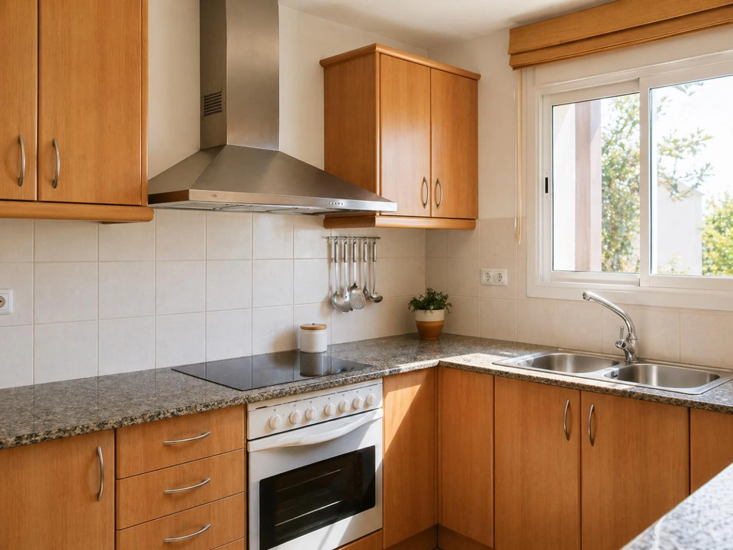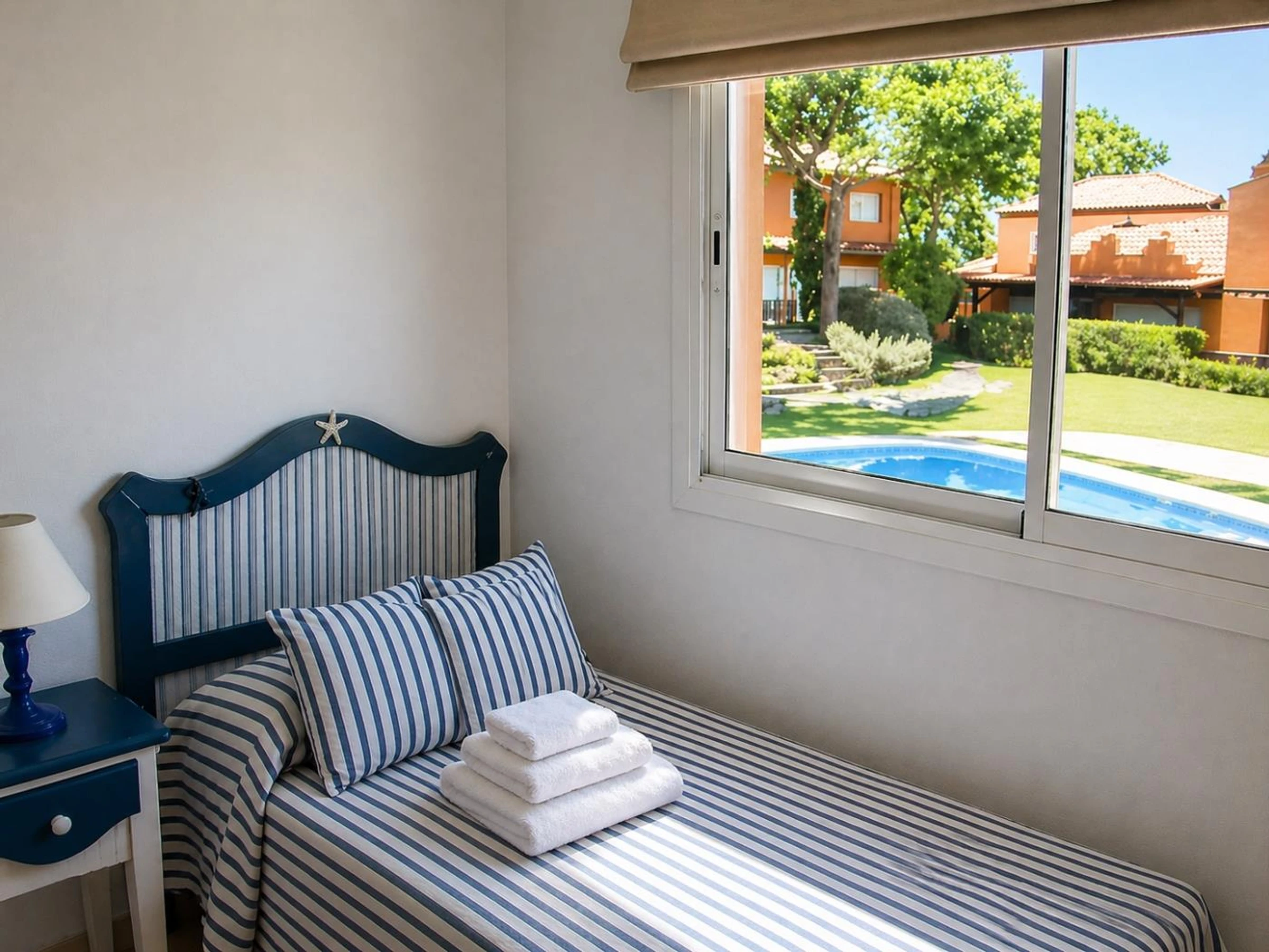 The property is part of one of the most attractive communities in the area, boasting a communal swimming pool, extensive gardens, and lush pine trees, creating an unparalleled natural and family-friendly atmosphere.