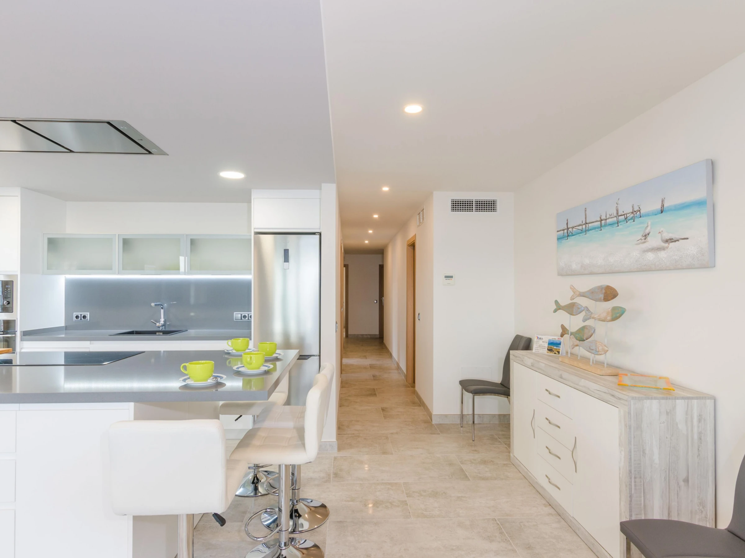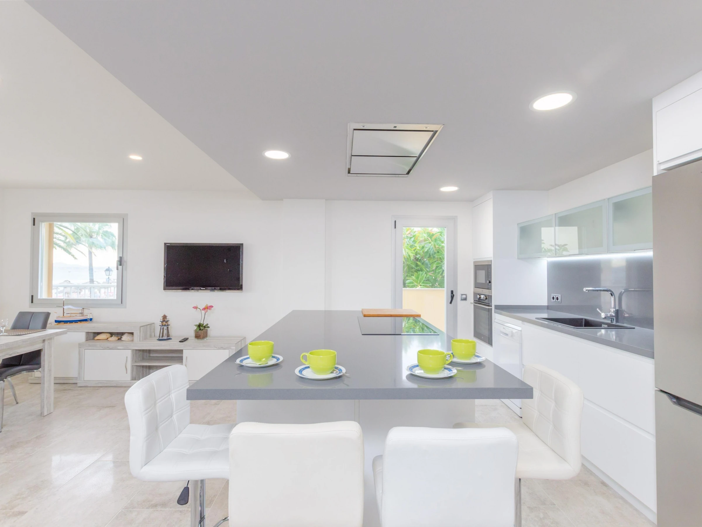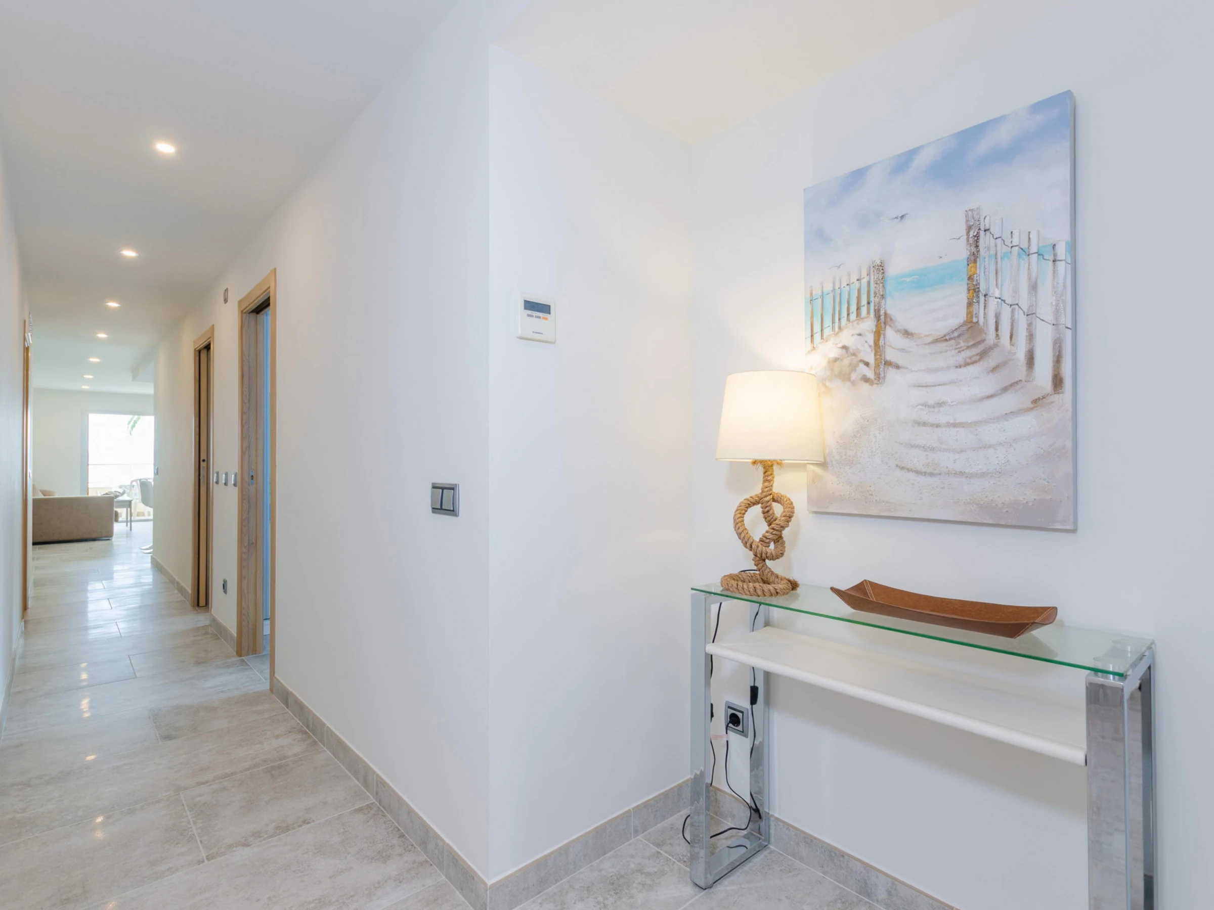 The inside of this apartment boasts luxury and modernity, as well as spacious rooms such as the impressive living-dining-kitchen. This space becomes a very functional place because you can chat or watch satellite TV while cooking or enjoying your meals. The kitchen area is independent and it offers a ceramic top on a fantastic island with stools as well as an oven, microwave and much more. The laundry room is independent and it has a washing machine, an iron and an ironing board. A beautiful corridor leads to the shower bathroom and the 3 bedrooms. All of them feature a closet. One has a double bed and en-suite shower bathroom, and the other two present two twin beds each. A cot and a high chair are available on request. Finally, the whole accommodation is equipped with ducted air-conditioning.