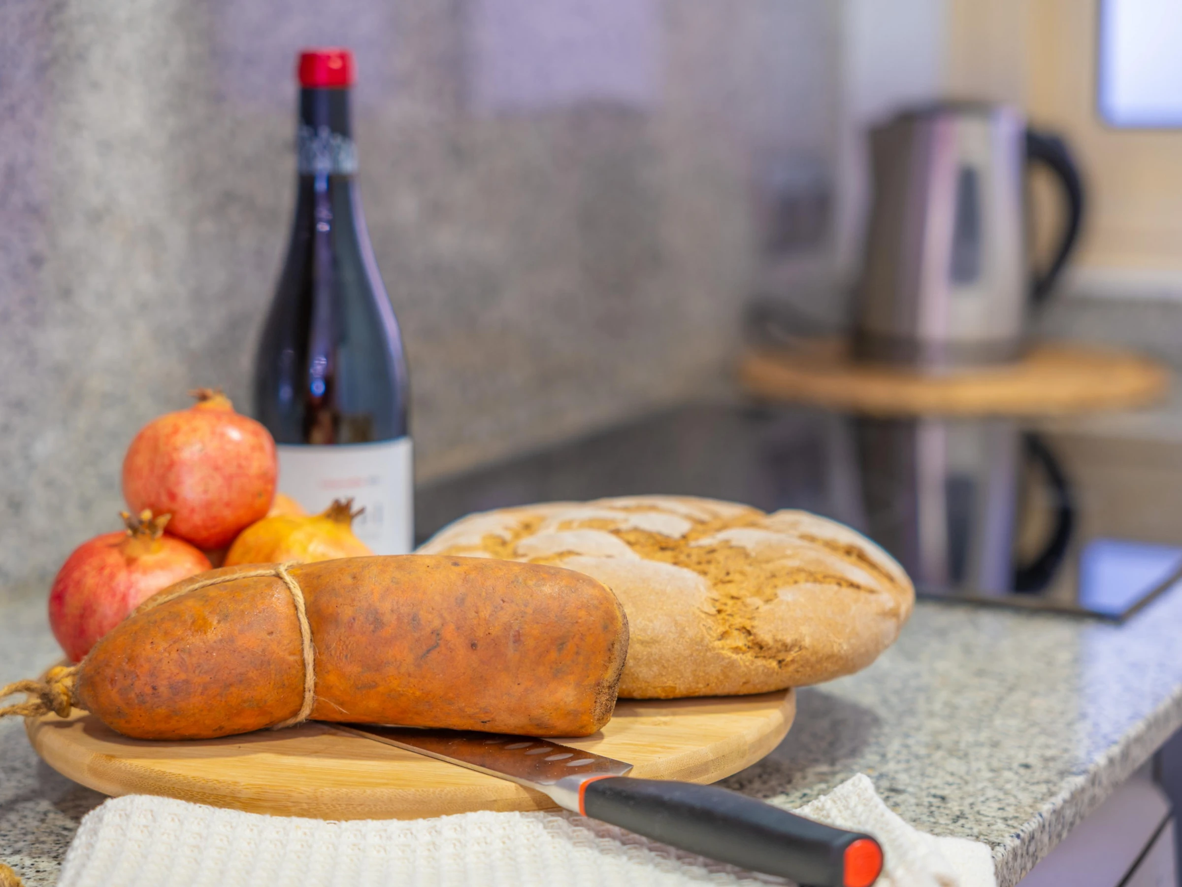 Inside, the apartment blends style and practicality in a modern, welcoming setting. The air-conditioned living room, complete with Smart TV and satellite channels, flows seamlessly into the open-plan kitchen and dining area, fully equipped with an induction hob and all the essentials for effortless cooking and dining. There are two bedrooms: one with a double bed, wardrobe, air conditioning, and an en-suite shower room; the other with two single beds and air conditioning. A second bathroom with a shower adds extra comfort. The separate laundry room includes a washing machine, iron, and ironing board. To ensure a pleasant and convenient stay for the whole family, the apartment also provides a baby cot and high chair.