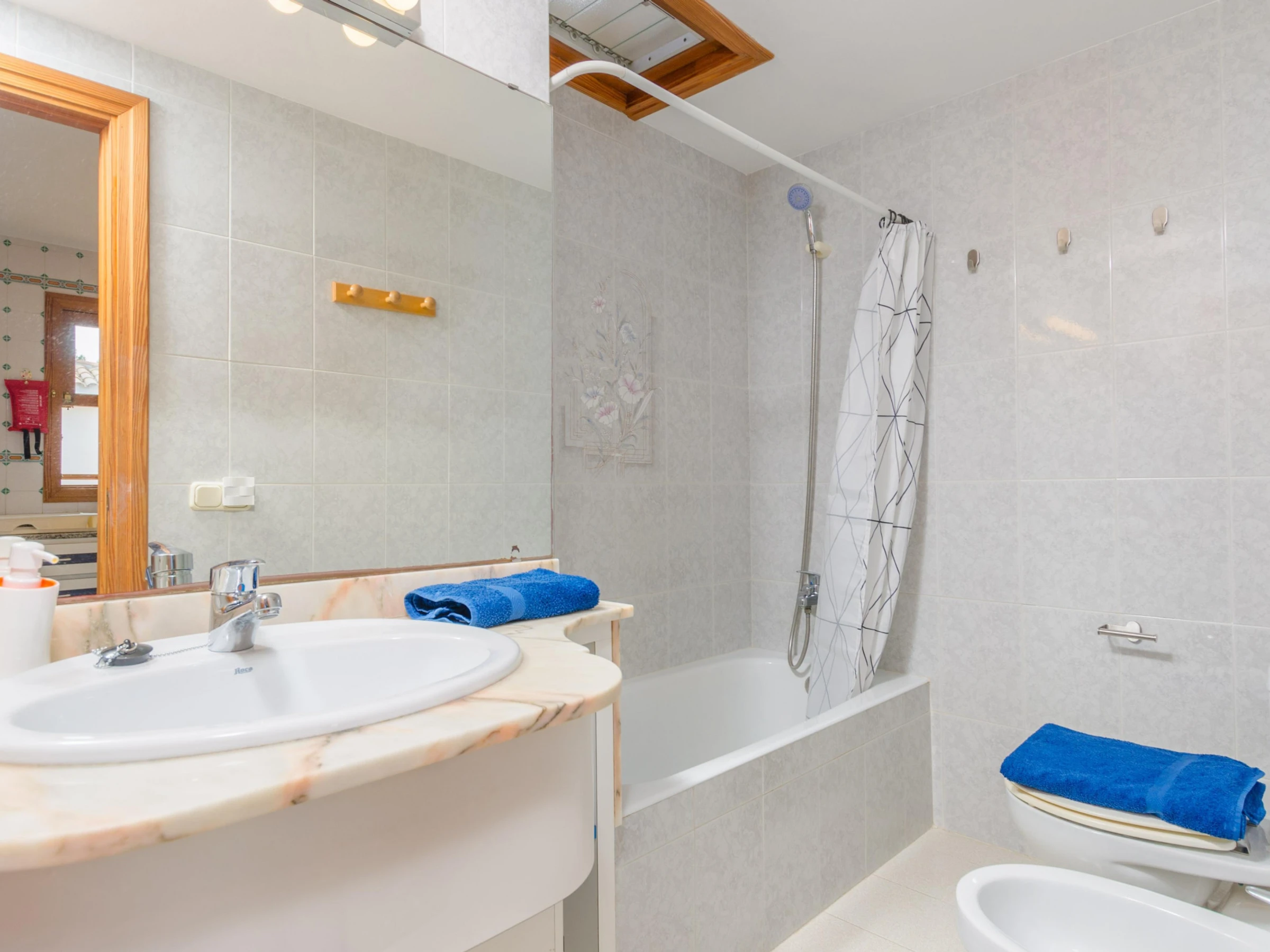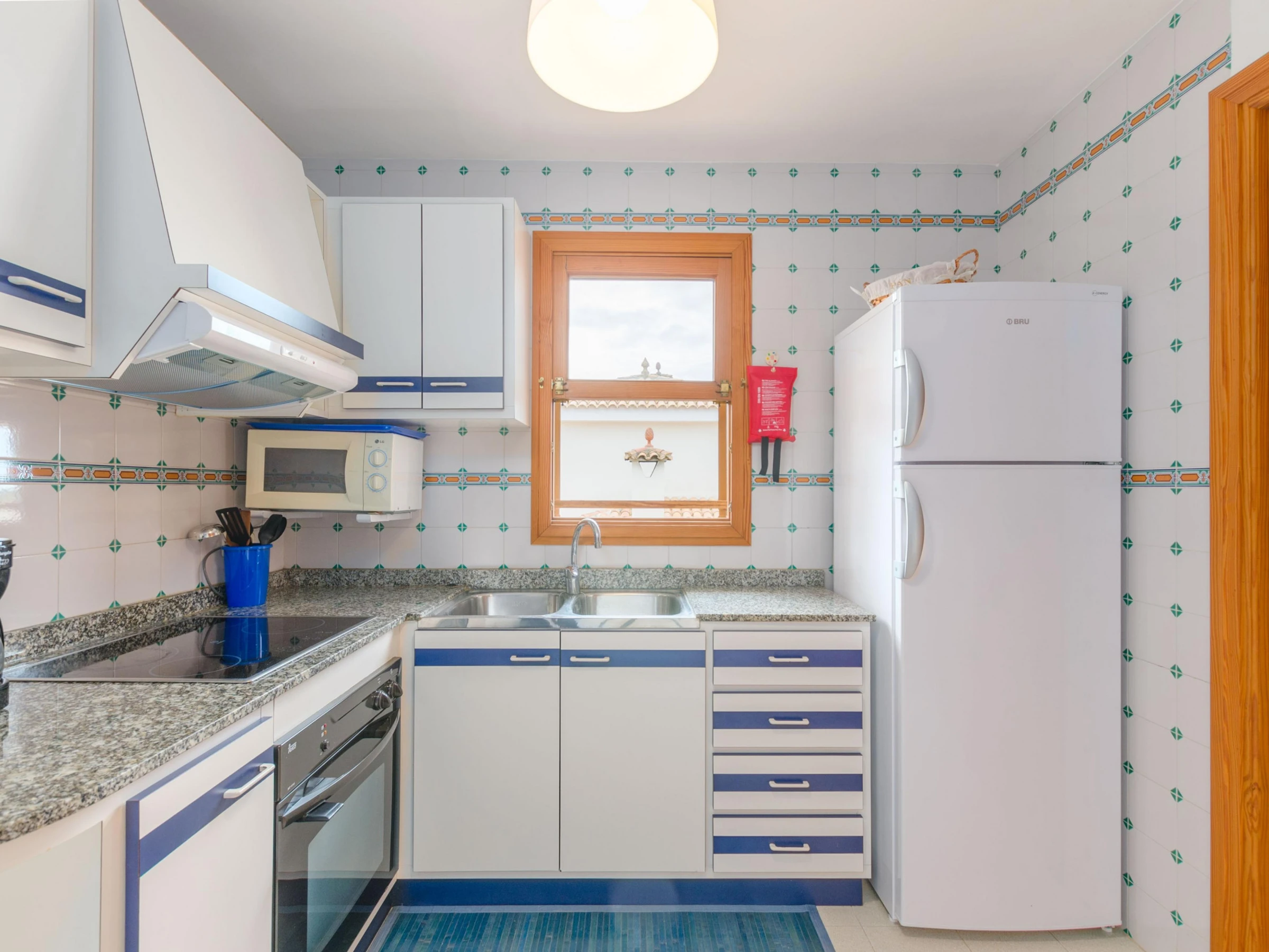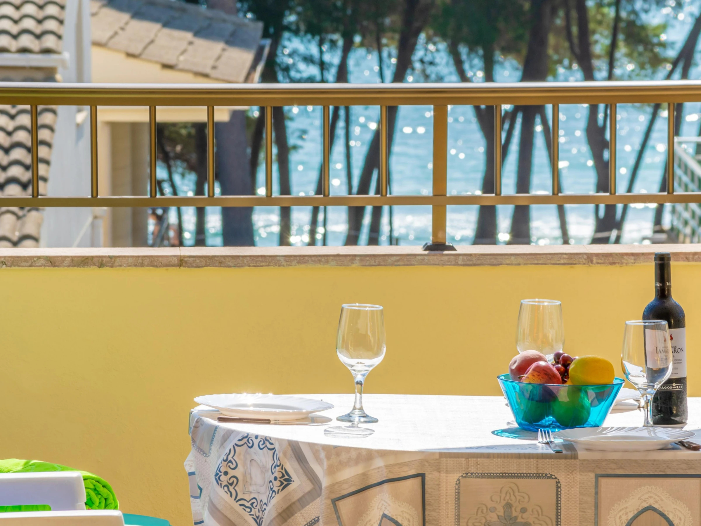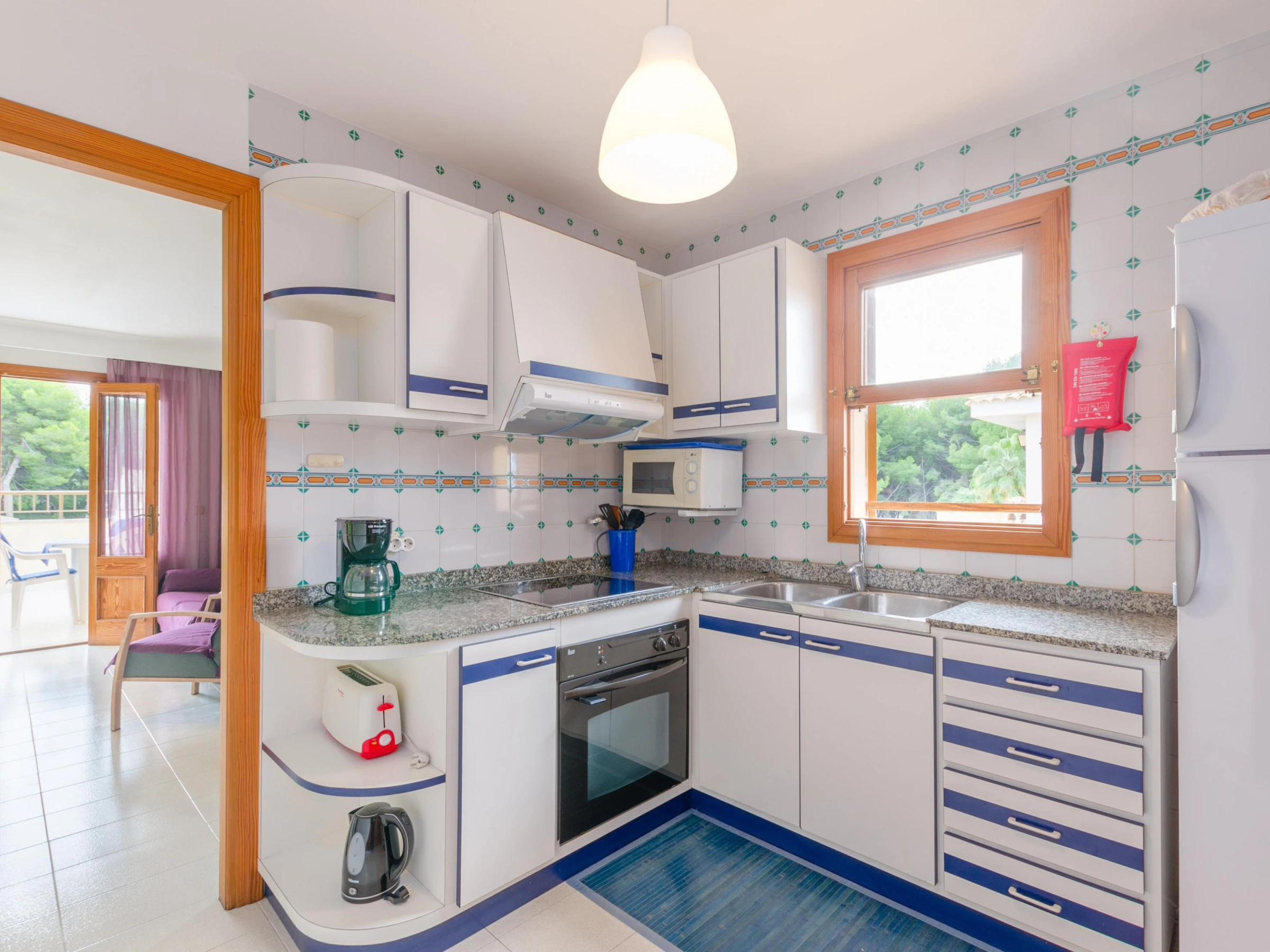 It is on the 2nd floor without lift where, as you enter, a hallway leads you to a modern and cheerful living-dining room equipped with air conditioning, satellite TV and a glass dining table with comfortable chairs. It is the perfect place for a well-deserved rest on the sofa after a long day at sea or for a tasty dinner under cover. The kitchen, traditional yet with a beach feel, offers a ceramic hob, oven, microwave and all the utensils and appliances needed to cook to your heart's content. Then we have a bathroom with bathtub, which serves the whole house, and two bedrooms, one with a double bed, wardrobe, direct access to the terrace and space to prepare a cot and a highchair; and the second with a sofa bed for our third guest. The washing machine, iron and ironing board are on the terrace.