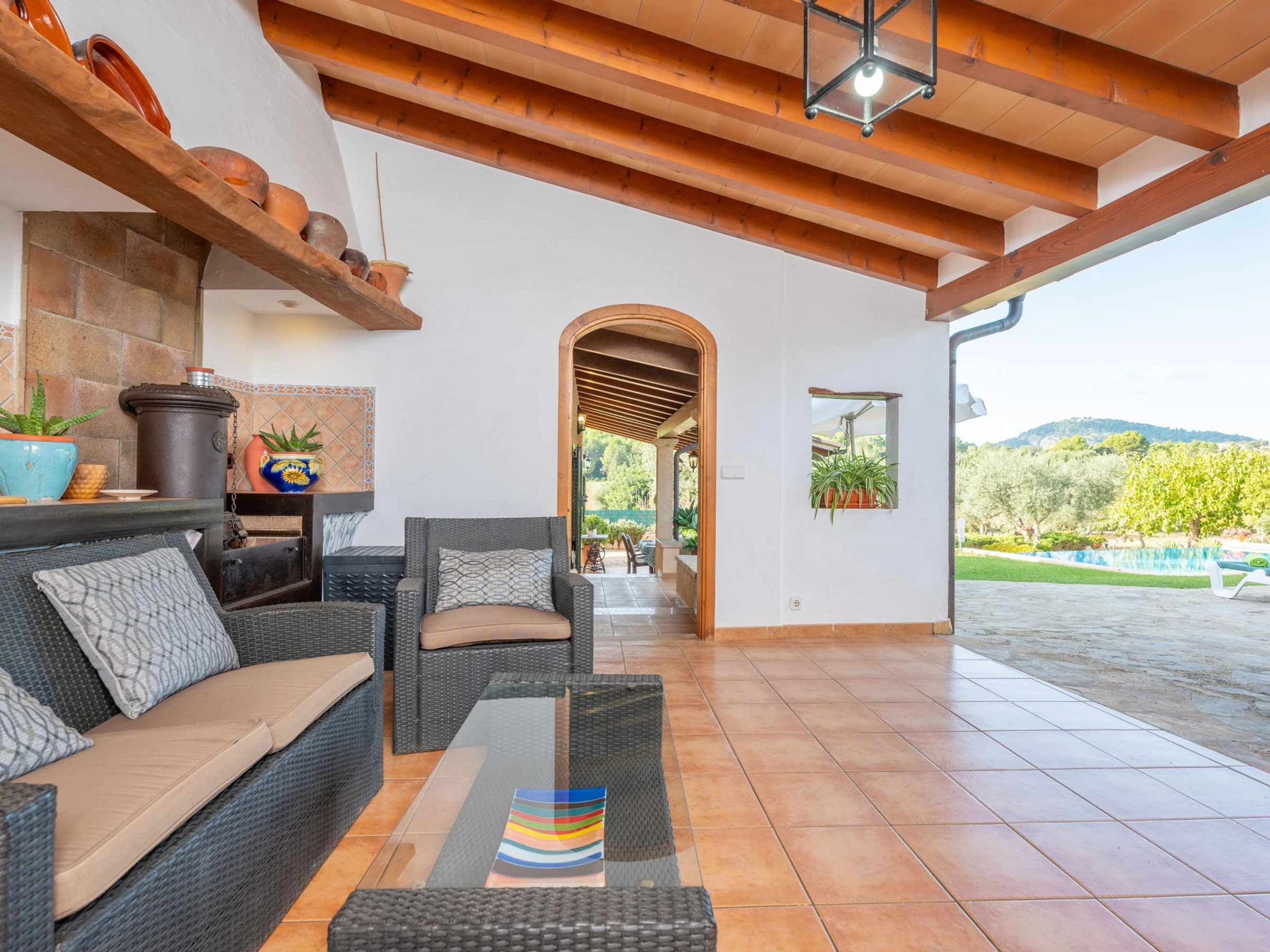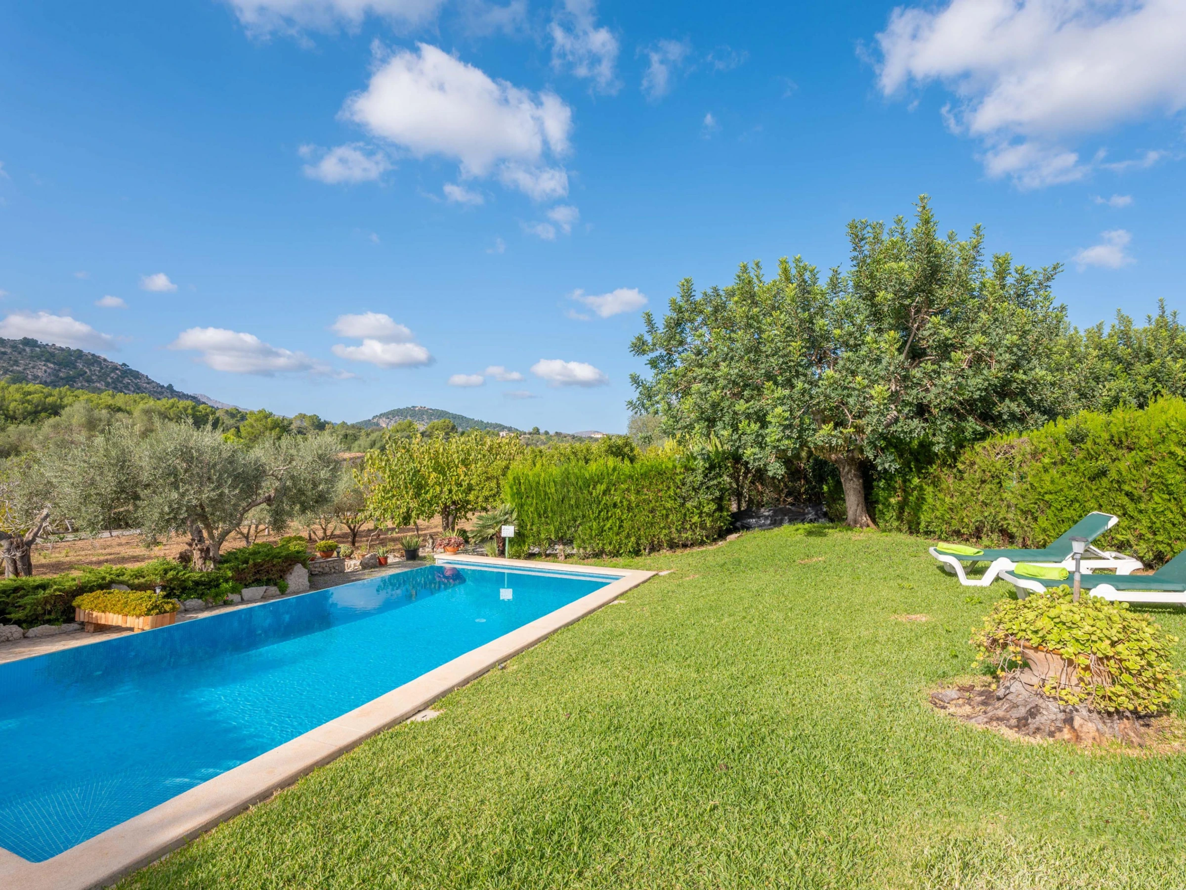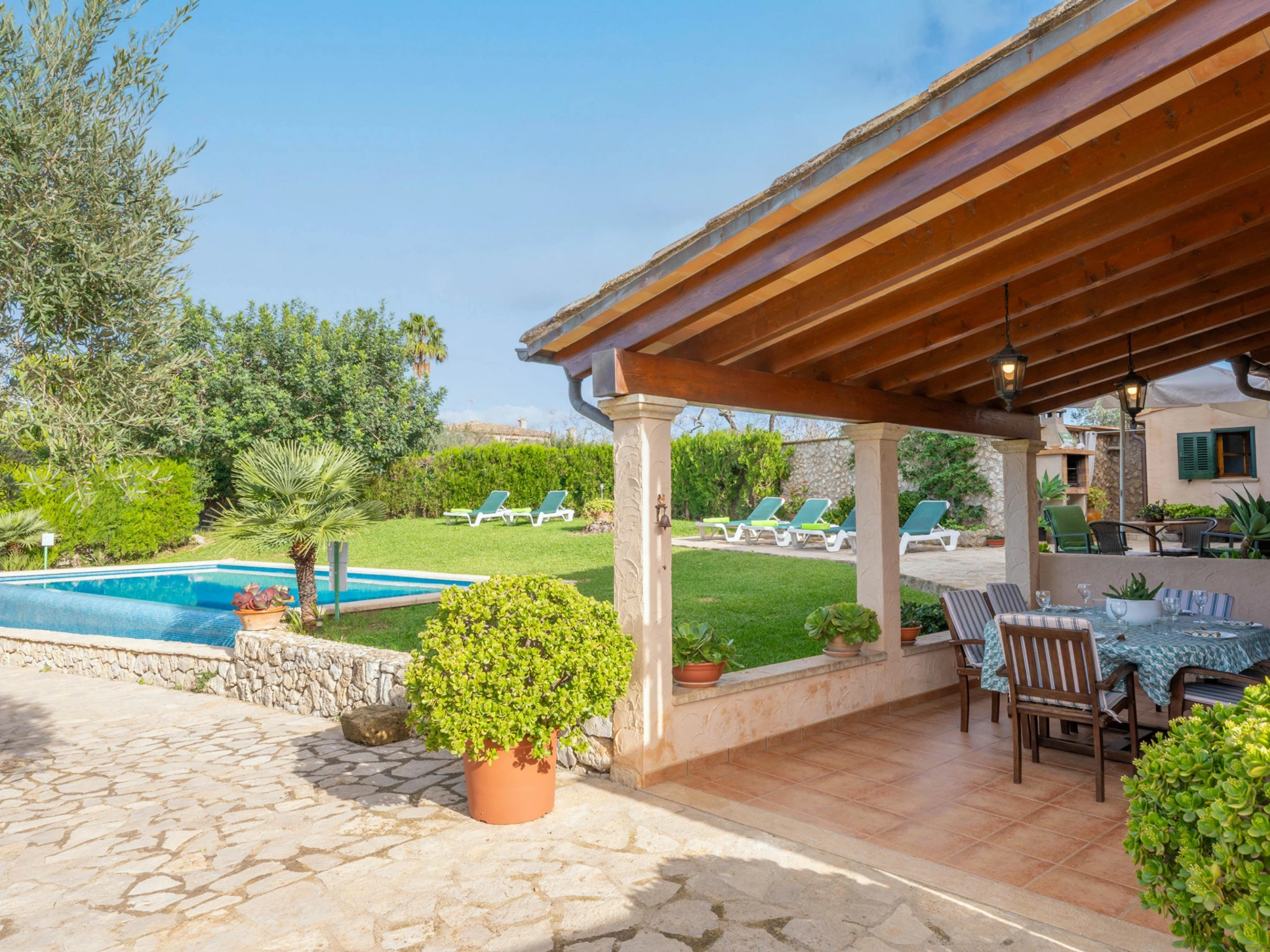 The perfect exterior of this villa is prepared to enjoy with all your companions the tranquillity of the nature of Mallorca. With a chlorine pool measuring 8x4 metres and a depth of 2 metres, it is ideal for a refreshing swim in the hot summer. The swimming pool is surrounded by a well-kept lawn where you will find sun loungers where you can sunbathe. Next to the porch you will find the barbecue where you can prepare dinner outdoors thanks to the tables and chairs provided in the porch.