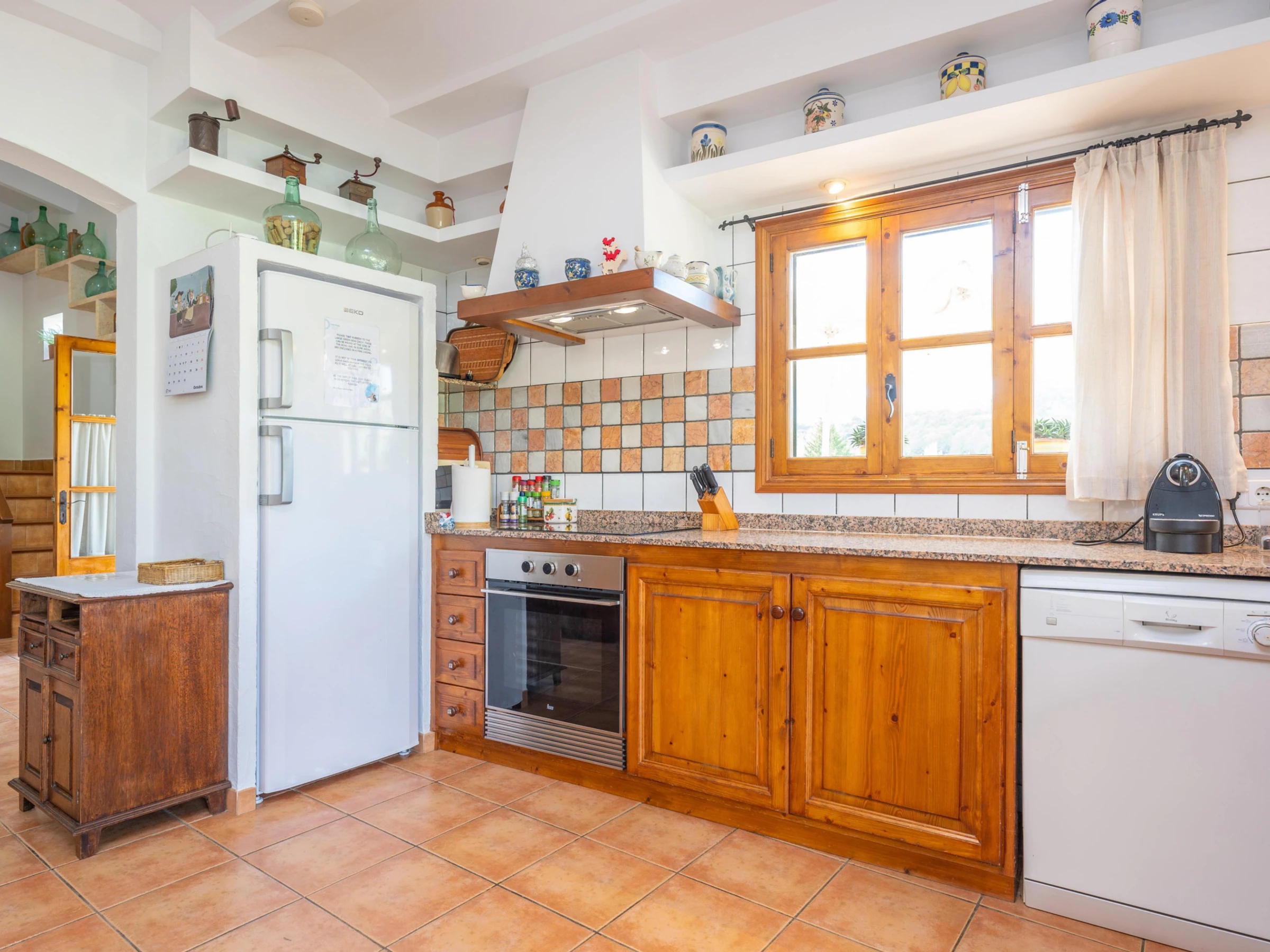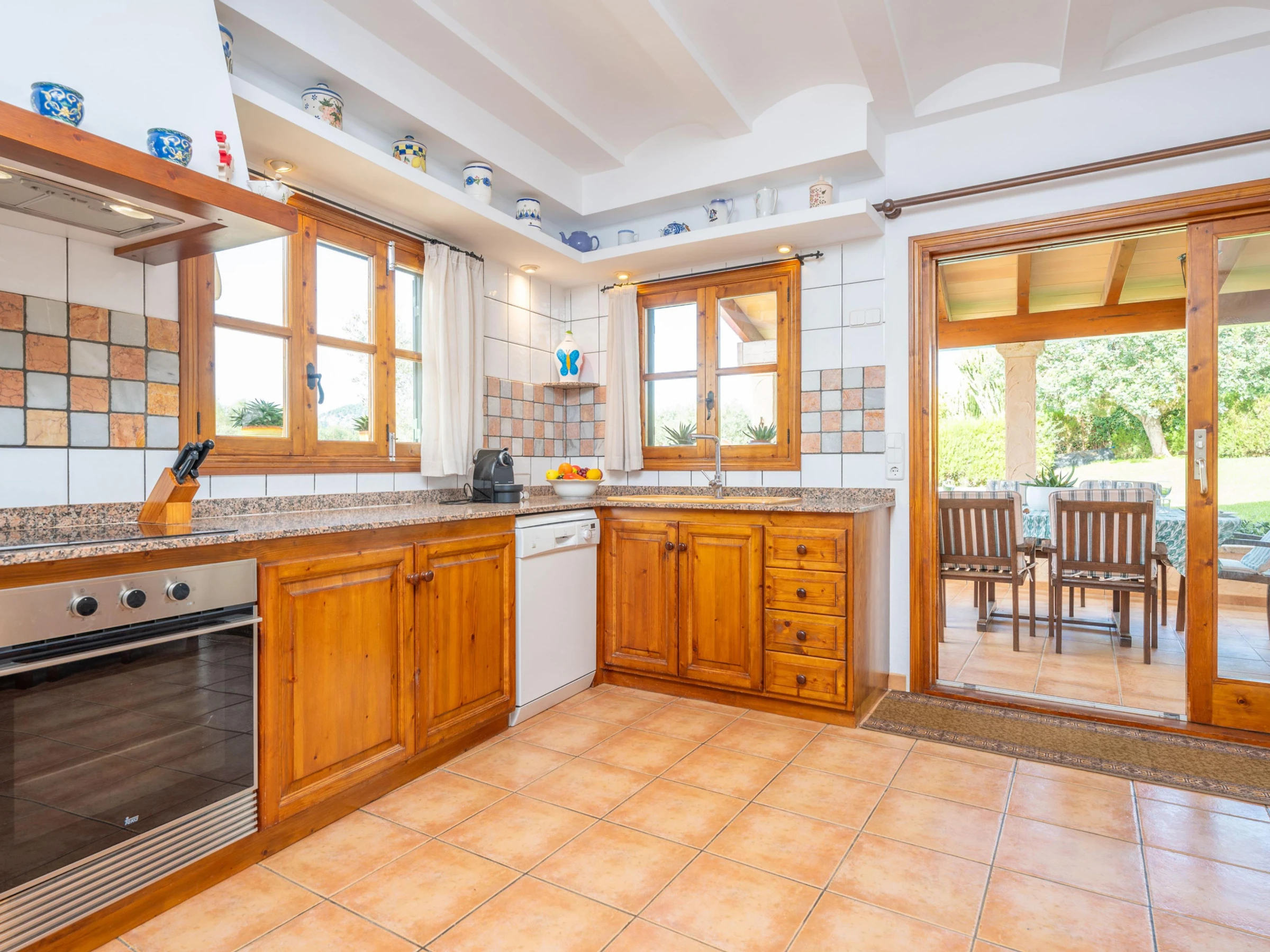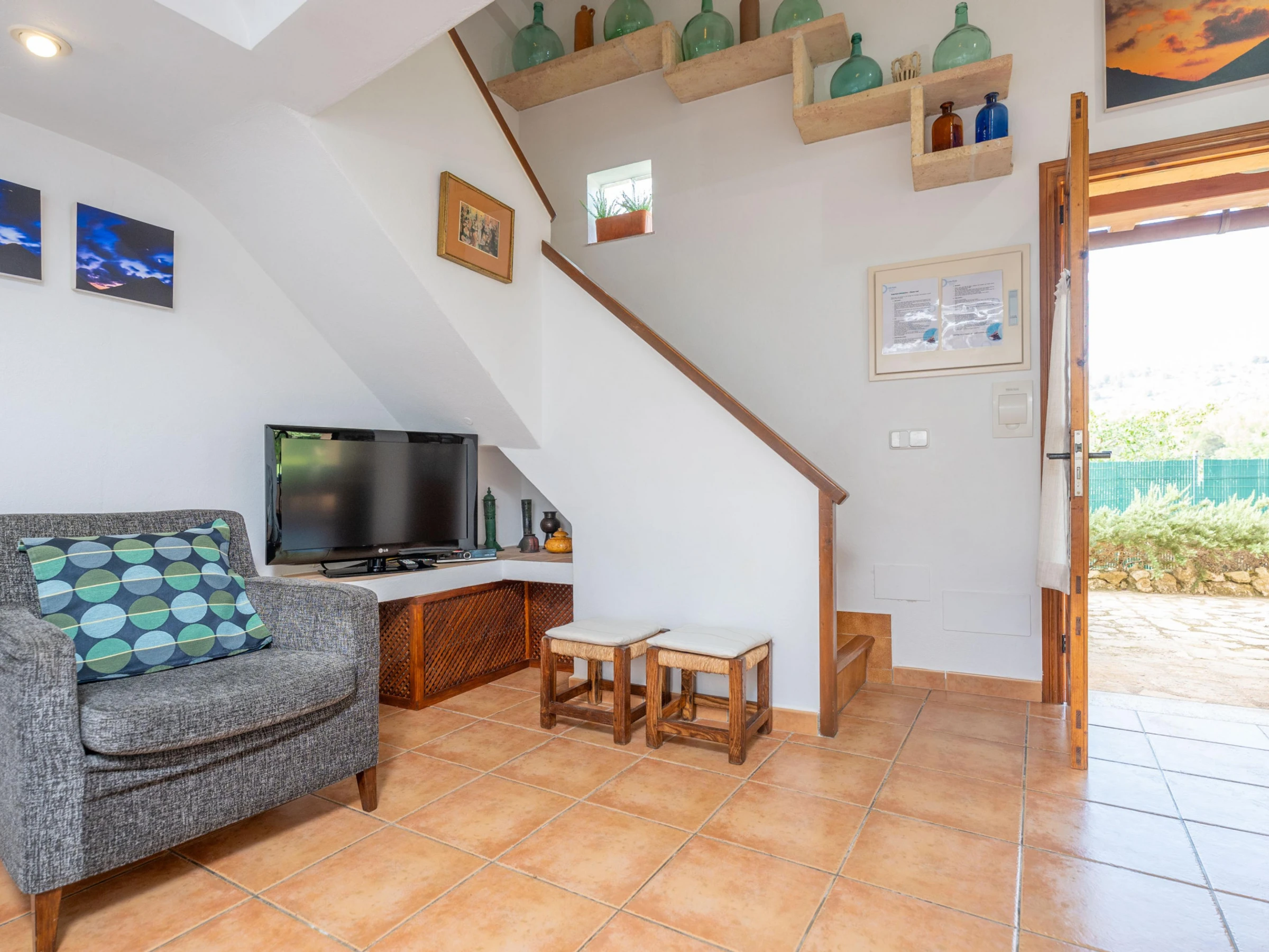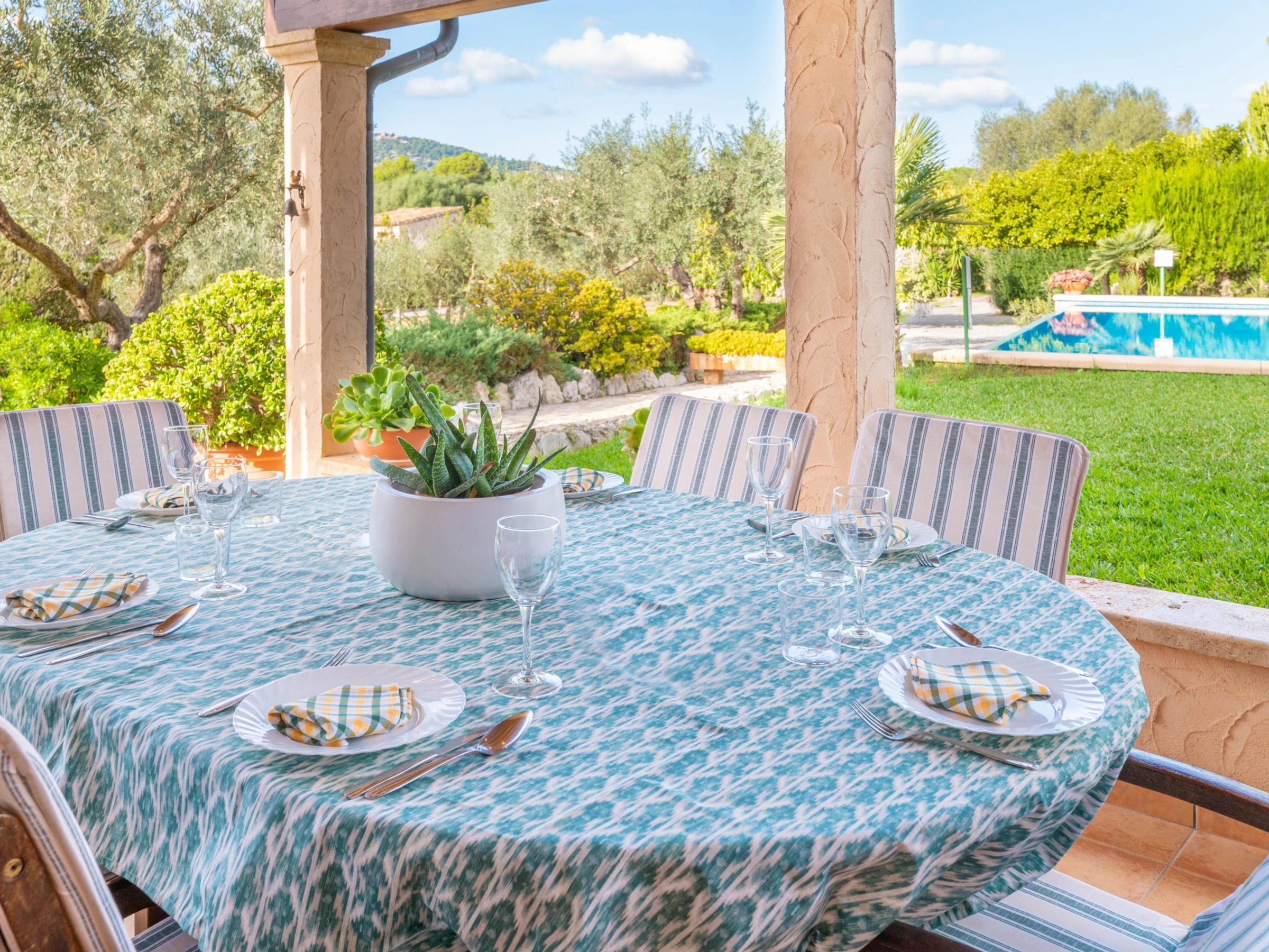 The perfect exterior of this villa is prepared to enjoy with all your companions the tranquillity of the nature of Mallorca. With a chlorine pool measuring 8x4 metres and a depth of 2 metres, it is ideal for a refreshing swim in the hot summer. The swimming pool is surrounded by a well-kept lawn where you will find sun loungers where you can sunbathe. Next to the porch you will find the barbecue where you can prepare dinner outdoors thanks to the tables and chairs provided in the porch.