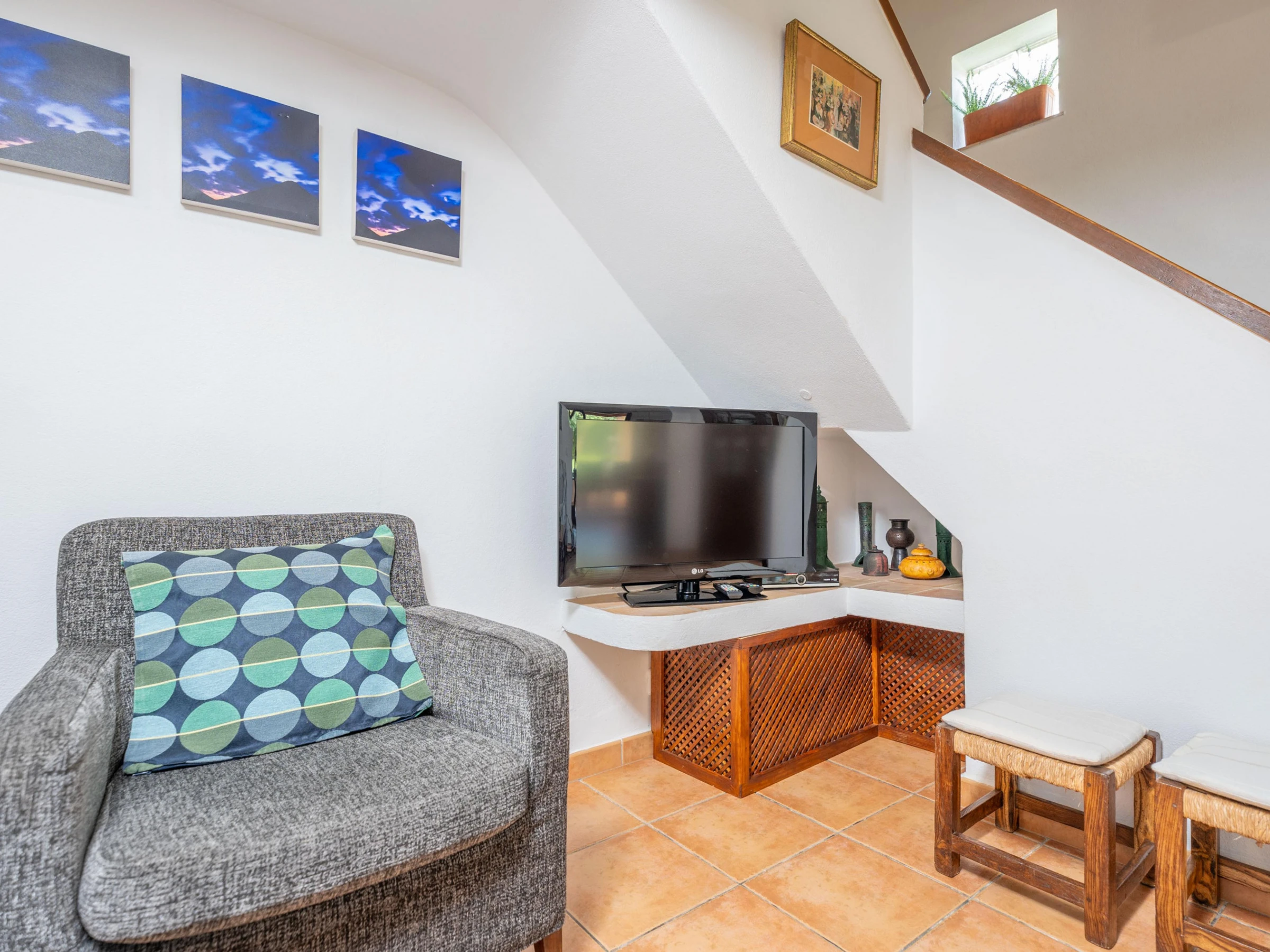 In the rustic interior of the villa, distributed over 2 floors, there is a living room with a large sofa where you can relax during the afternoon. The ceramic hob kitchen, equipped with all the necessary utensils for cooking during your stay, has a table where you can eat with your companions. To complete the ground floor, there is the first bedroom with a double bed, wardrobe, A/C and an en-suite bathroom with shower. Upstairs are the remaining two bedrooms, the first one with a double bed and the last one with two single beds. Both have wardrobes and A/C. Please note that a change of bed linen and towels is included during your stay. A full bathroom with shower serves the first floor. If you are travelling with a baby, a cot and high chair are provided. Finally, you can make use of the washing machine and iron available in the house.