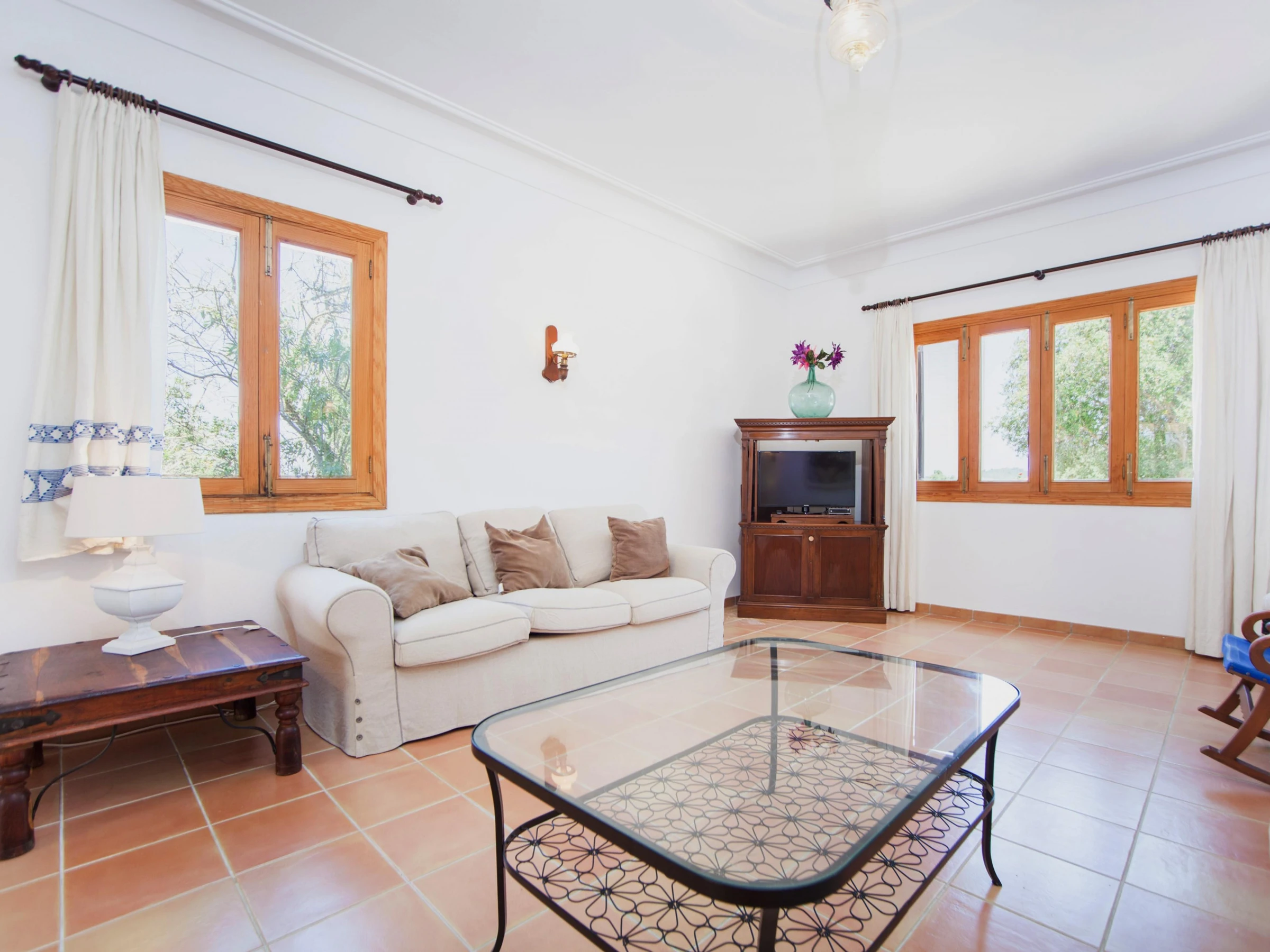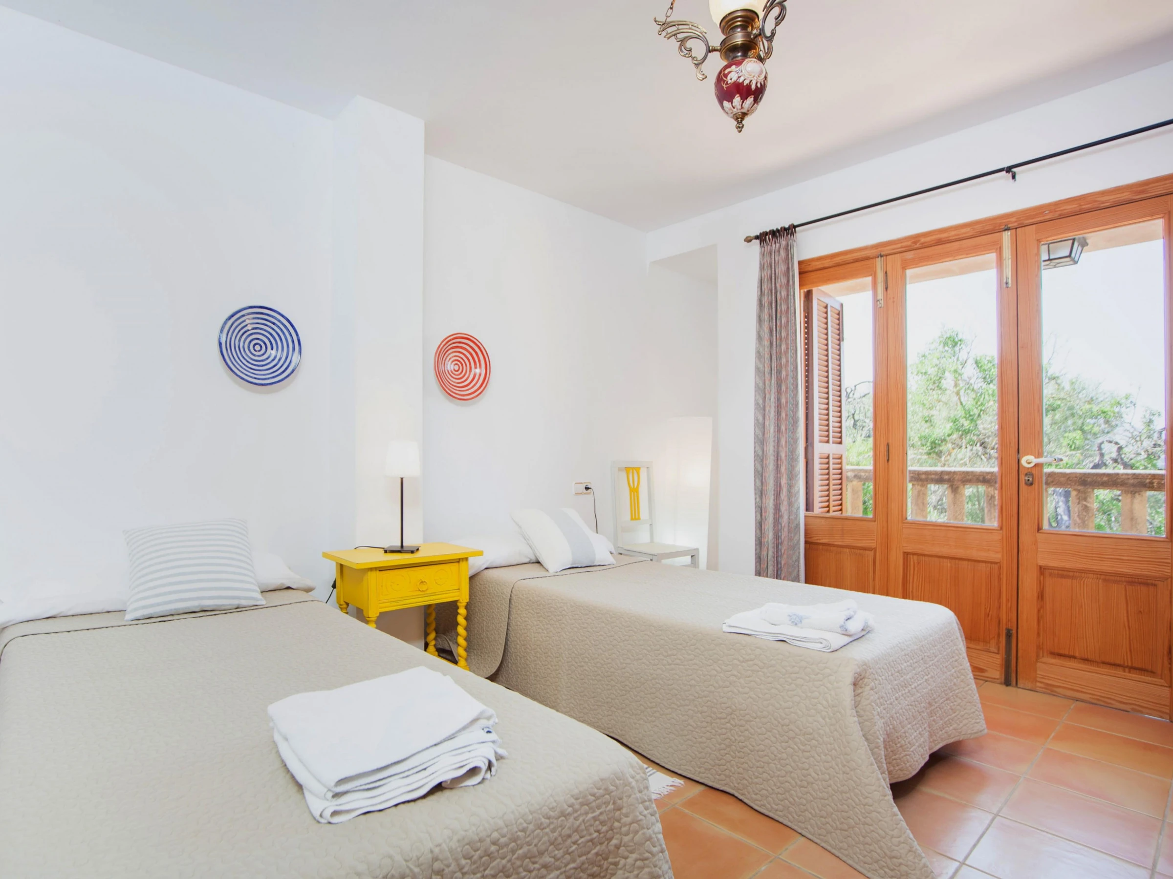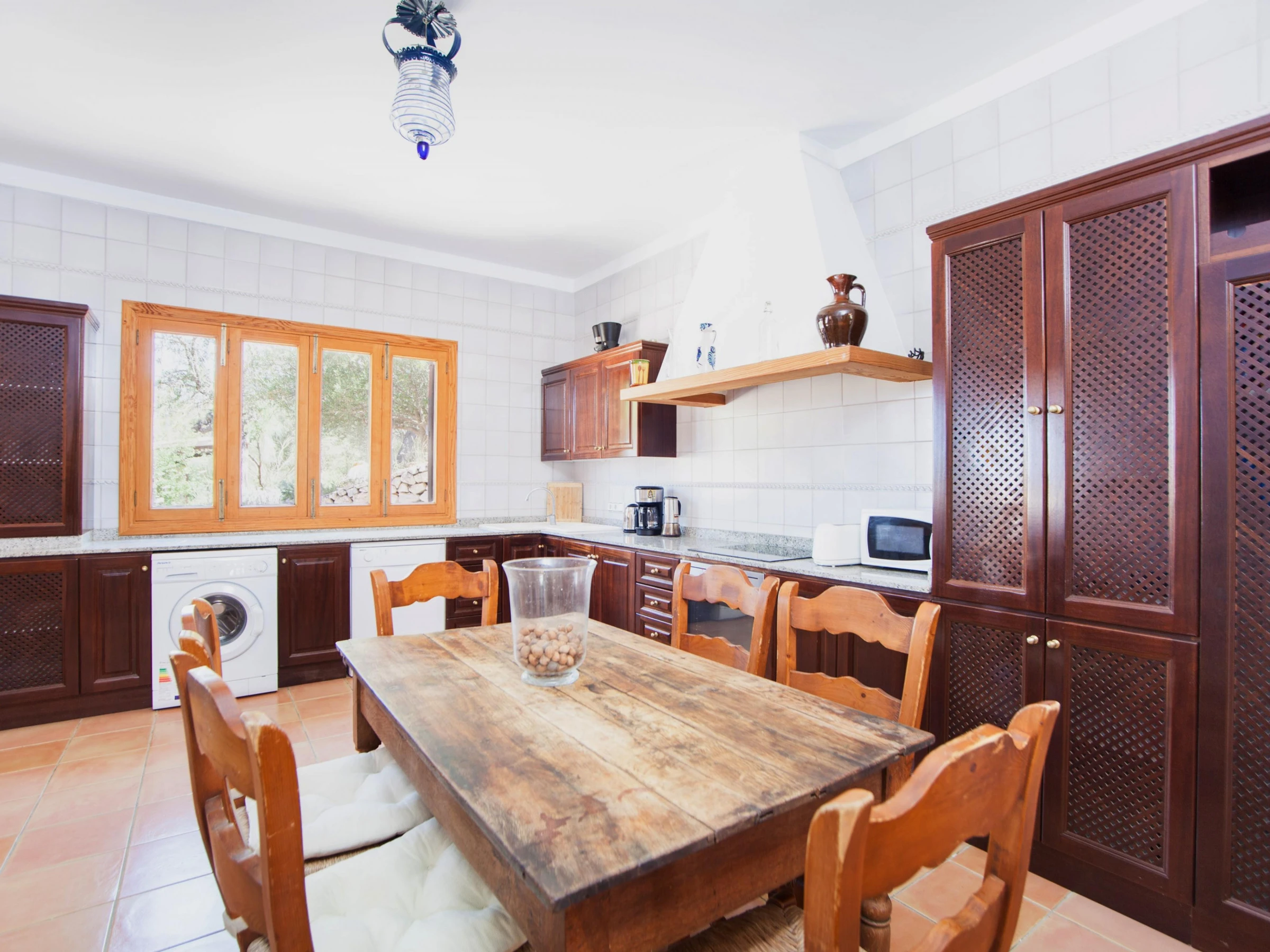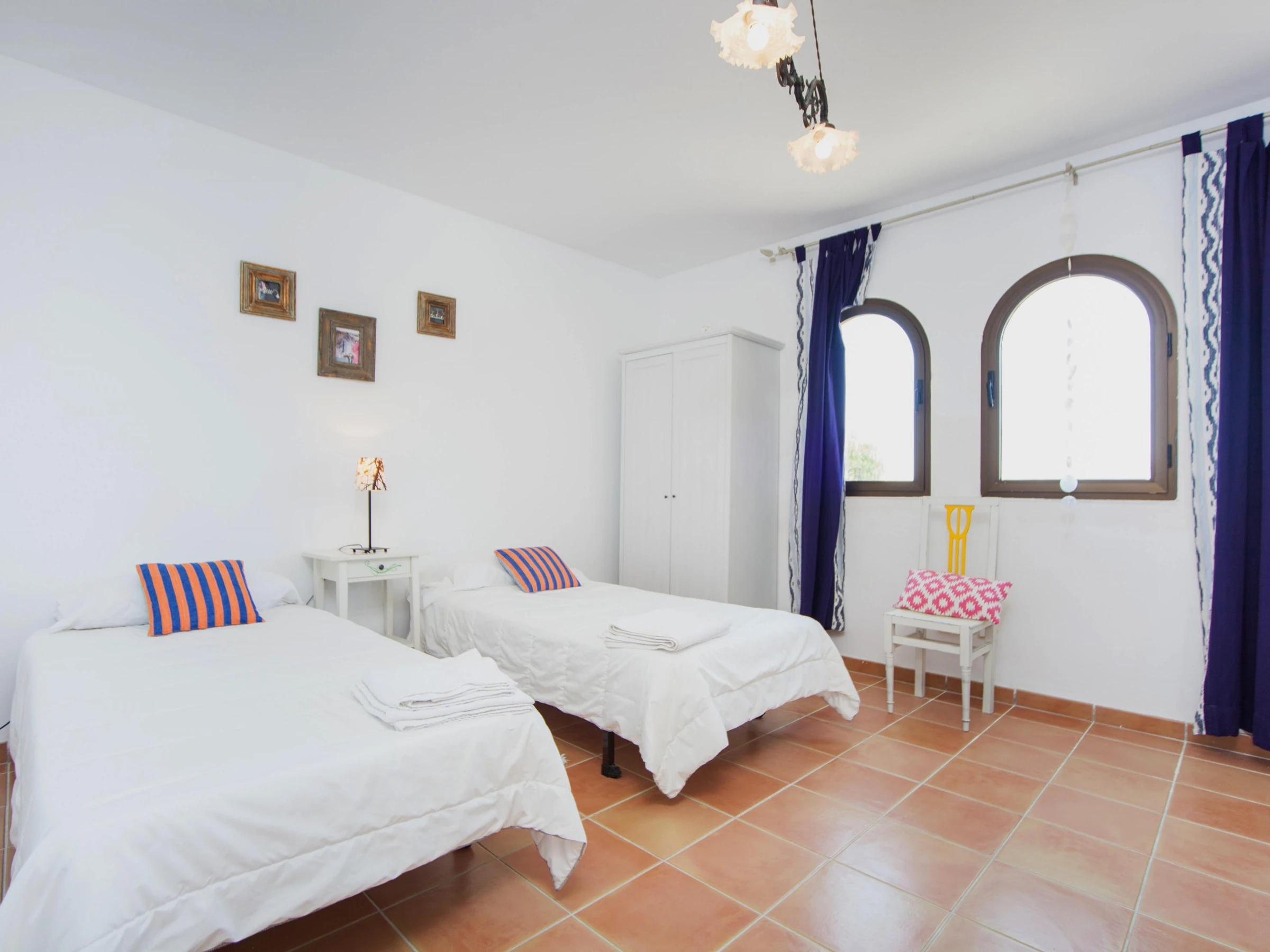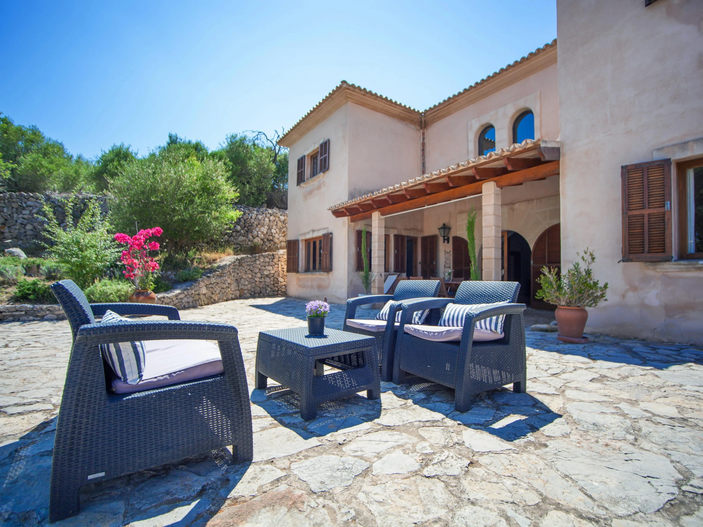Indoors, modern style marries traditional Majorcan style. Enjoy a lazy afternoon in the living room with two sofas, satellite-TV and CD-player. The dining area and the well-equipped kitchen with vitro hob are in the same space. The kitchen has also a washing machine, iron and ironing board. A shower bathroom is on the ground floor. All five bedrooms are on the first floor. The first bedroom has a double bed, access to the balcony and an en suite bathroom with bathtub. The next bedroom has two single beds and an en suite bathroom with shower. The third bedroom has two single beds. The remaining two bedrooms also have two double beds and A/C, one of them with a wardrobe and access to the balcony. Four of the bedrooms have a wardrobe. A cot and high chair are available on request. A bathroom with bathtub serves the first floor. Three fans and central heating complete the equipment.