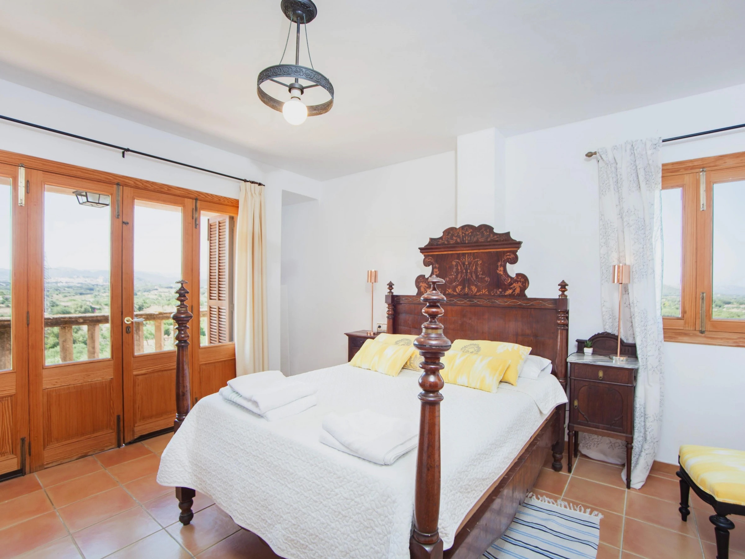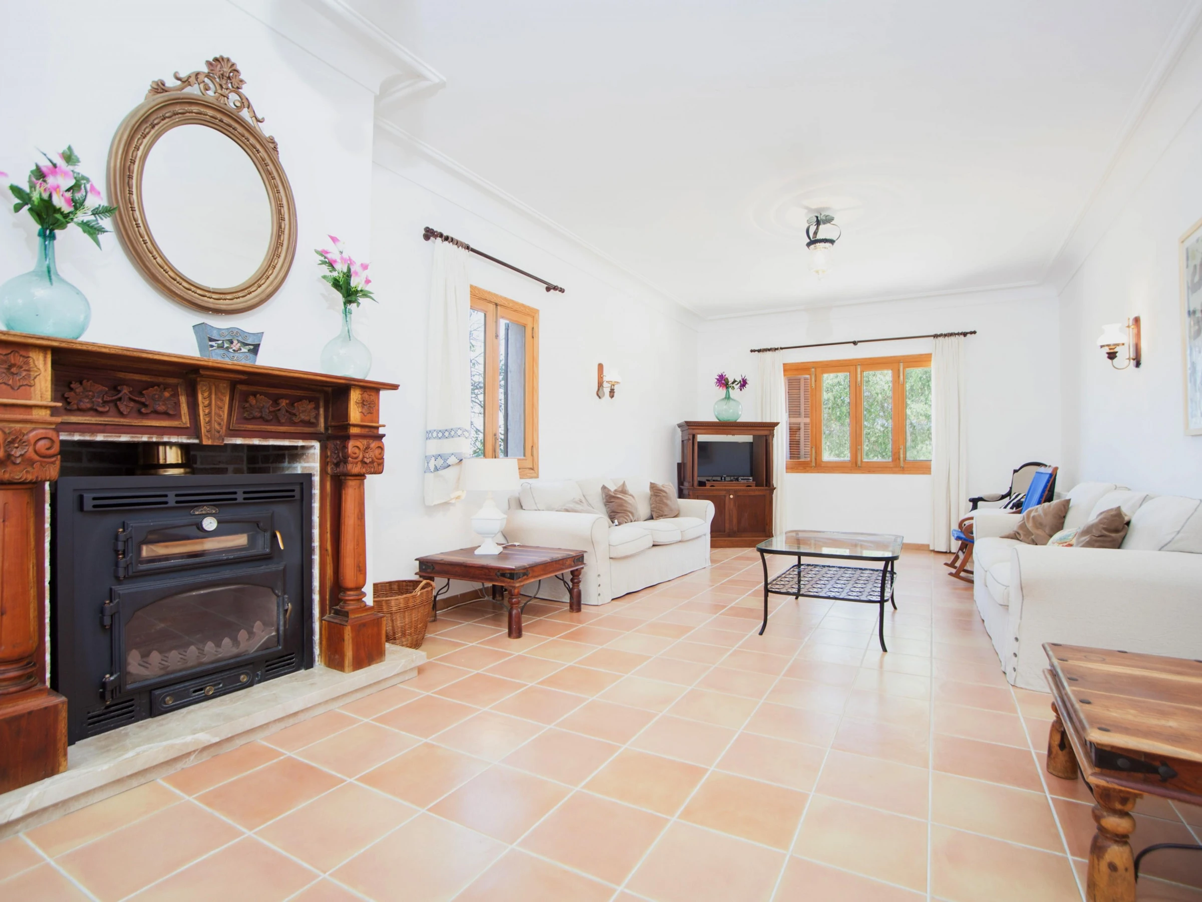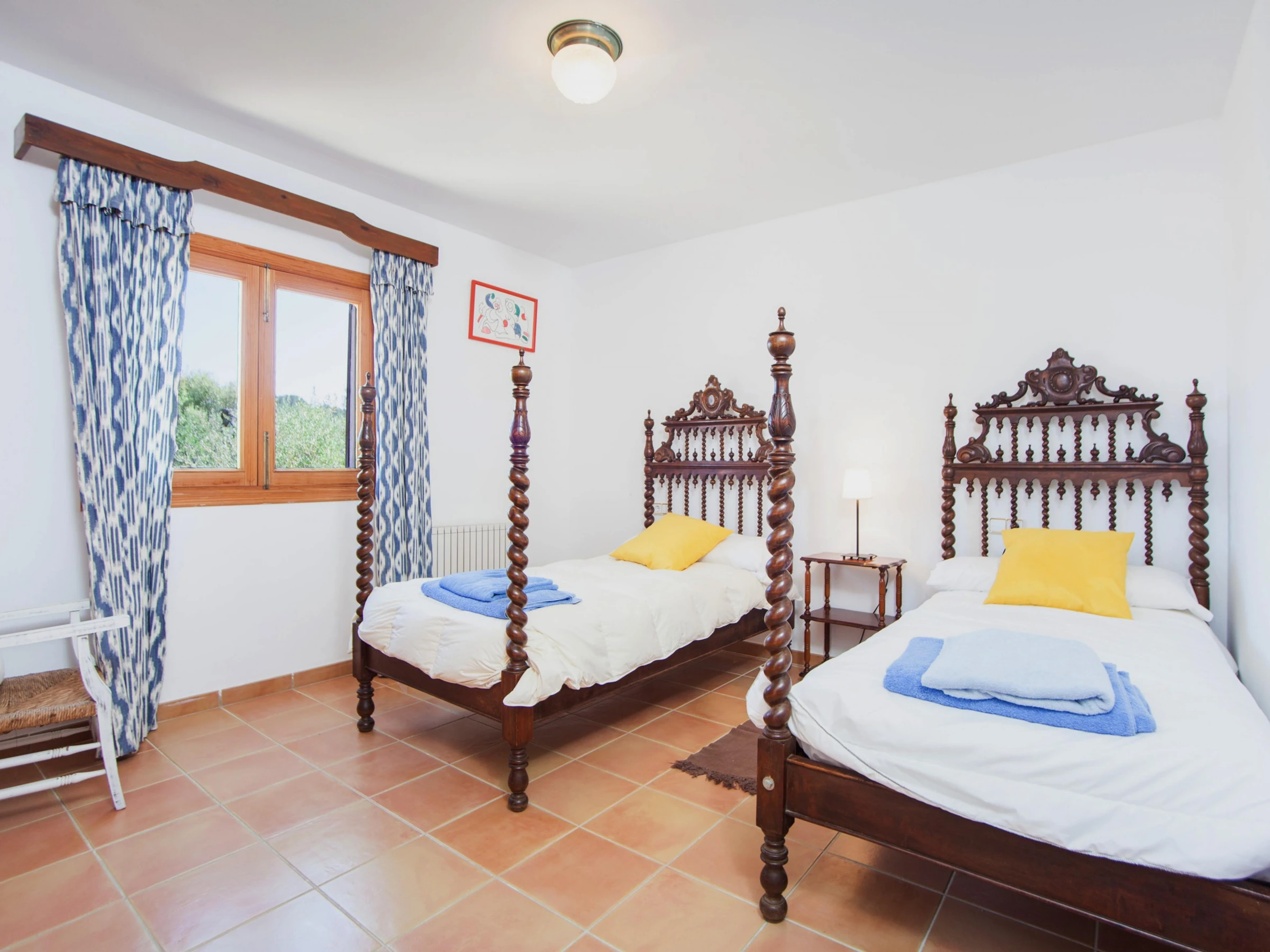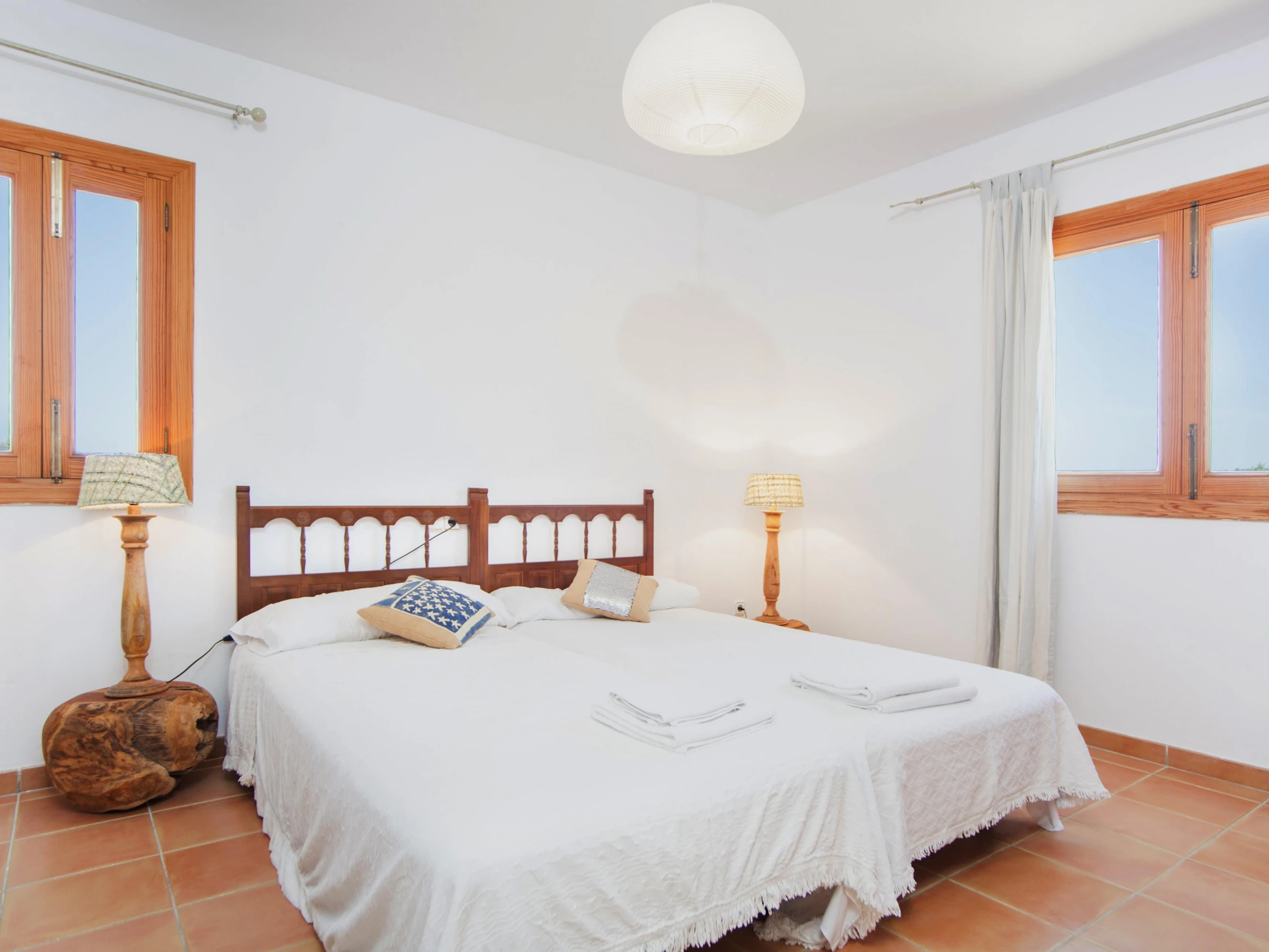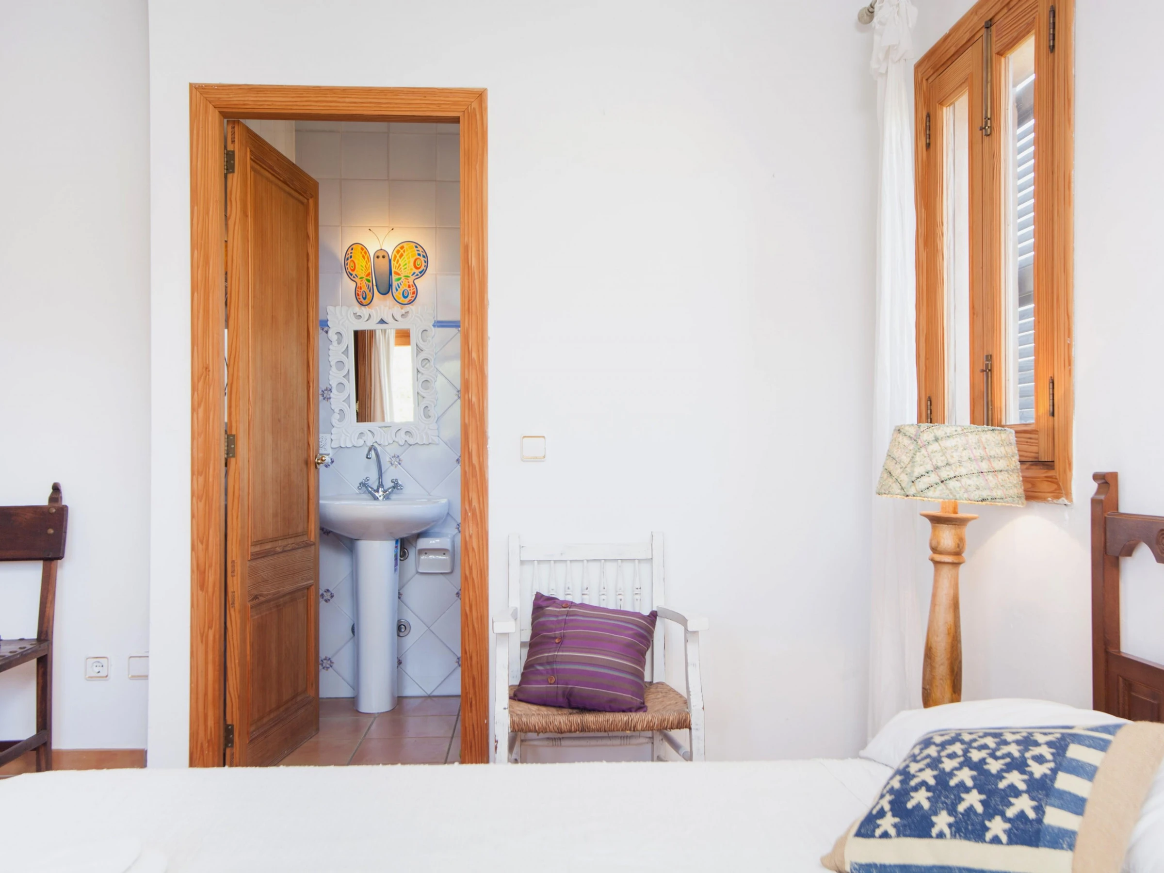 Indoors, modern style marries traditional Majorcan style. Enjoy a lazy afternoon in the living room with two sofas, satellite-TV and CD-player. The dining area and the well-equipped kitchen with vitro hob are in the same space. The kitchen has also a washing machine, iron and ironing board. A shower bathroom is on the ground floor. All five bedrooms are on the first floor. The first bedroom has a double bed, access to the balcony and an en suite bathroom with bathtub. The next bedroom has two single beds and an en suite bathroom with shower. The third bedroom has two single beds. The remaining two bedrooms also have two double beds and A/C, one of them with a wardrobe and access to the balcony. Four of the bedrooms have a wardrobe. A cot and high chair are available on request. A bathroom with bathtub serves the first floor. Three fans and central heating complete the equipment.