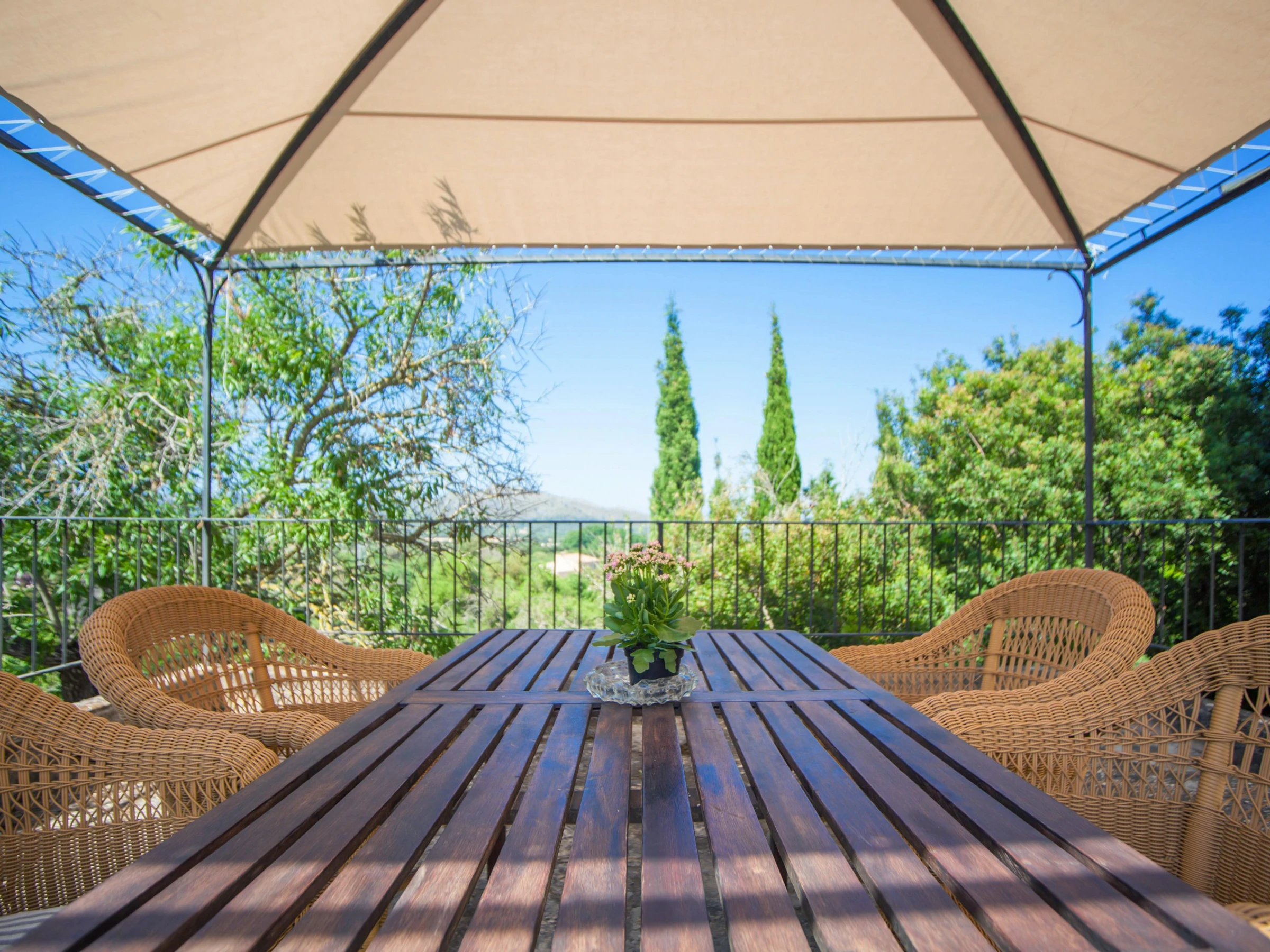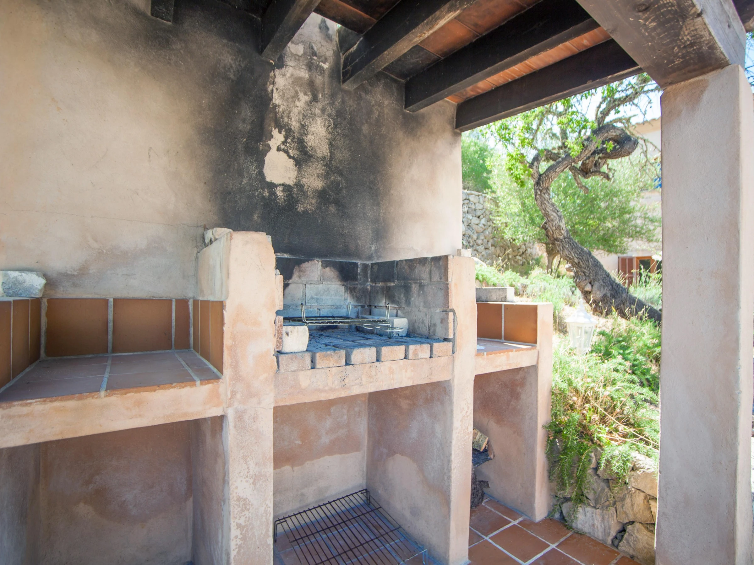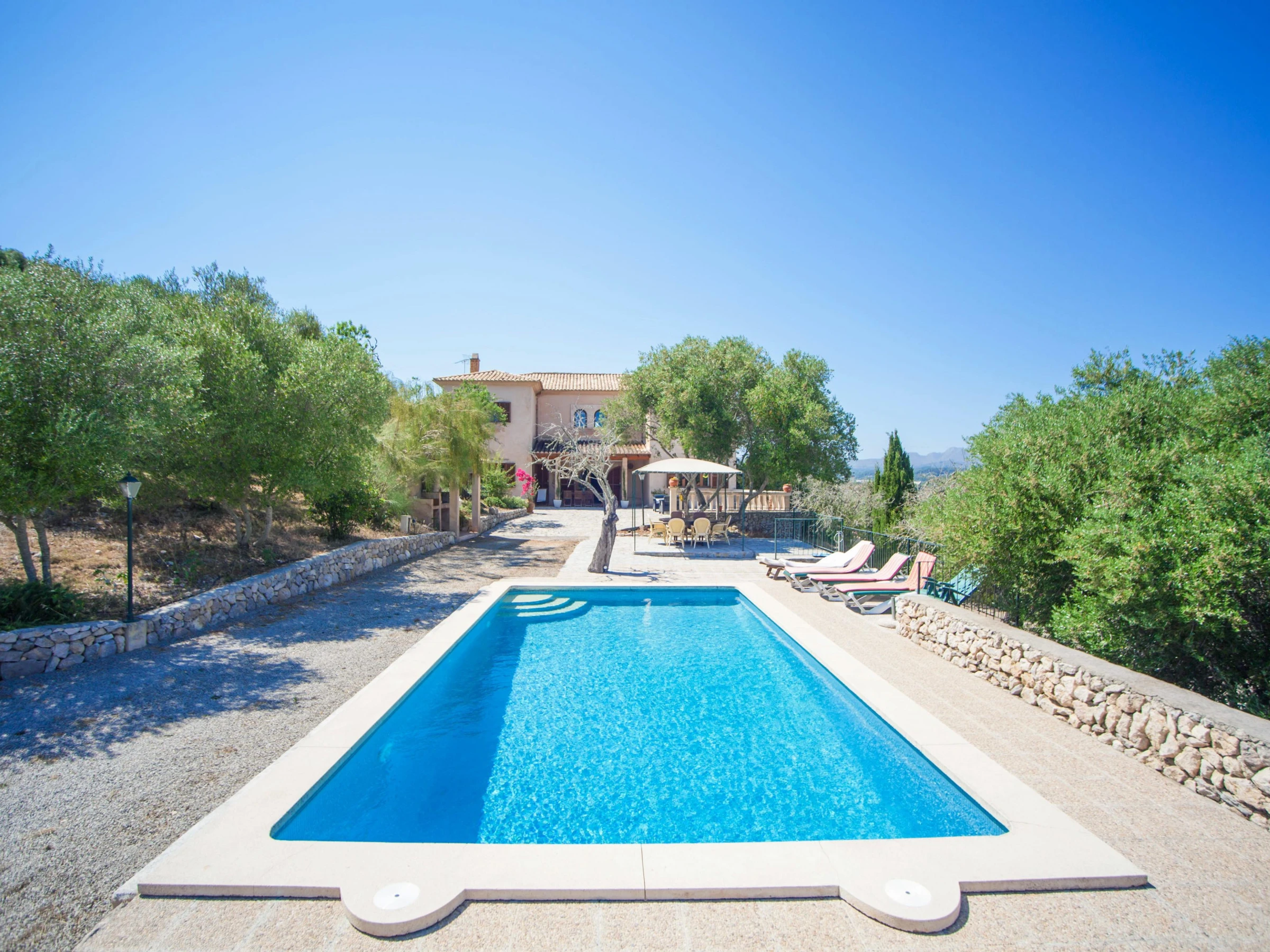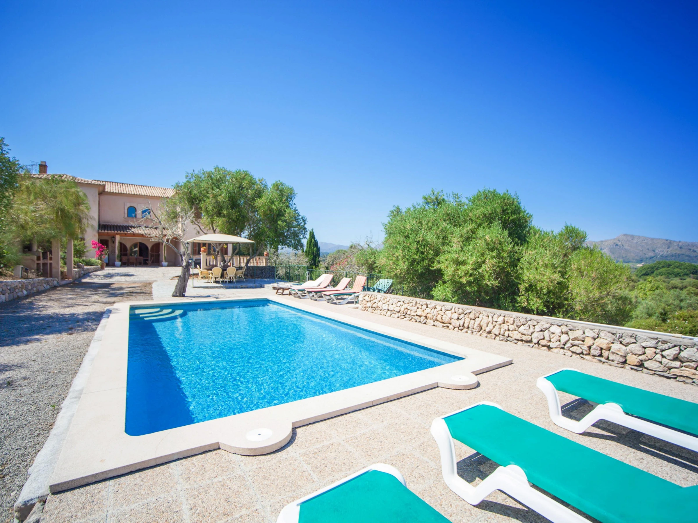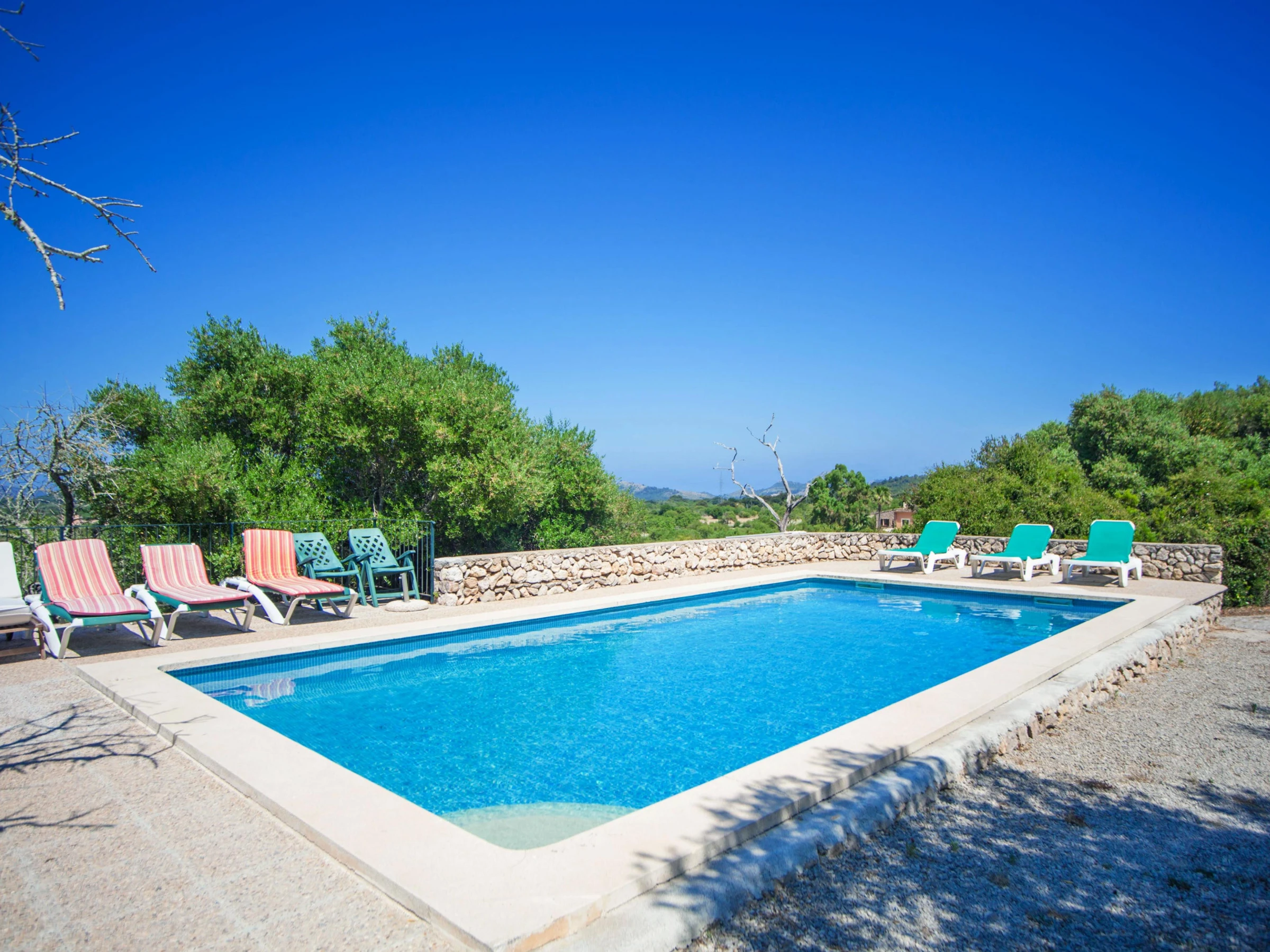 Start your day with a large breakfast on one of the terraces and enjoy the sunshine! There are 10 loungers for sunbathing and a barbecue area for great dinners with friends and family. The terrace has amazing views over the mountains and the villages of Capdepera and Artà. The poolside porch is a shady spot for having lunch. The 9m x 4m chlorine pool with a depth ranging from 1m to 2.5m is private. Please use the exterior shower before and after swimming. The fenced plot where the house is set measures more than 20000m2. There are no neighbors nearby.