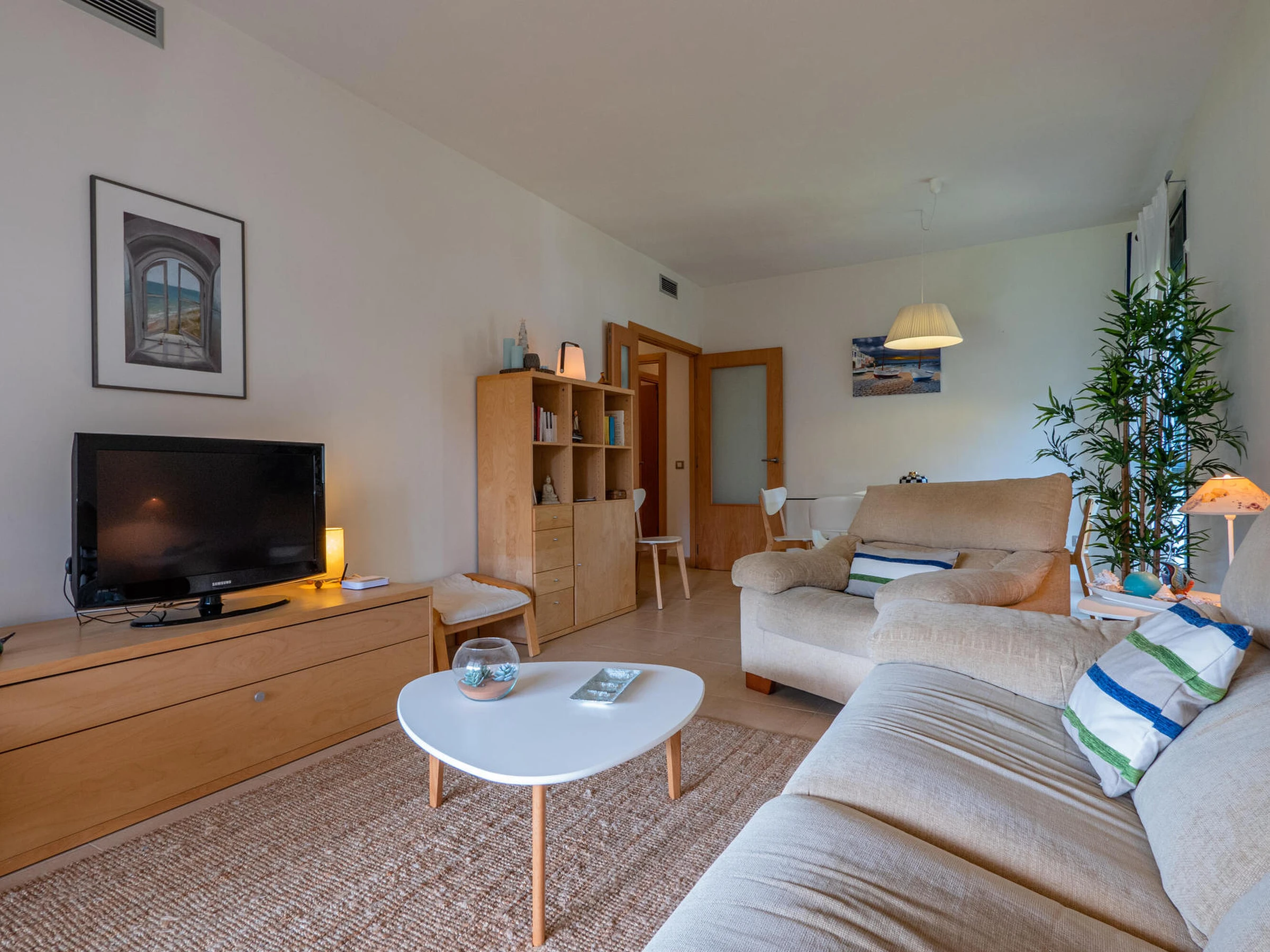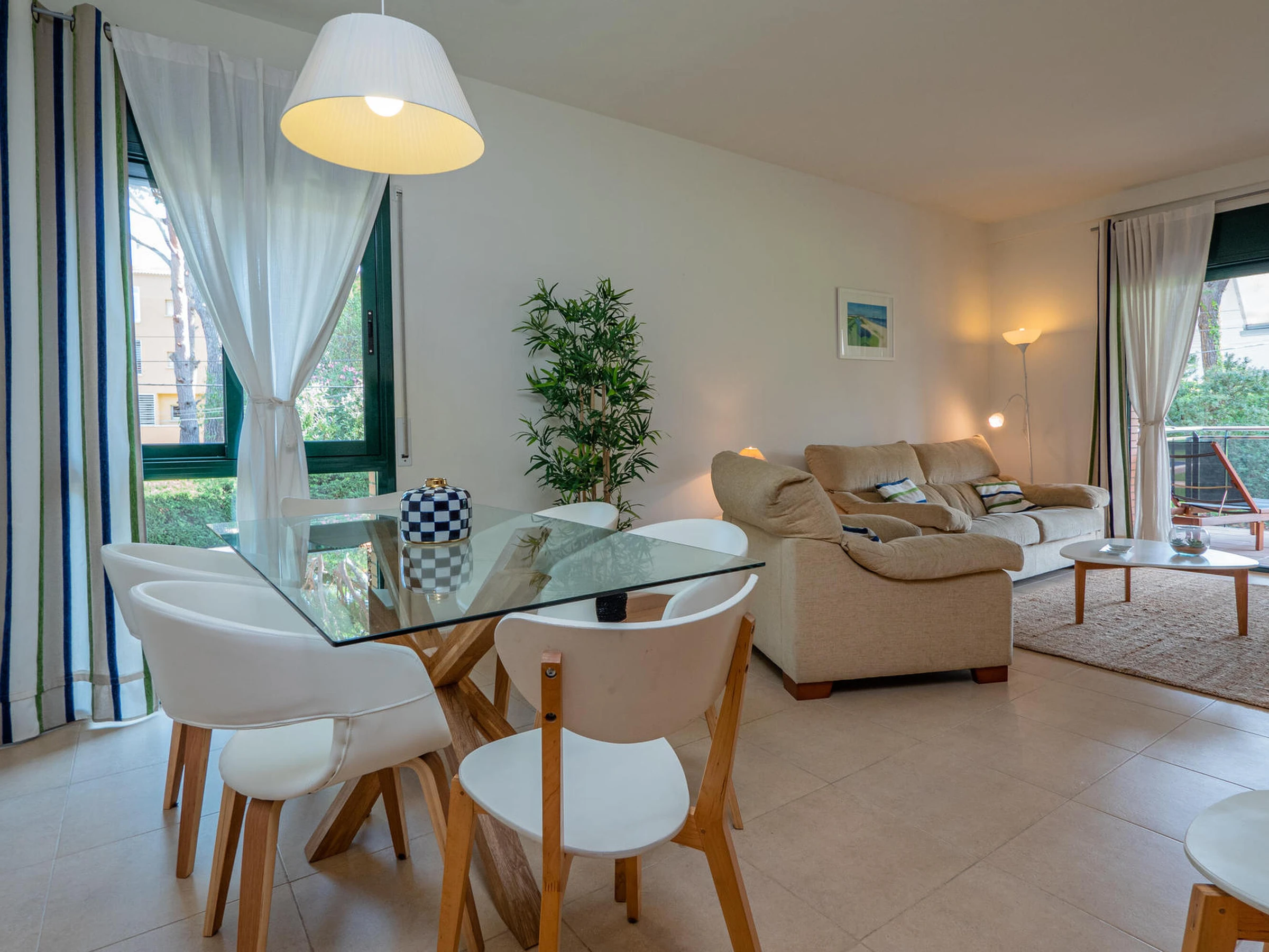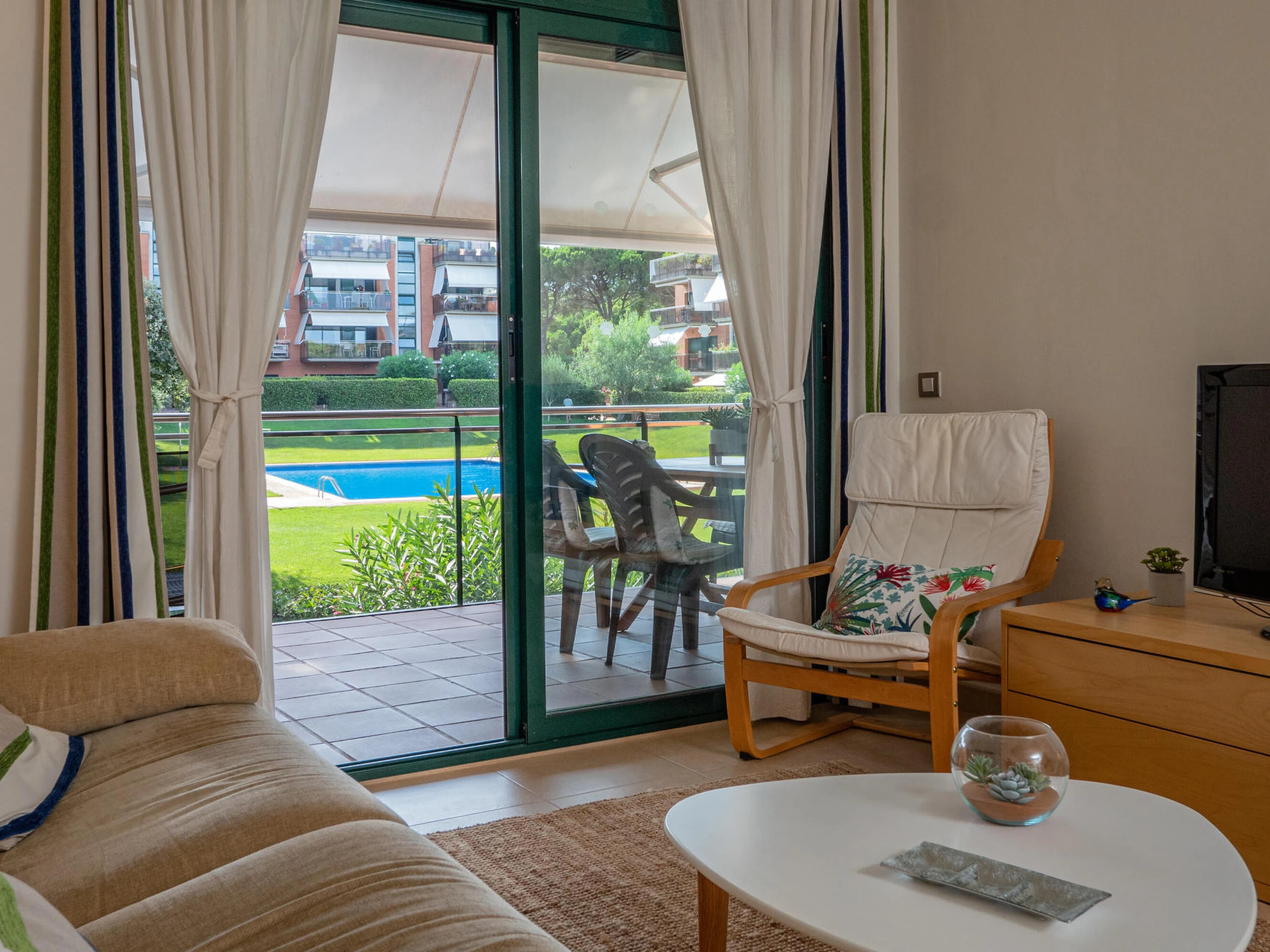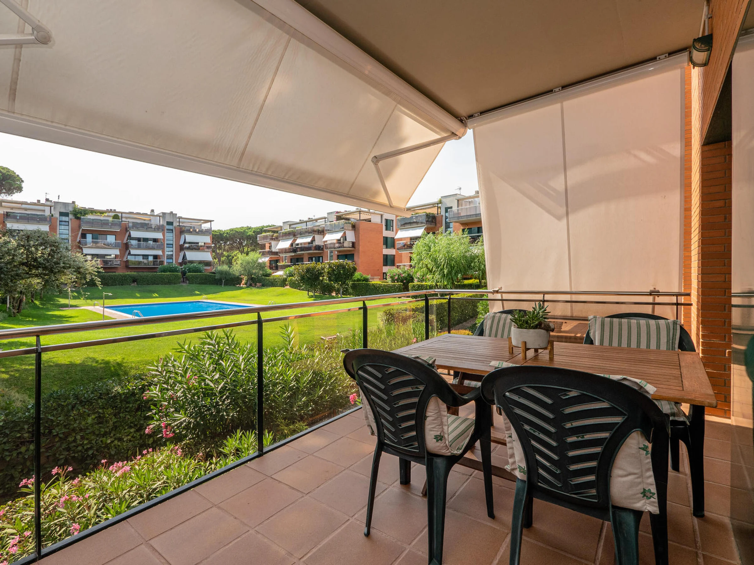 Apartment in perfect condition and with community pool in Pals, Costa Brava. 1km from Pals beach. Capacity for 5 people, 3 rooms Ideal for families, very quiet community. Located in front of the Pals golf course, it has 3 bedrooms, one suite with a double bed and a bathroom with a shower, a double room with double bed and a third room with a trundle bed, both share a bathroom with a shower. Dining room to a large terrace overlooking the pool, fully equipped kitchen also with access to the terrace. The apartment is tastefully decorated and is in perfect condition. It has wifi, elevator and garage for one car in the community. Television service not guaranteed due to poor coverage in the area. For any questions regarding this property, please do not hesitate to contact us.