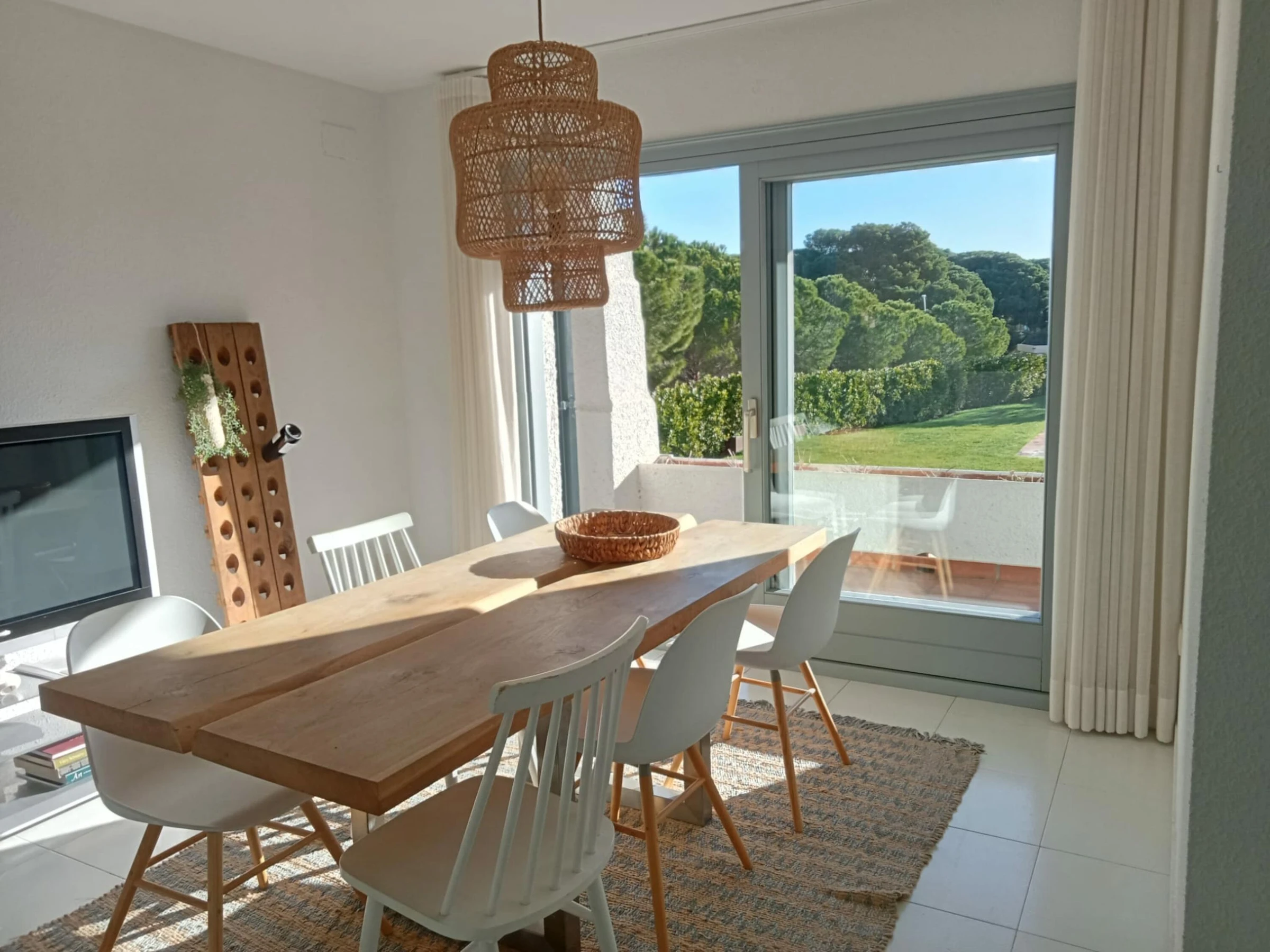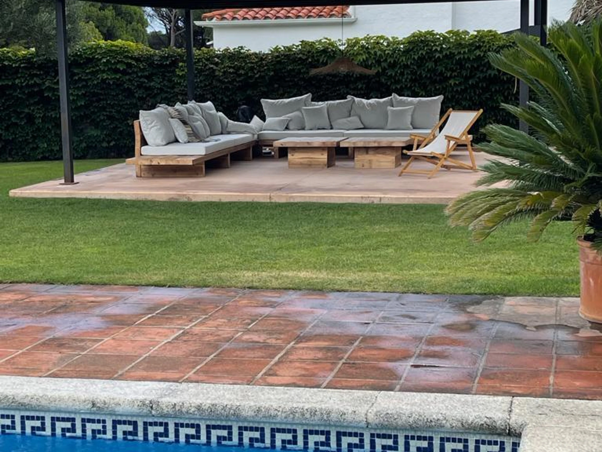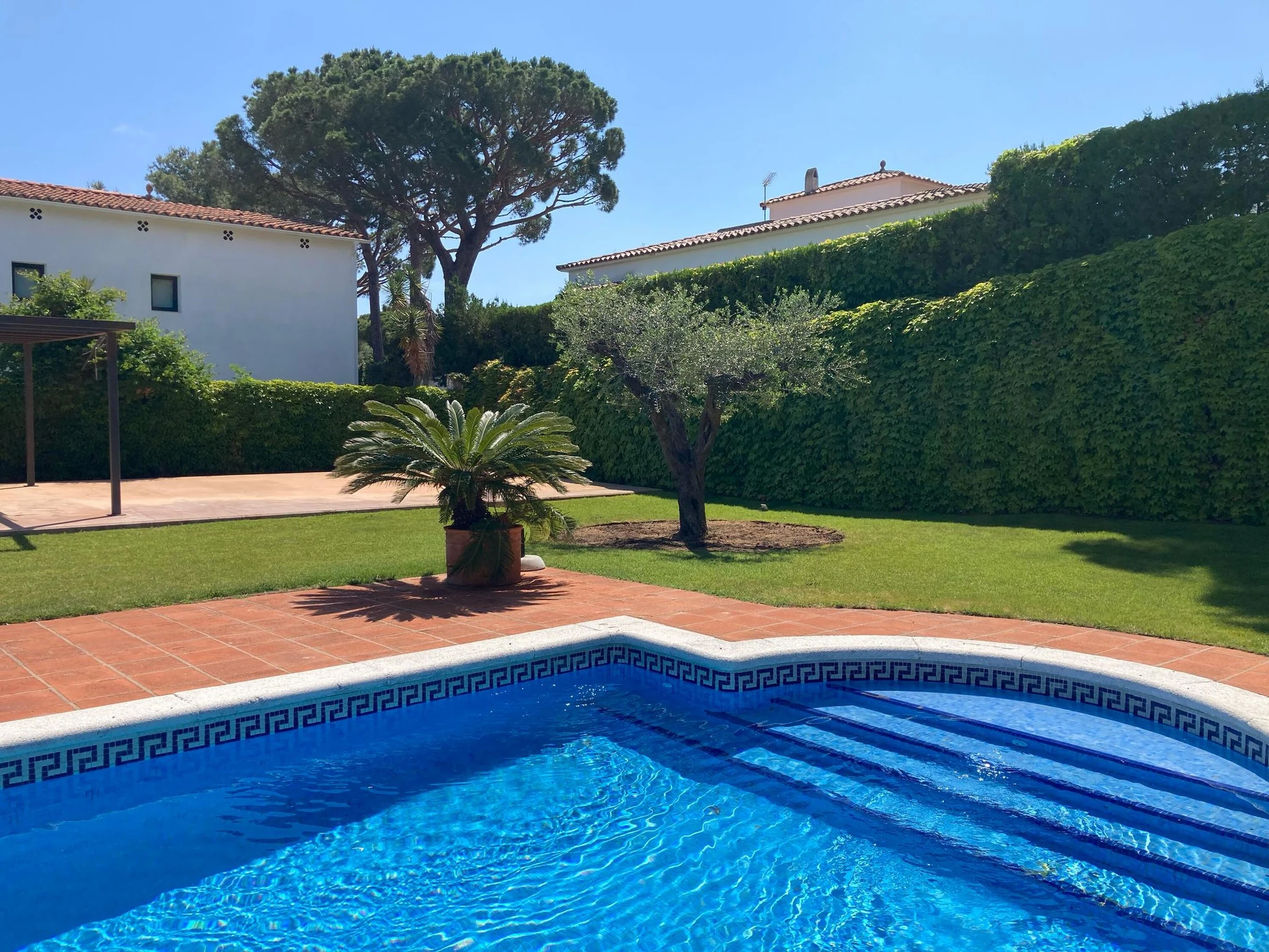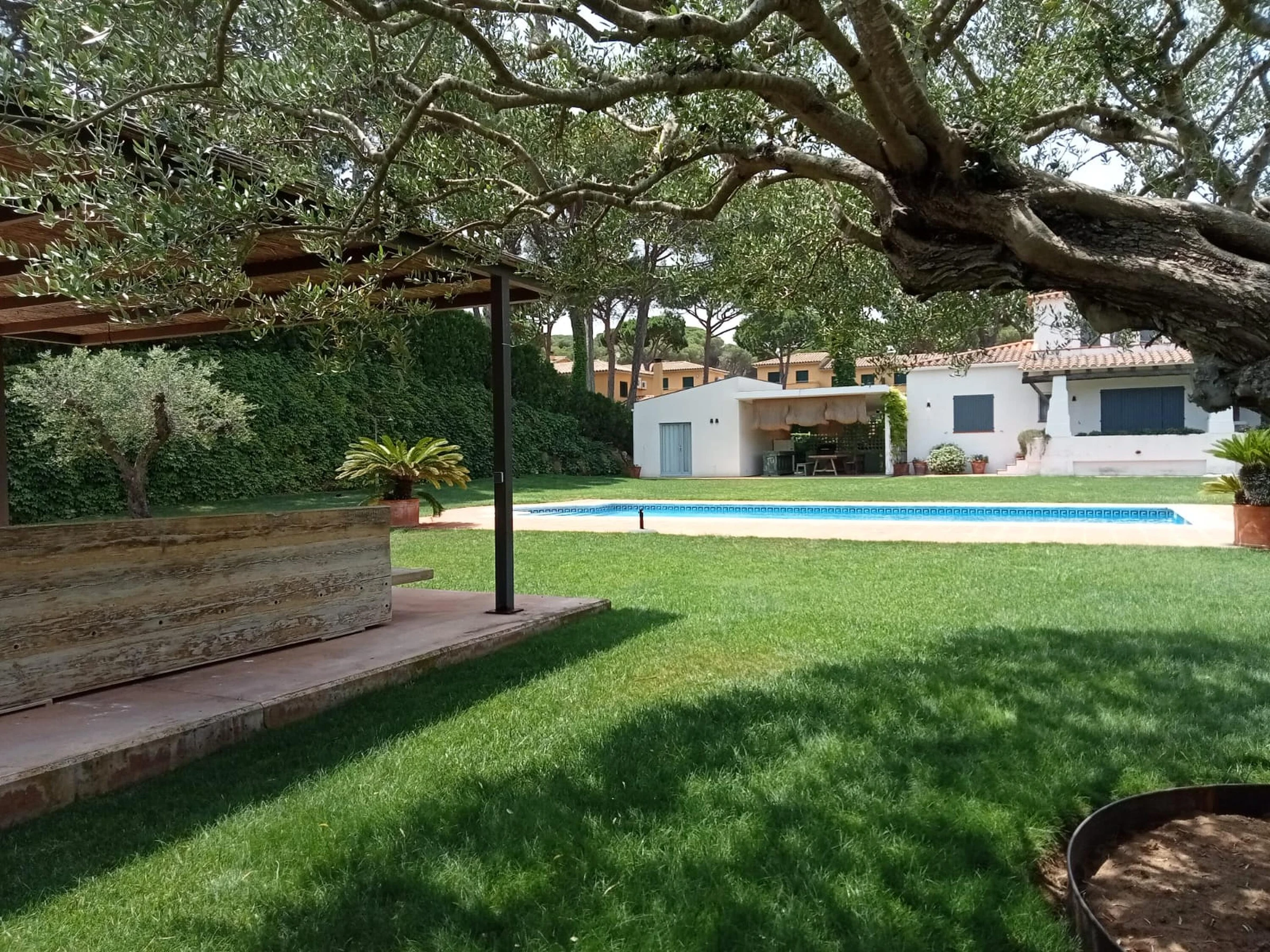 DISTRIBUTION: Ground floor: Entrance, dining-living room with exit to the garden, terrace and swimming pool. Porch with BBQ. Open kitchen full equipped, 2 double bedrooms with single beds, 1 Bathroom. First floor: 1 master bedroom with double bed and complete bathroom, terrace. COMMENTS: Private house with enormous garden and pool, situated about 500m from the entrance of Golf Club Platja de Pals and 1.5 km from the beach. Garage. A/C. (Capacity: 6 people) "Due to the restrictions of the Generalitat due to the very serious drought situation, access to the pools may be subject to restrictions and is not guaranteed".
