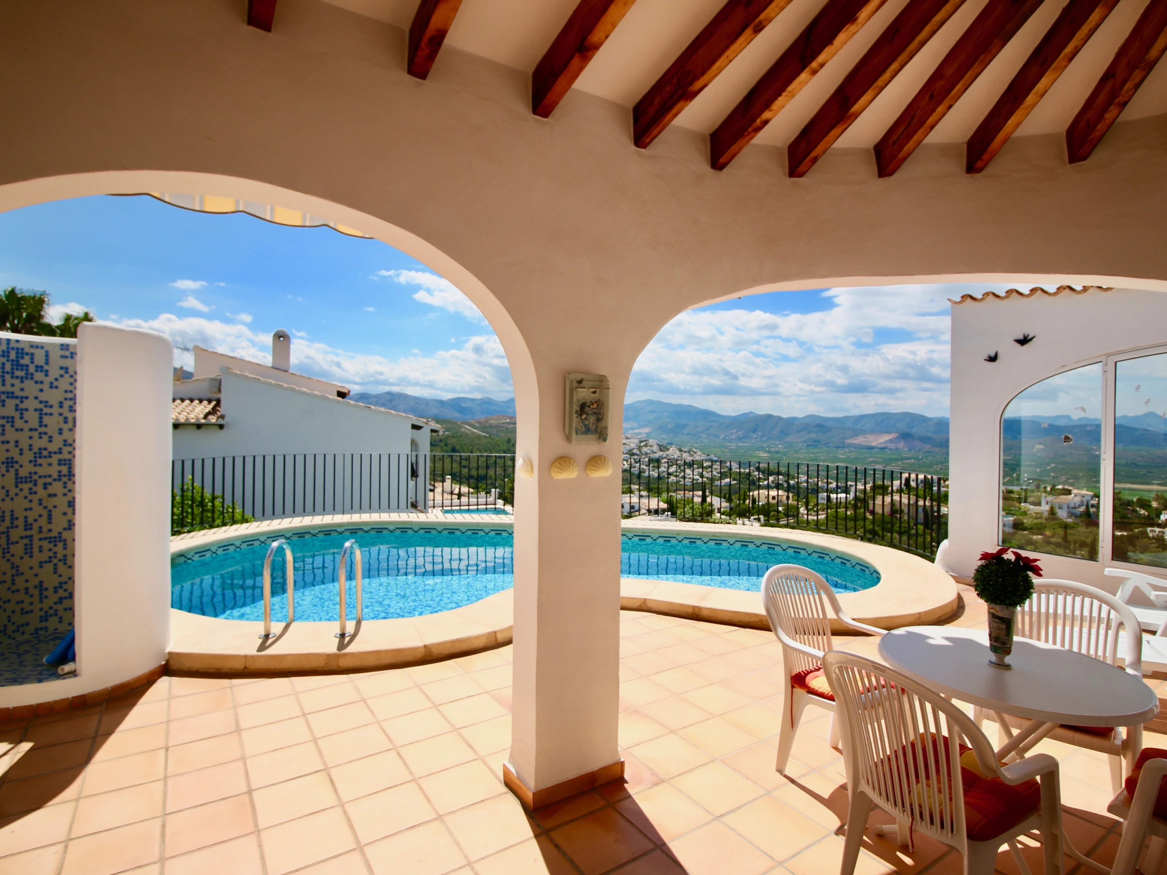 Beautiful chalet with fantastic mountain and sea panoramic view in the Monte Pego urbanisation with 1,200 m2 of mountainous land. The garden has palm trees and a variety of native plants. From the 8mx4m swimming pool, we can enjoy its wonderful views. The covered terrace has a gas barbecue and an outdoor shower. Once inside the house, we find a modern kitchen with an American bar that is equipped with an oven, dishwasher, microwave, toaster, coffee machine and two-door fridge. The living room has Sat-tv and air conditioning with access to the terrace. The rooms consist of a double bedroom and a bedroom with two single beds and mosquito nets. There is a bathroom with a shower that also has a mosquito net and another bathroom with WC and washbasin. The washing machine is in the basement, which we access via a metal staircase. Covered private parking. Supermarkets, bars and restaurants 1.8 km away.