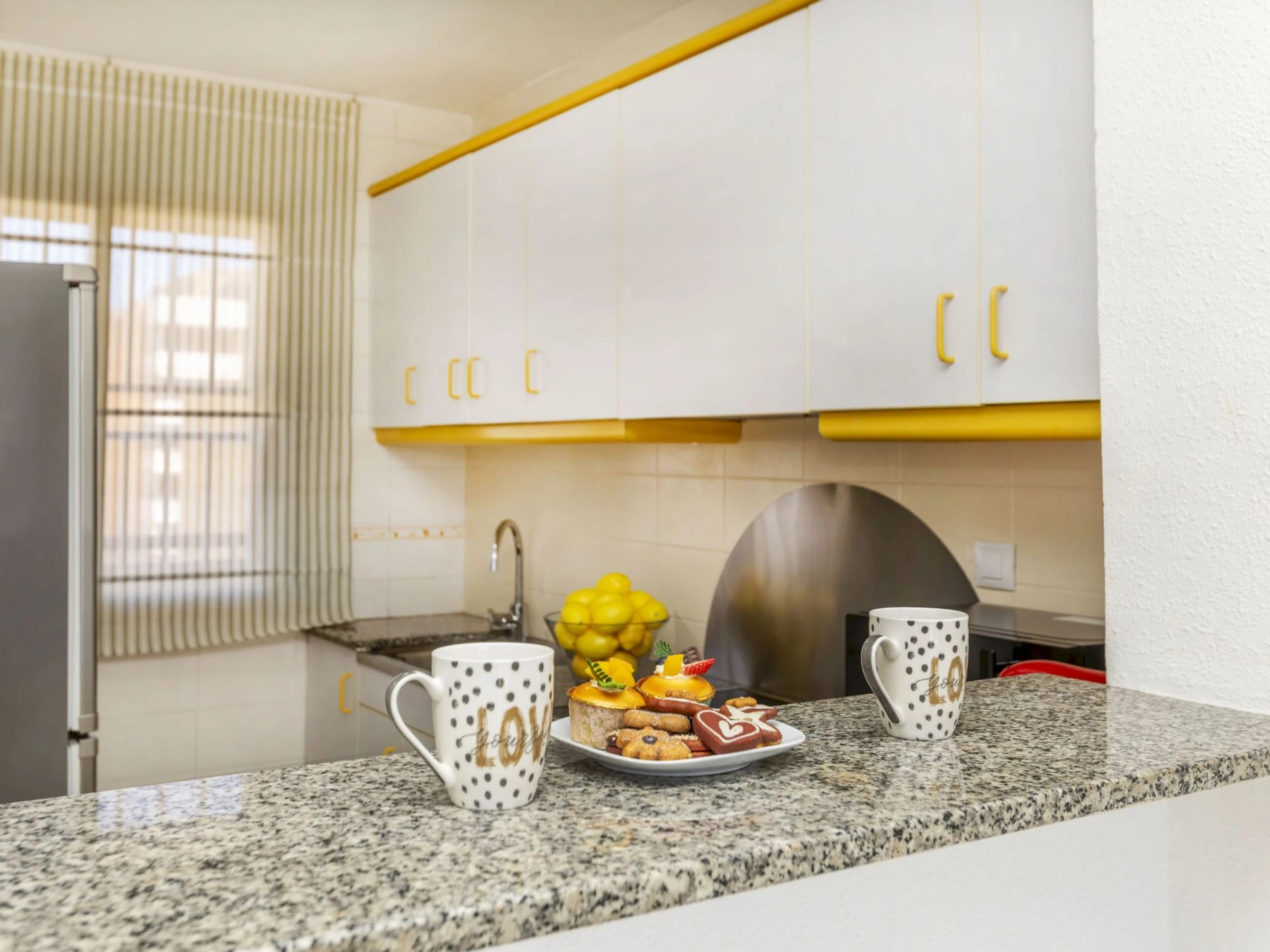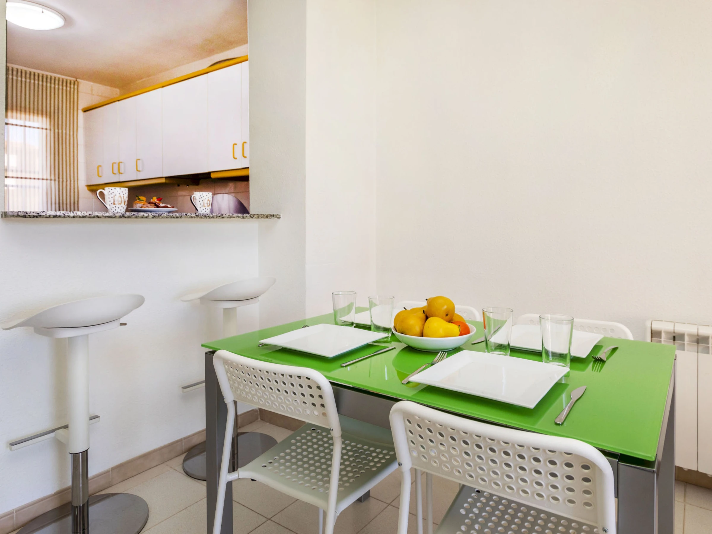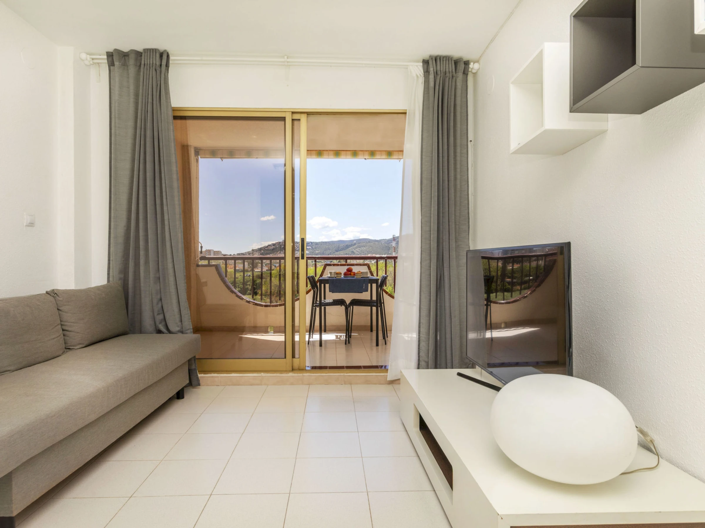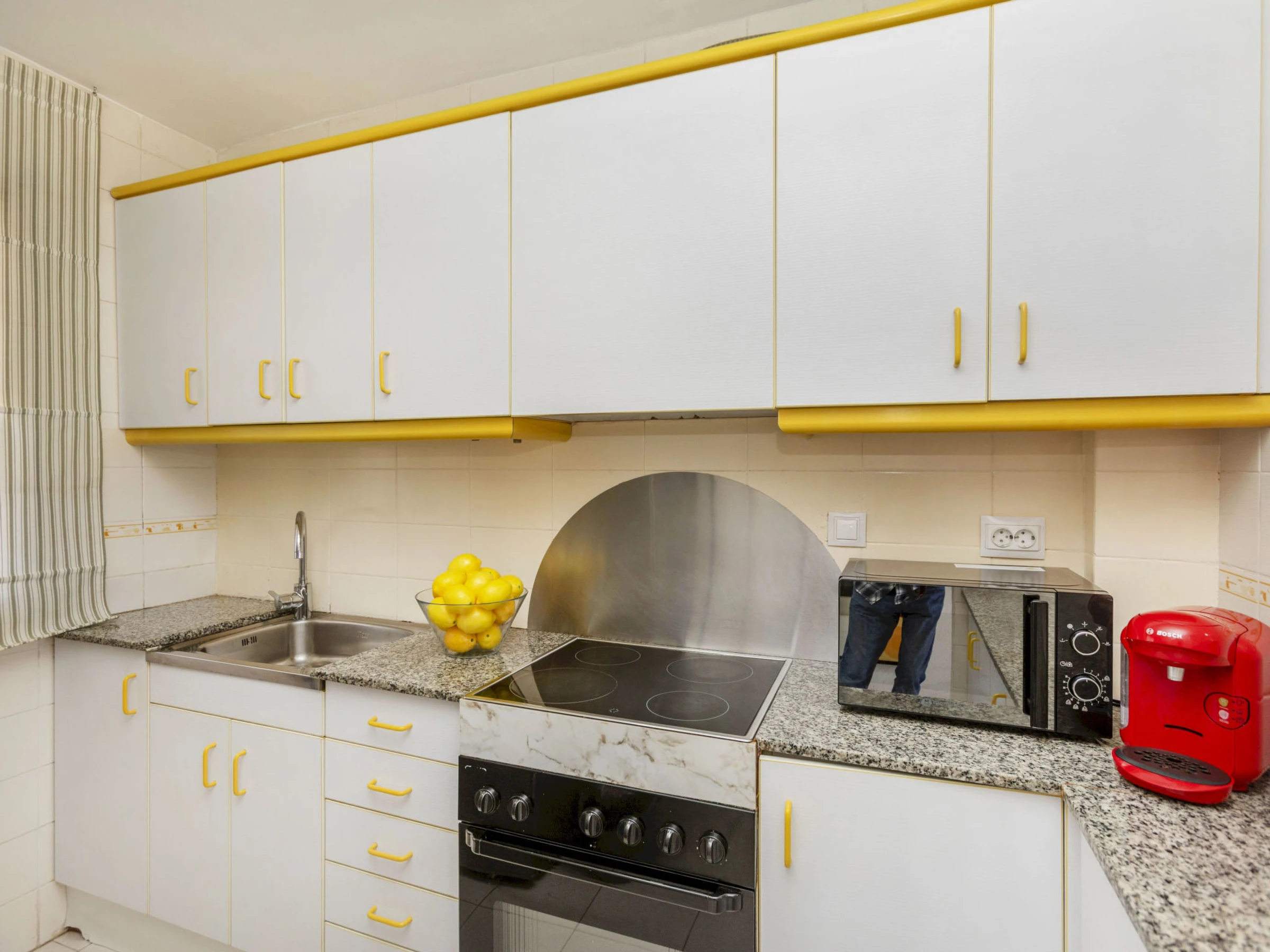 "Aroca", 3-room apartment 61 m2 on 3rd floor. Practical and comfortable furnishings: living/dining room with dining table, digital TV, air conditioning and forced-air heating. Exit to the terrace. 1 room with 1 french bed (1 x 135 cm, length 190 cm), fan. 1 room with 2 beds (90 cm, length 190 cm). Kitchen (oven, 4 ceramic glass hob hotplates, toaster, microwave, electric coffee machine, Capsules for coffee machine (Tassimo) extra) with boiler (60 litres). Bath/WC. Terrace. Terrace furniture, sitting area. View of the swimming pool and the countryside. Facilities: washing machine, iron, hair dryer. Internet (WiFi, free). Parking space n 37 - Edificio anexo (roofed). Please note: suitable for families. Non-smokers only. Maximum 1 pet/ dog allowed. TV only ES. [hidden] // Reg. Nr.: ESFCNT00001200900084266000000000000000000000000000007