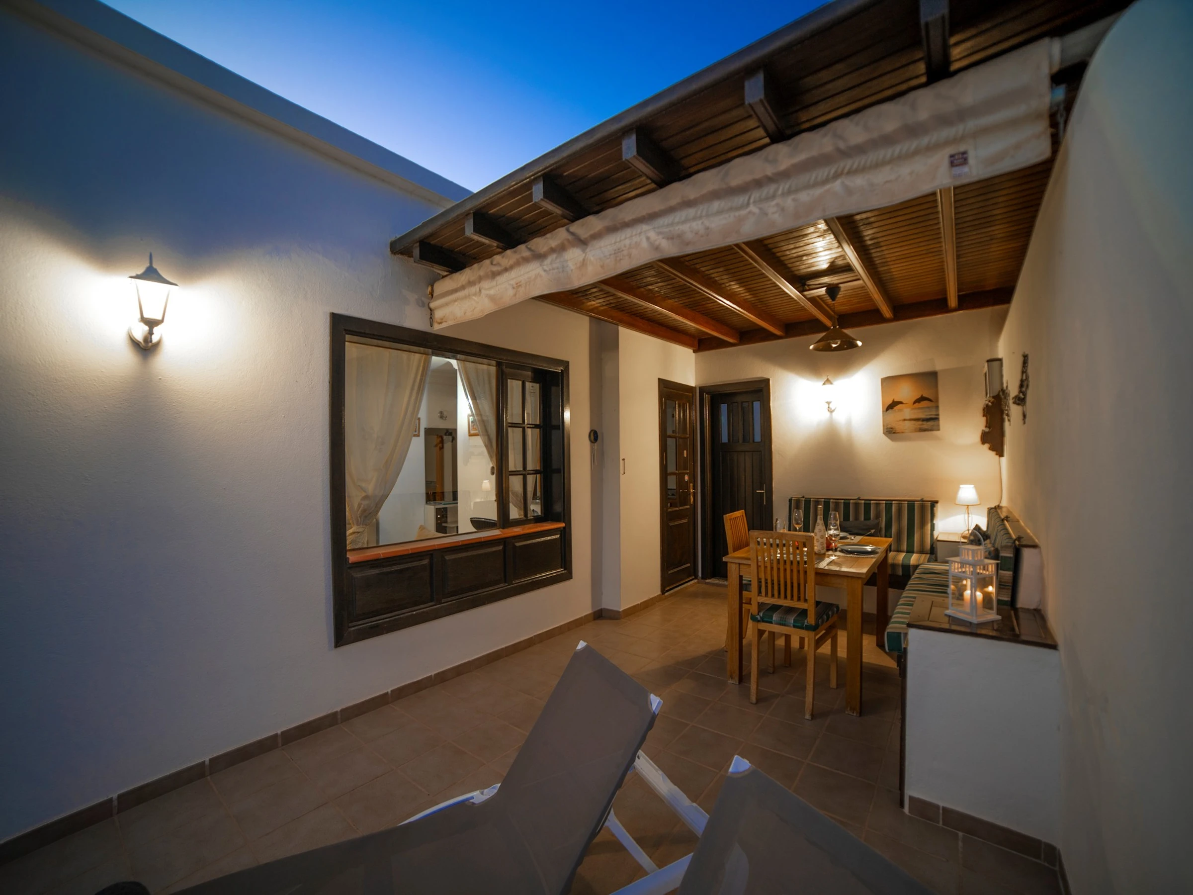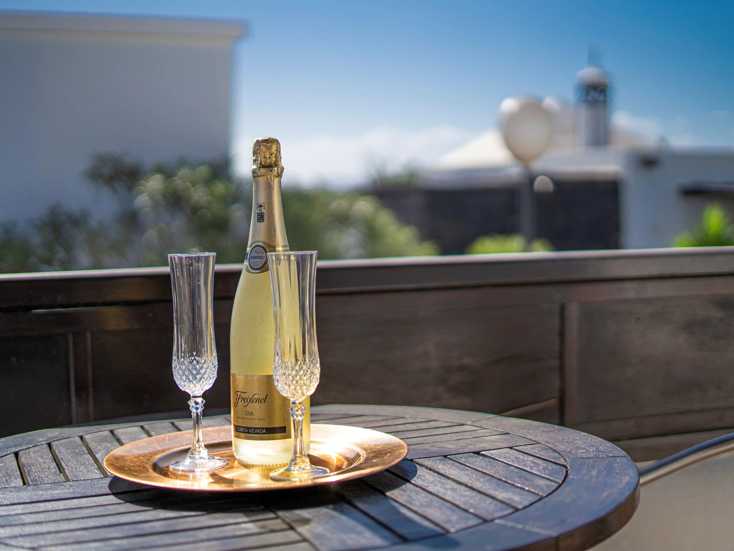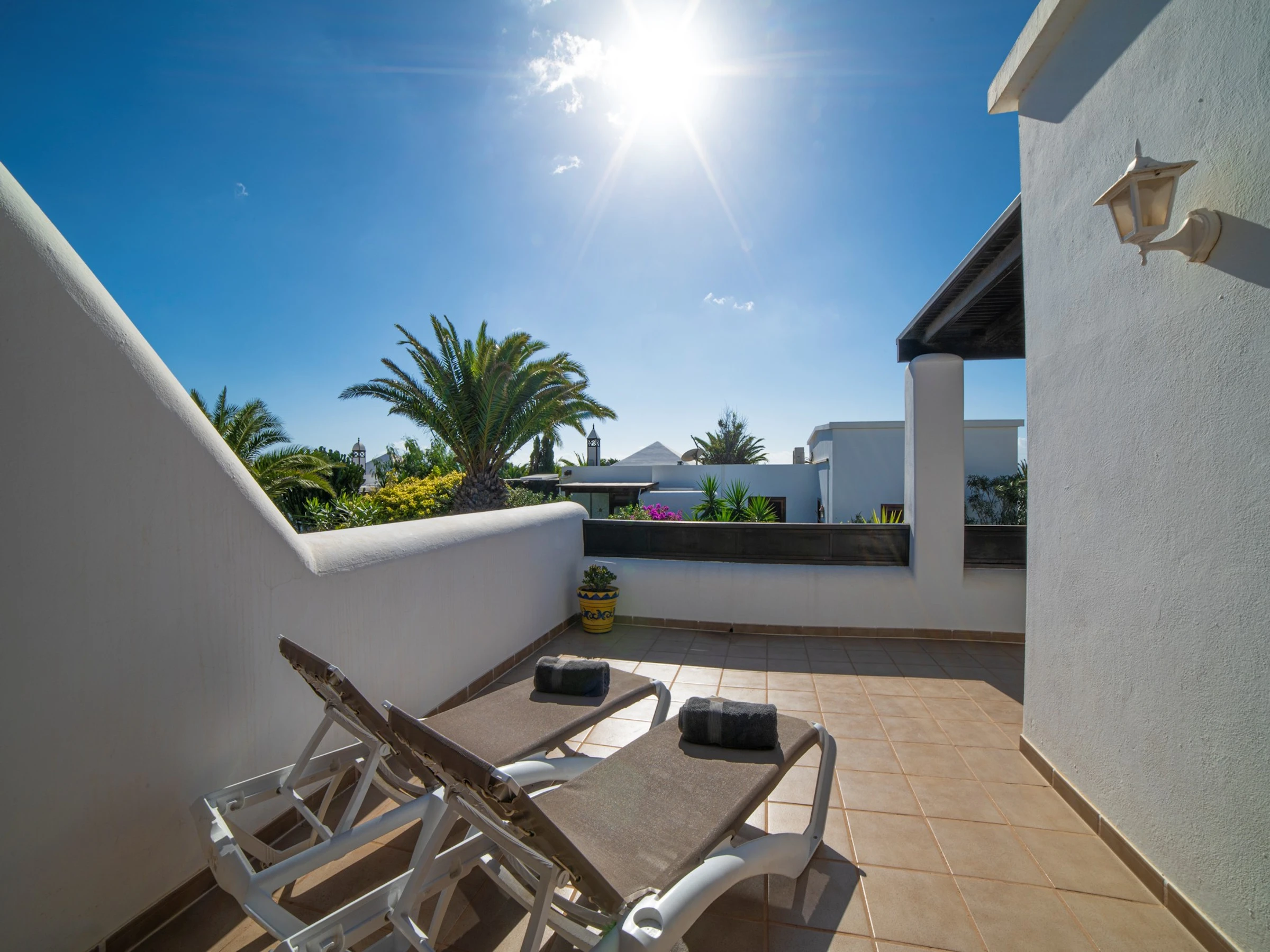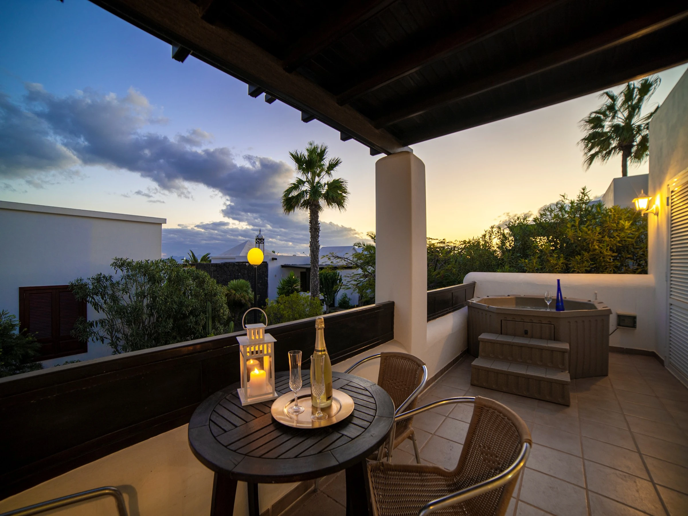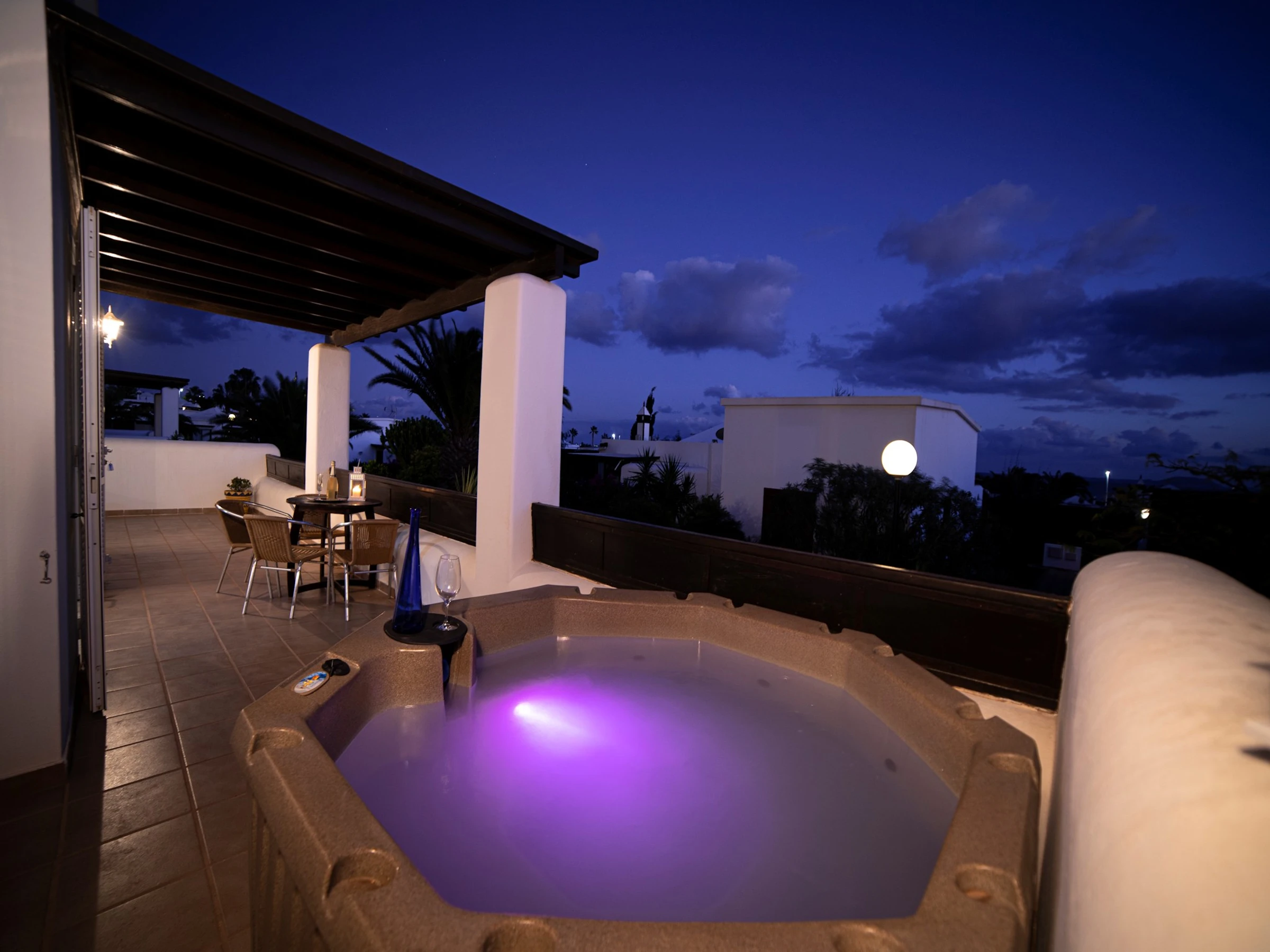 The exterior of the property is spacious, featuring plenty of seating, a shaded Al Fresco dining area, and sunbeds for two. The four-seater hot tub is located directly outside the master bedroom, offering distant views of the ocean and Fuerteventura Island - a perfect setting for enjoying a drink during the day or evening.