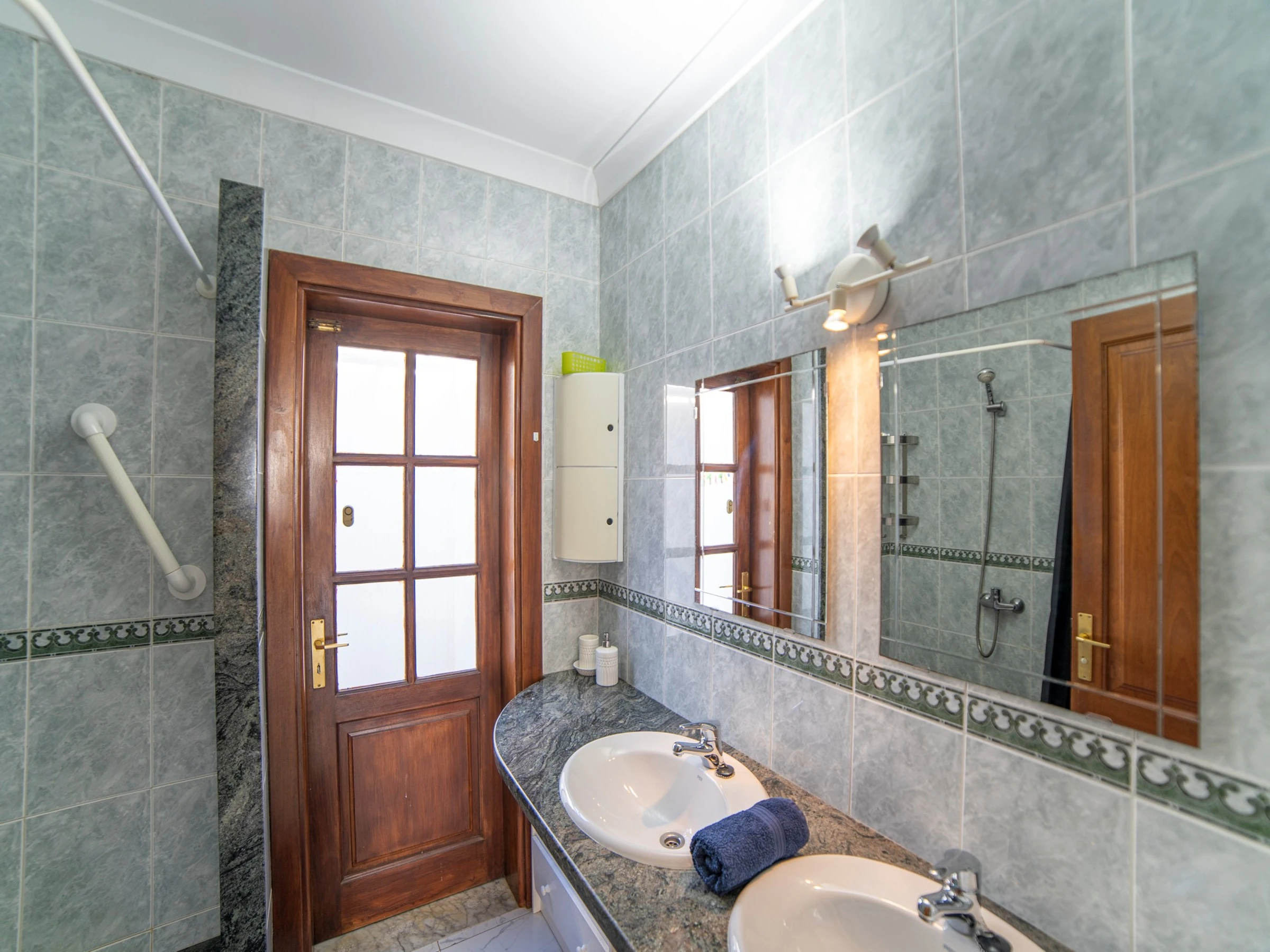 The property offers two lovely bedrooms and two bathrooms. The master bedroom features a double bed, two bedside tables with reading lamps, and plenty of wardrobe space. Patio doors lead out to the outside terrace and hot tub. This bedroom also includes an en-suite bathroom with a WC, a bath with a shower over it, a curtain rail, and a single washbasin. The second bedroom has twin beds with bedside tables and reading lamps and plenty of wardrobe space. There is a separate bathroom with a shower, WC, twin washbasins with a vanity mirror and lighting.