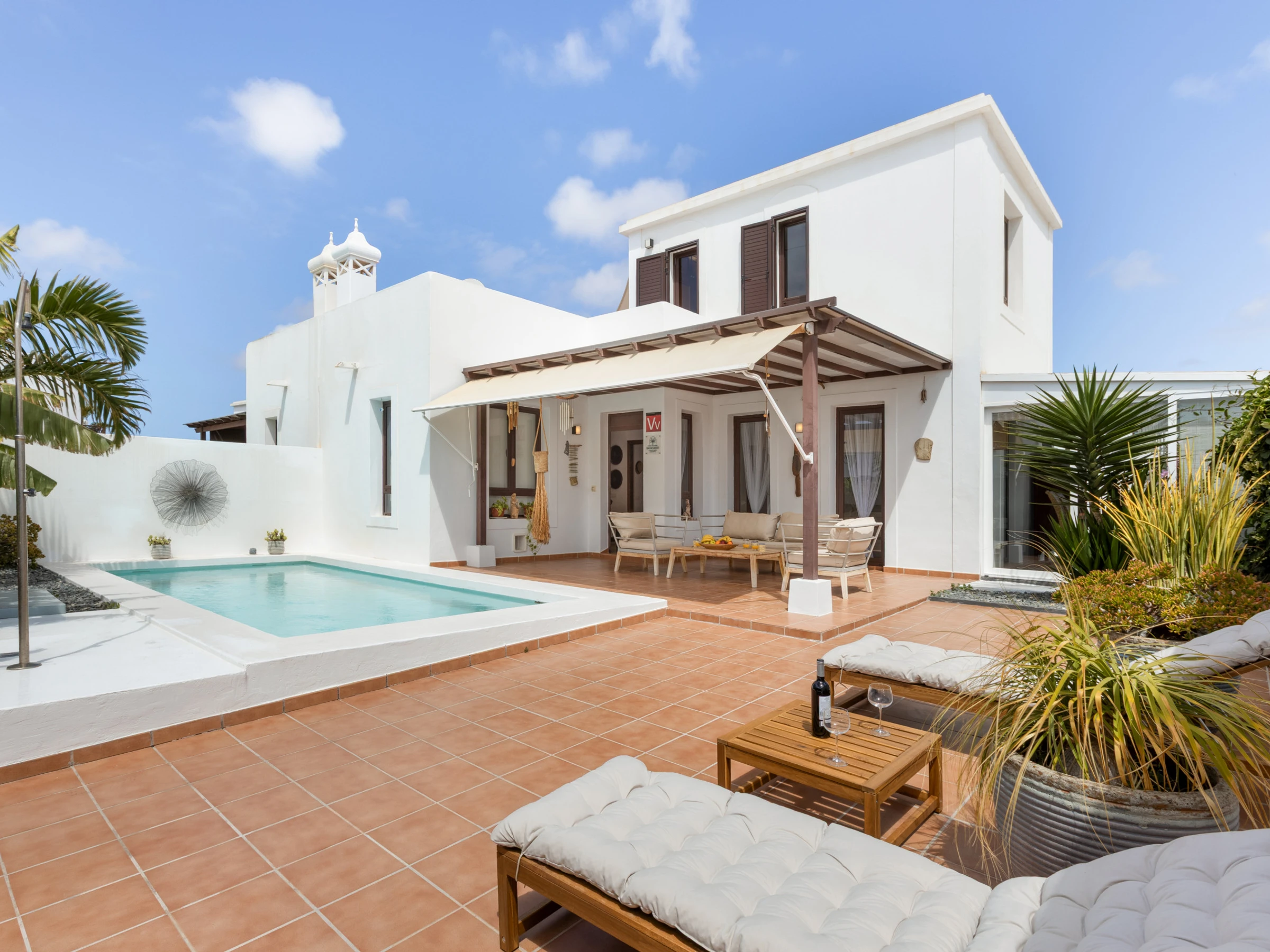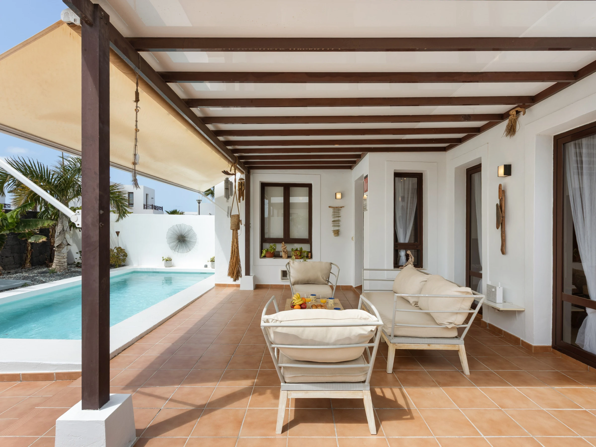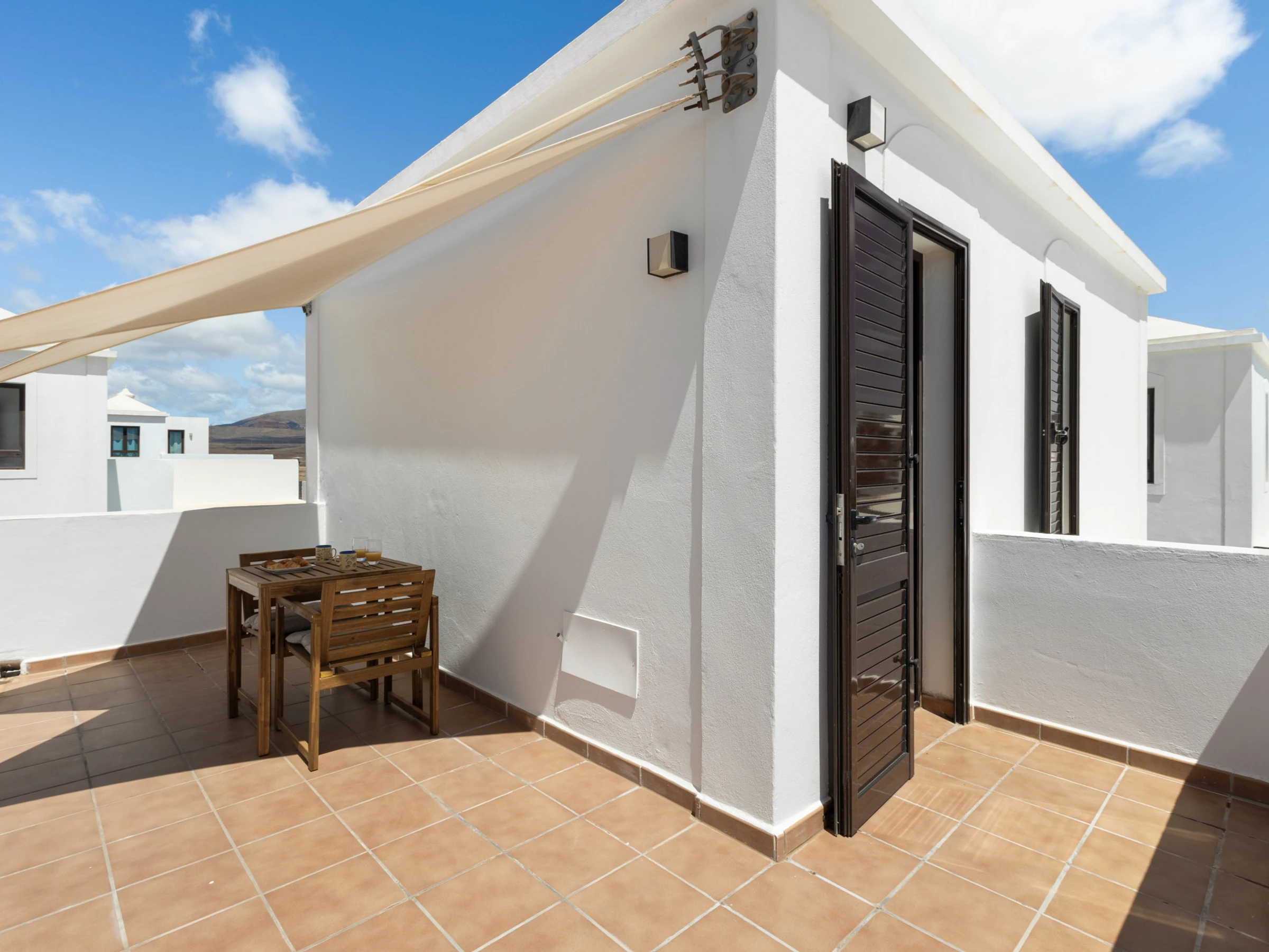 On the exterior, the villa features a covered porch, spacious terrace with private pool, solarium area and upper terrace from which you can enjoy views of the sea and the coasts of Fuerteventura. A perfect setting to relax, read, or enjoy an outdoor dinner under the stars.