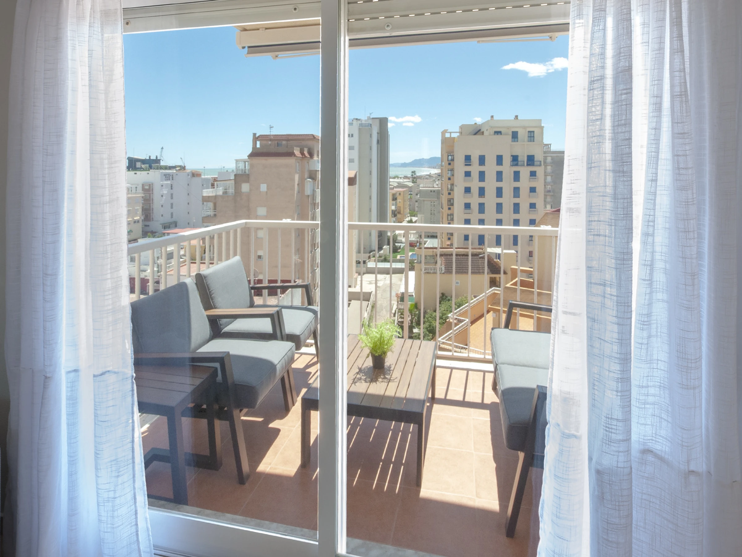 The terrace, next to the living room, is a very important space and we have furnished it with some relax chairs because that is what we came for, to relax in our vacations in Gandia. We also have awnings on the terrace.