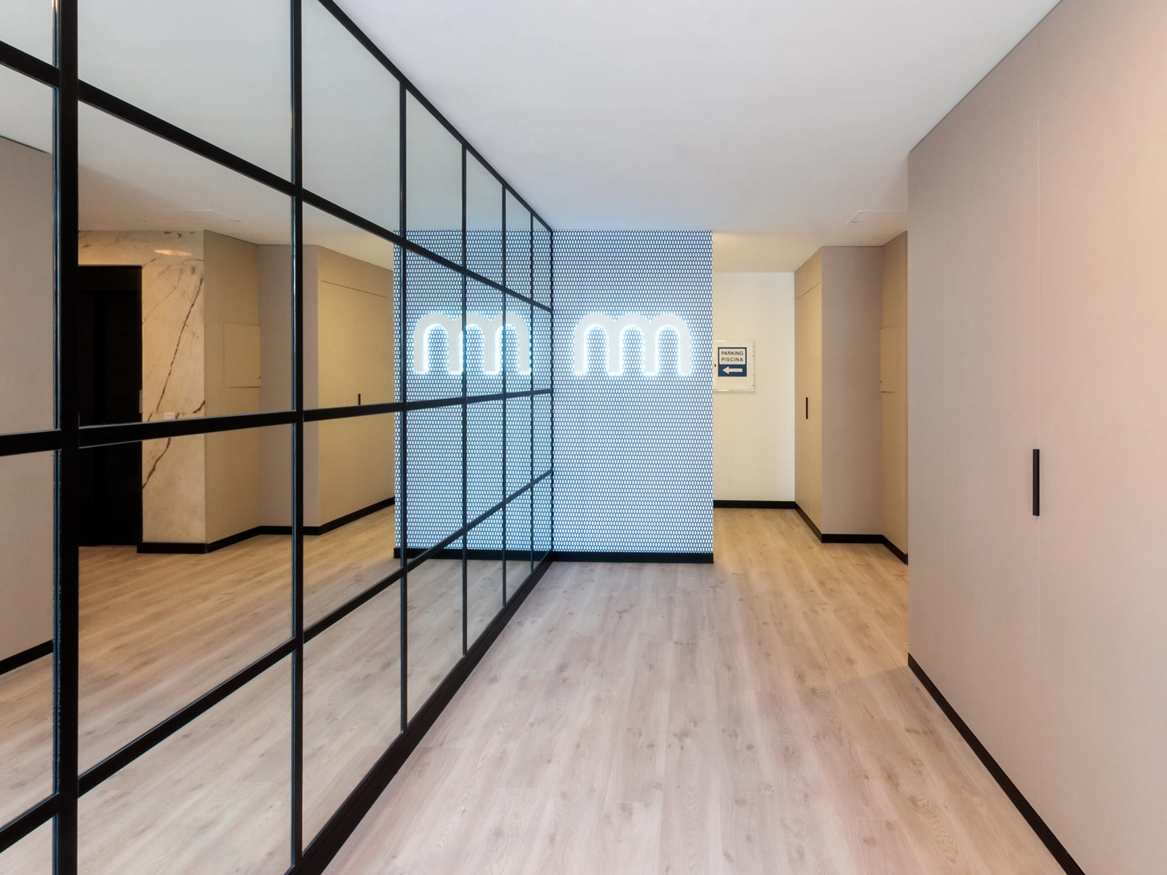 The kitchen follows the minimalist line, doors without handles and integrated appliances that make it so elegant. White tones and noble woods. It has a toaster, electric juicer, Italian and American coffee maker, dishwasher, washing machine, wine glasses, kettle ... everything you could need.