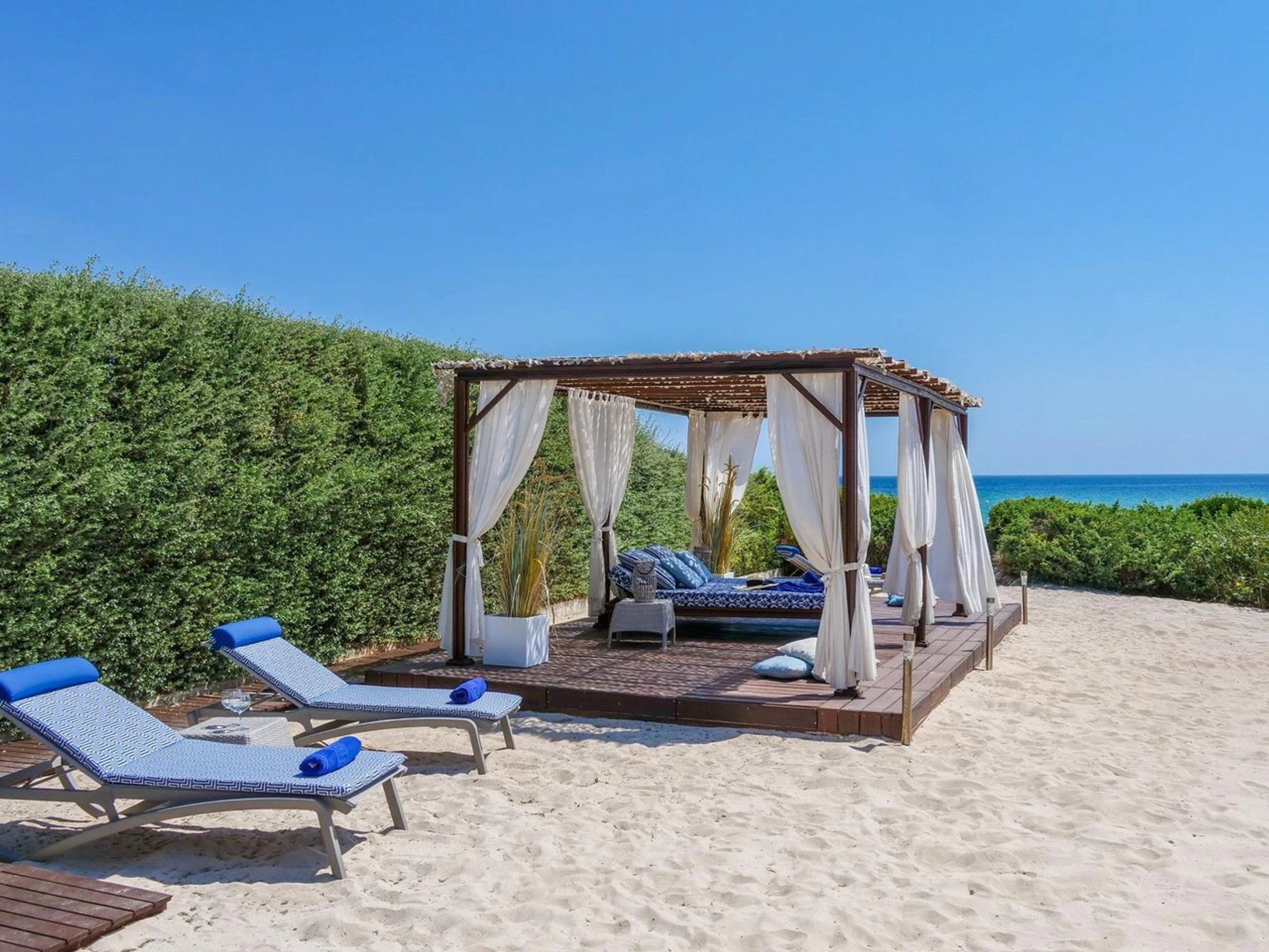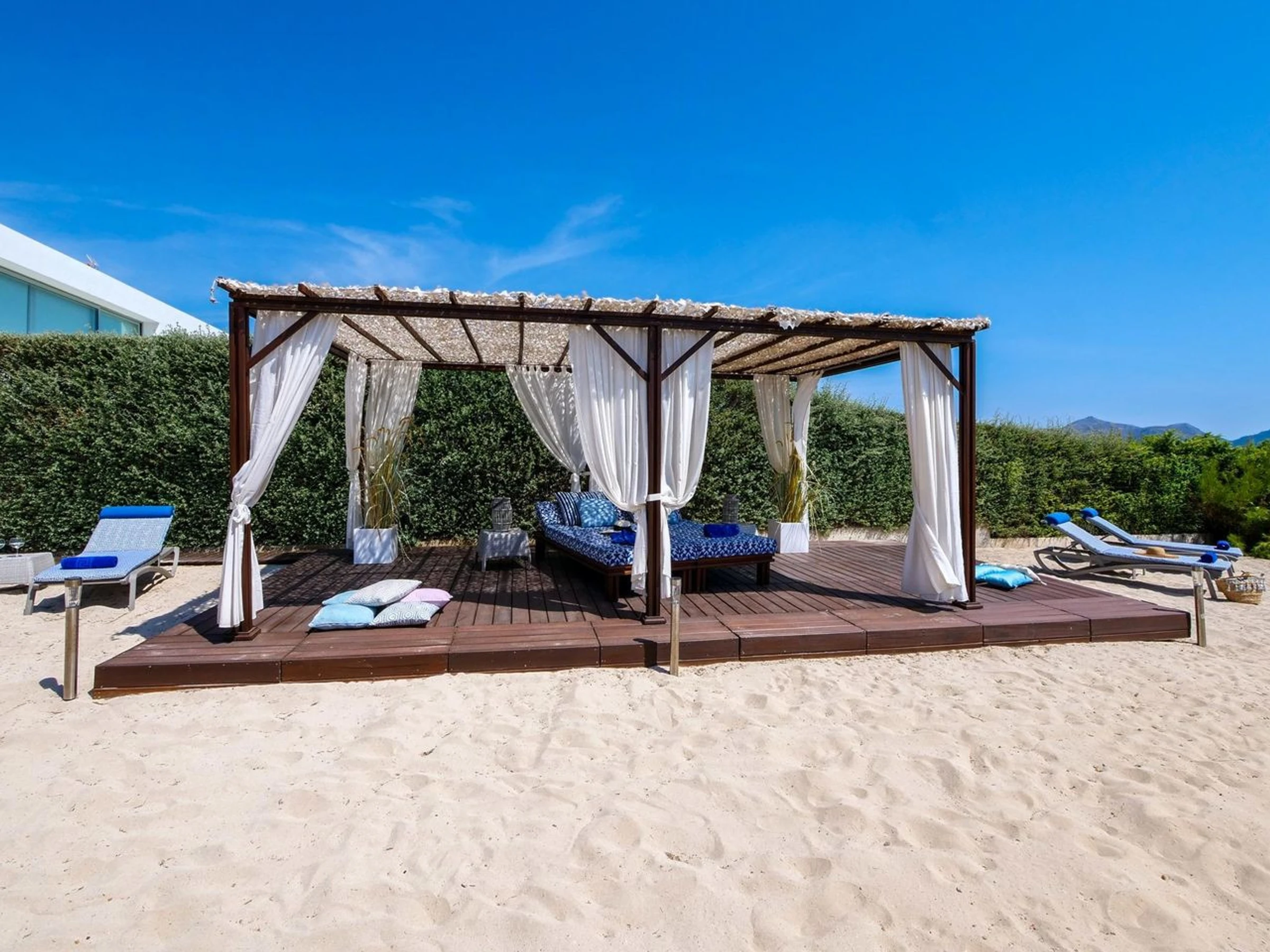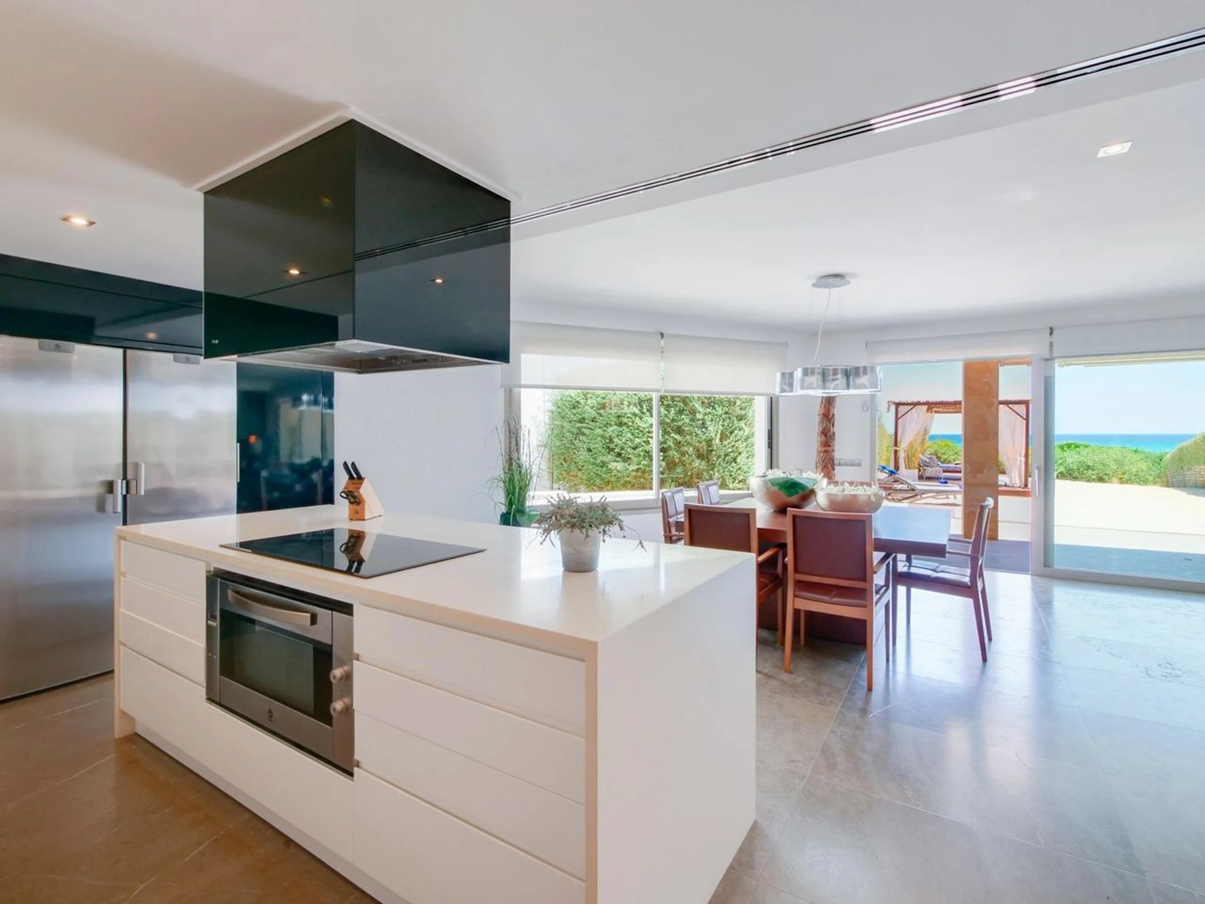 The outdoor area is a private paradise: a fine sandy garden, terraces with unrivaled views, and an outdoor dining area perfect for relaxing and enjoying the surroundings.