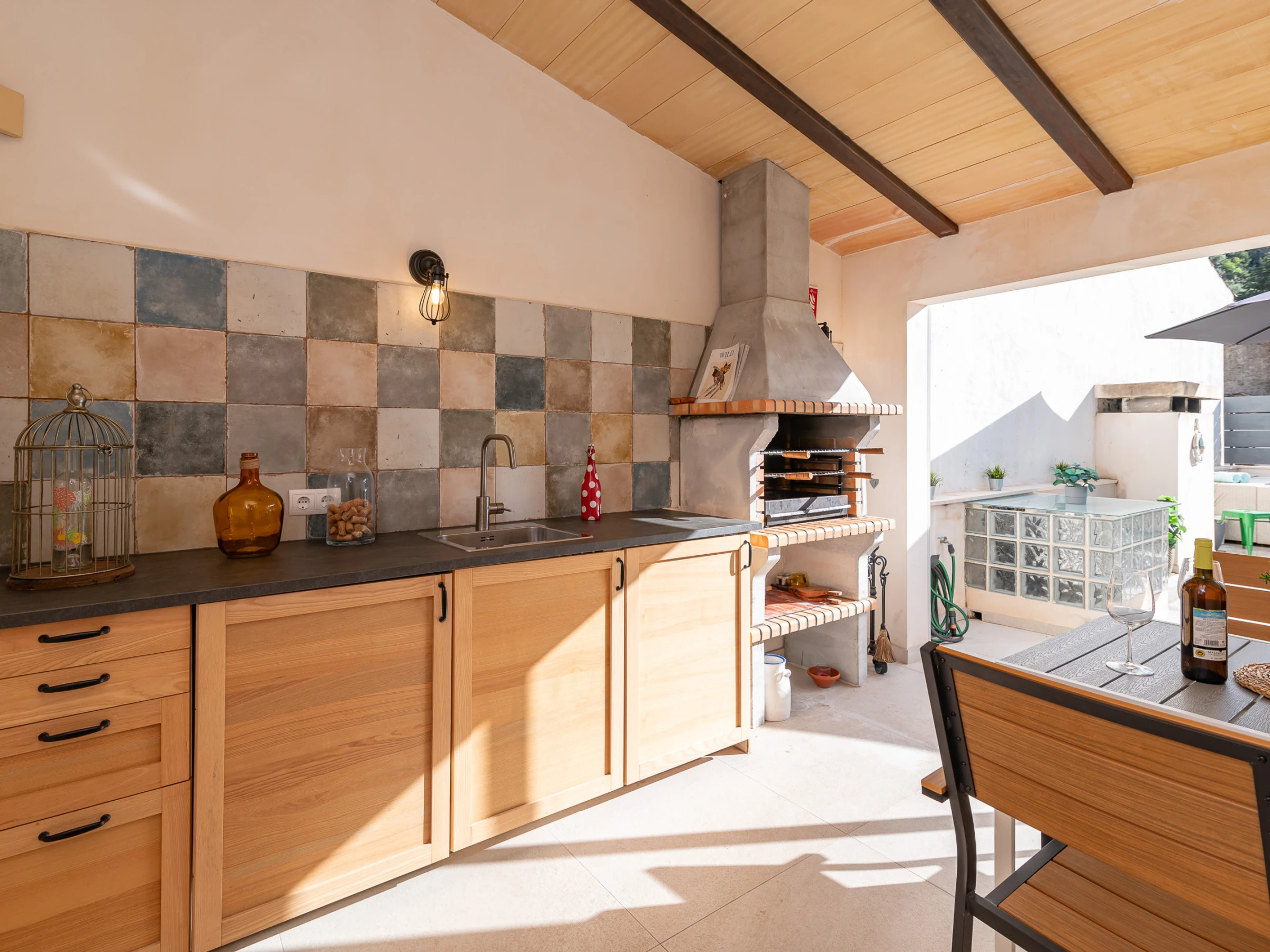 Upon going up to the next floor, you will discover a beautiful terrace, an outdoor refuge that features a small pool, perfect for relaxing and cooling off during the hot summer days. This terrace also has a covered area with an outdoor kitchen equipped with an integrated barbecue, where you can enjoy outdoor dinners with family and friends. Additionally, there is a third bedroom with two single bunk beds and a third bathroom with a shower. The terrace is furnished with two sunbeds and a table, ideal for enjoying outdoor meals.