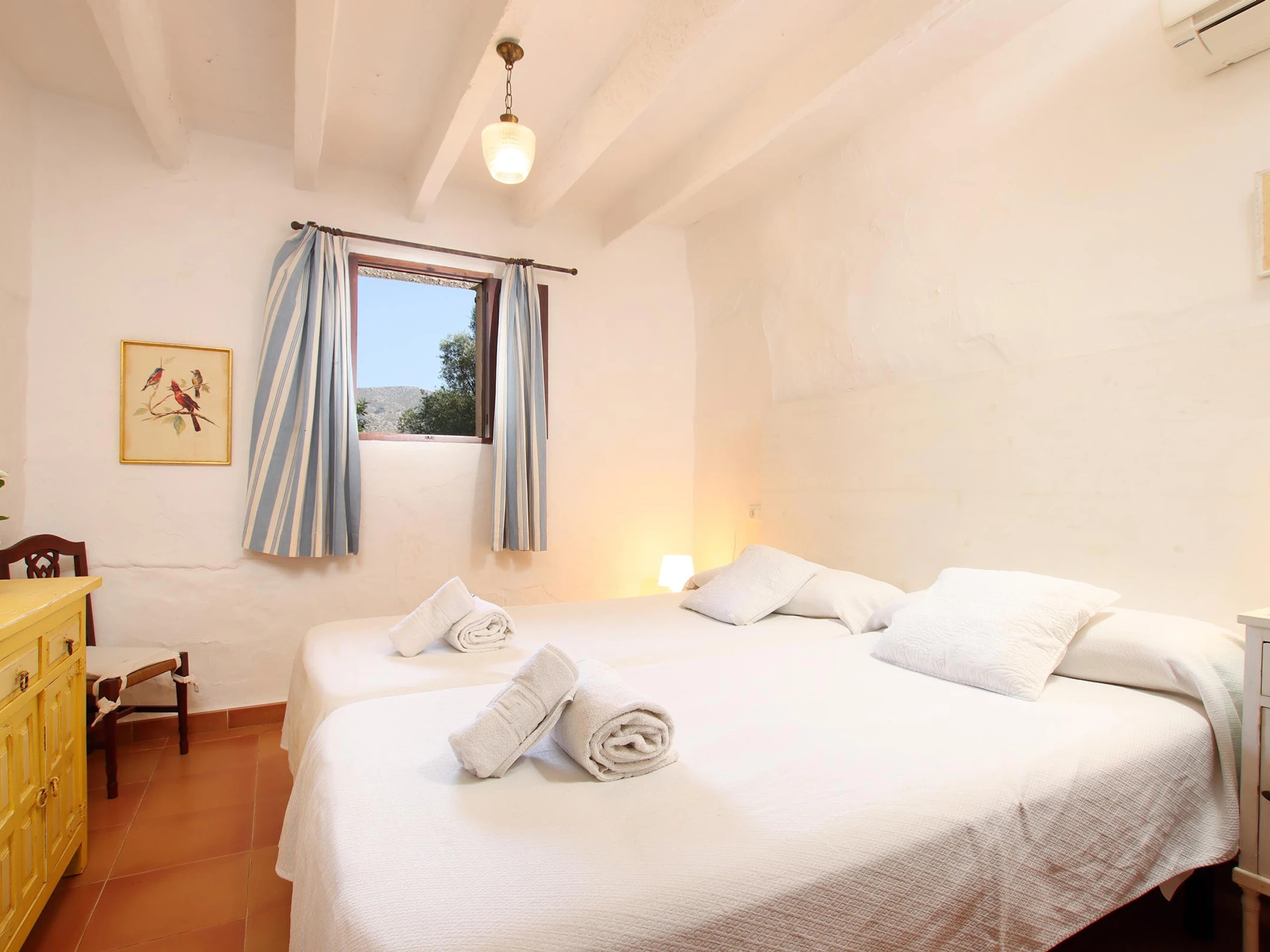 The villa is very close to a supermarket and to the main road that links Pollensa with Puerto Pollensa. The entrance is through a covered terrace and leads to a small lounge/dining room. To the left there is a double bedroom with antique furnishings. Also a door leads to a small passageway where the rest of the bedrooms and bathroom are. All the bedrooms benefit of air conditioning units. Through the outside terrace a door leads to the fitted kitchen.