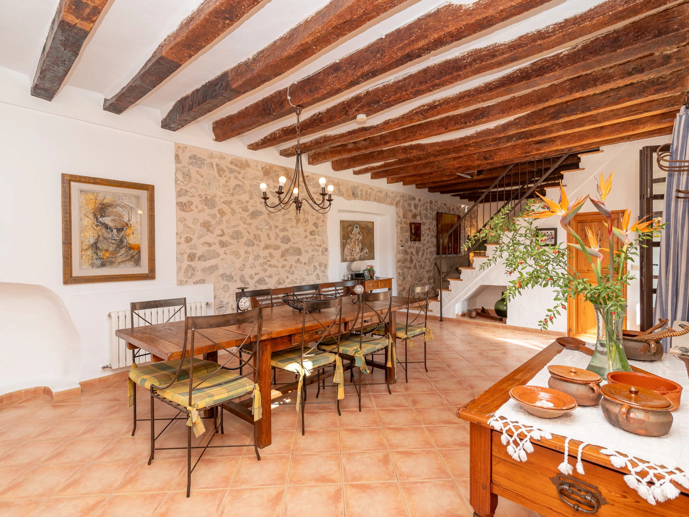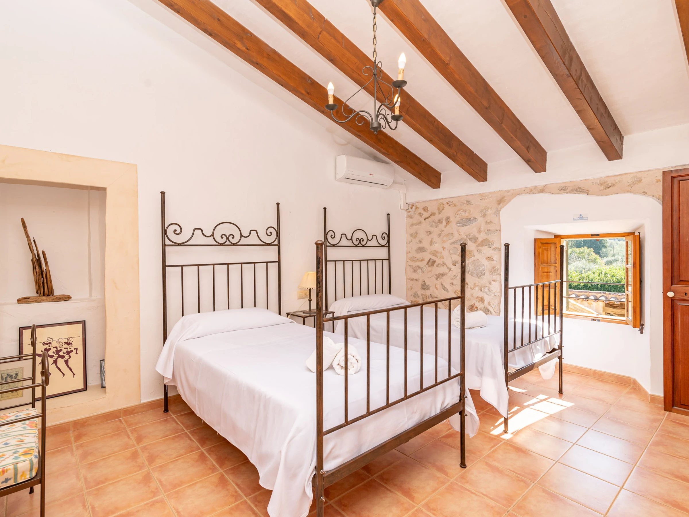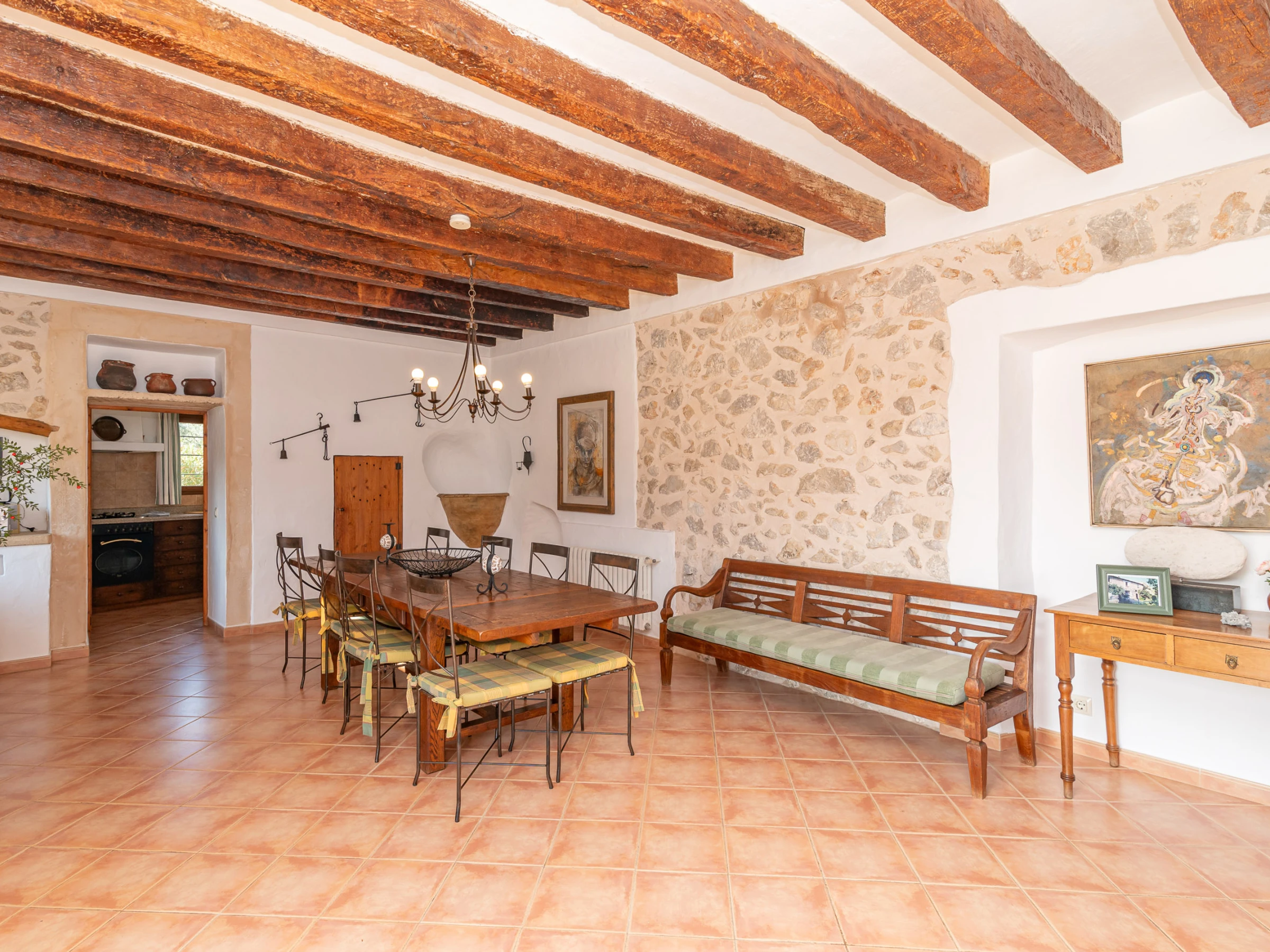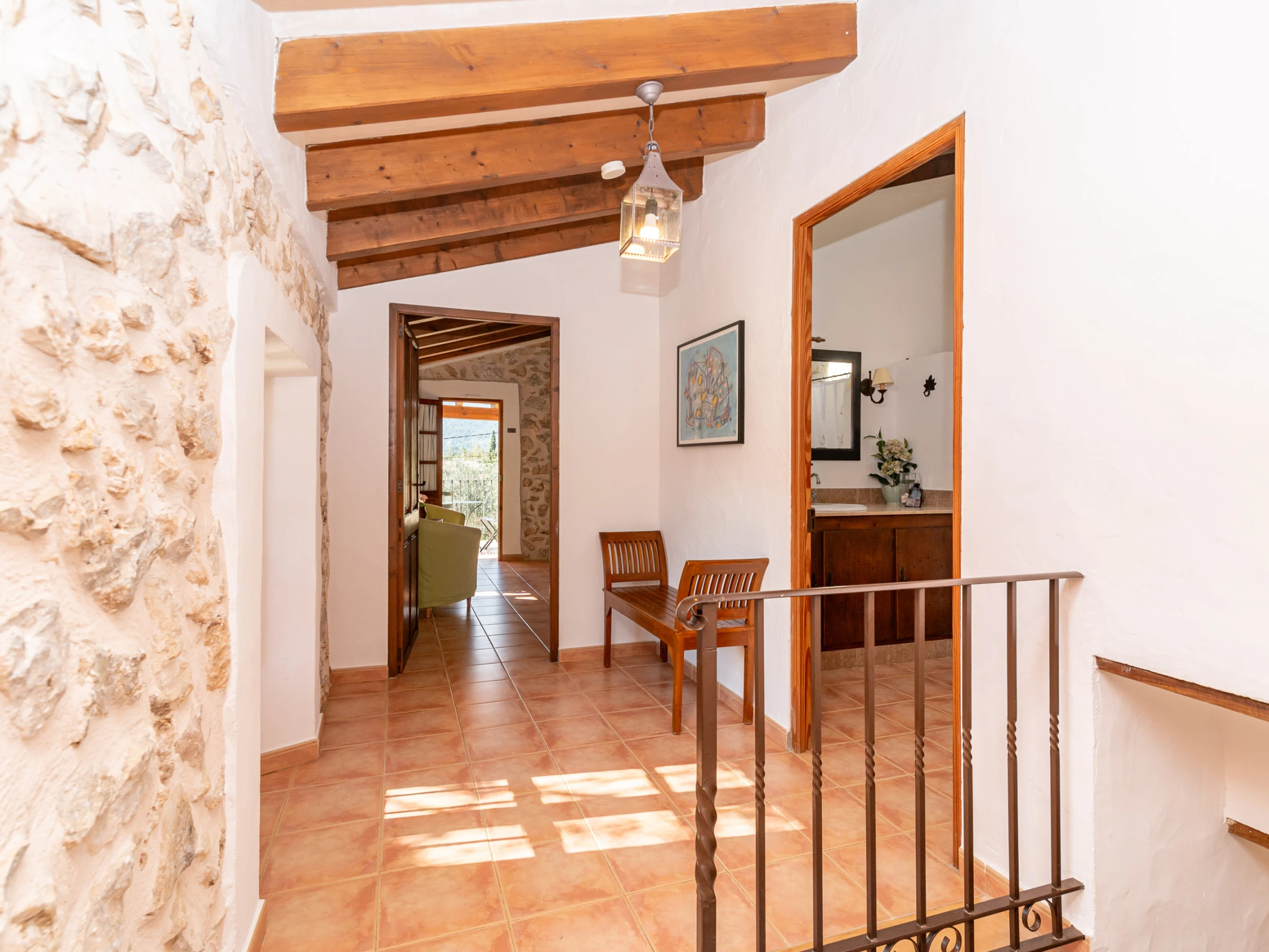 The villa is distributed over two floors and has an annex next to the swimming pool, with a double bedroom and a full bathroom, ideal for those seeking privacy. In the main house, a bright dining room with wooden beams and Mallorcan elements provides access to a fully equipped kitchen and an additional bathroom. On the upper floor, there is a cosy living room, a double bedroom and a room with single beds, as well as the main bedroom with a balcony and views of the countryside. The bedrooms share a bathroom with stone walls and a skylight.