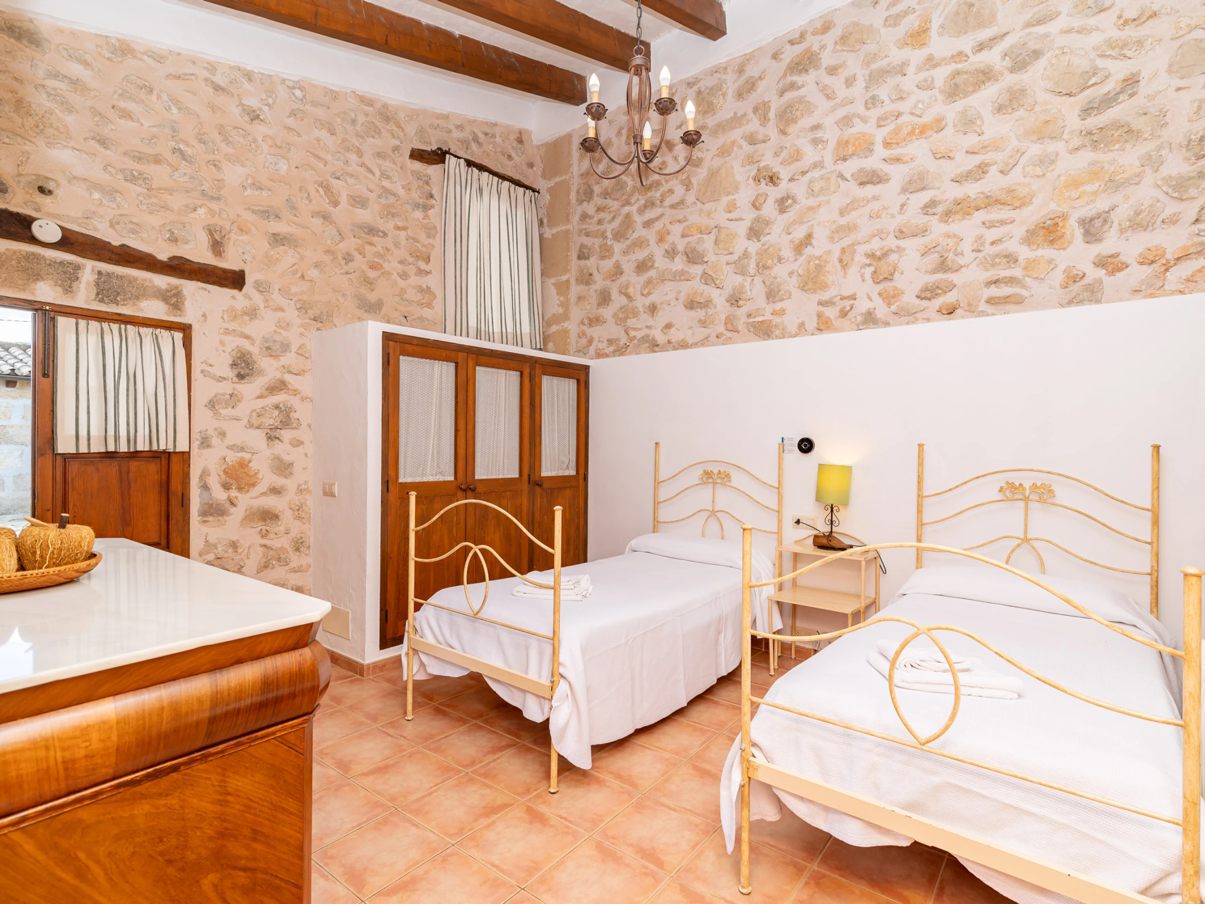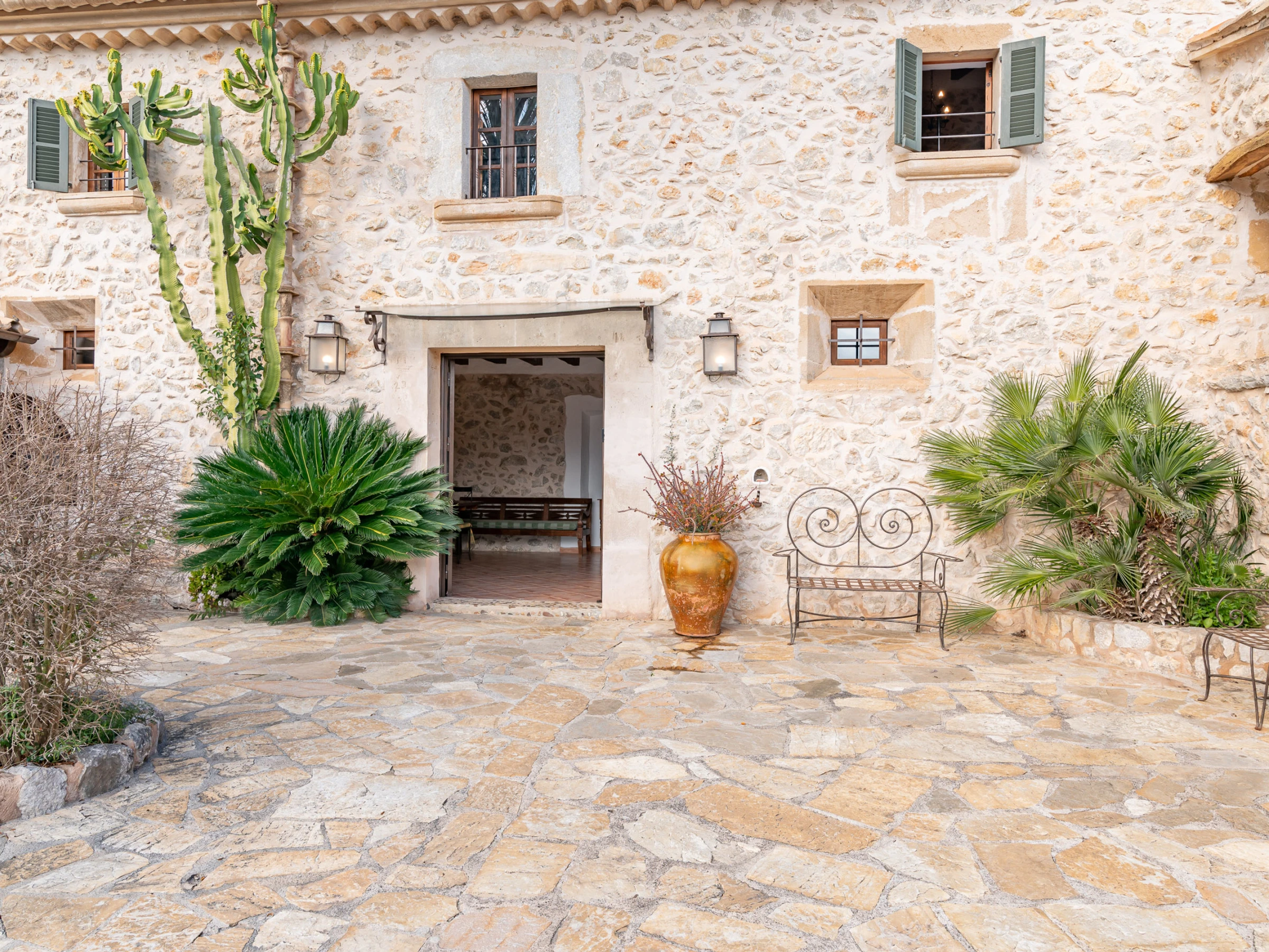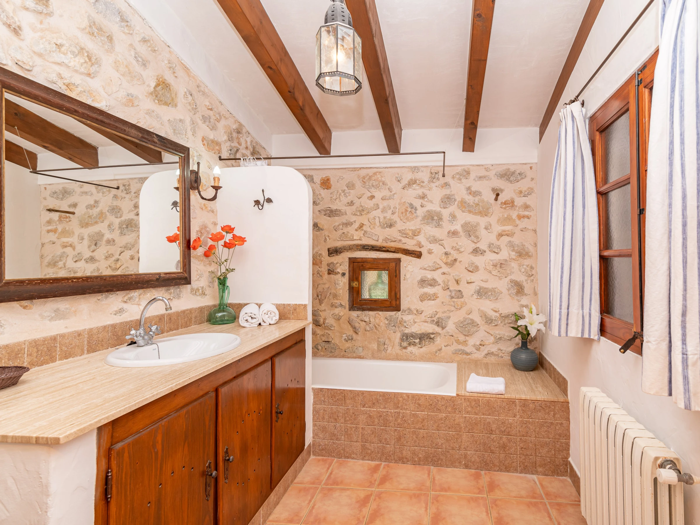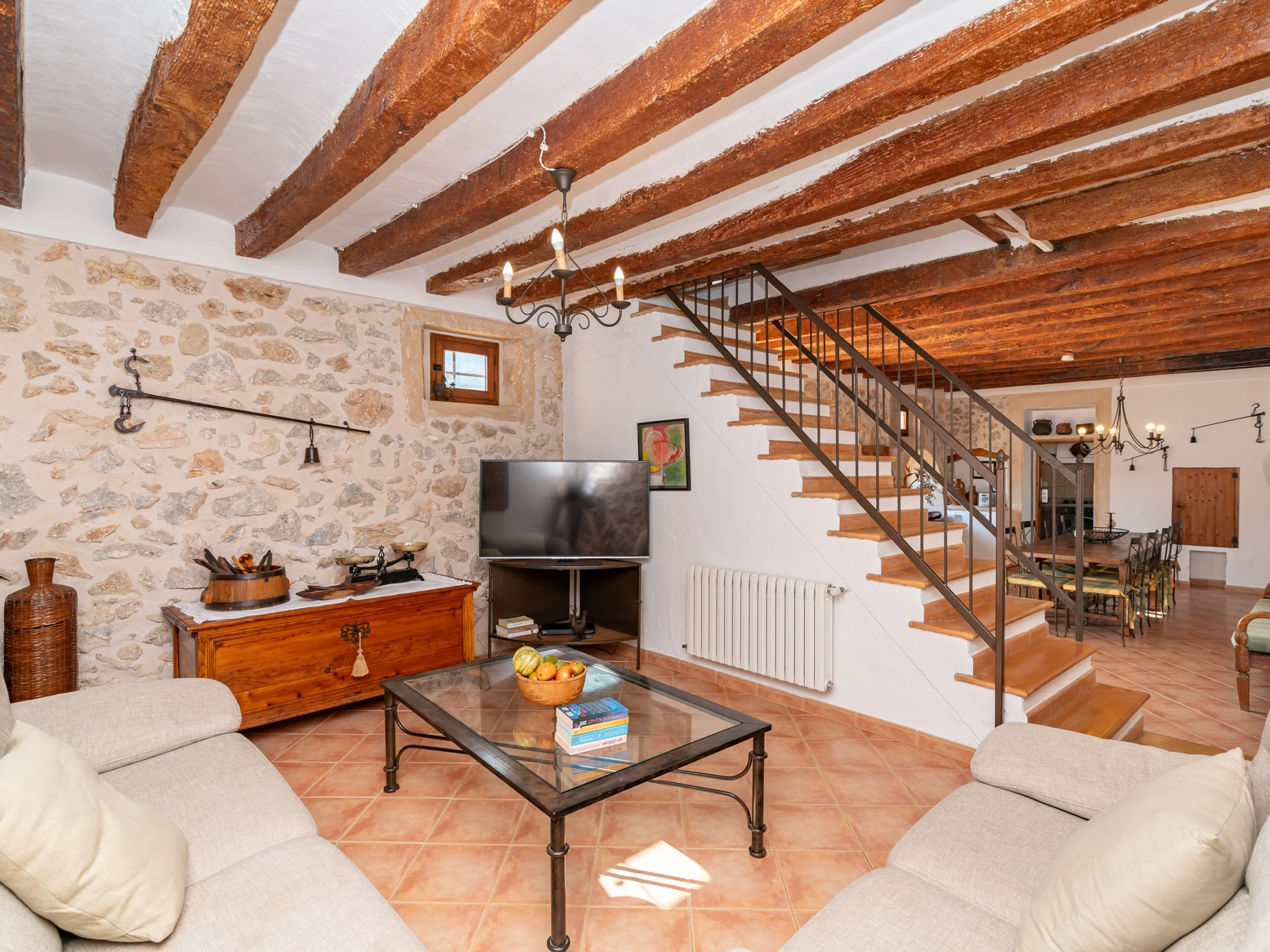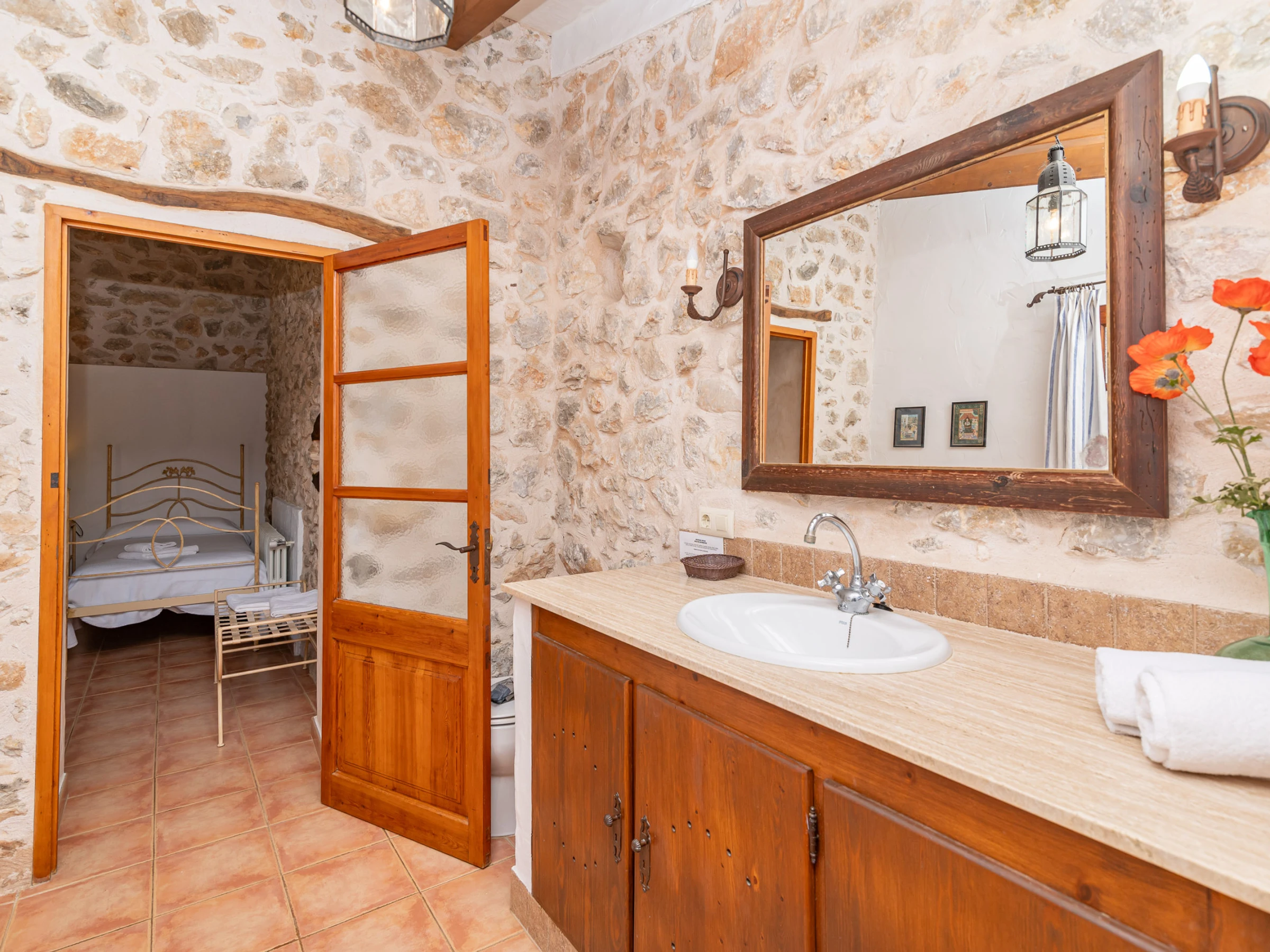 The villa is distributed over two floors and has an annex next to the swimming pool, with a double bedroom and a full bathroom, ideal for those seeking privacy. In the main house, a bright dining room with wooden beams and Mallorcan elements provides access to a fully equipped kitchen and an additional bathroom. On the upper floor, there is a cosy living room, a double bedroom and a room with single beds, as well as the main bedroom with a balcony and views of the countryside. The bedrooms share a bathroom with stone walls and a skylight.