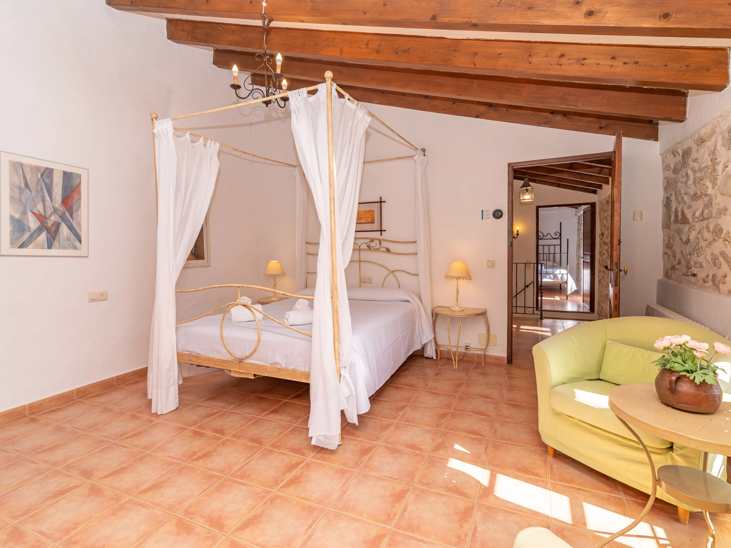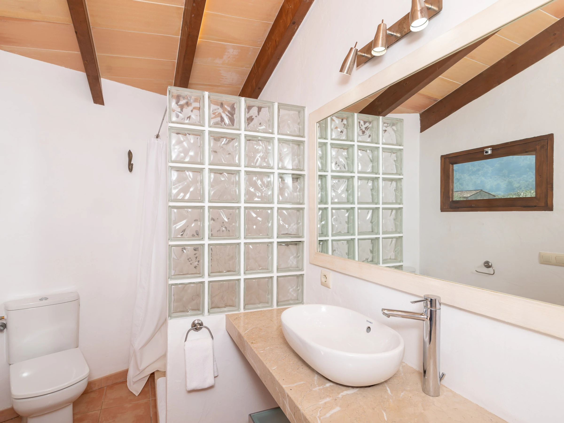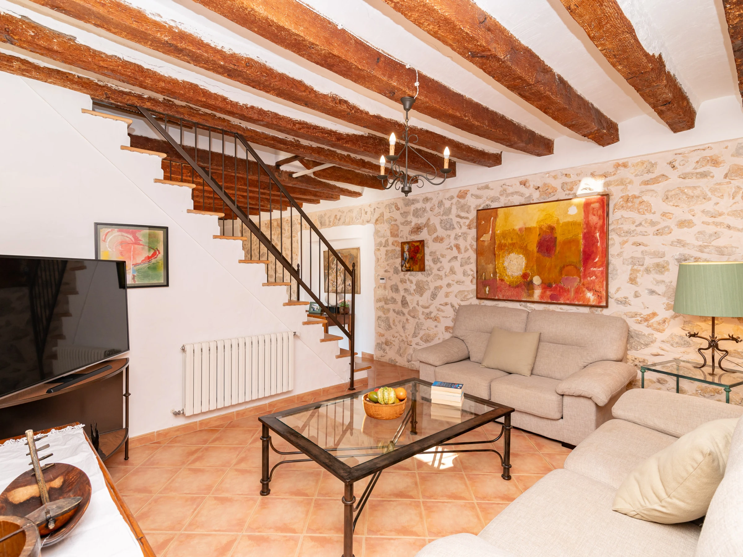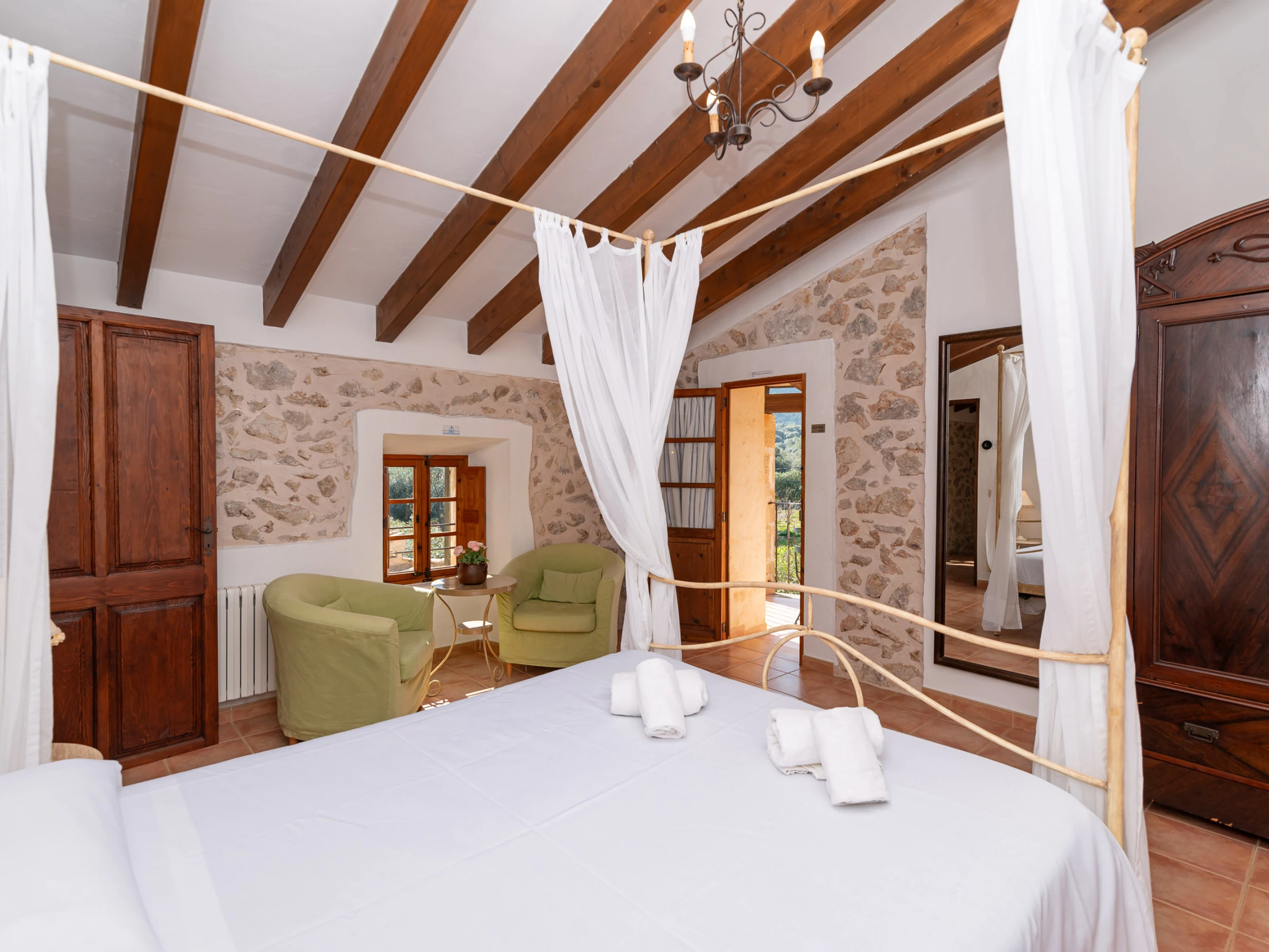 The villa is distributed over two floors and has an annex next to the swimming pool, with a double bedroom and a full bathroom, ideal for those seeking privacy. In the main house, a bright dining room with wooden beams and Mallorcan elements provides access to a fully equipped kitchen and an additional bathroom. On the upper floor, there is a cosy living room, a double bedroom and a room with single beds, as well as the main bedroom with a balcony and views of the countryside. The bedrooms share a bathroom with stone walls and a skylight.