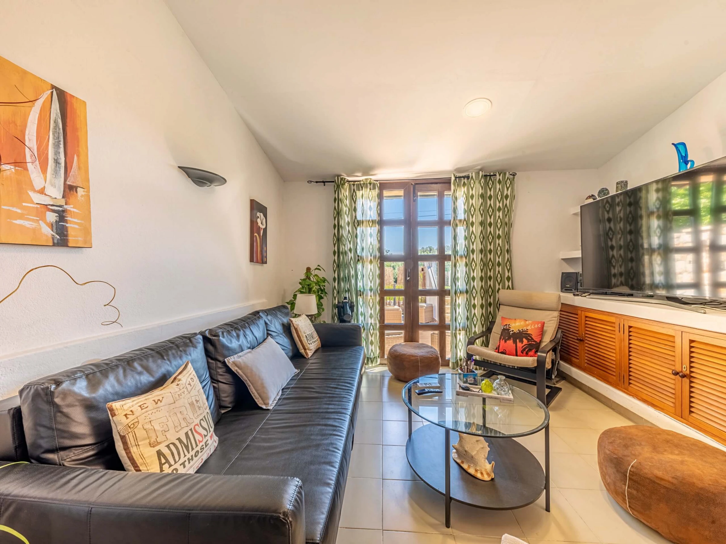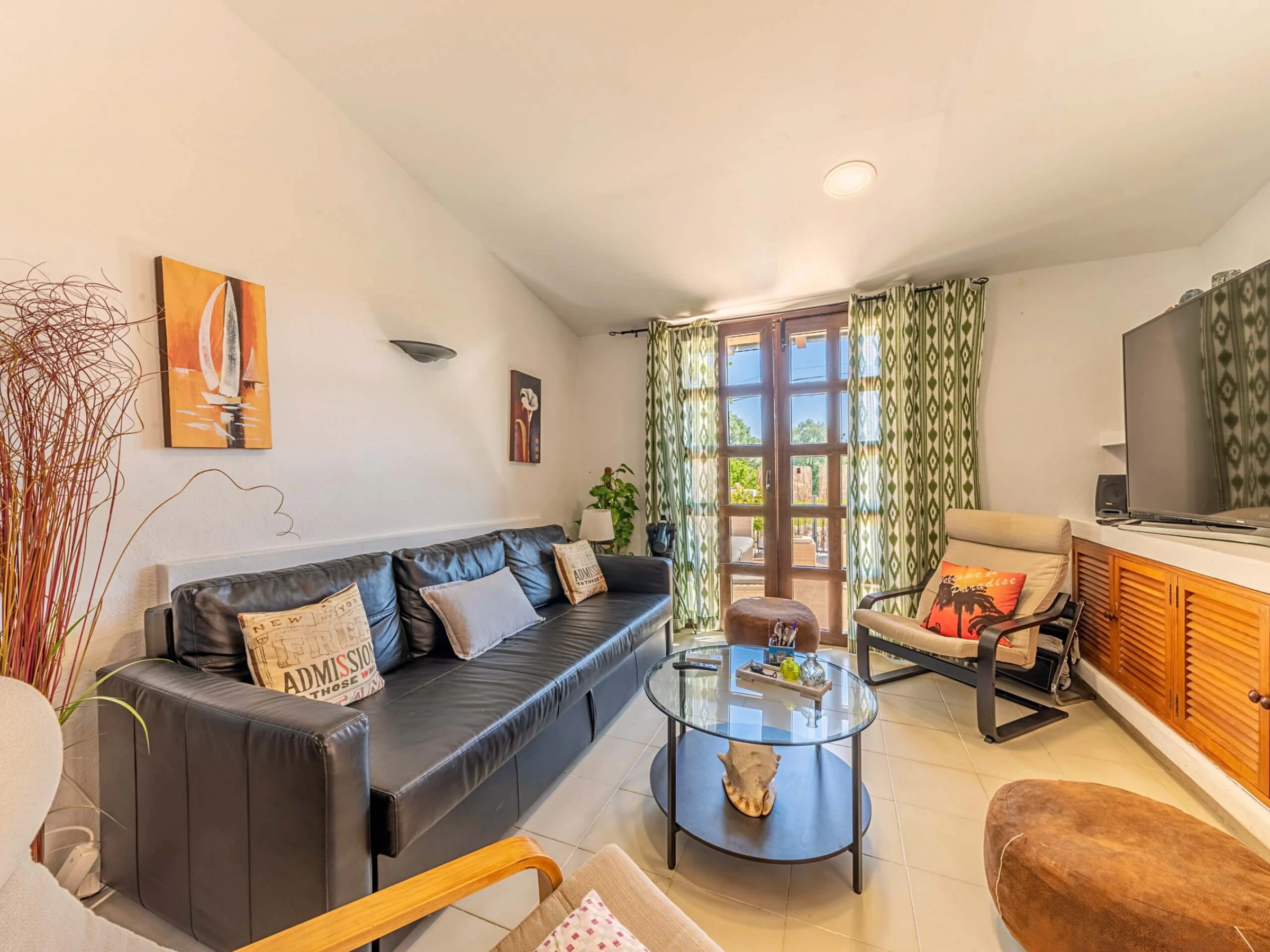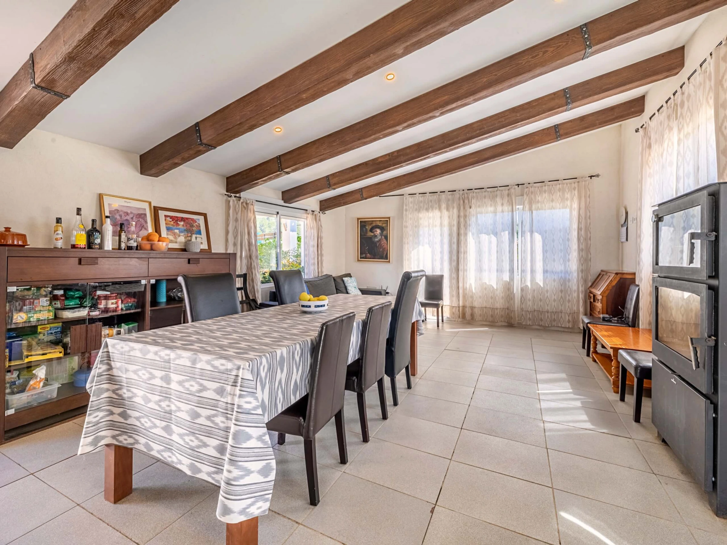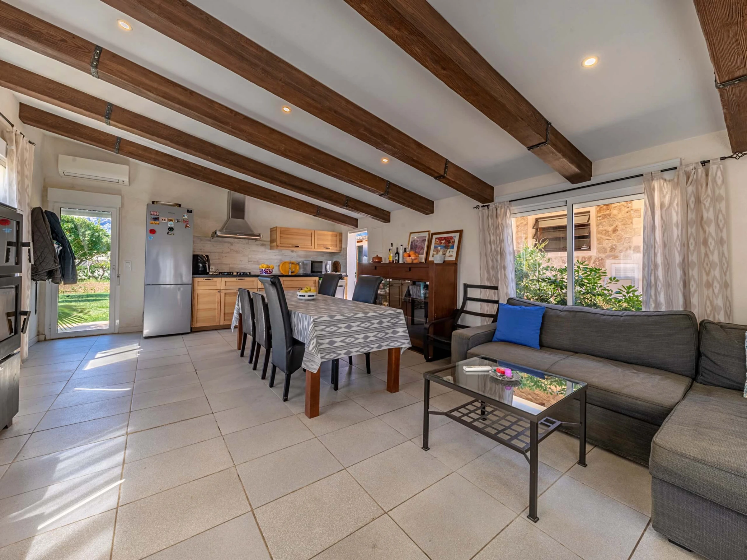 Upon entering the villa, you will be greeted by a spacious and bright living room. Here you will find comfortable sofas and a flat-screen television, perfect for relaxing after a day exploring the area. The living room also features large windows that allow natural light to enter and offer direct access to the garden and pool.