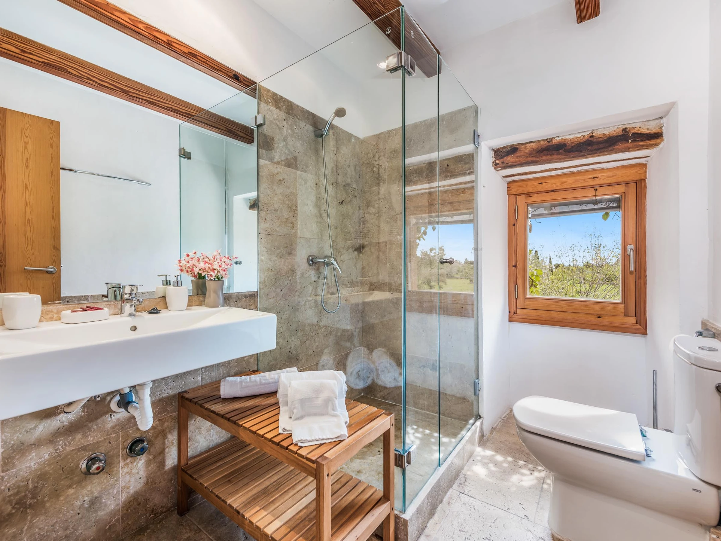 The pool is made with natural stone tiles the same as those on the terrace floor, characterizing it with details of different shades thanks to the iron embedded in the stone, which gives a modern touch to the exterior of the villa. The pool is situated to the right of the villa, adorned with comfortable sun loungers on the spacious surrounding sun terraces. For your added convenience is a newly built poolside shower room with washing facilities and WC.