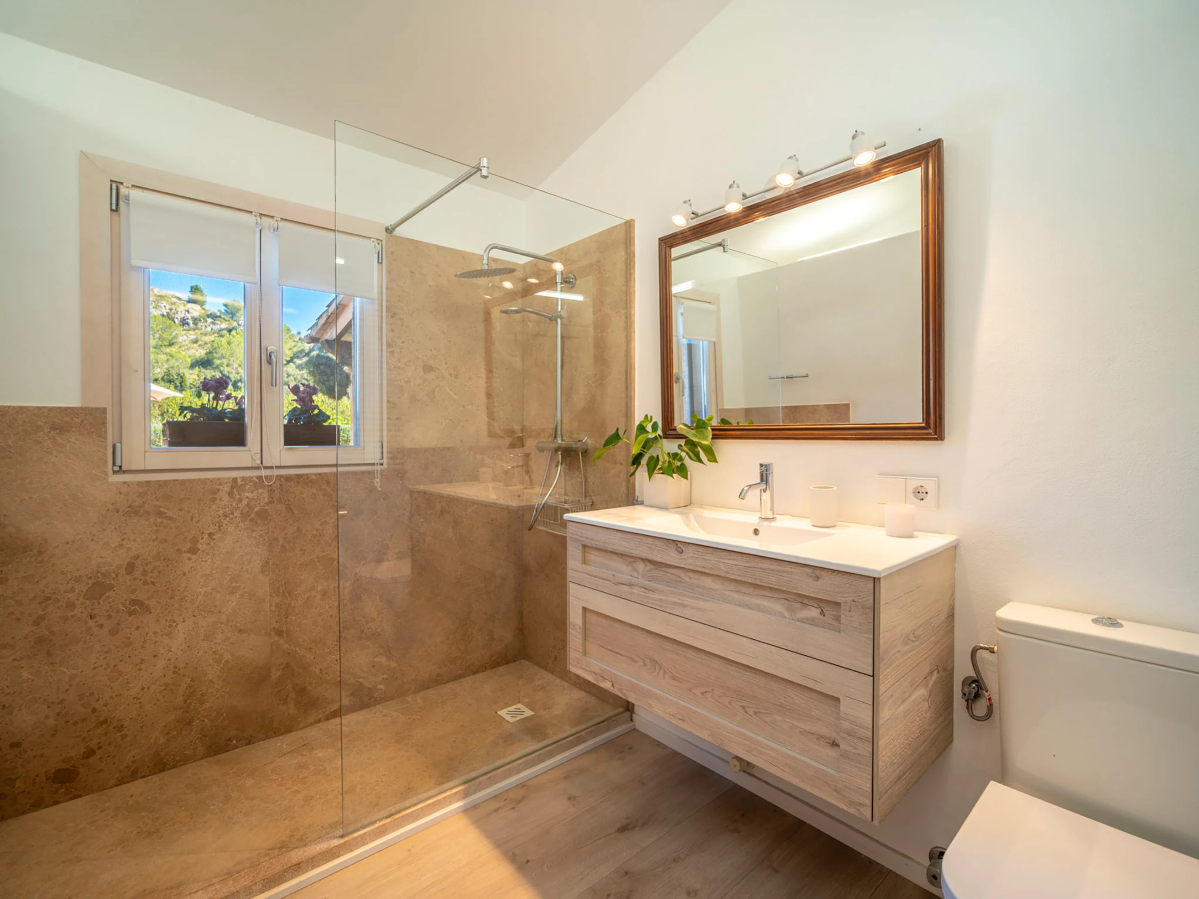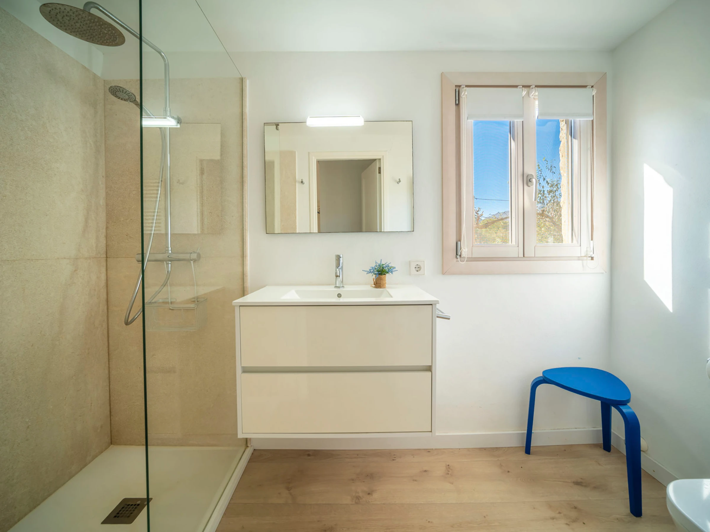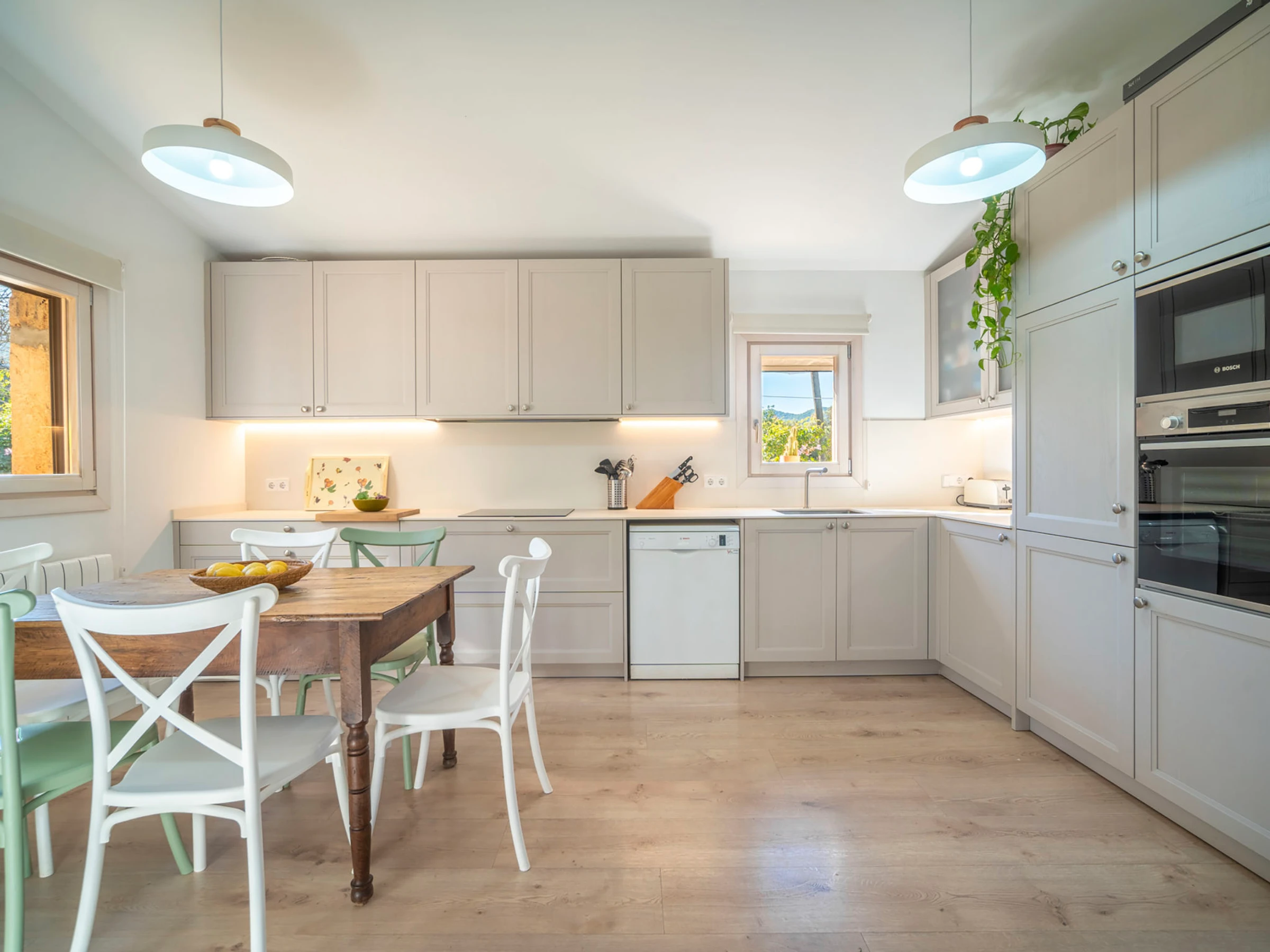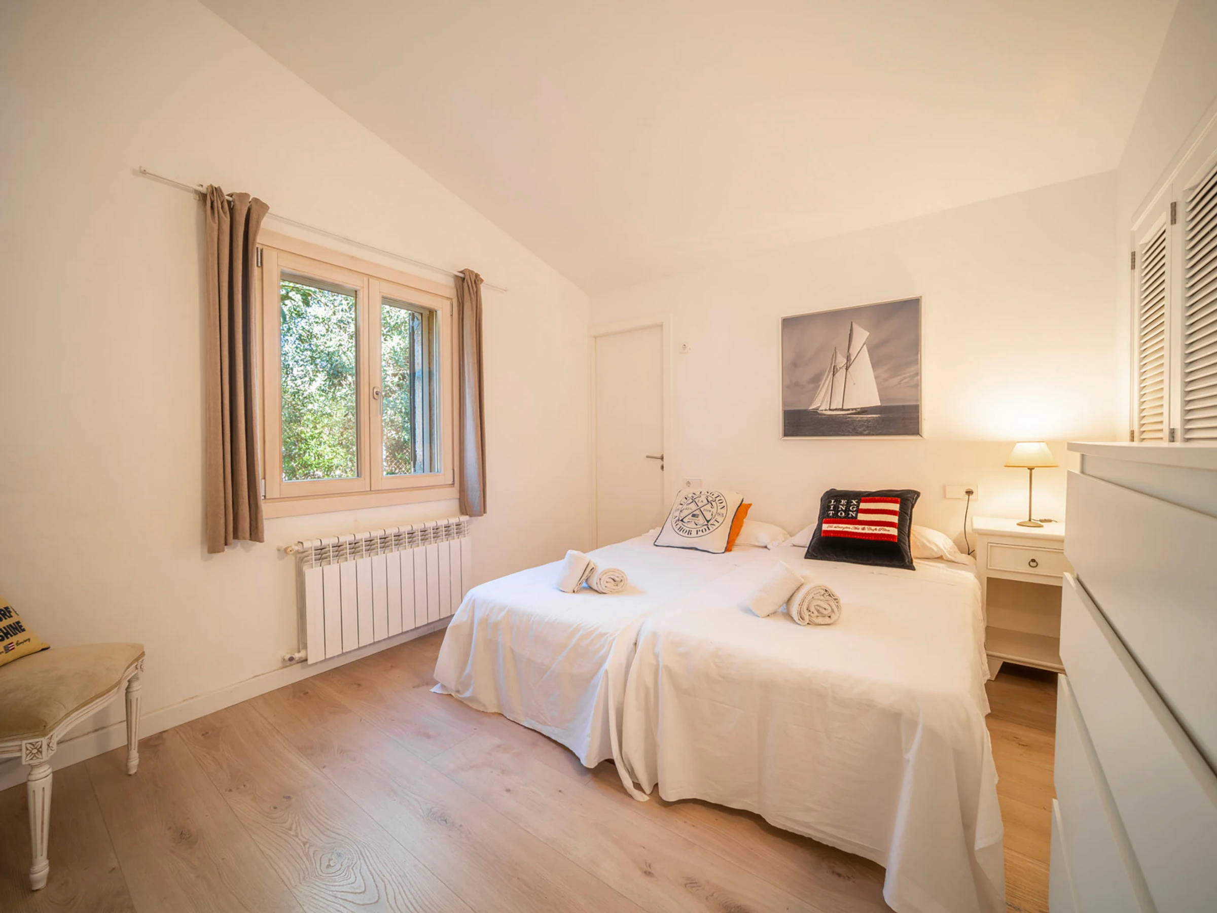 "Can Vins", 4-room house 230 m2, lower ground floor. Object suitable for 6 adults. Practical and comfortable furnishings: large living room with digital TV. Exit to the patio. 1 double bedroom with 2 beds (90 cm, length 200 cm), shower/WC, air conditioning and forced-air heating. 1 double bedroom with 2 beds (90 cm, length 200 cm), air conditioning and forced-air heating. 1 double bedroom with 2 beds (90 cm, length 200 cm), fan. Kitchen-/living room (oven, dishwasher, 3 ceramic glass hob hotplates, toaster, kettle, microwave, freezer, electric coffee machine) with dining table. Shower/WC. Upper floor: gallery with sloping ceilings. Large patio, lawn, porch. Terrace furniture, barbecue, deck chairs, covered balcony. Very beautiful view of the mountains. Facilities: washing machine, dryer, iron, children's high chair, baby cot for up to 2 year olds, hair dryer. Internet (WiFi, free). Parking (roofed, fenced) at the house. Please note: suitable for families. Non-smoking house. Fire extinguisher, no lift. The pool mentioned in the description is for private use. [hidden] // Reg. Nr.: ESFCTU000007030000016513000000000000000000000[hidden]4
