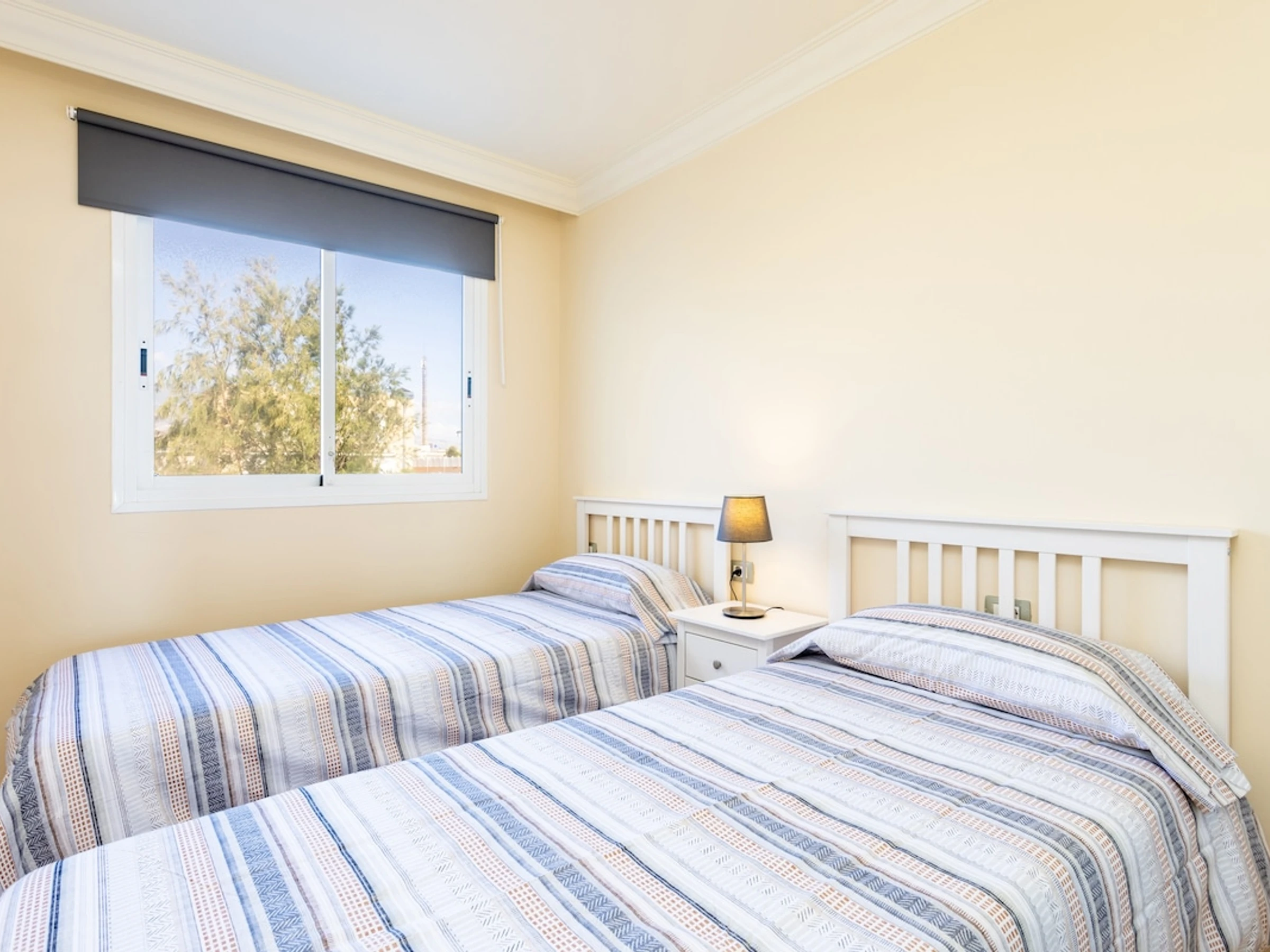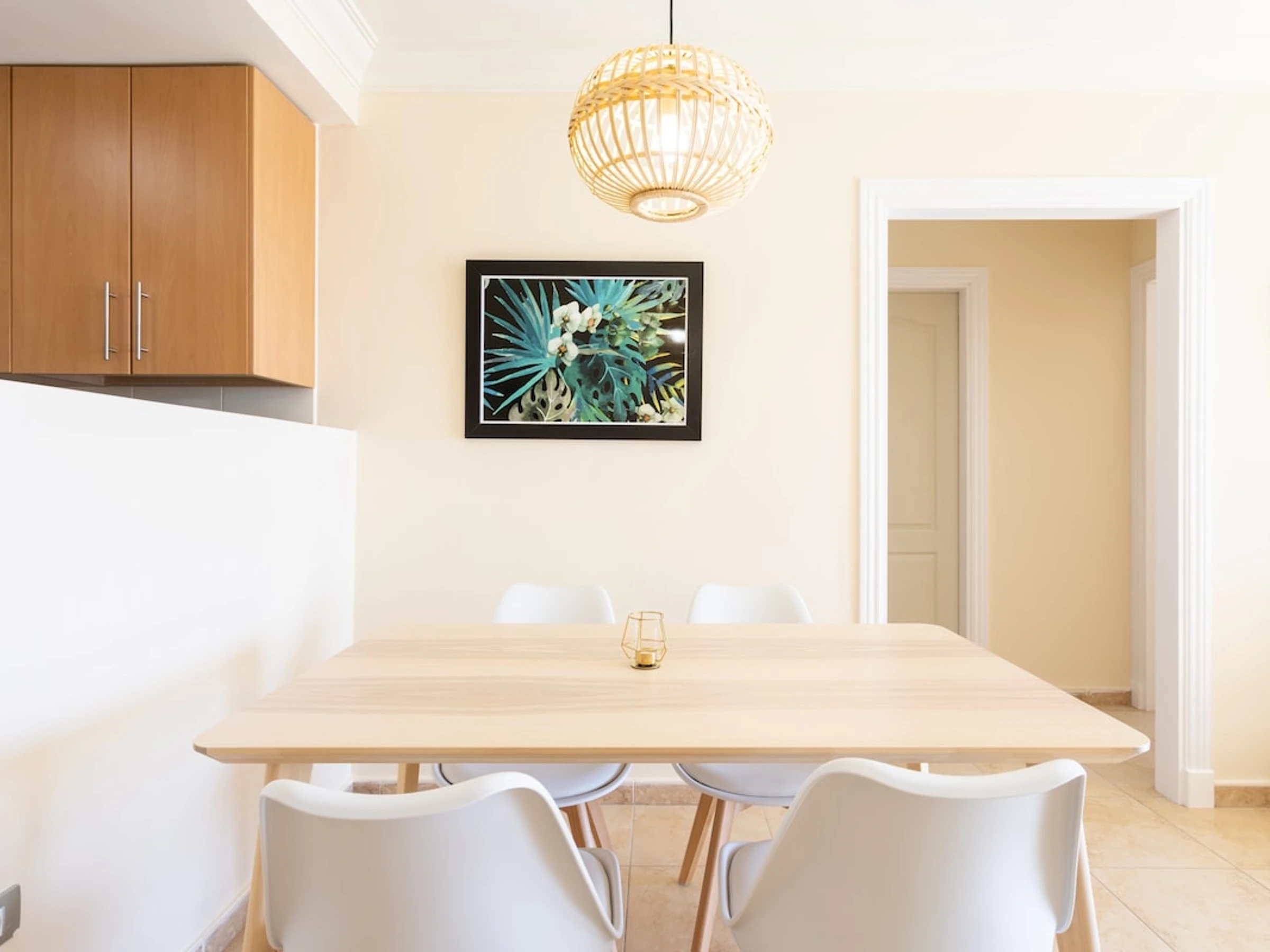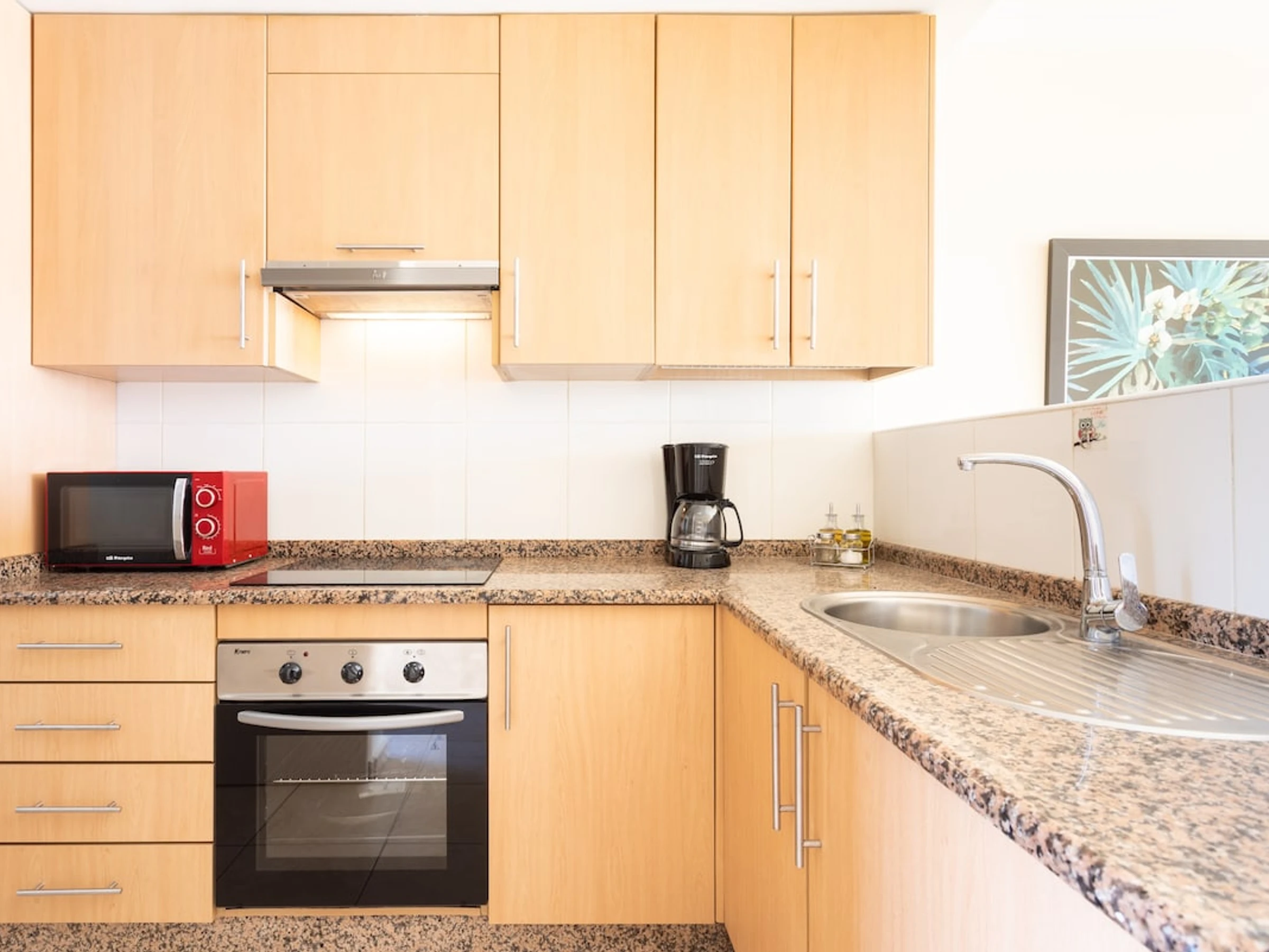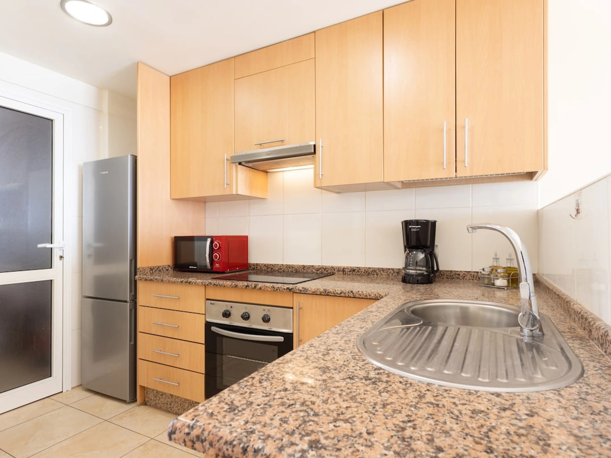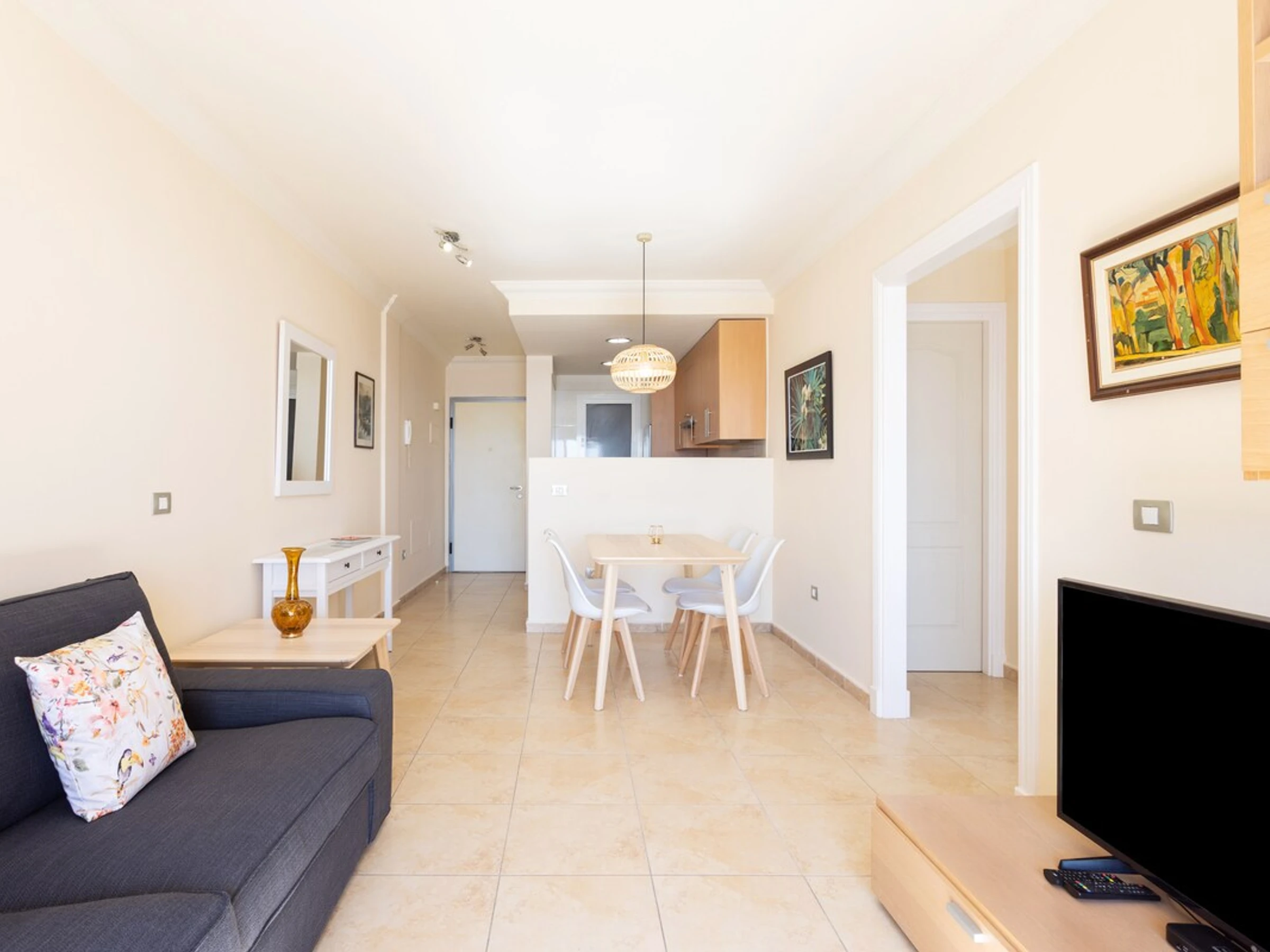 It is ideal for families and business trips as it can accommodate up to 4 people, with 2 bedrooms, a bathroom, fully equipped kitchen, living room that connects to a nice terrace with sea views and 300mb fibre Wifi Internet. Located in a quiet residential complex with two swimming pools and a small children's playground. With the beach just a few minutes from the flat and a coastline surrounded by unique corners and natural pools. In addition to being very well located, halfway between the capital and the south of the island and just a few minutes from the motorway.
