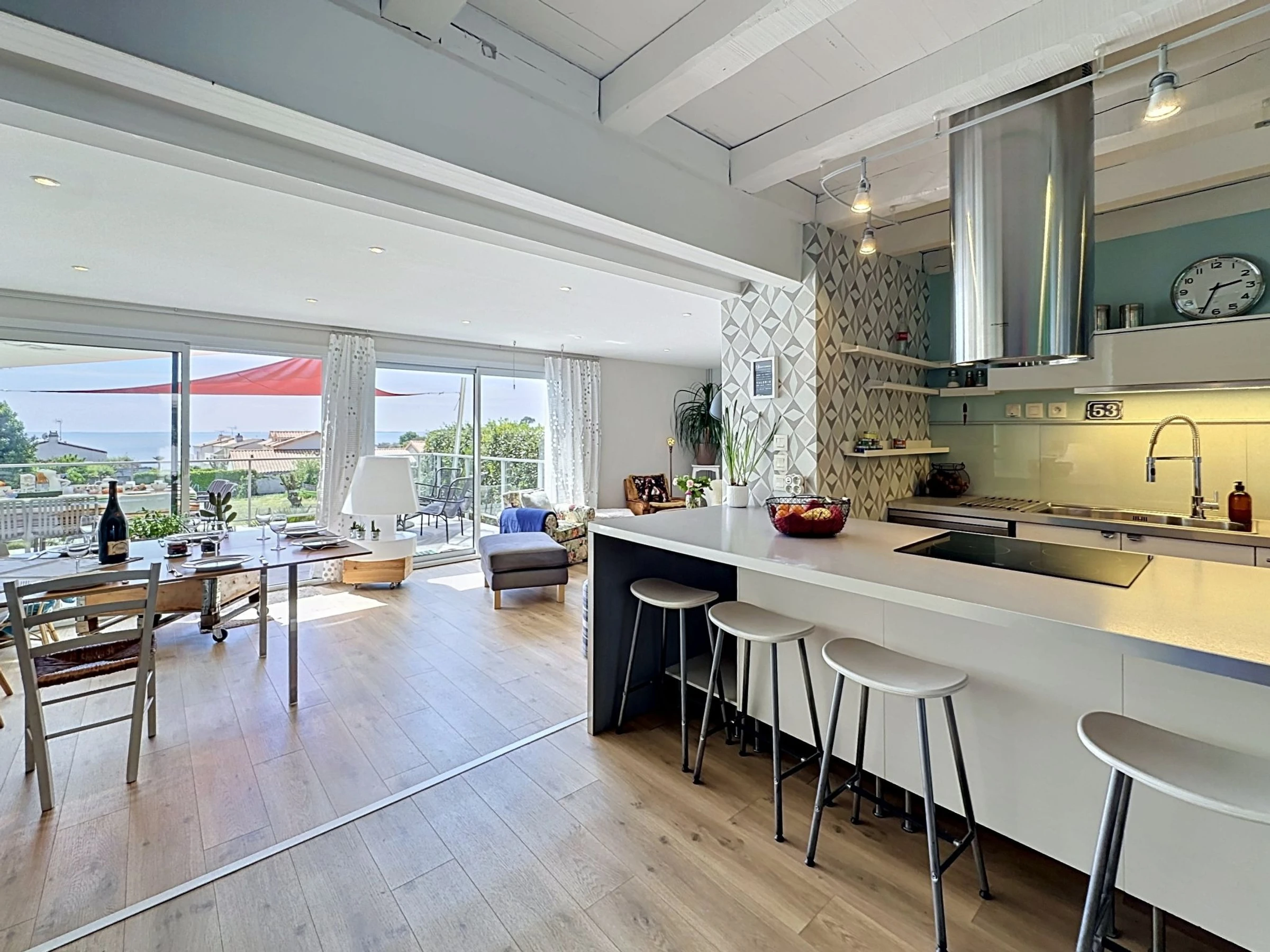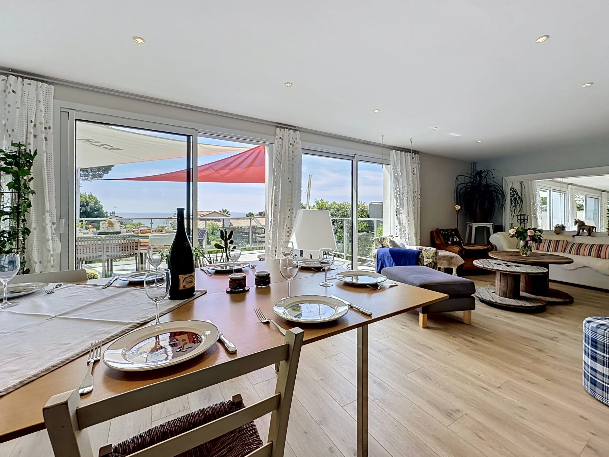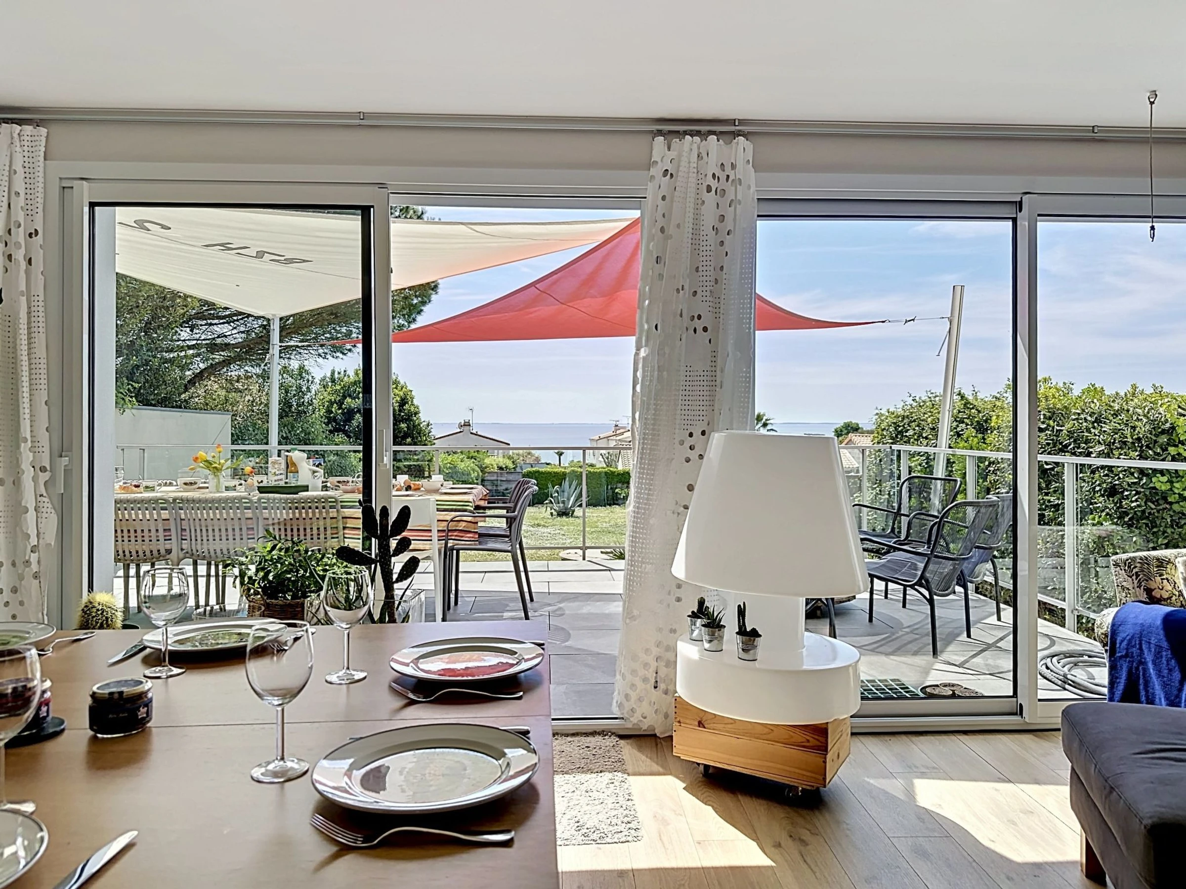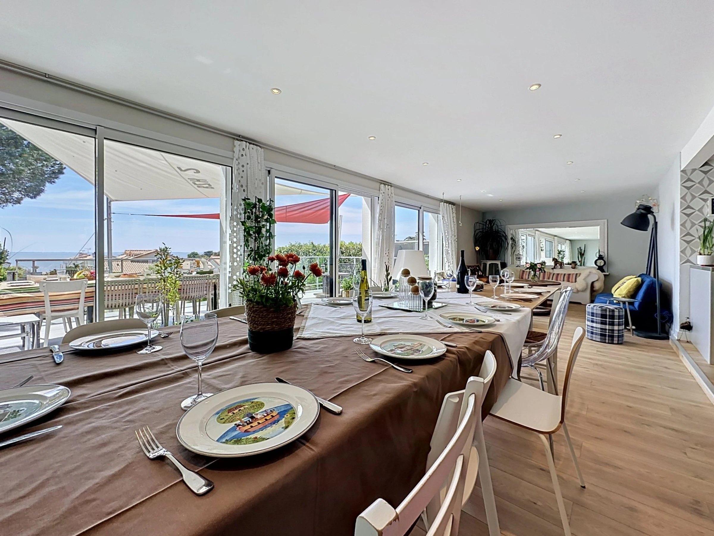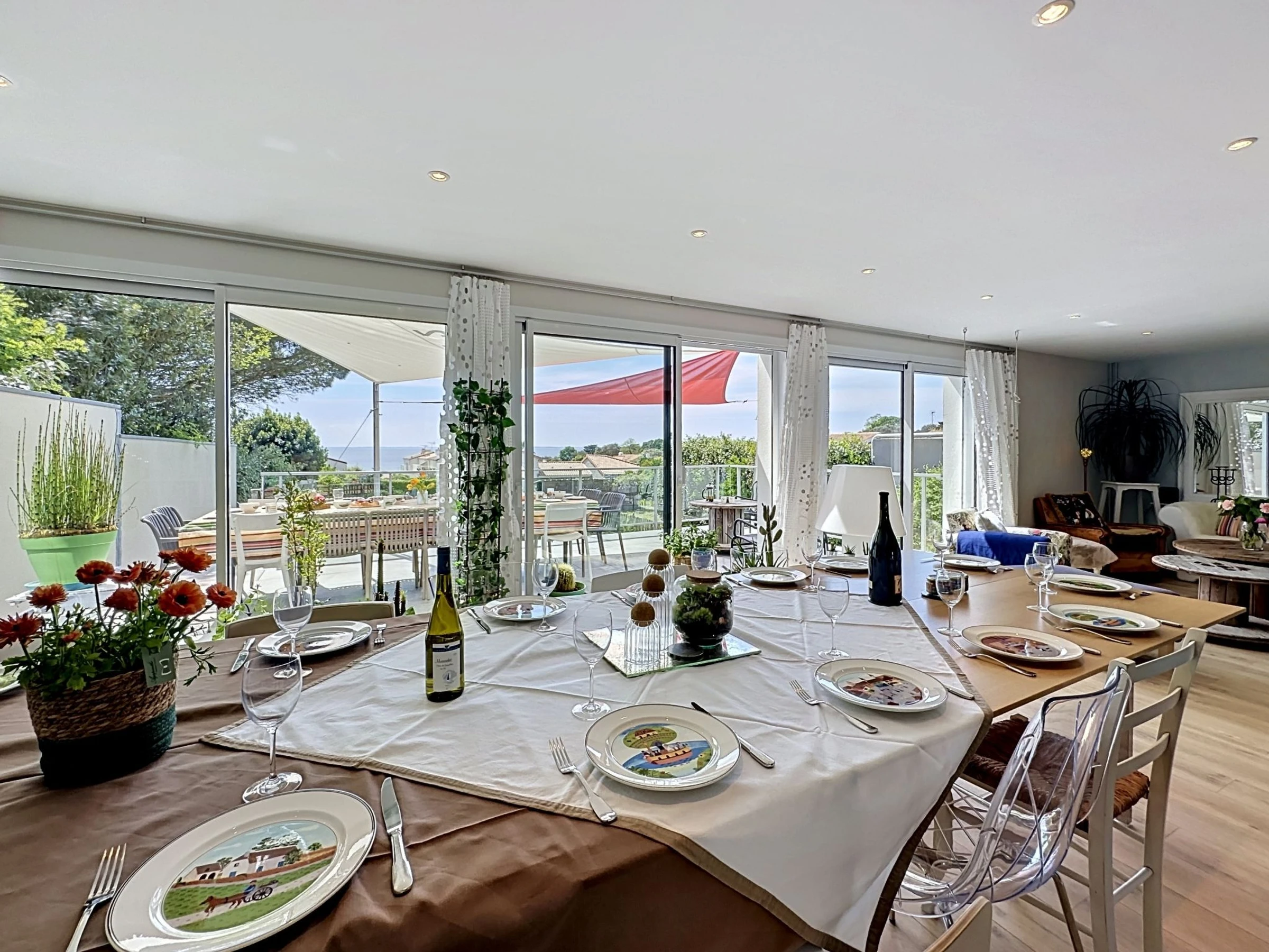 "L'Incroyable", 6-room house 195 m2 on 2 levels, south facing position. Spacious, beautiful furnishings: large living/dining room with TV (flat screen). Exit to the terrace, south facing position. 1 room with 1 french bed (1 x 140 cm, length 190 cm), hand-basin and shower. Open kitchen (oven, dishwasher, 3 induction hot plates, toaster, kettle, microwave, electric coffee machine, cooking island). Sep. WC. Upper floor: gallery with 1 double sofabed (1 x 140 cm, length 190 cm). 1 room with 2 beds (80 cm, length 200 cm). 1 large room with Dressing room with 2 beds (90 cm, length 200 cm), shower/WC. 1 room with 1 french bed (1 x 180 cm, length 200 cm). 1 room with 1 bed (90 cm, length 200 cm), 1 french bed (1 x 120 cm, length 190 cm). Bath/WC, double hand-basin. Gas heating. Terrace 32 m2, south facing position terrace 40 m2, south facing position, garden 400 m2, south facing position. Terrace furniture, barbecue, deck chairs. Very beautiful view of the sea and the ocean. Facilities: washing machine, safe, iron, baby cot for up to 2 year olds, hair dryer. Internet (WiFi, free). Parking (fenced 2 cars). E-charging station. Please note: non-smoking house. Maximum 1 pet/ dog allowed. Smoke alarm. Offer by a private individual according to Art. 155, IV of CGI. [hidden]