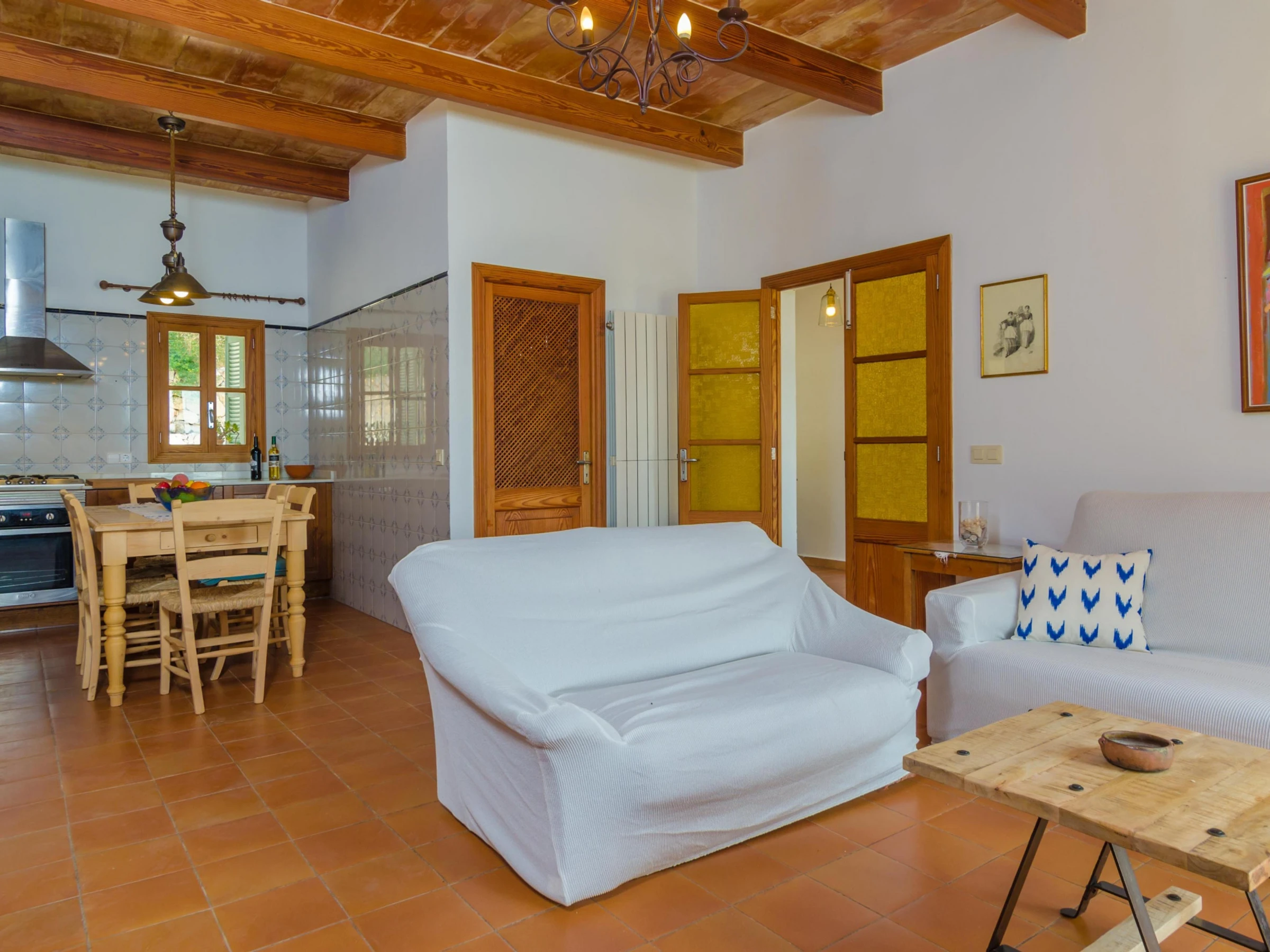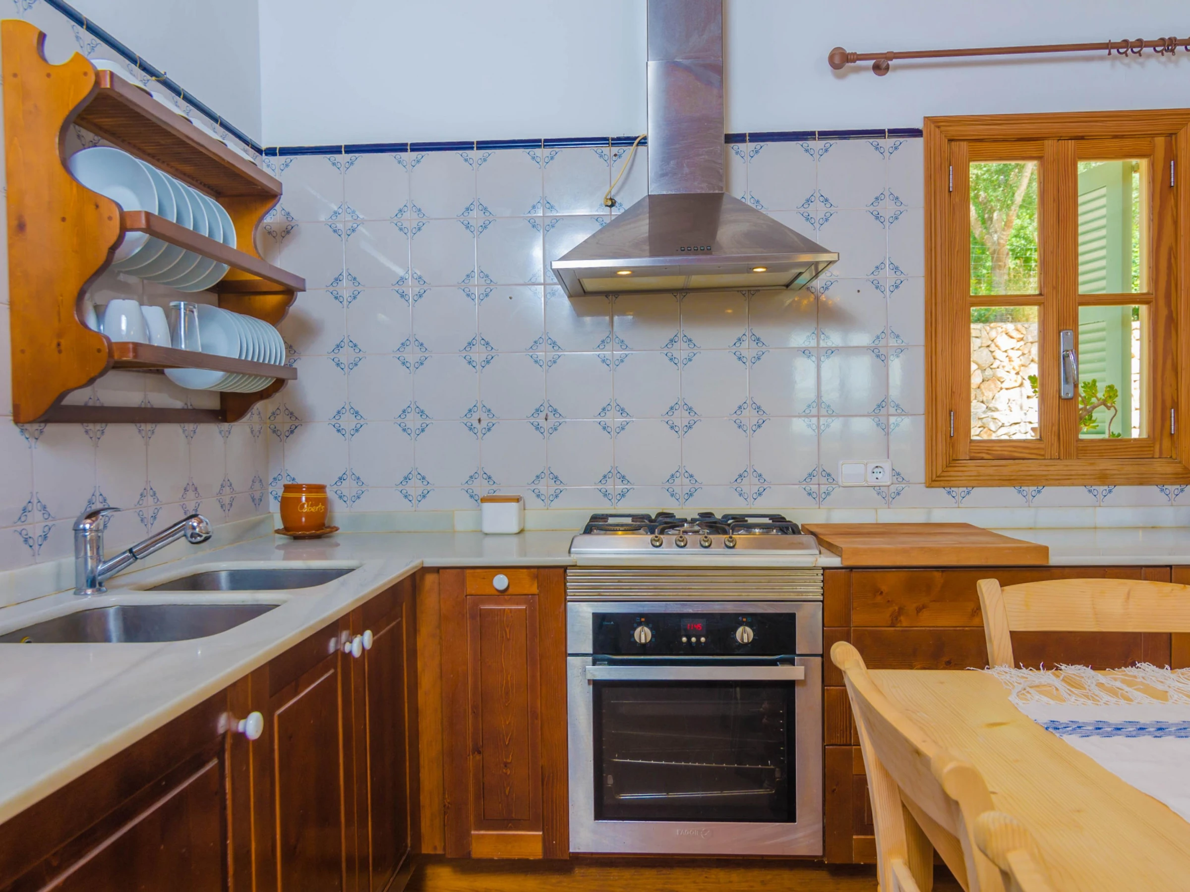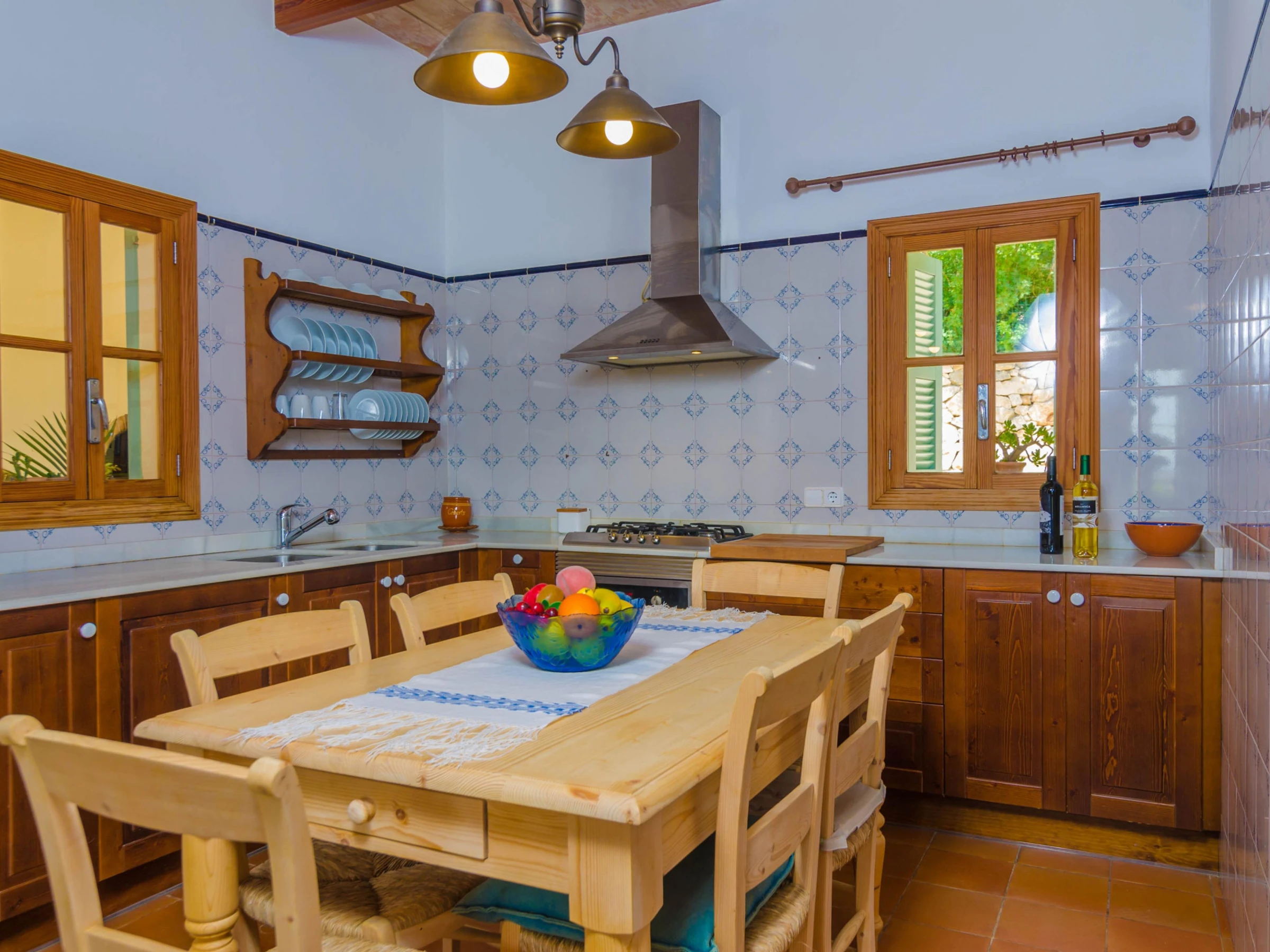 The interior has a very authentic and traditional style but with modern equipment like TV with satellite channels in German and English as well as Wifi. Besides, the living room has access to the pool terrace so you can swim and refresh yourself whenever you want. The well equipped kitchen is open to the living area and includes a few cooking utensils, a gas stove and an oven. There's a dining table where six people can sit down. If you come with your baby, we can provide a high chair. A washing machine, iron and ironing board can be found on the terrace.