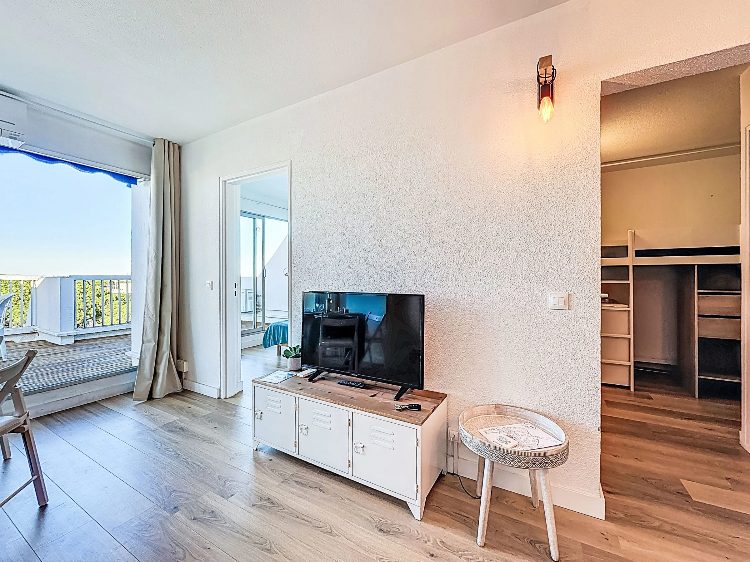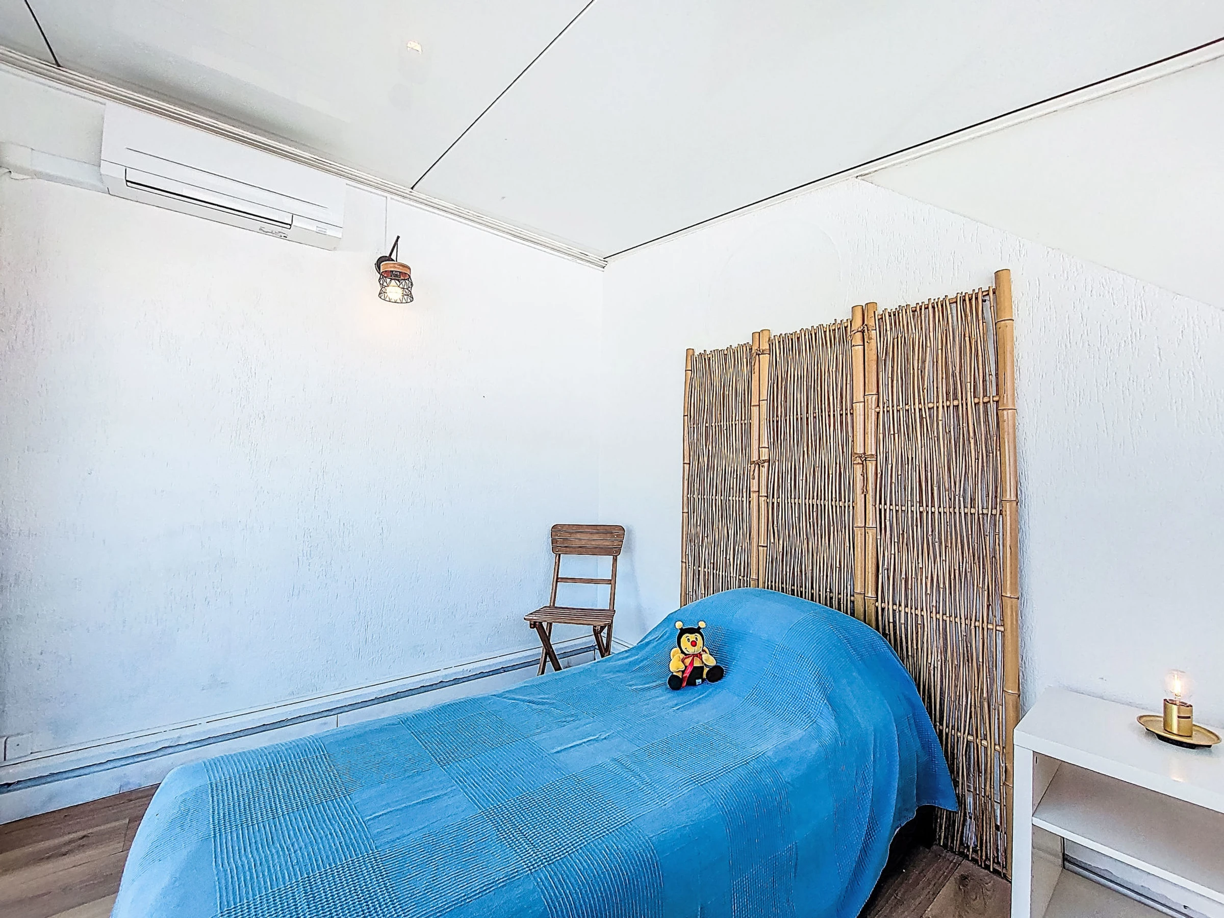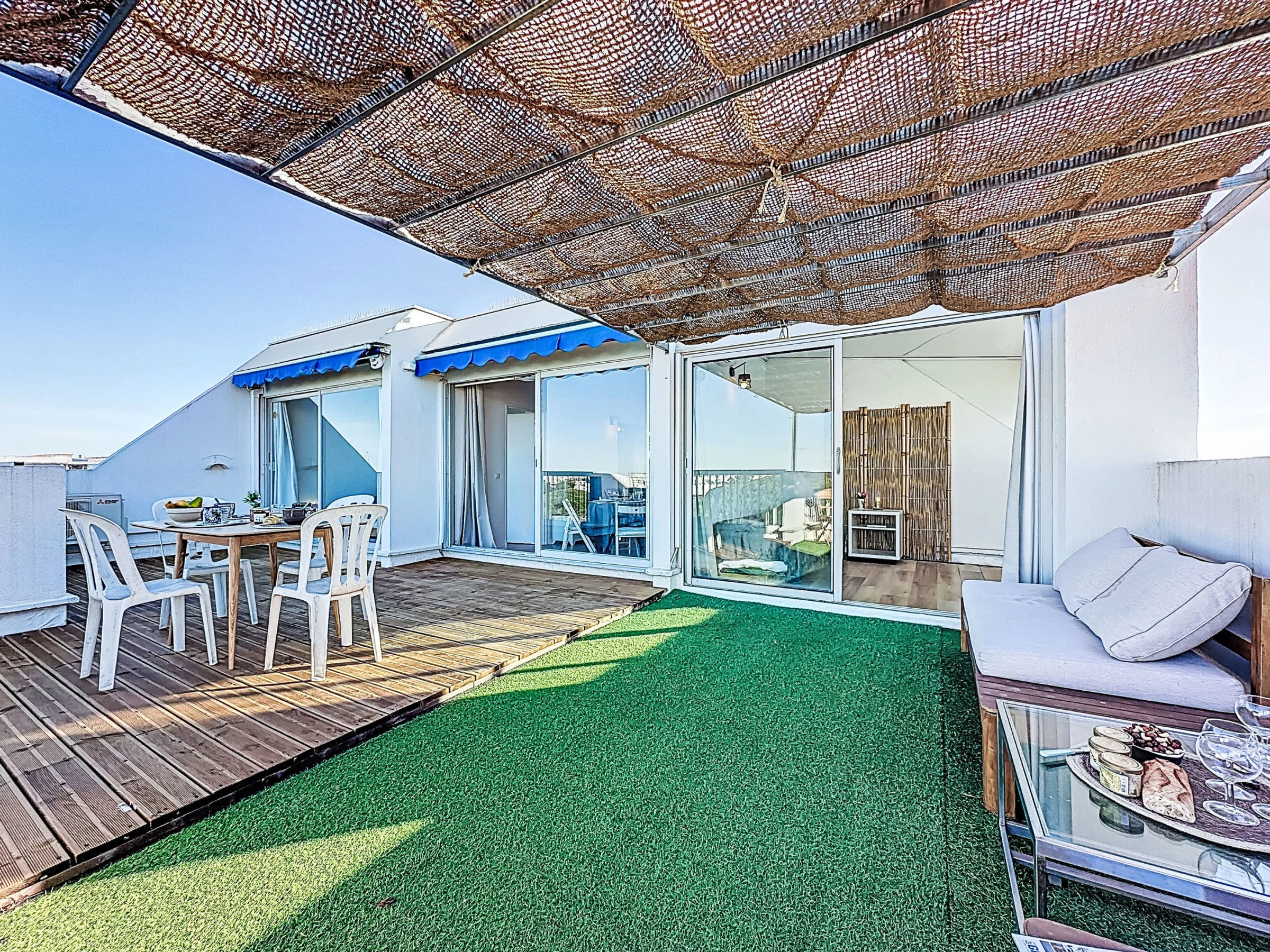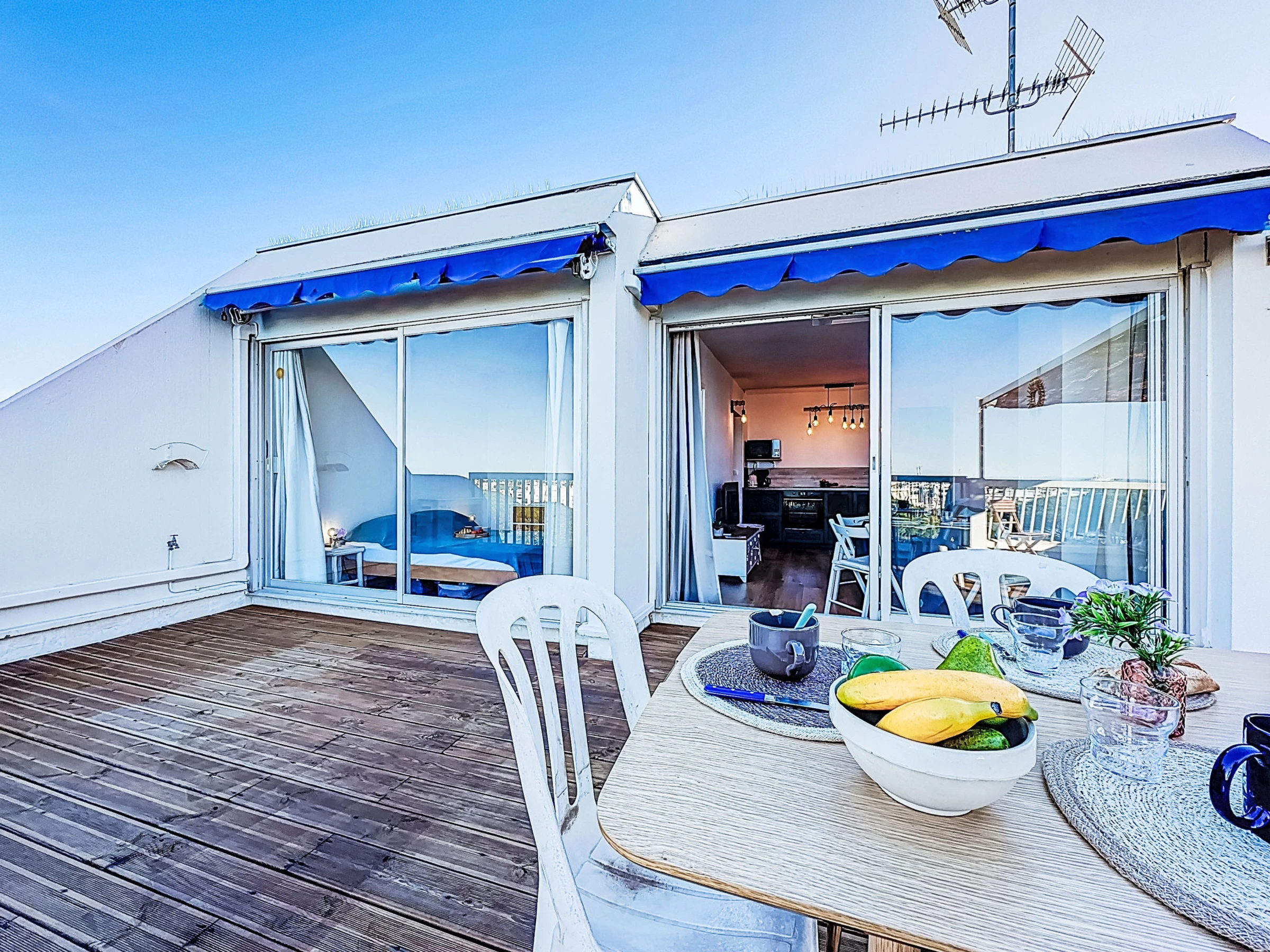 "La Croisière", 3-room apartment 41 m2 on 3rd floor. Beautiful furnishings: living/dining room with TV (flat screen). 1 room with 2 beds (80 cm, length 190 cm). 1 room with 1 french bed (140 cm, length 190 cm). Open kitchen (oven, 2 induction hot plates, toaster, kettle, microwave, freezer, electric coffee machine). Shower, sep. WC. Air-conditioning. Large terrace 37 m2. Terrace furniture. Panoramic view of the port. Facilities: washing machine. Internet (WiFi, free). Parking space n x. Please note: smoke alarm. Offer by a commercial proprietor according to Art. 155, IV, CGI [hidden]