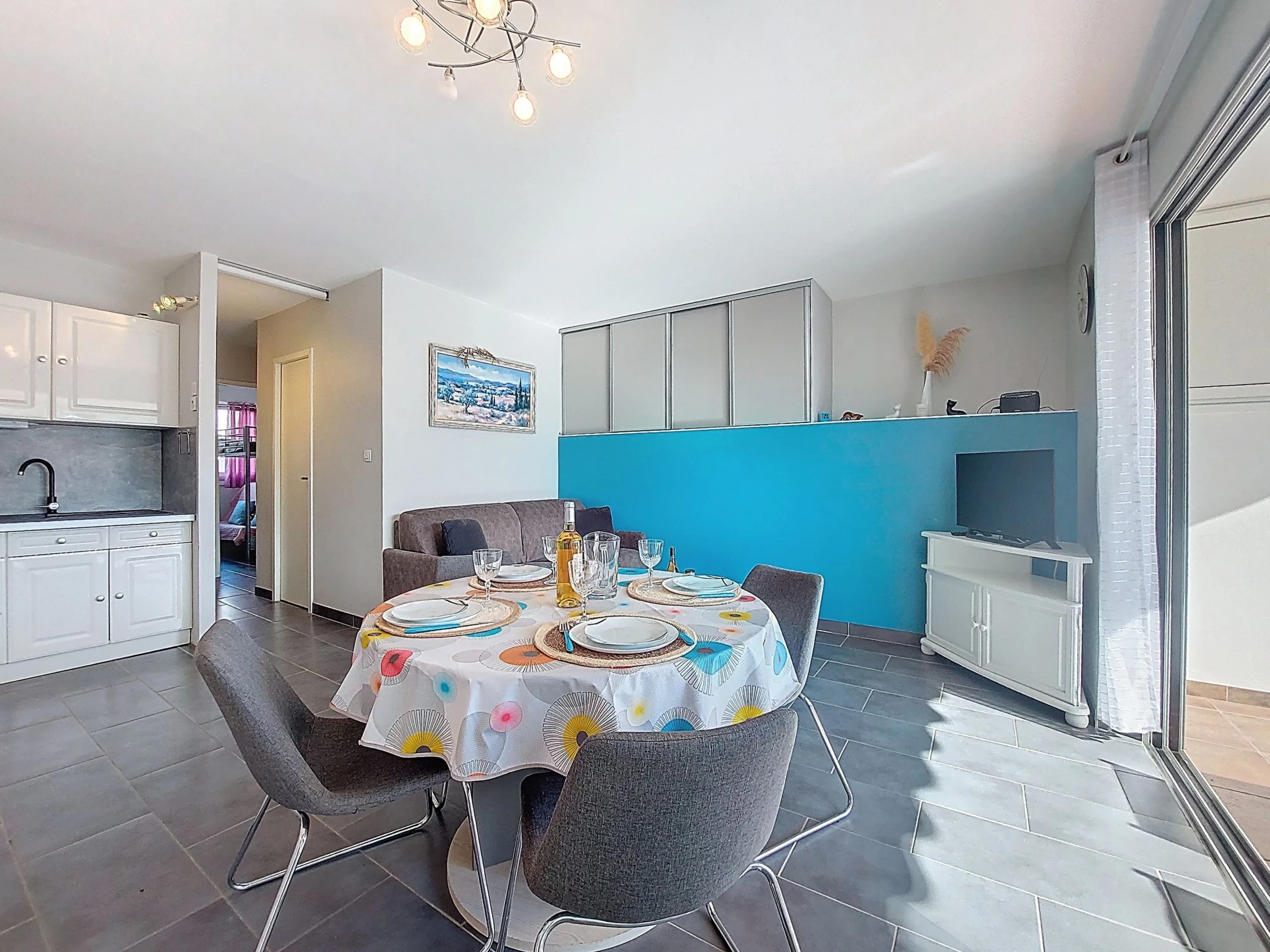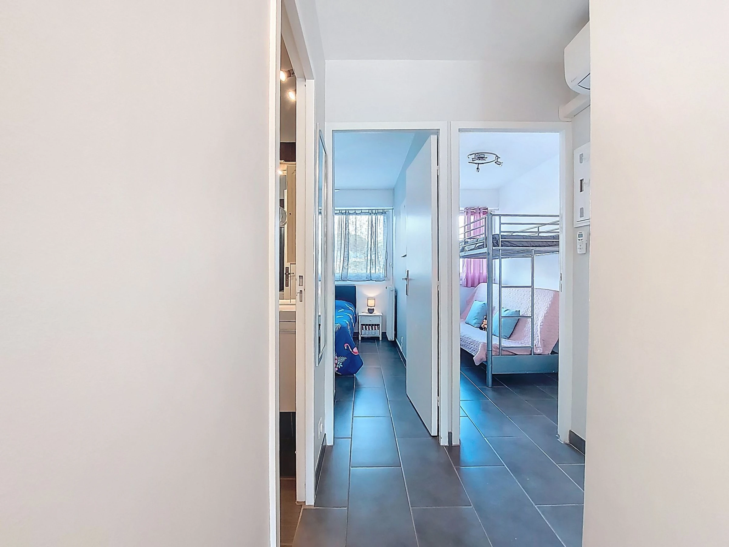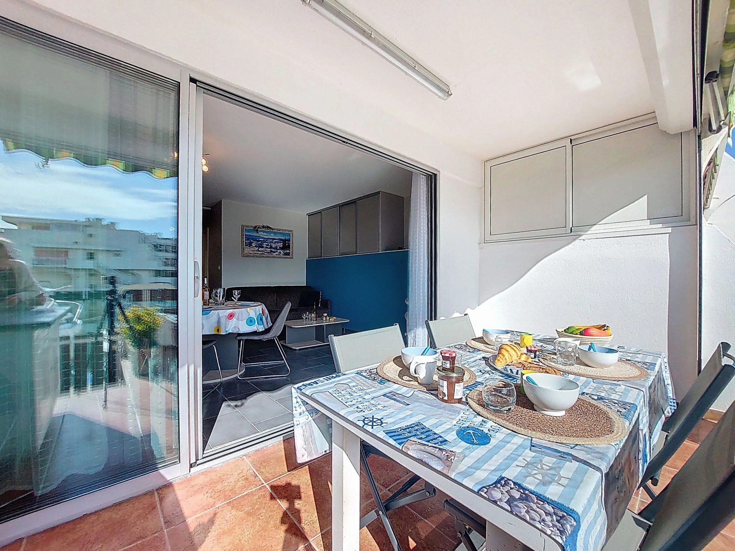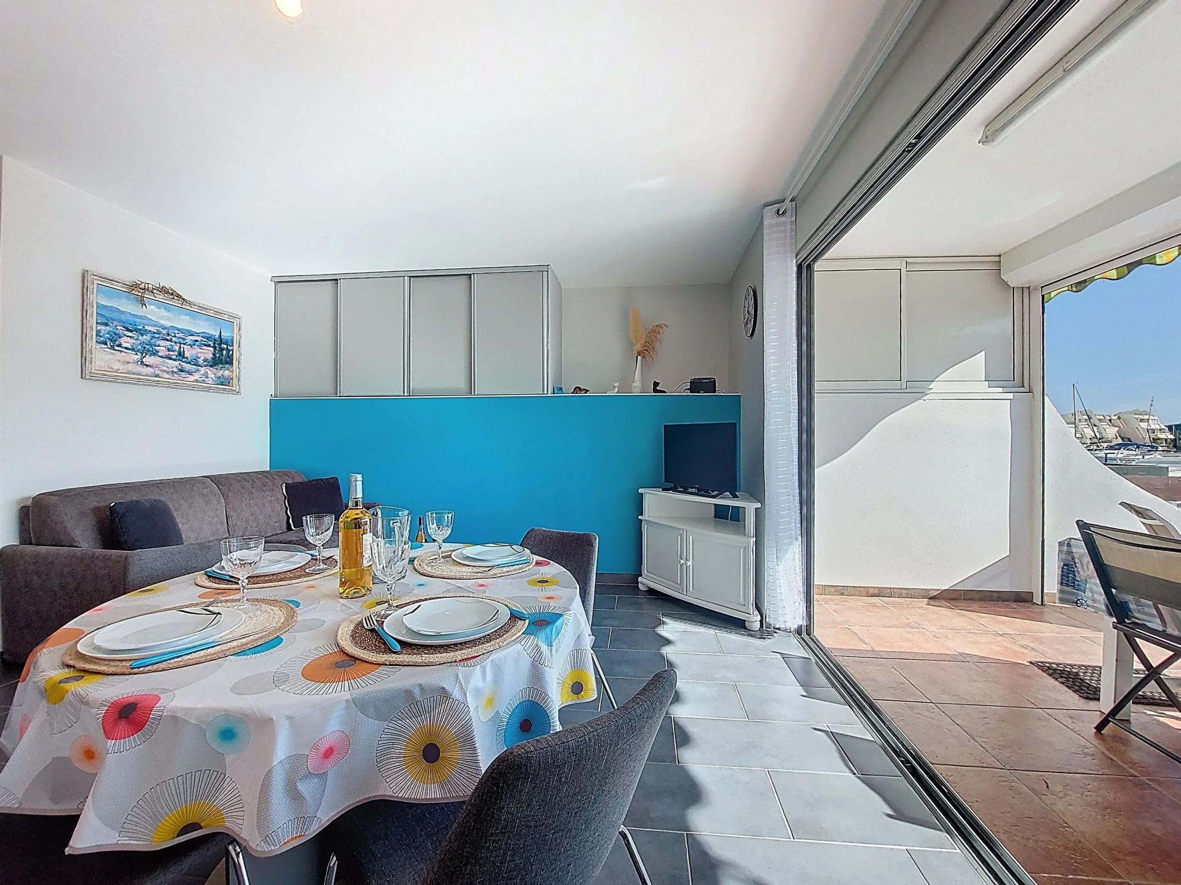 3-room apartment 46 m2, on the ground floor. Beautiful furnishings: living/dining room with TV and air conditioning. 1 room with 1 french bed (140 cm, length 200 cm), fan. 1 room with 1 x 2 bunk beds (90 cm, length 180 cm). Kitchenette (oven, dishwasher, 3 induction hot plates, microwave, freezer). Shower, sep. WC. Heating. Terrace 16 m2, south facing position. Terrace furniture, electric barbecue. View of the port. Facilities: washing machine. Parking. Please note: smoke alarm. Offer by a private individual according to Art. 155, IV of CGI. [hidden]