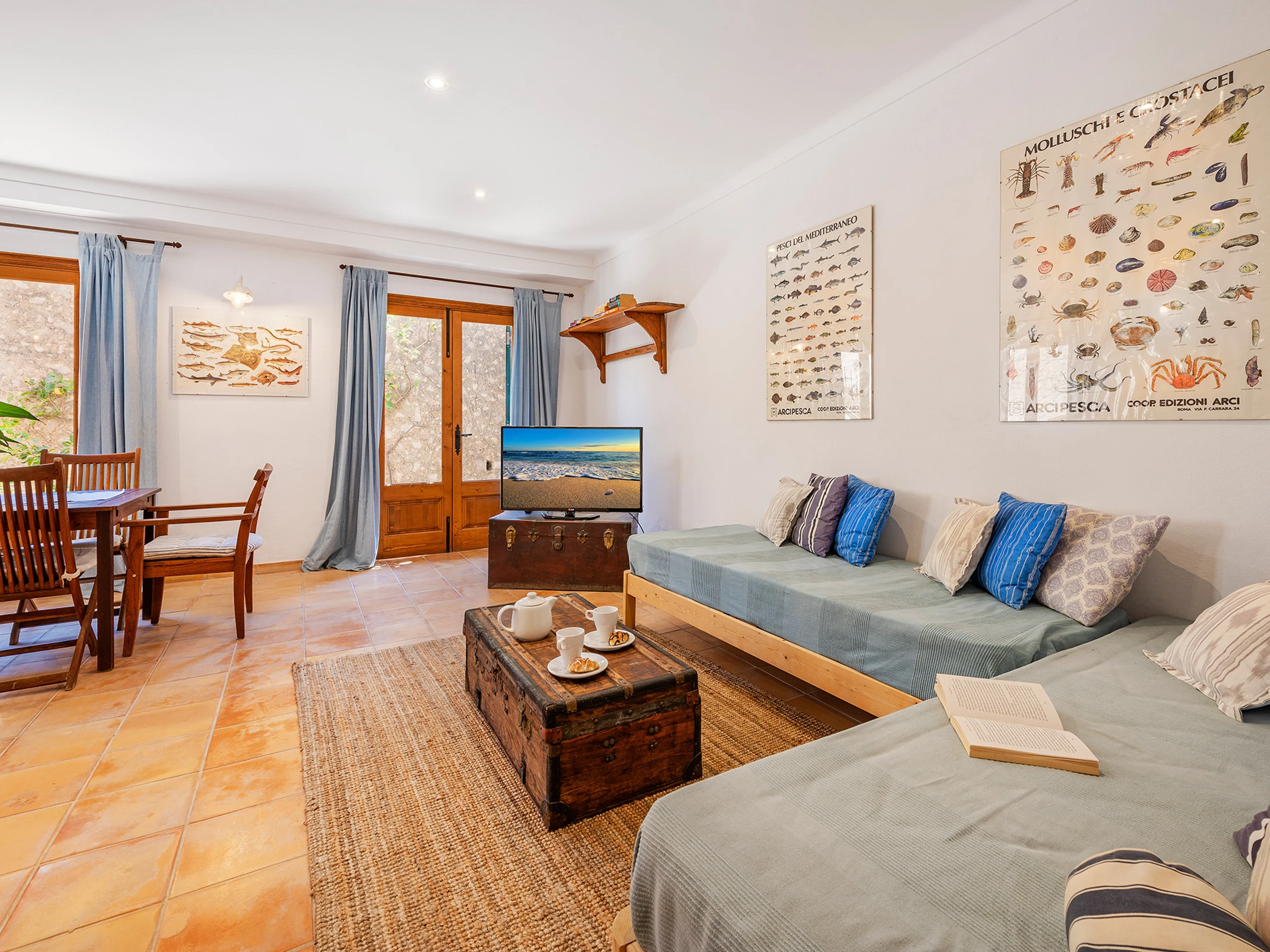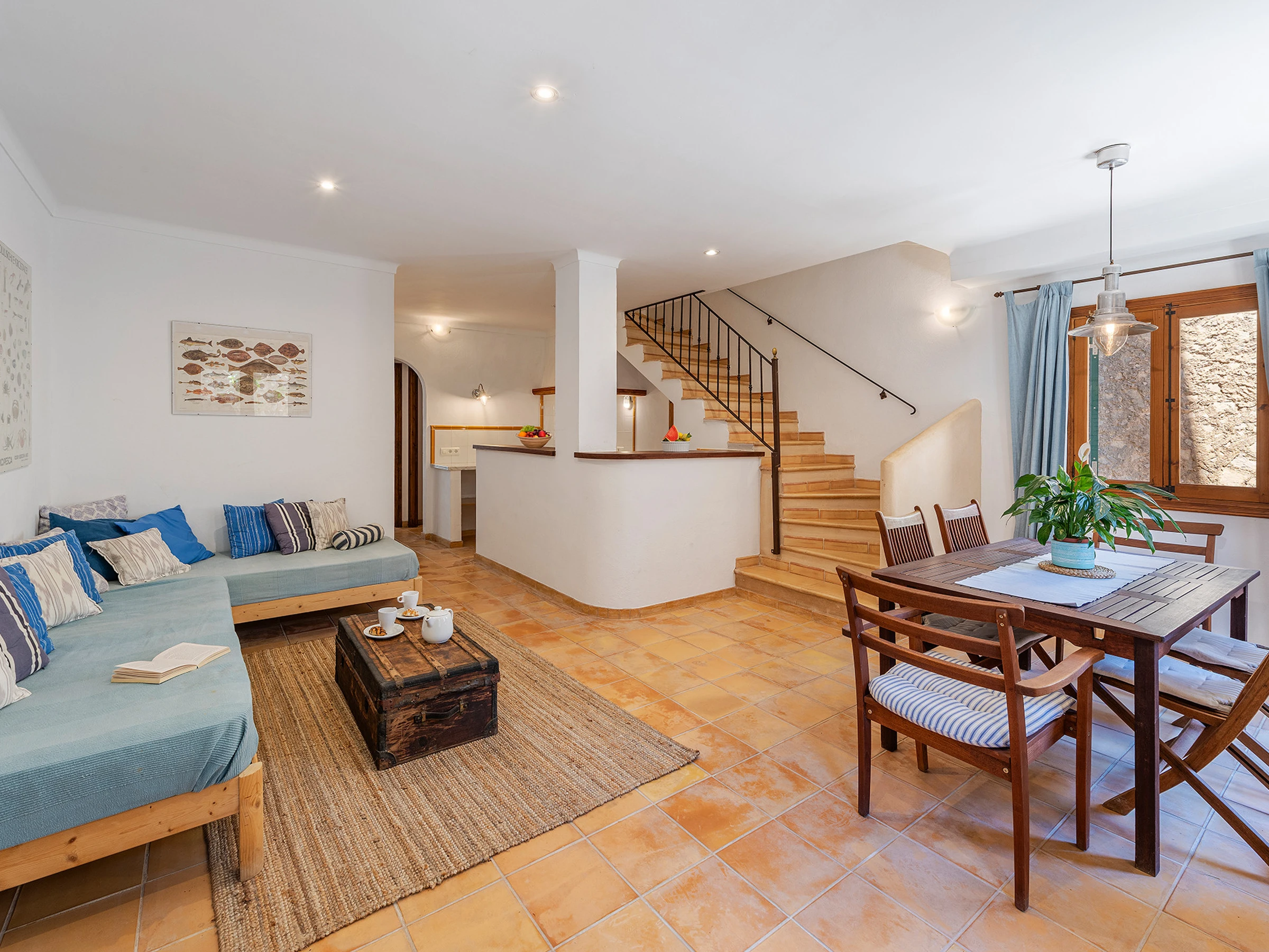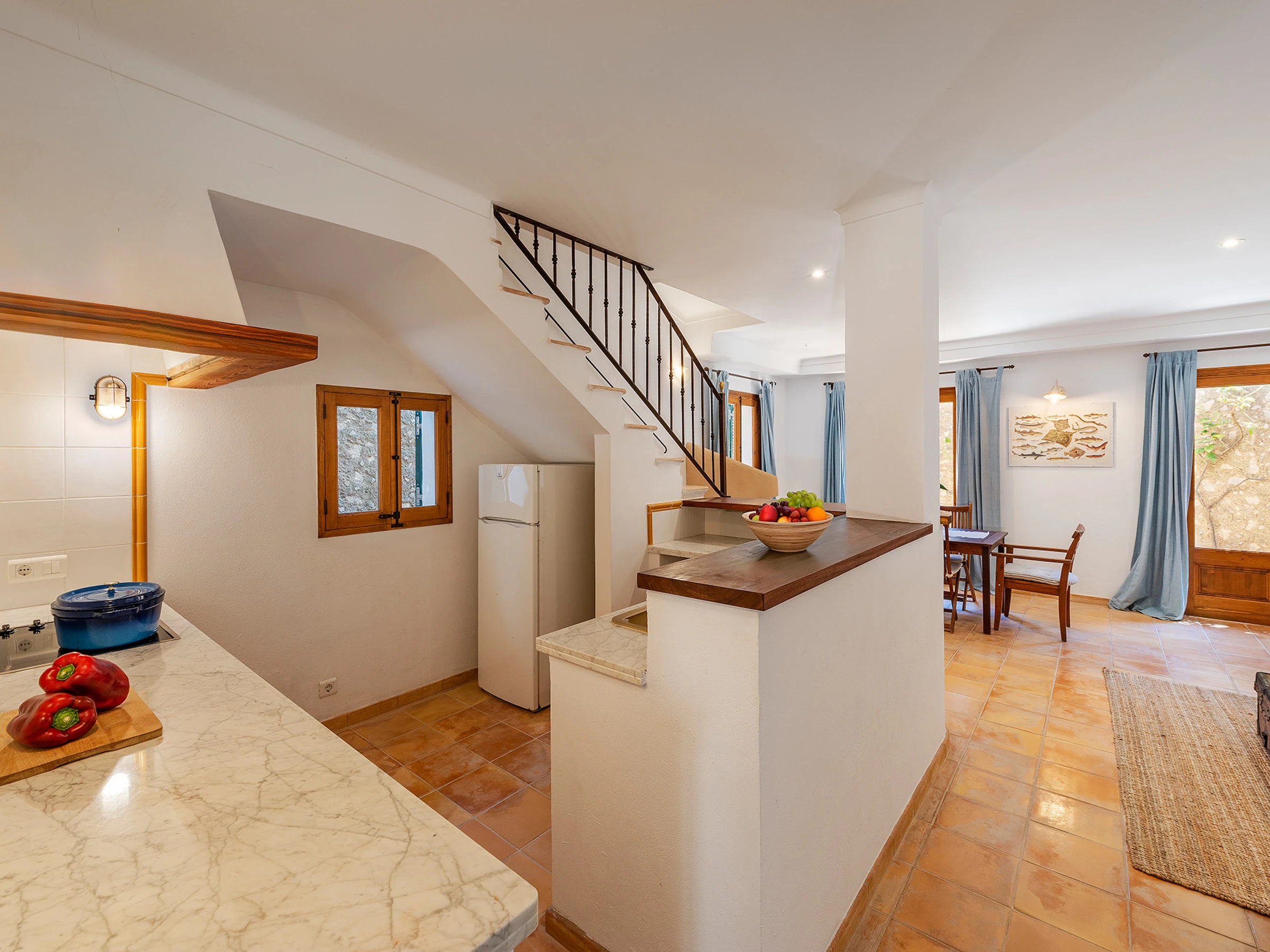 The layout of Can Teulada is ideal for comfort and convenience. On the ground floor, you’ll find a spacious living and dining area, a fully equipped kitchen, one bedroom, and a bathroom – everything needed for a relaxing stay.