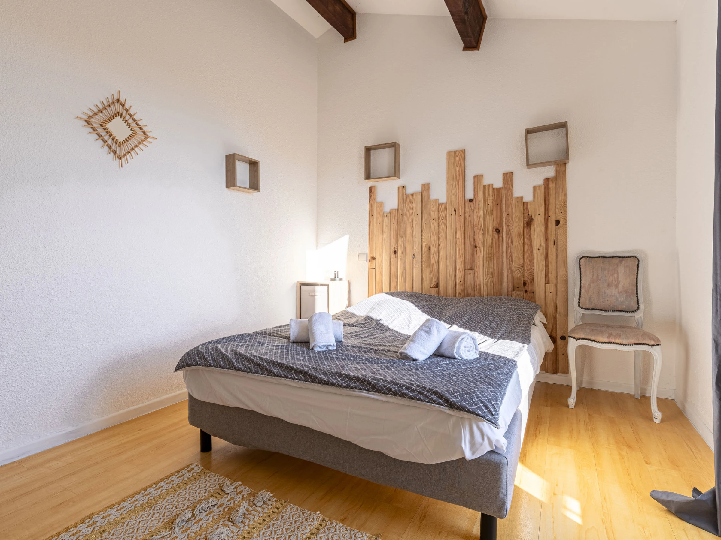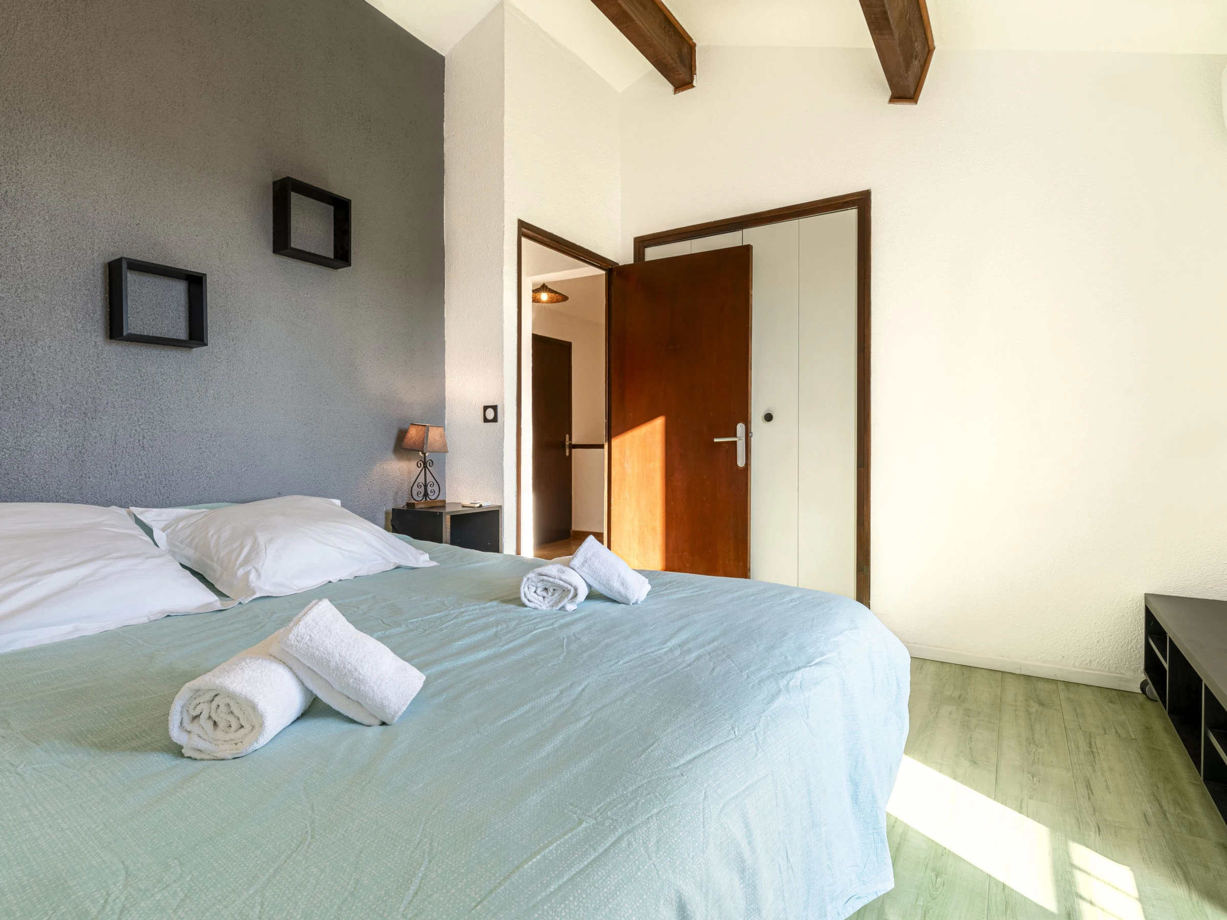4-room house 90 m2 on 2 levels. Comfortable furnishings: living/dining room with open-hearth fireplace (only for decoration), TV (flat screen), air conditioning. Exit to the terrace. 1 room with 1 french bed (160 cm, length 190 cm). Exit to the terrace. Open kitchen (oven, dishwasher, 4 induction hot plates, toaster, kettle, microwave, freezer, electric coffee machine, Capsules for coffee machine (Nespresso) extra). Shower, sep. WC. Electric heating. Upper floor: 1 room with 1 french bed (160 cm, length 190 cm). Exit to the balcony. 1 room with 1 french bed (160 cm, length 200 cm), air conditioning. Exit to the balcony. Bath/shower/WC. Terrace 20 m2, south facing position. Terrace furniture, barbecue, deck chairs (6). Facilities: washing machine. Internet (WiFi, free). Please note: non-smokers only. Smoke alarm. [hidden]