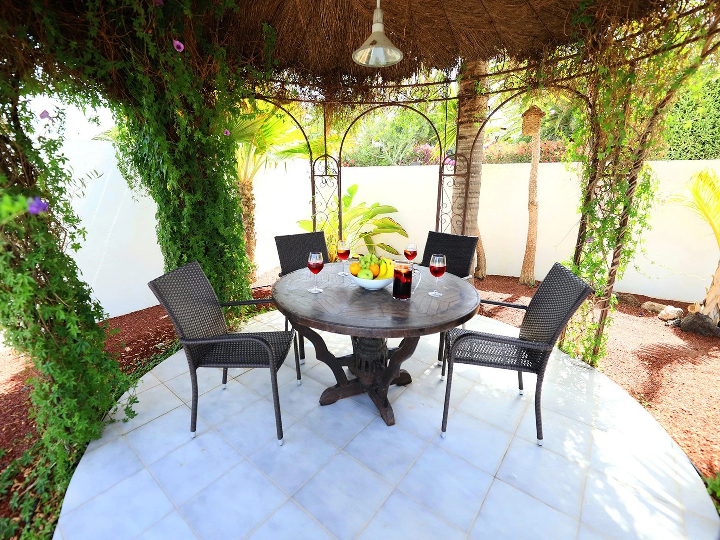 An enclosed, private garden embellished with a covered gazebo for outdoor seating. Surrounding the oval-shaped pool are abundant sunbathing terraces furnished with loungers.