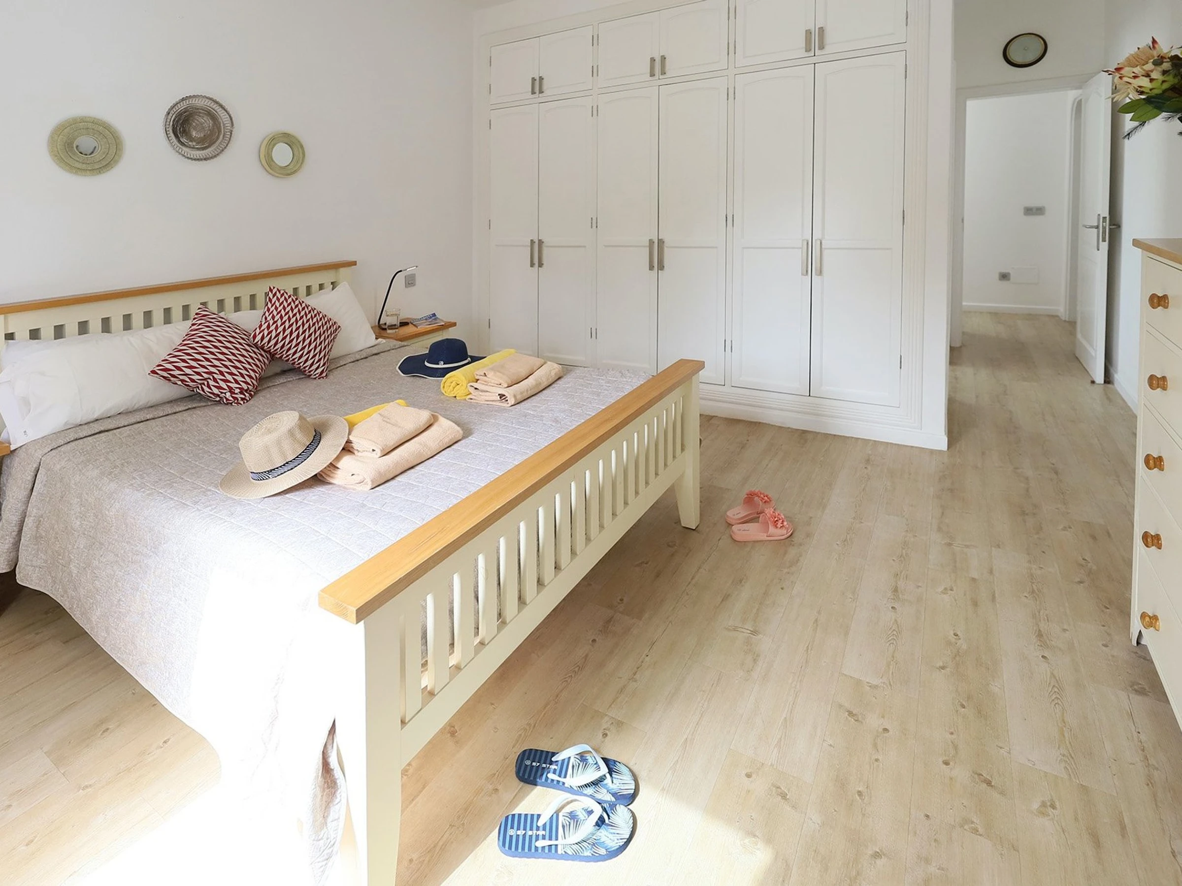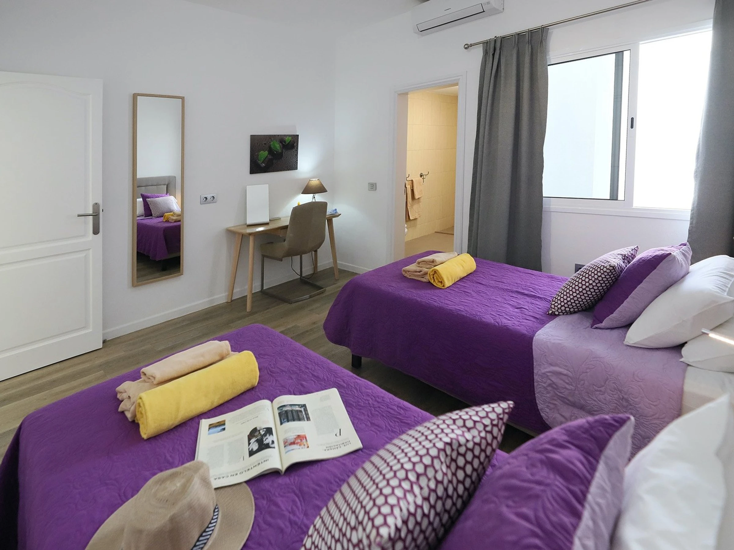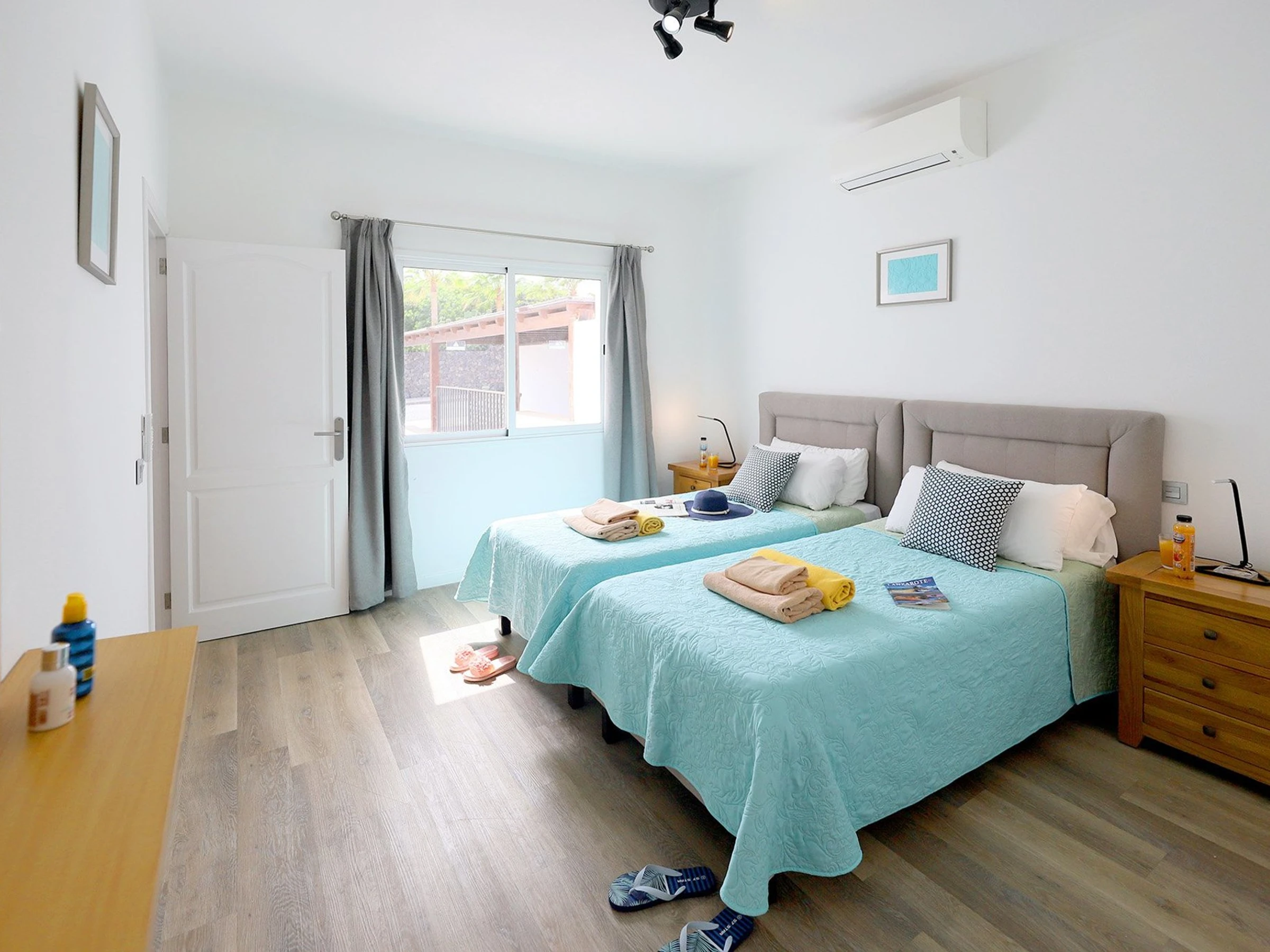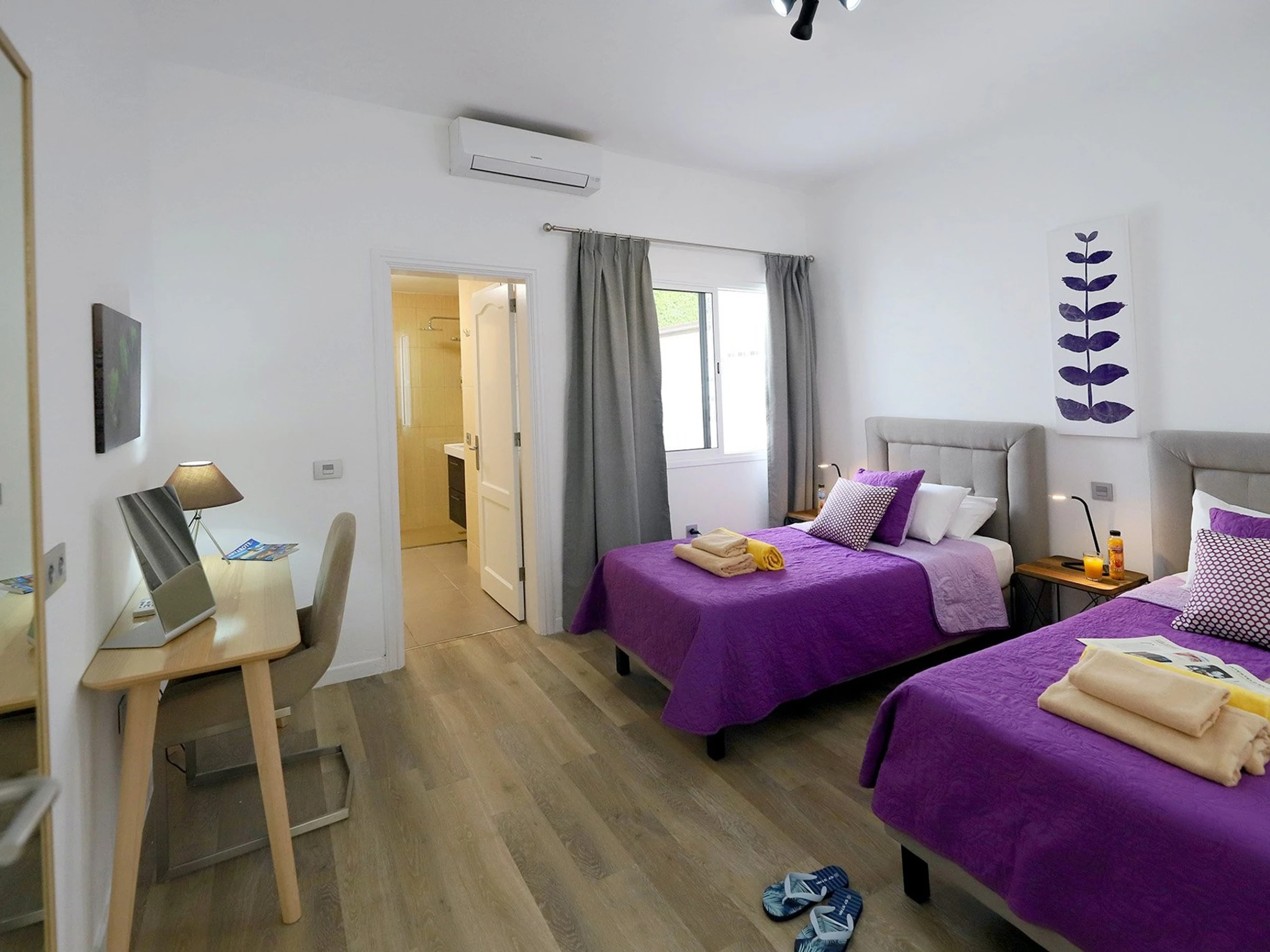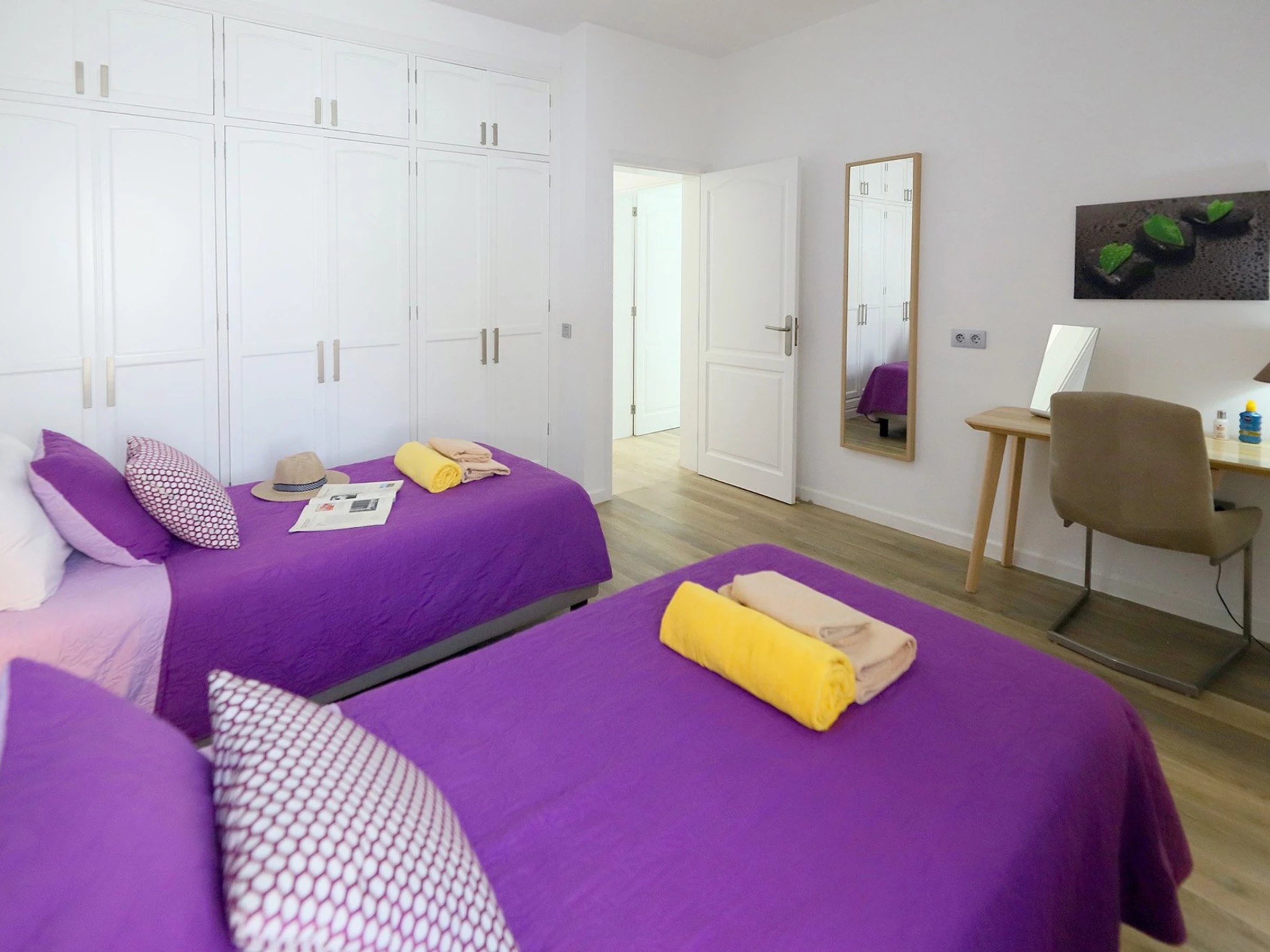 2. **Second Bedroom**: Twin beds, fitted wardrobes, and bedside tables replete with lamps. Air-conditioned.