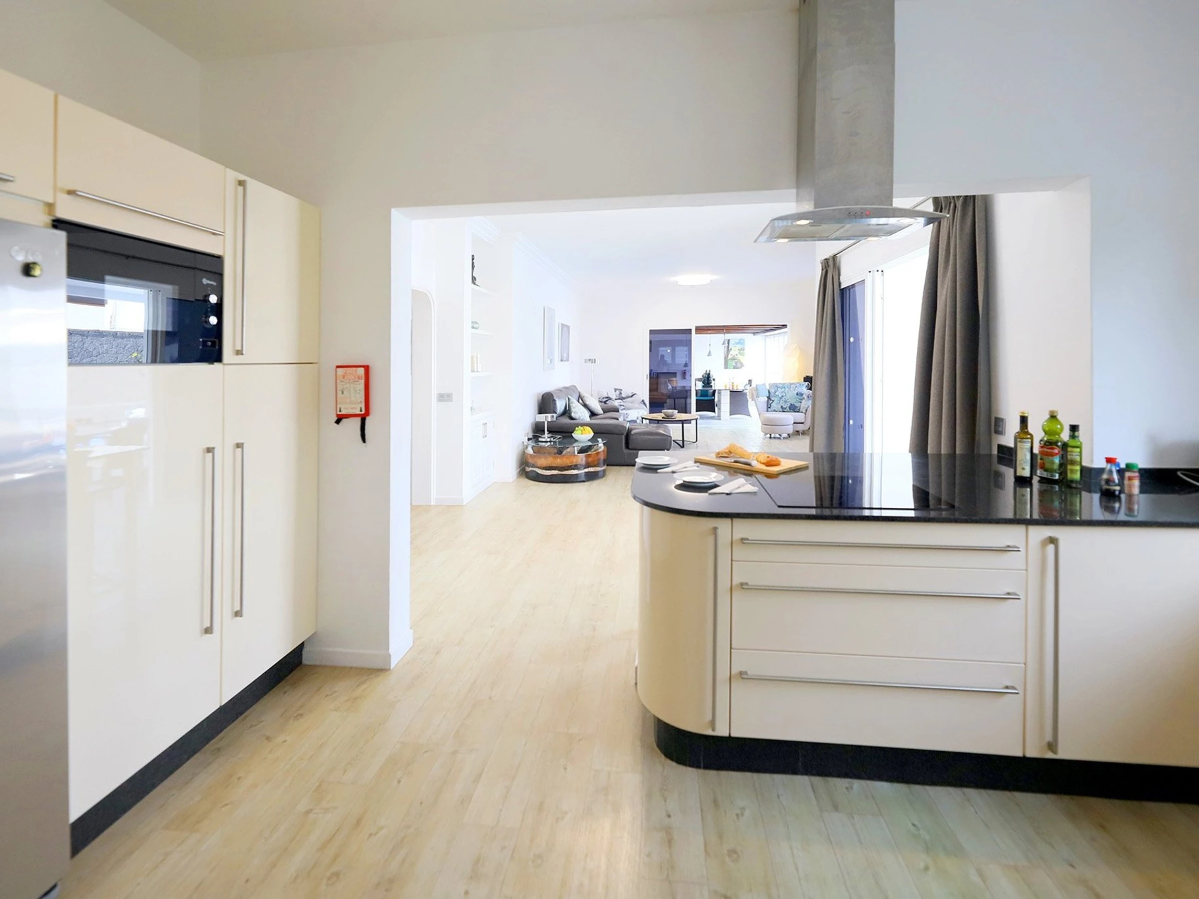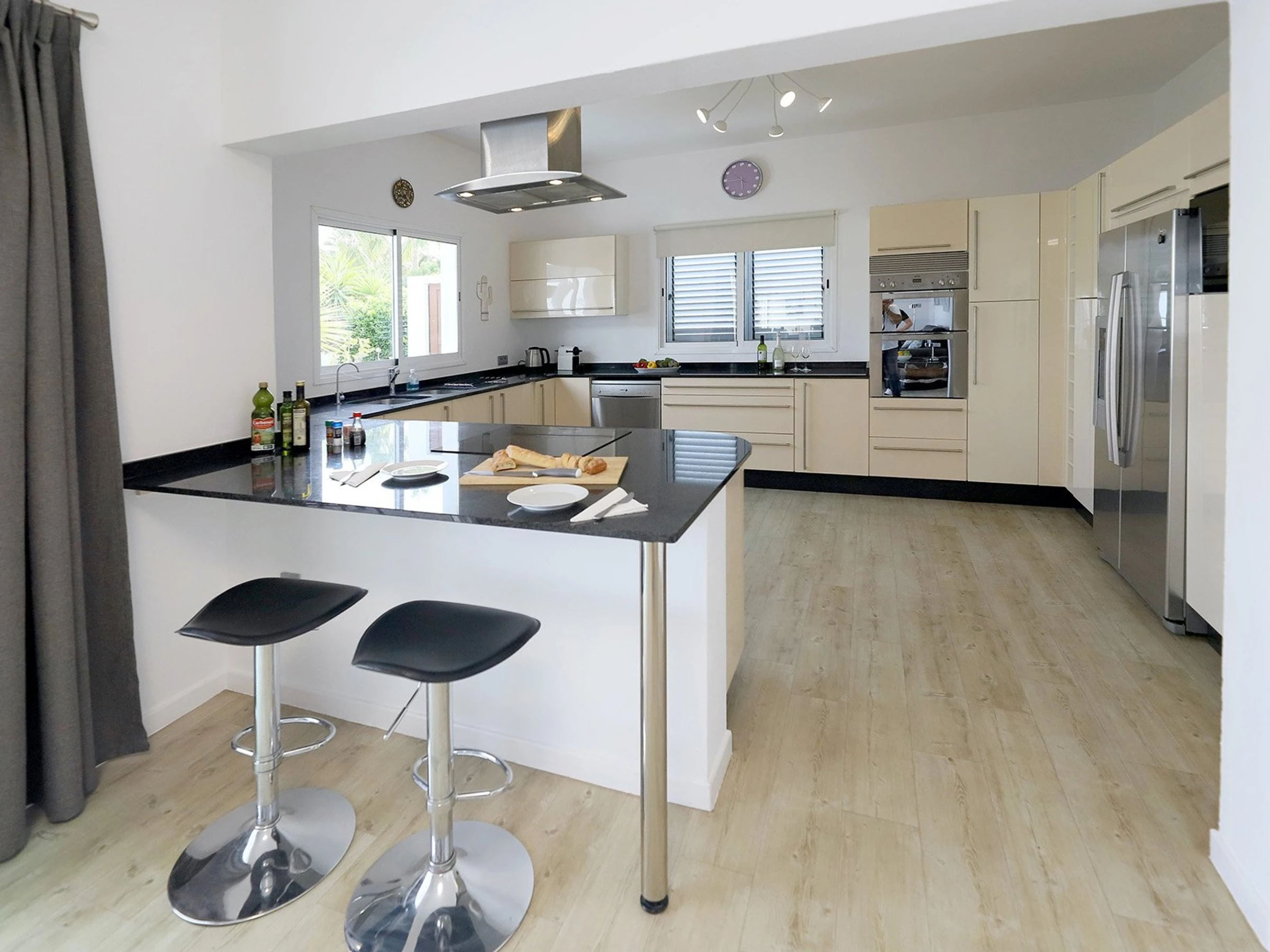 A commodious open-plan kitchen adorned with modern, granite-topped units and a breakfast bar. Fully equipped with state-of-the-art appliances, including an electric oven, microwave, coffee machine, toaster, fridge freezer, dishwasher, and induction hob.