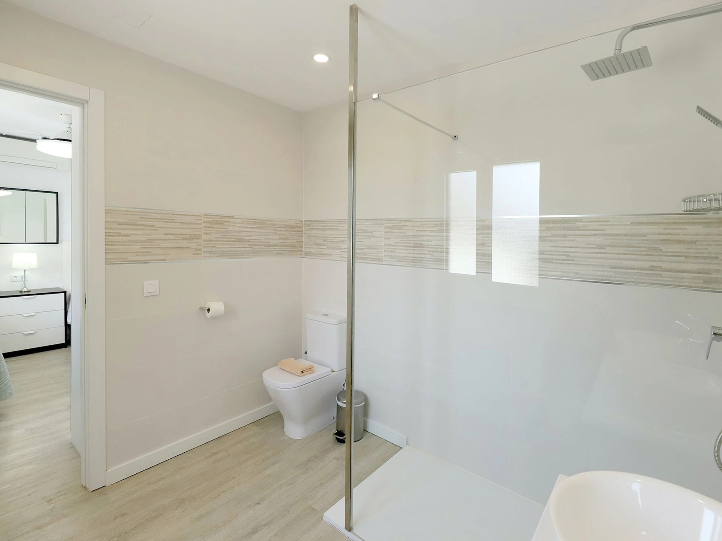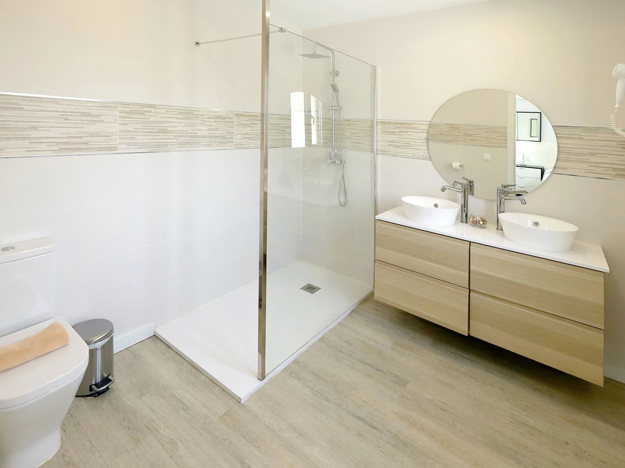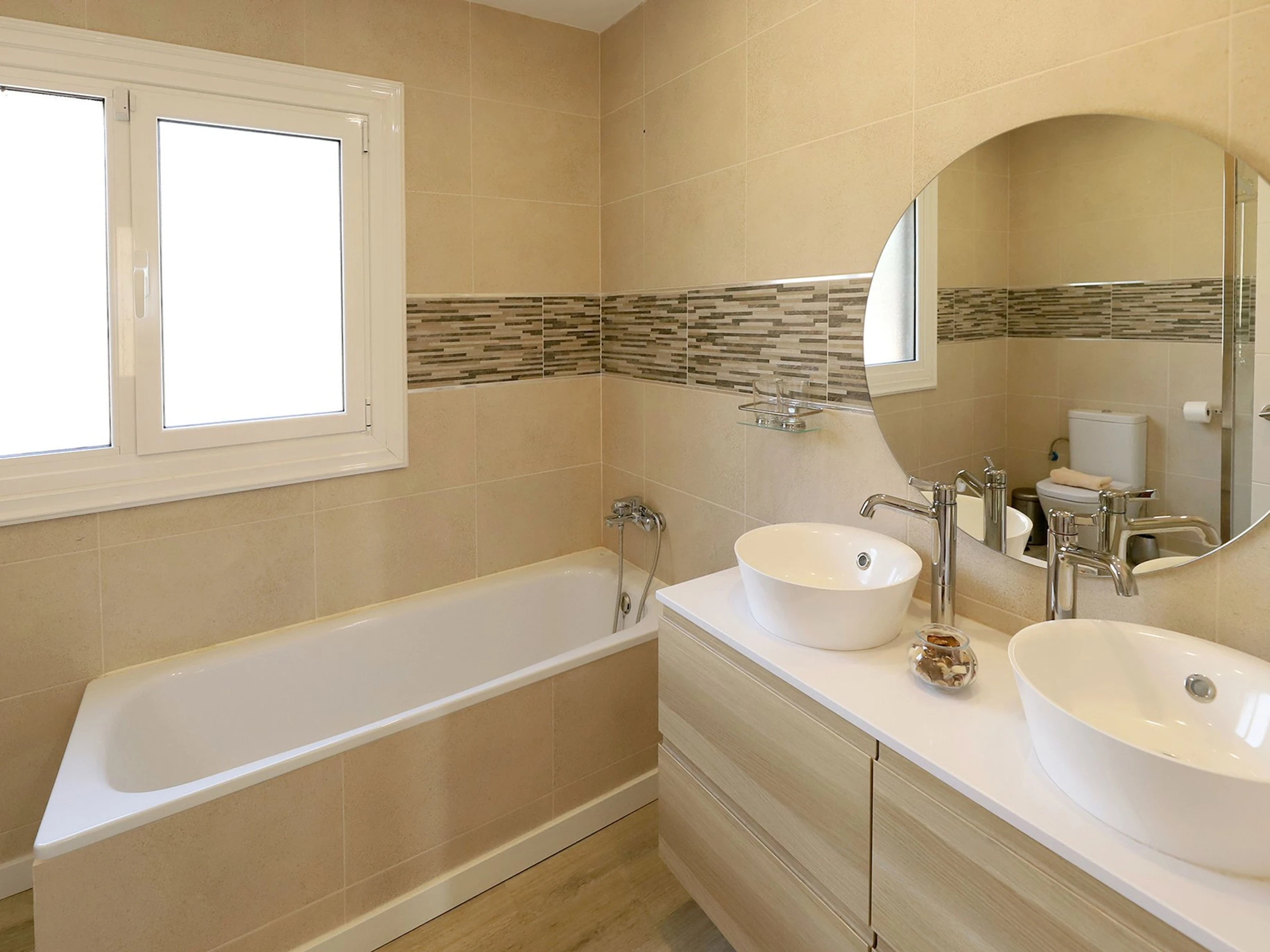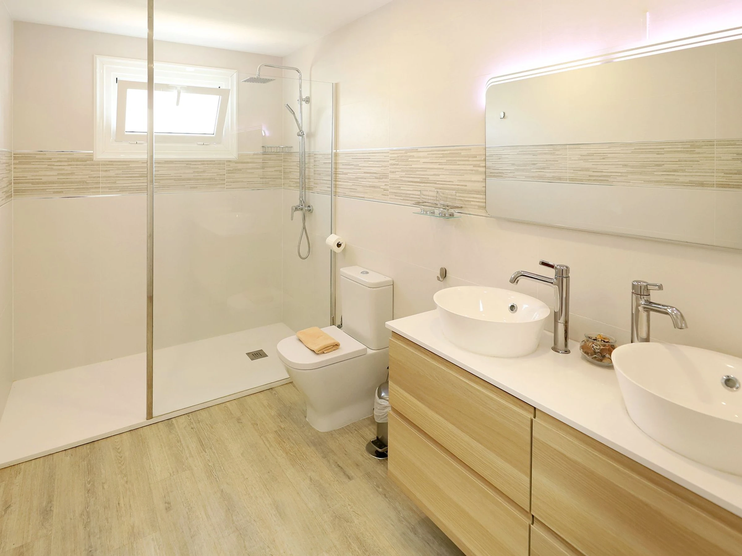 The upper terrace is equipped with modern comfortable furniture for relaxing as well as table and chairs, barbecue, and outdoor fridge for al-fresco dining. There is also a shower room and separate toilet off this terrace, on the lower level around the pool there are sunbeds, an umbrella, and a further table with chairs.