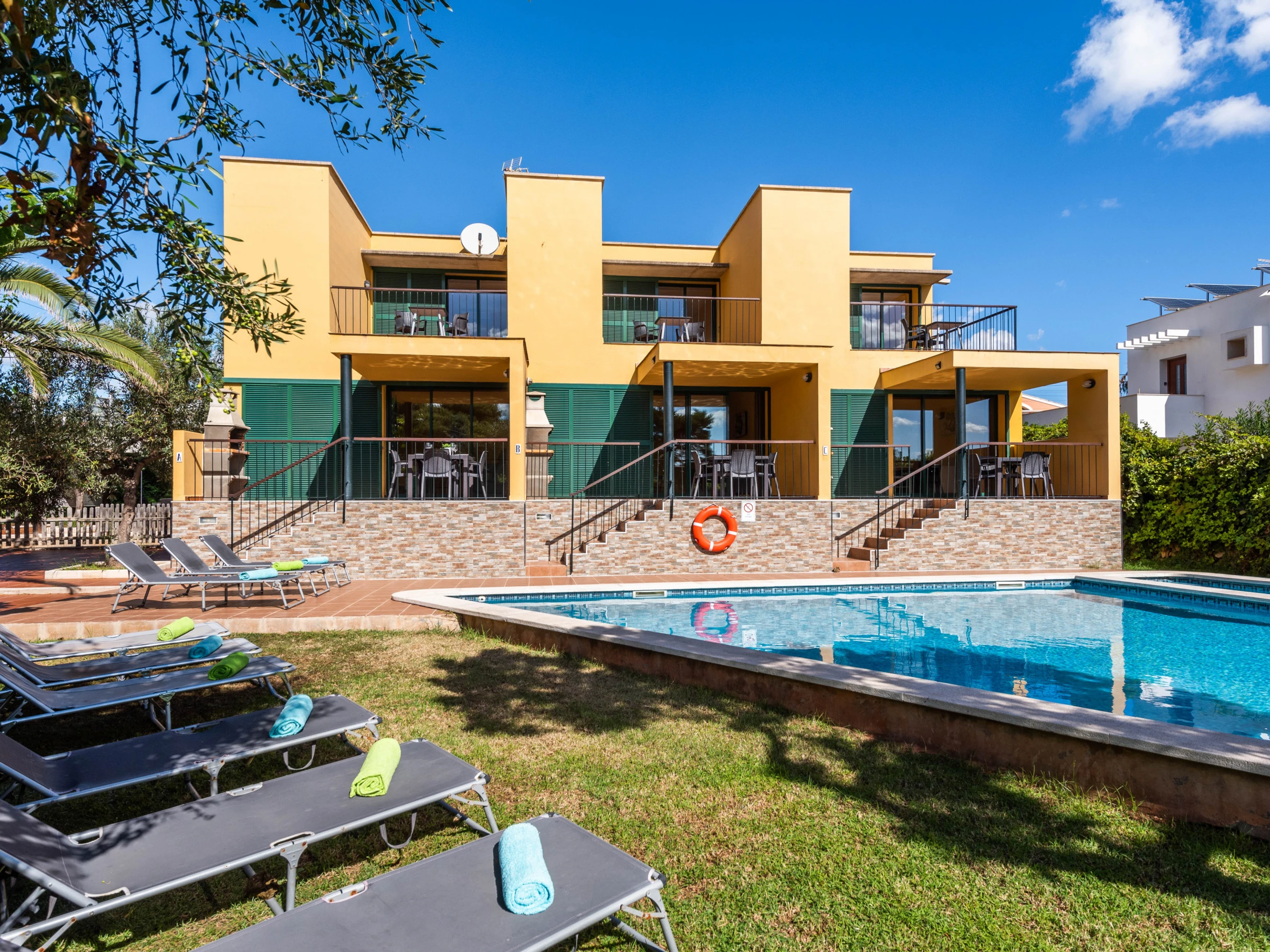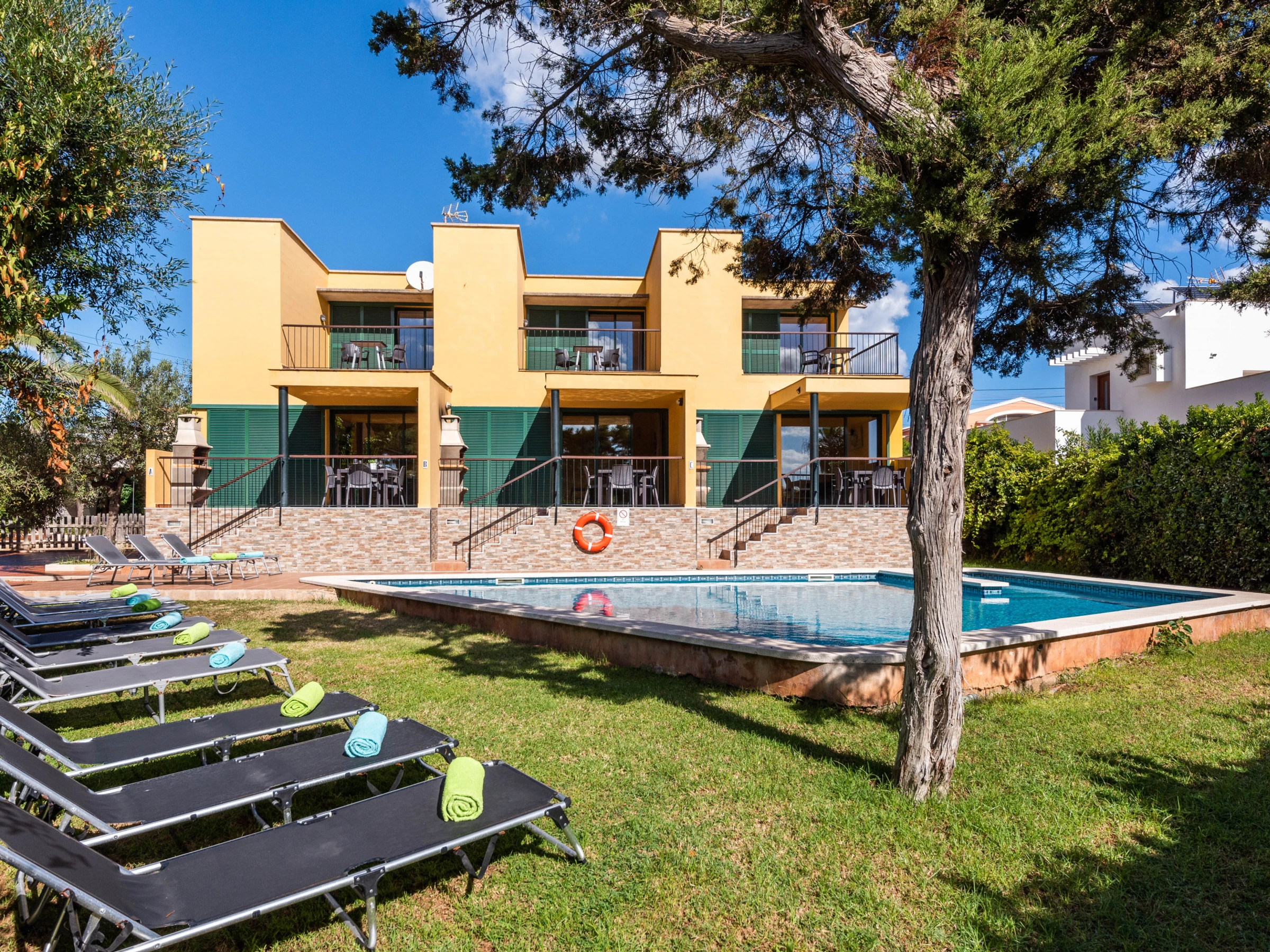Near the beautiful beach of Punta Prima, just 300 meters away, we find these 3 charming two-bedroom apartments in a classic Mediterranean style with a living room to accommodate up to 4 people in each apartment. They are 3 semi-detached houses that share a well-kept pool and garden.