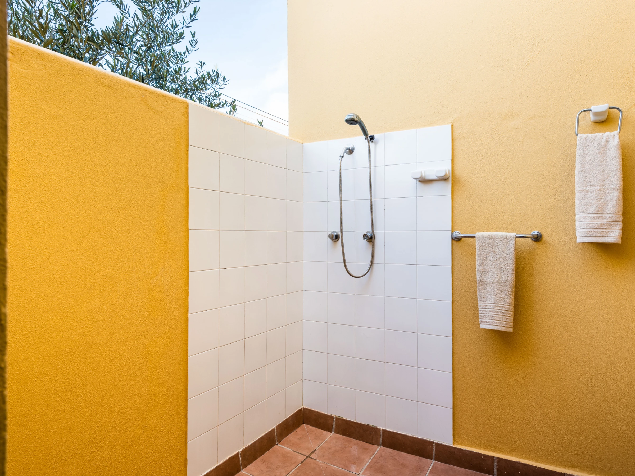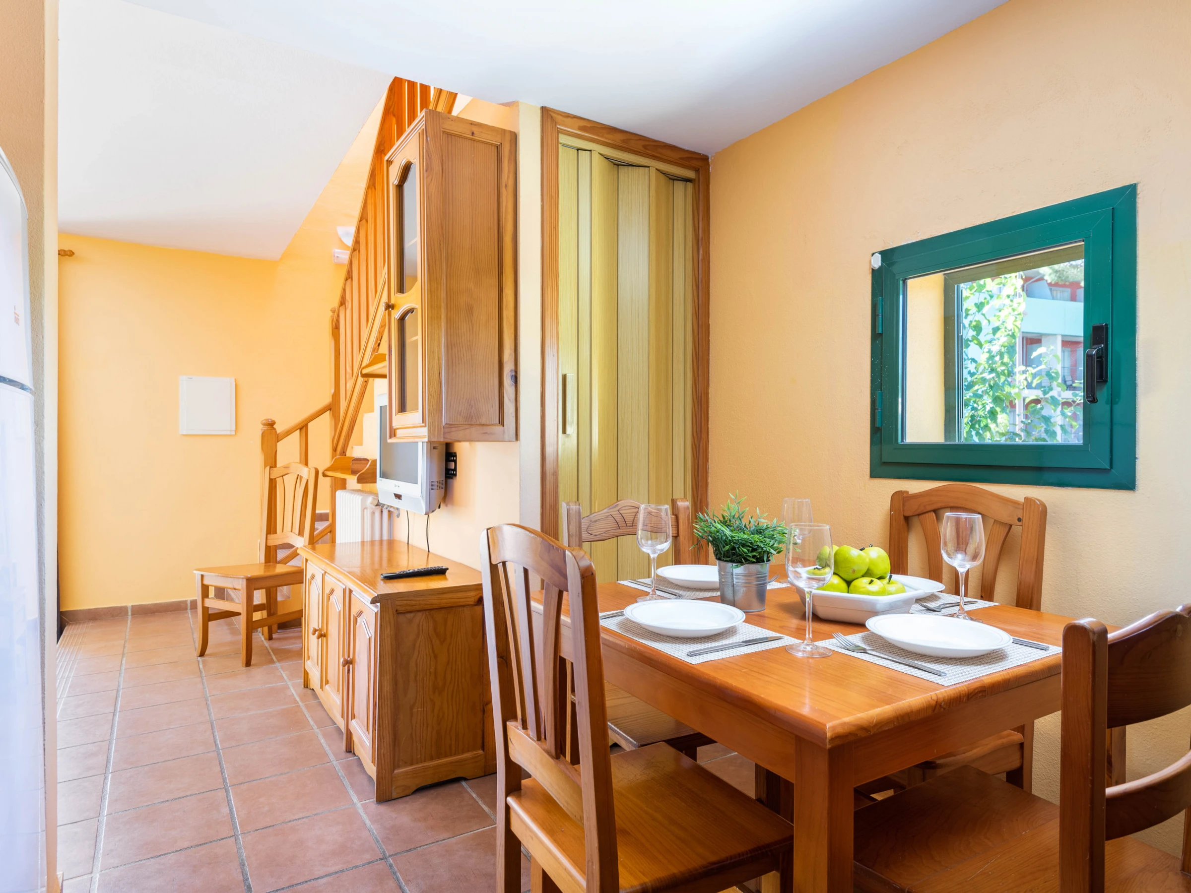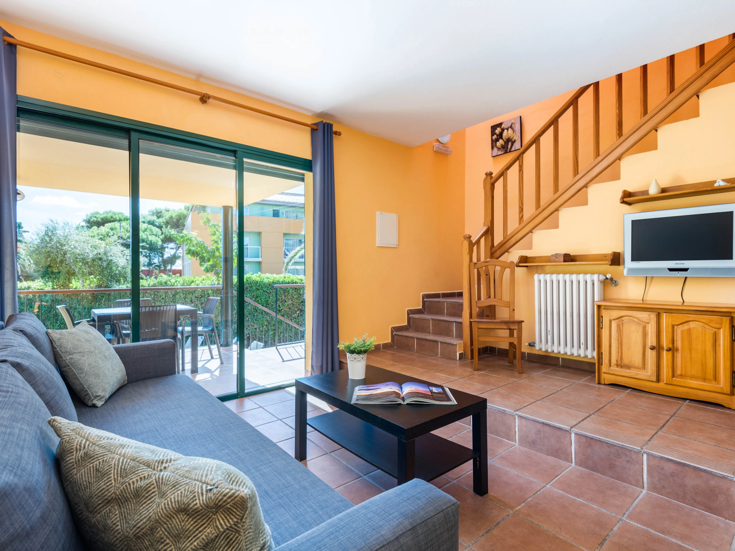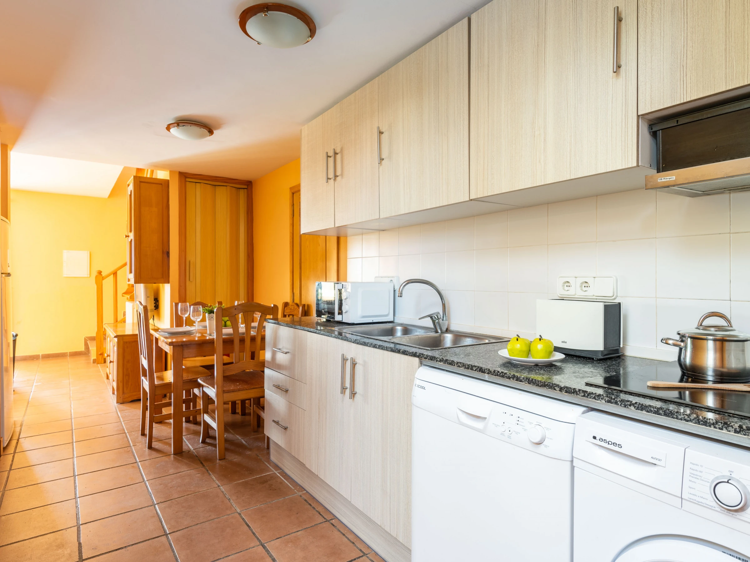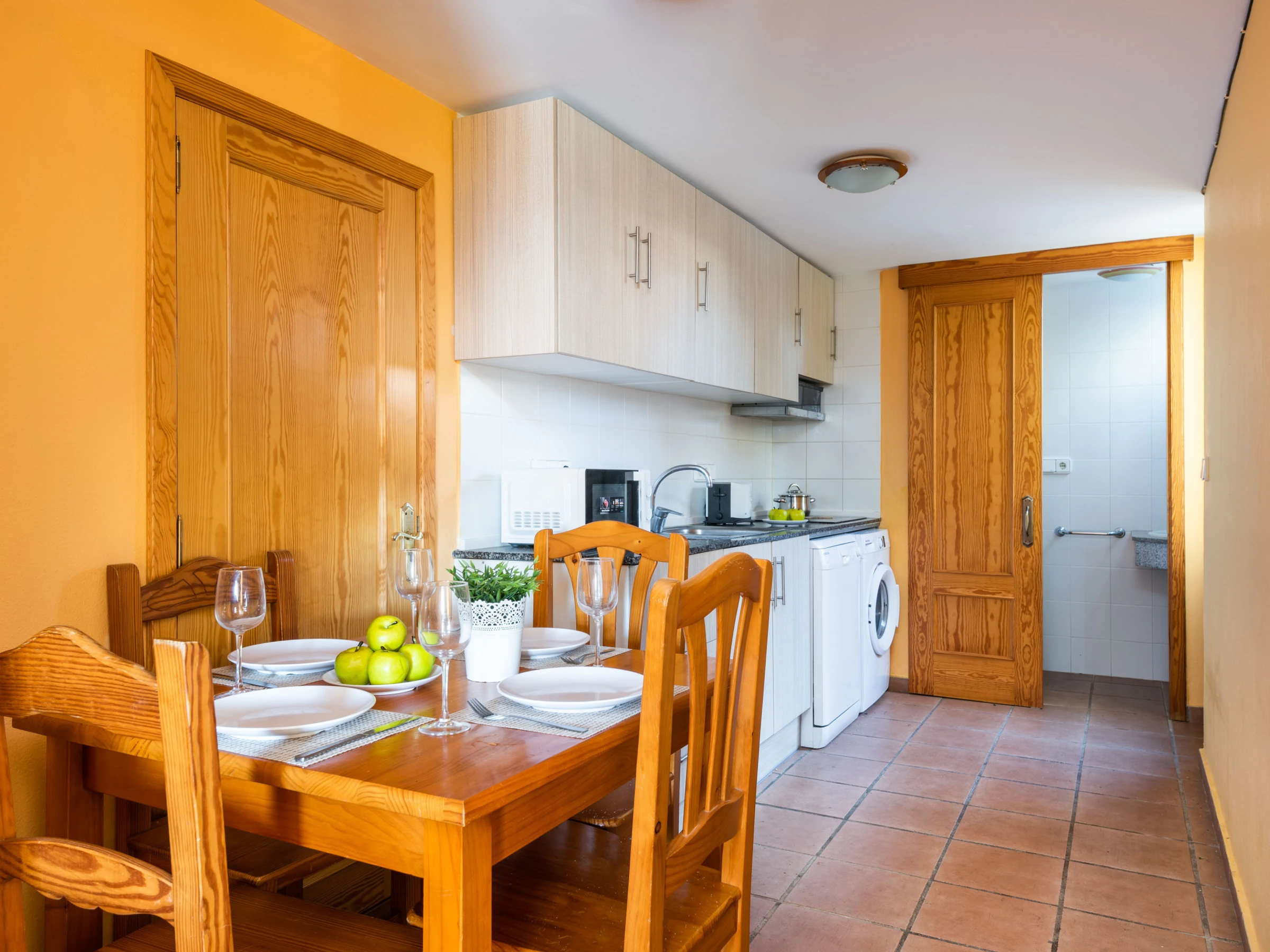 Each apartment has a living room with integrated kitchen. The living room has a TV and free Wi-Fi for customers. The kitchen is small but we find everything you need to spend a few days away from home, ceramic hob, washing machine, dishwasher, electric oven, microwave, fridge with freezer, capsule coffee maker, filter coffee maker, toaster and kettle. On the ground floor next to the kitchen there is a small toilet, outside a small private terrace with outdoor shower and area to hang out.